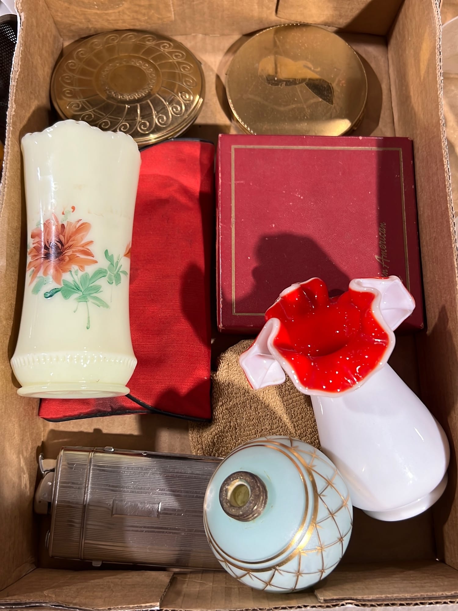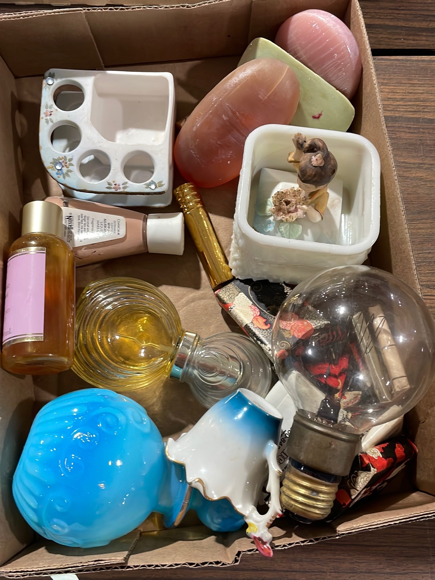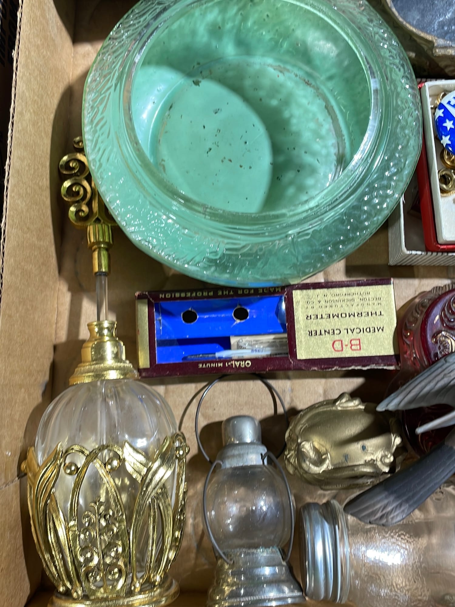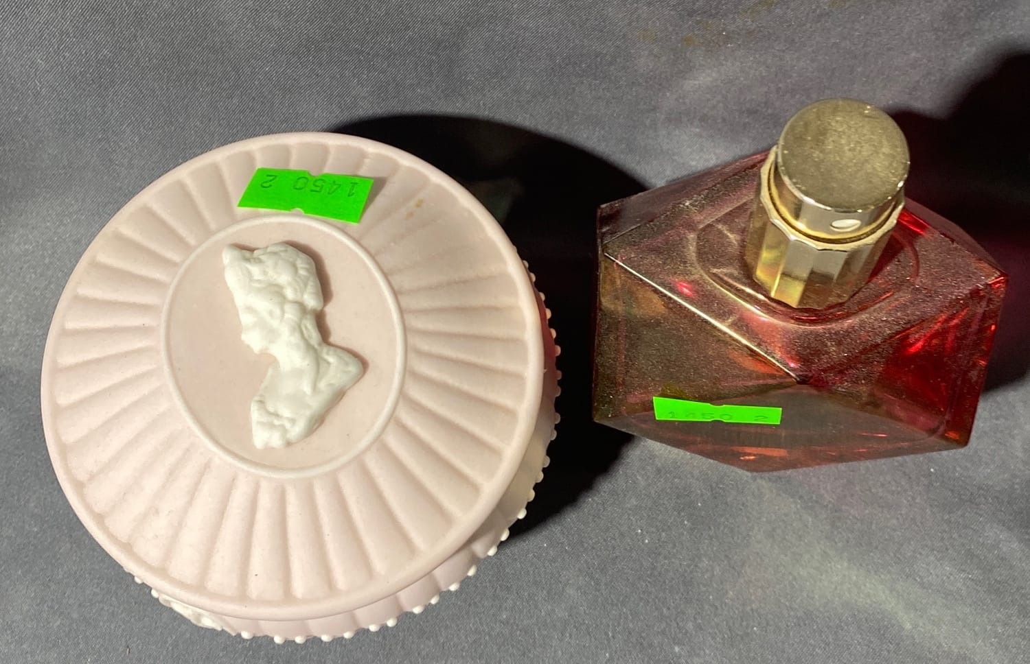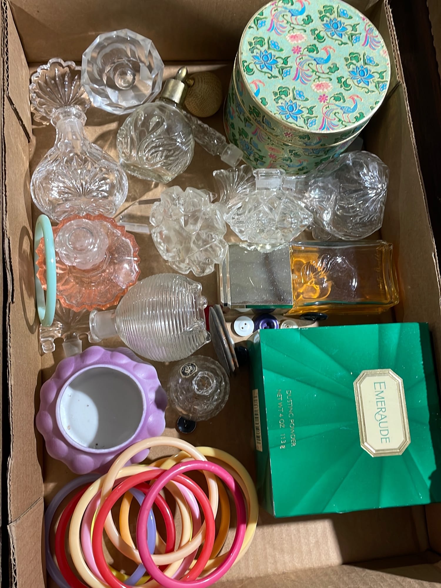 2010 Vintage metal music box ,5.5”, Avon porcelain covered music box , vintage powder jar , clear and ruby glass covered dish , frosted glass rabbit candle holder ,miscellaneous