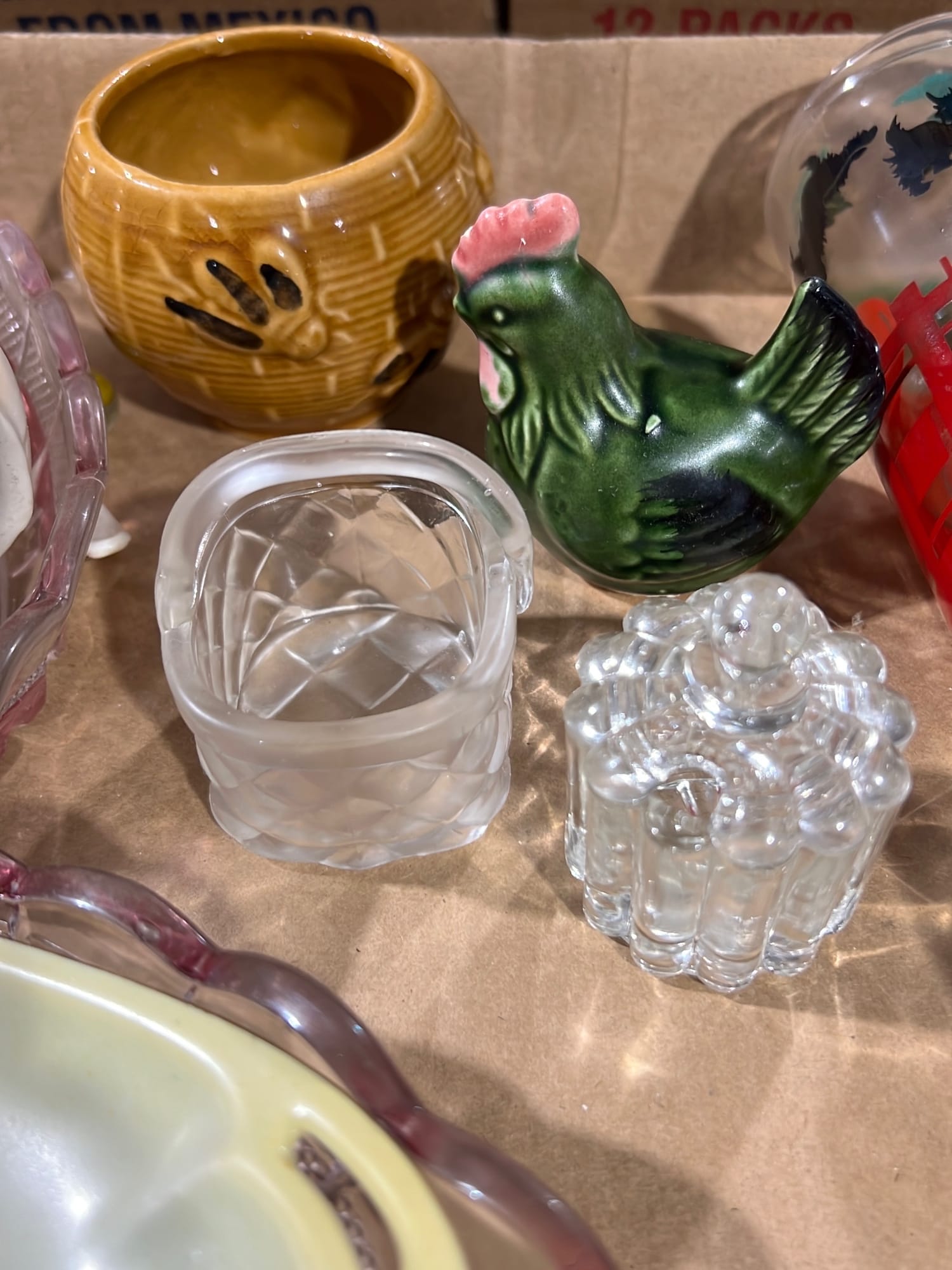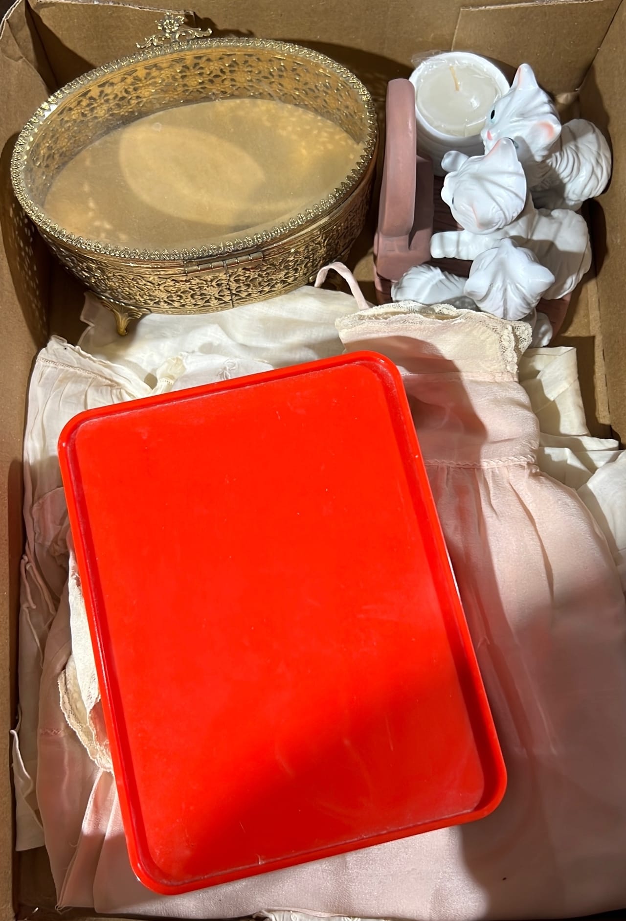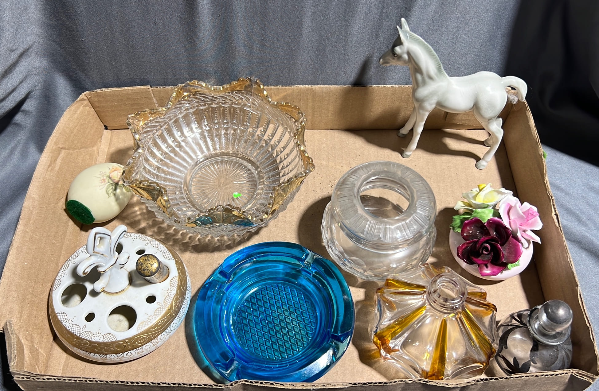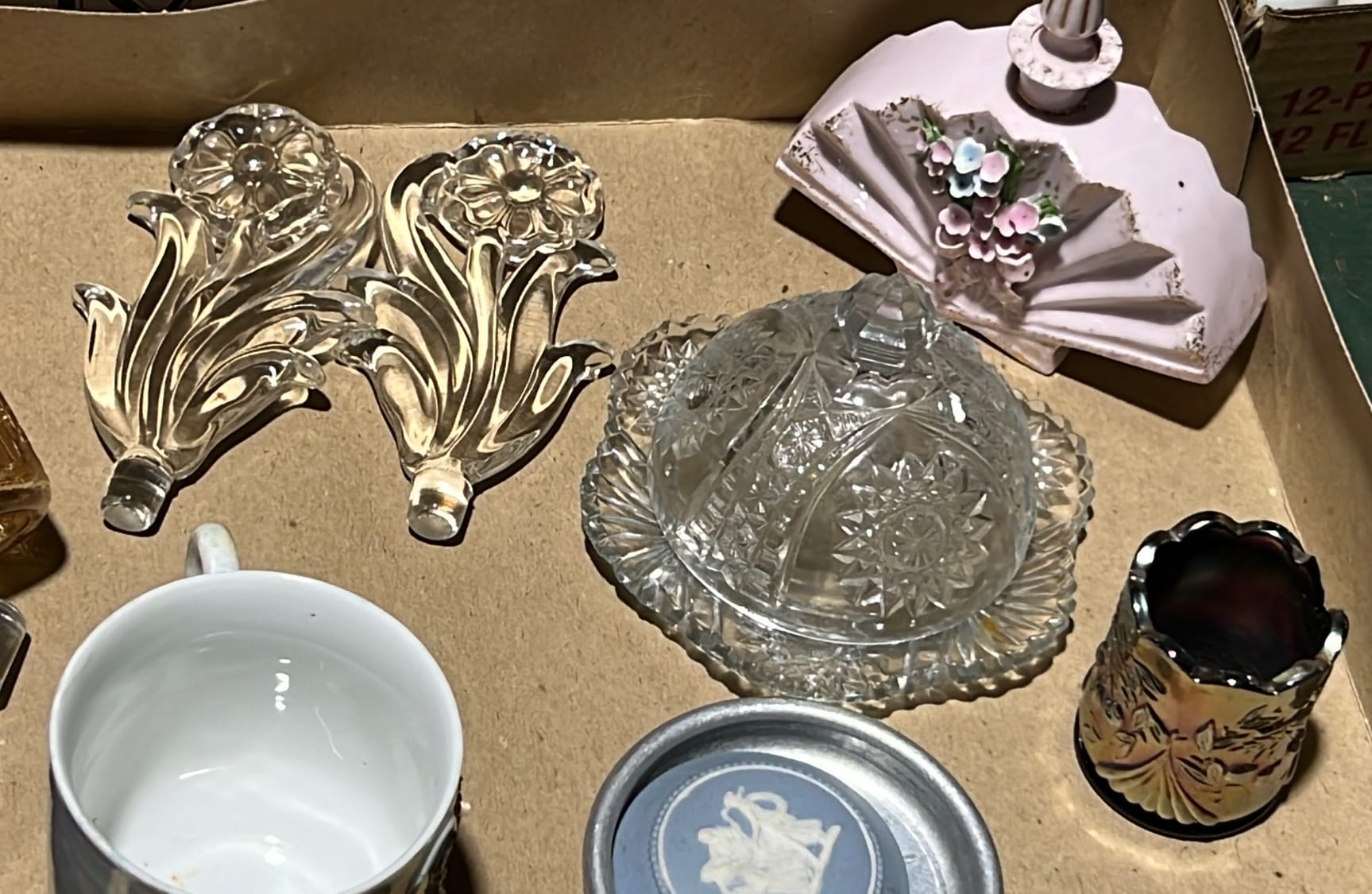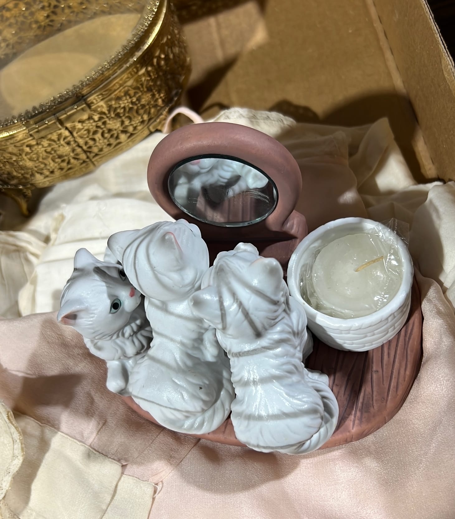 2010 Vintage metal music box ,5.5”, Avon porcelain covered music box , vintage powder jar , clear and ruby glass covered dish , frosted glass rabbit candle holder ,miscellaneous