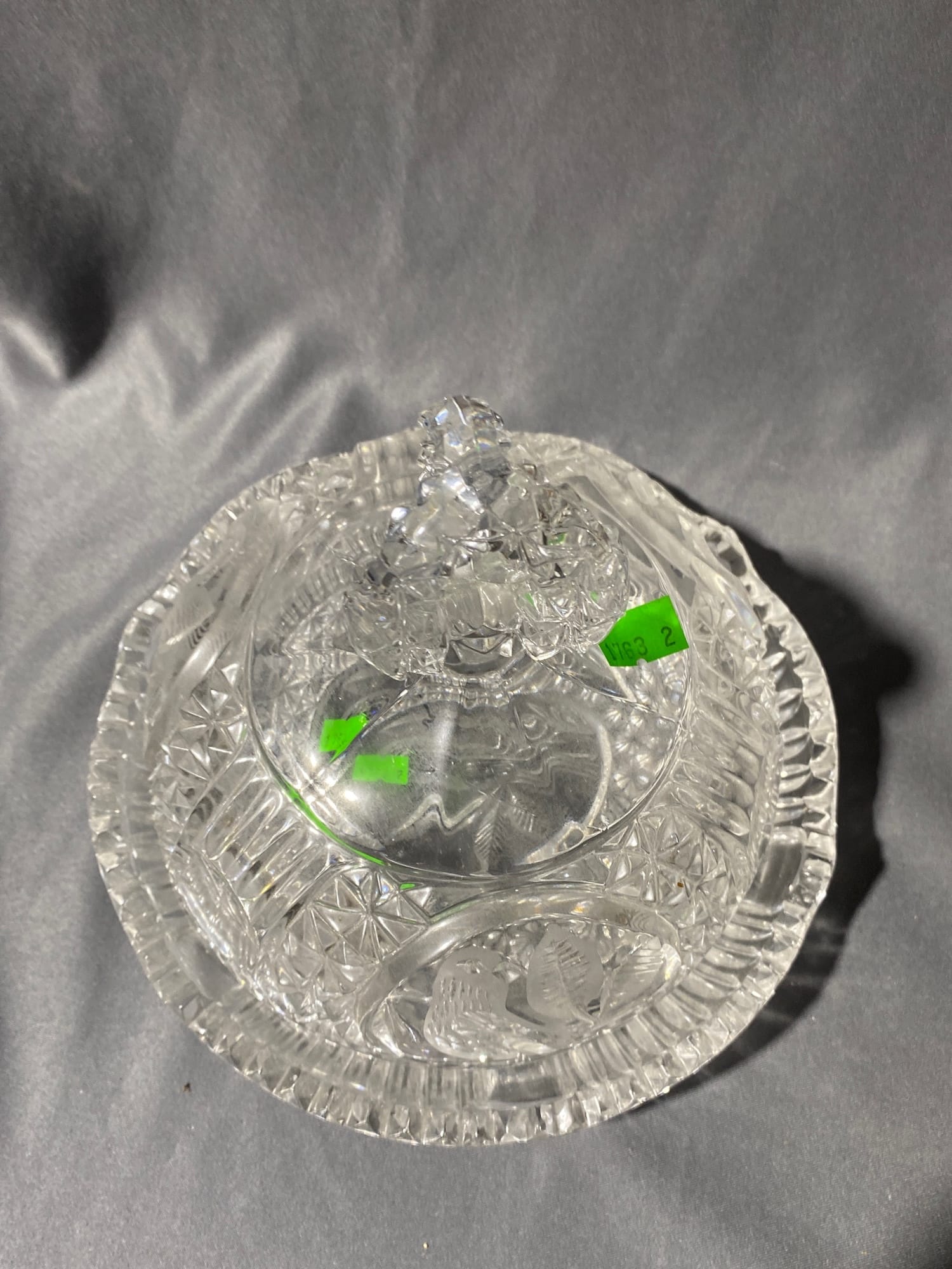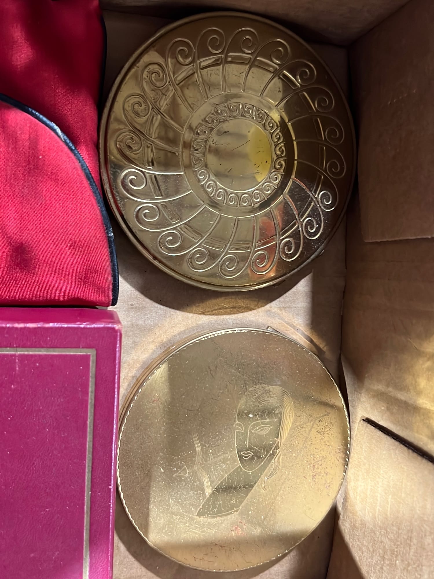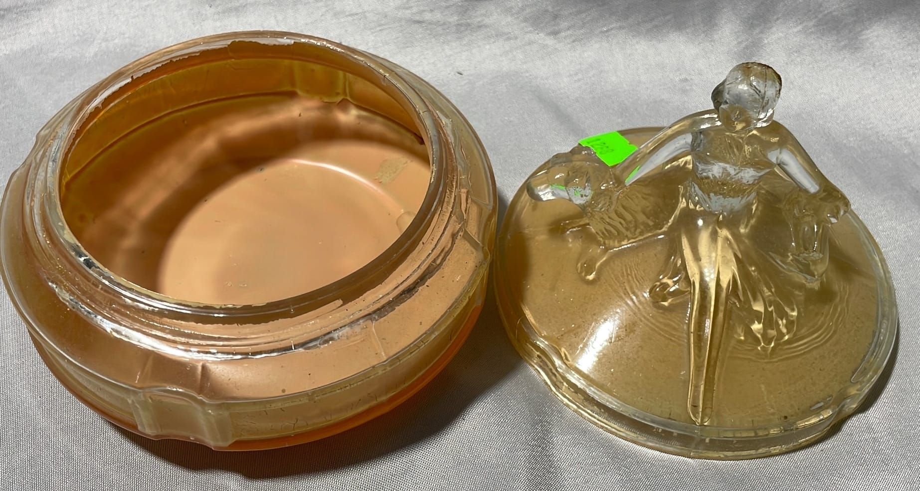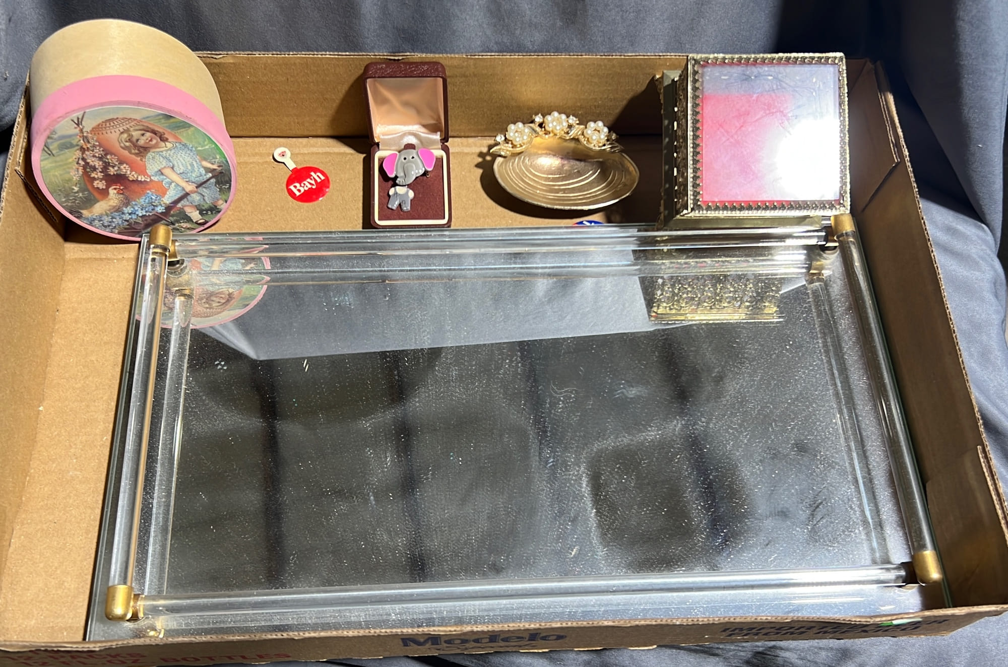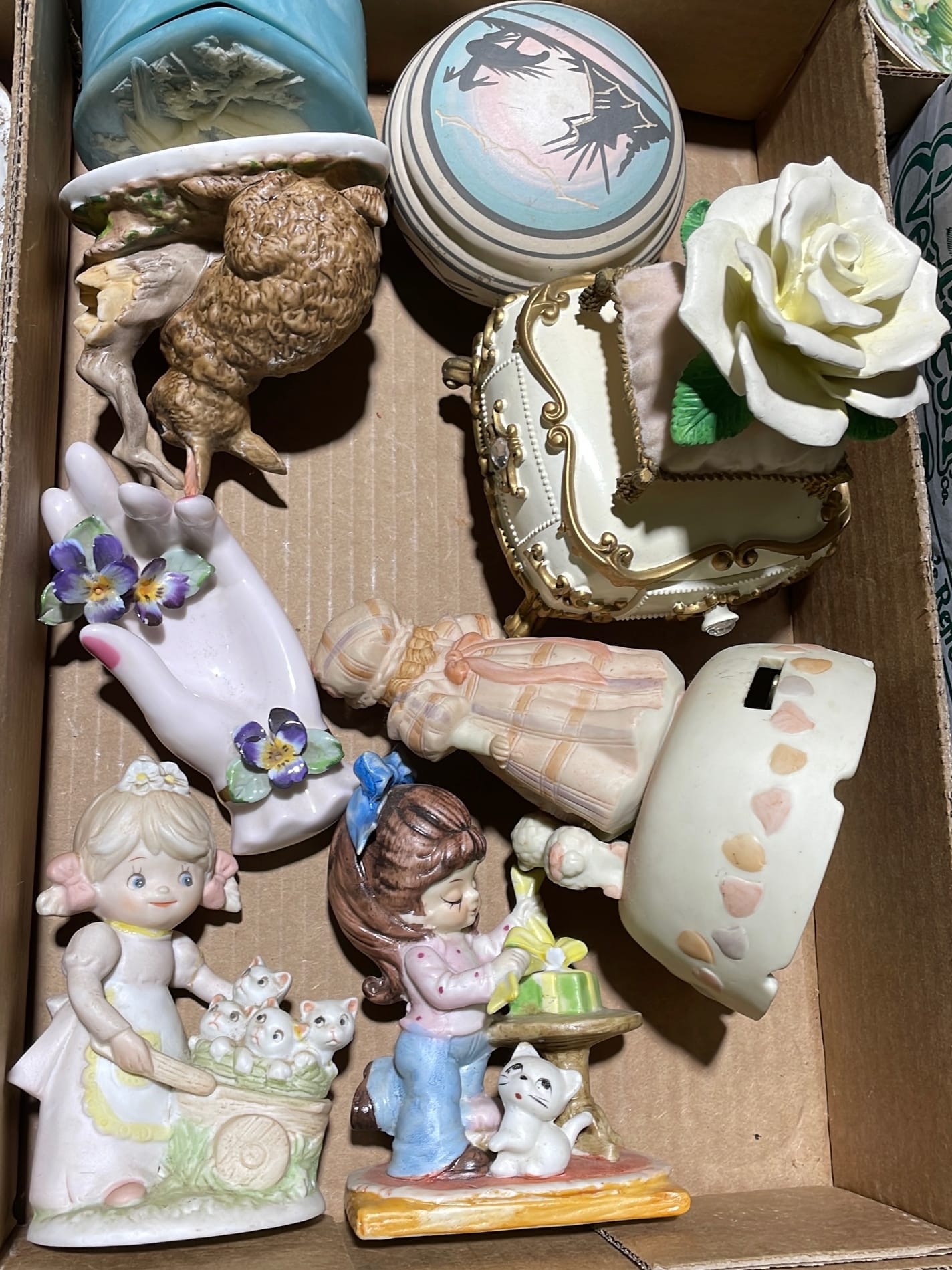 2010 Vintage metal music box ,5.5”, Avon porcelain covered music box , vintage powder jar , clear and ruby glass covered dish , frosted glass rabbit candle holder ,miscellaneous