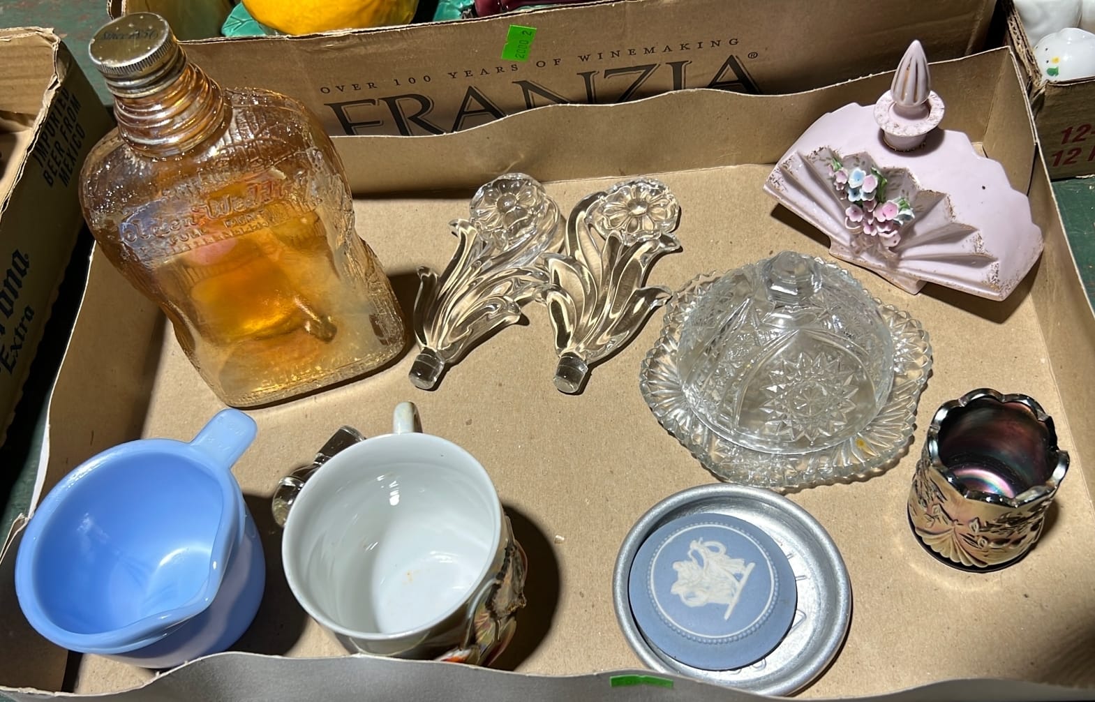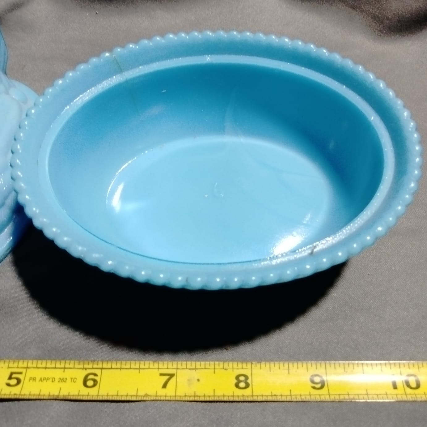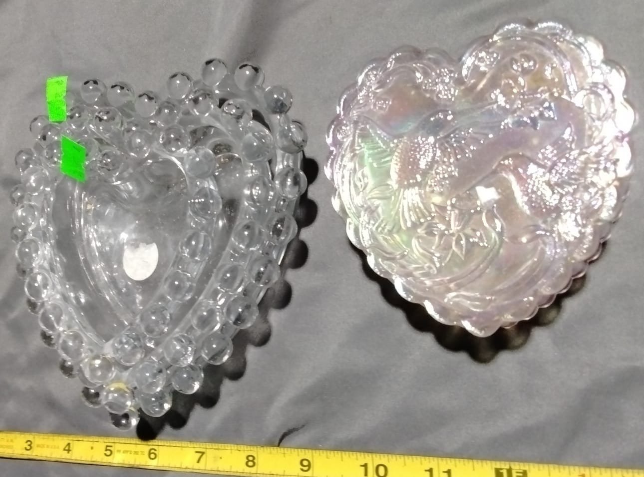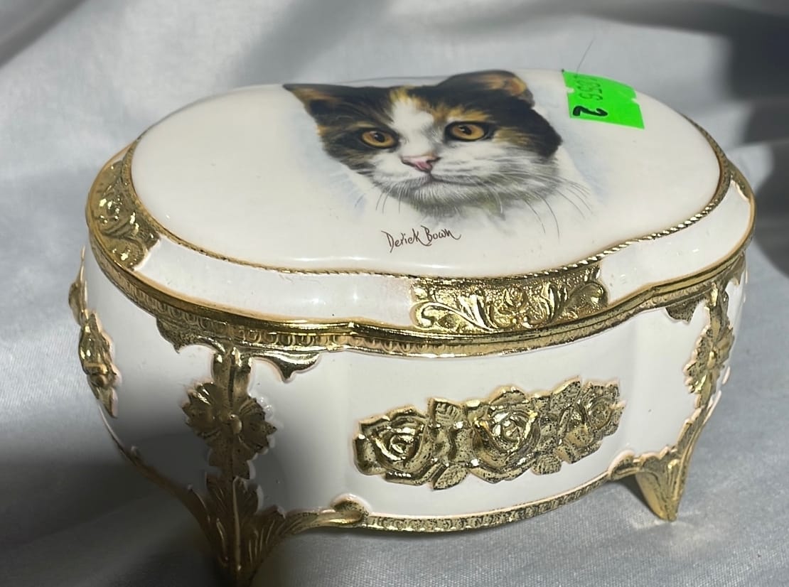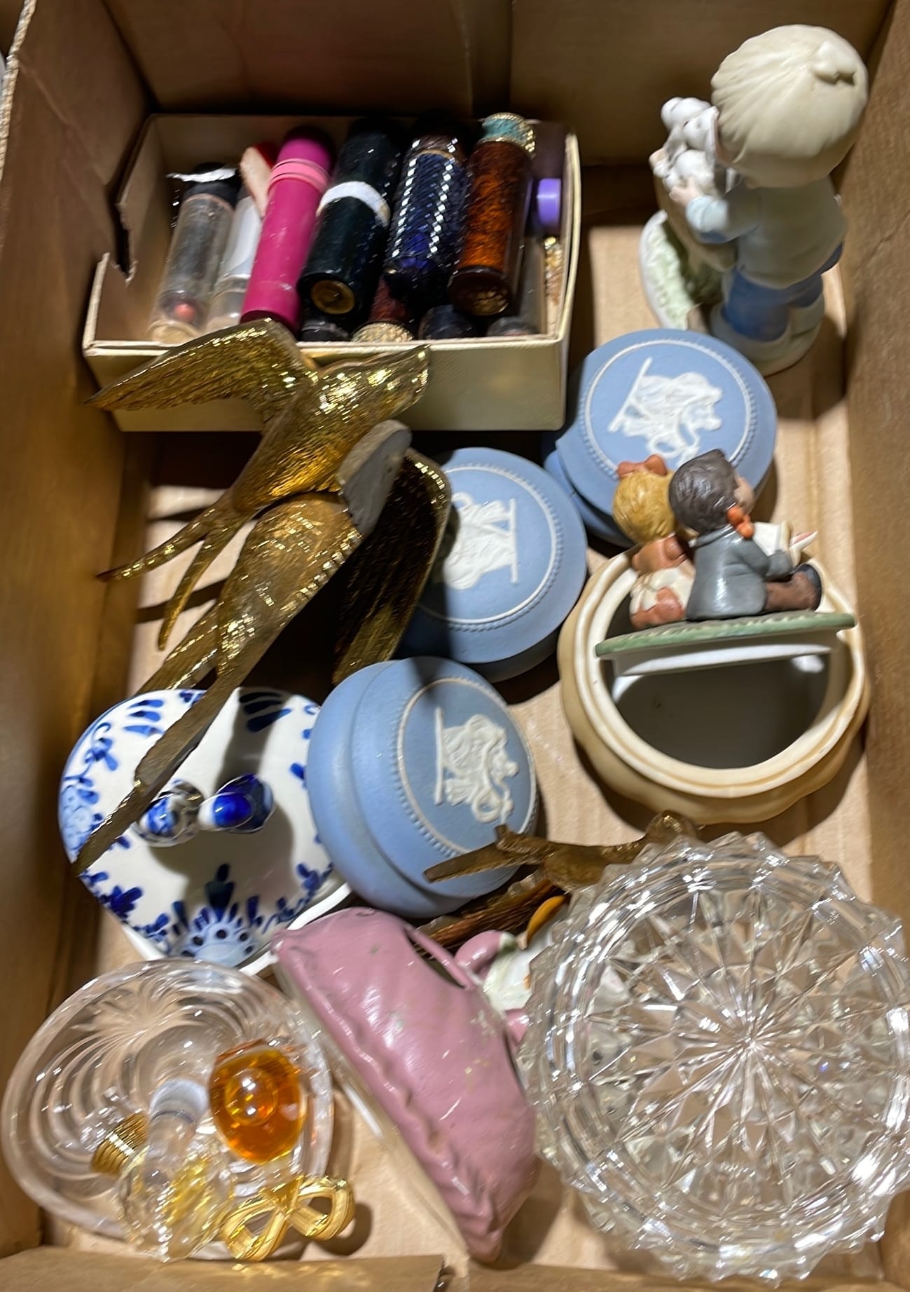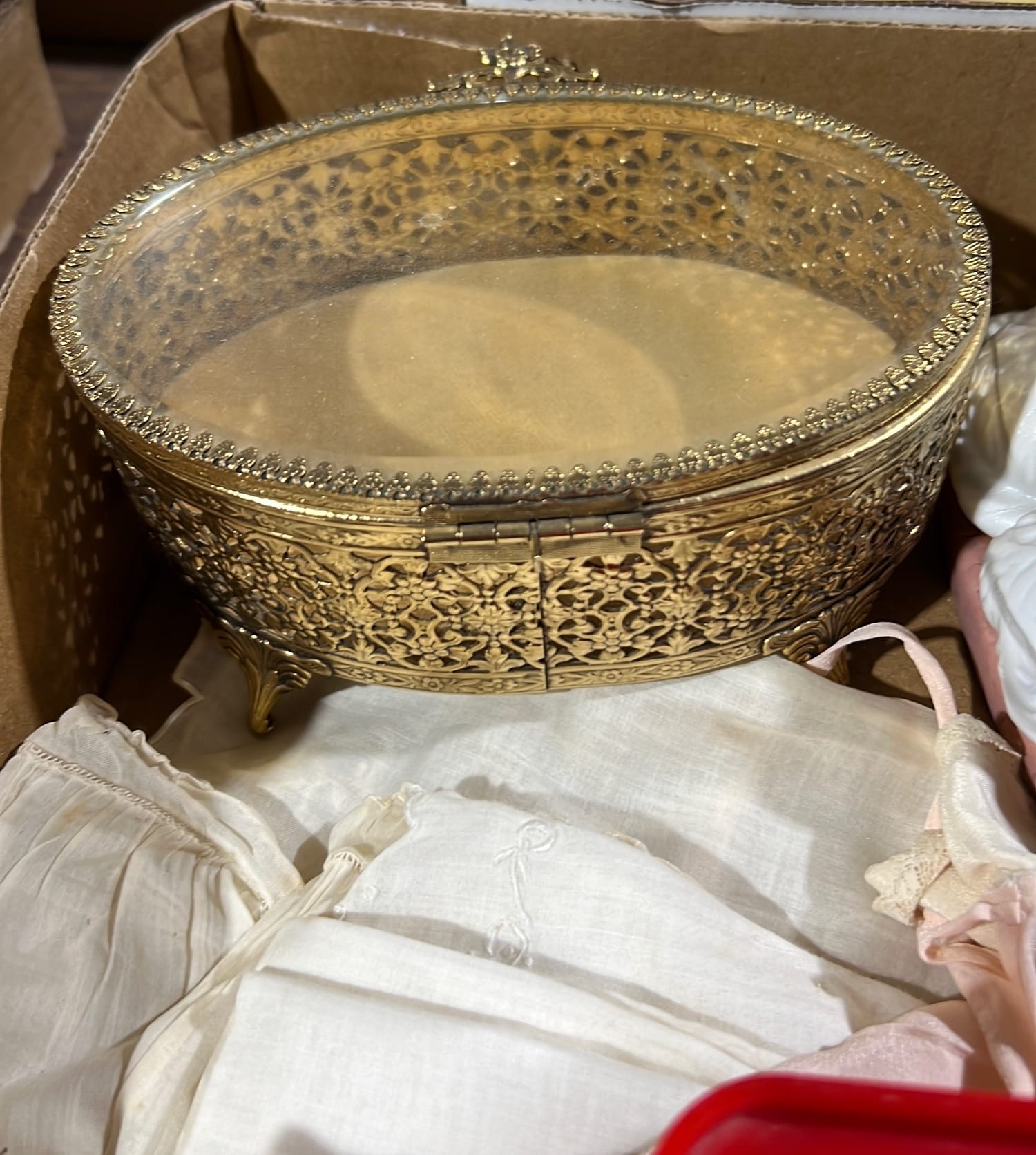 2010 Vintage metal music box ,5.5”, Avon porcelain covered music box , vintage powder jar , clear and ruby glass covered dish , frosted glass rabbit candle holder ,miscellaneous
