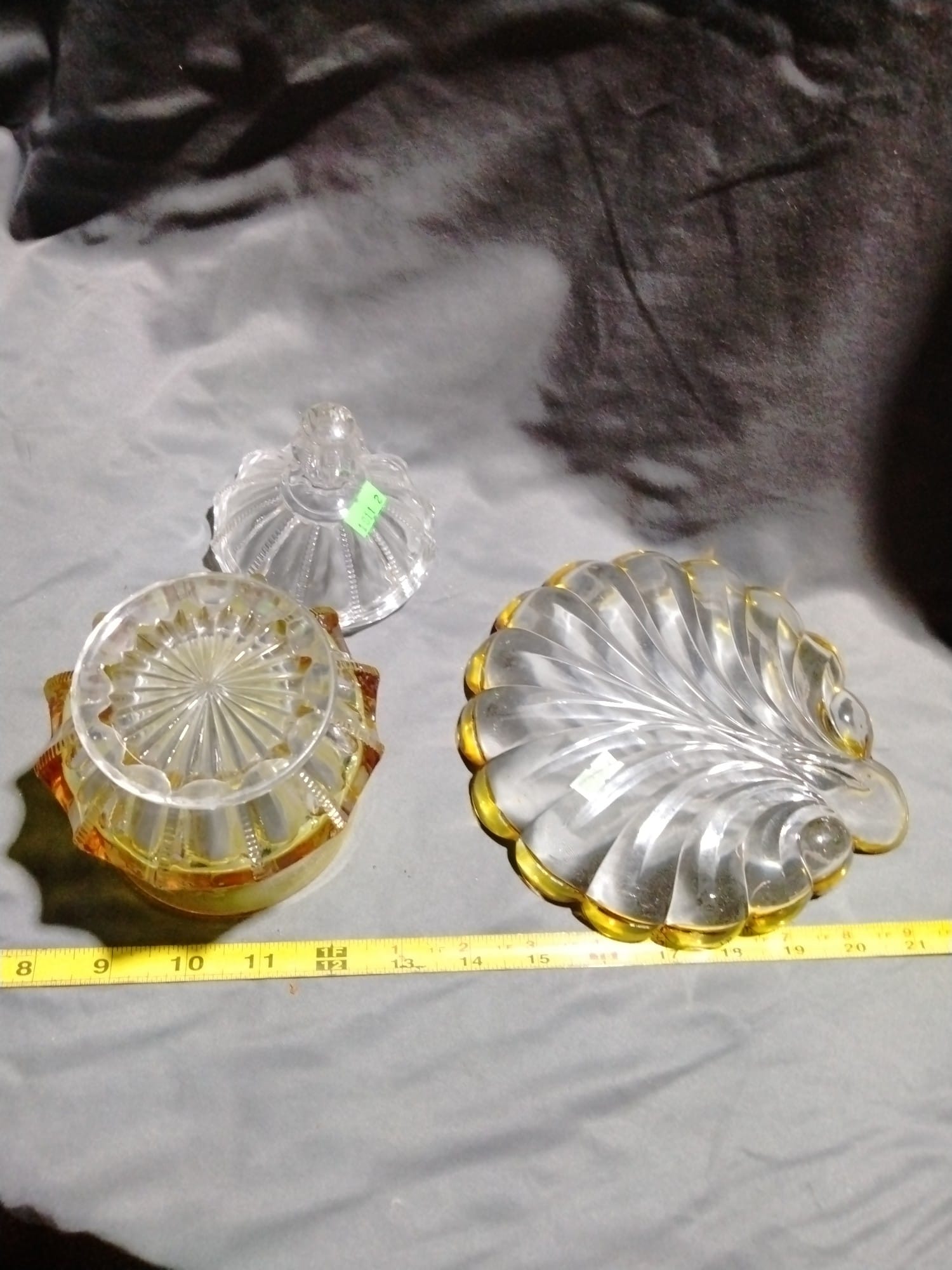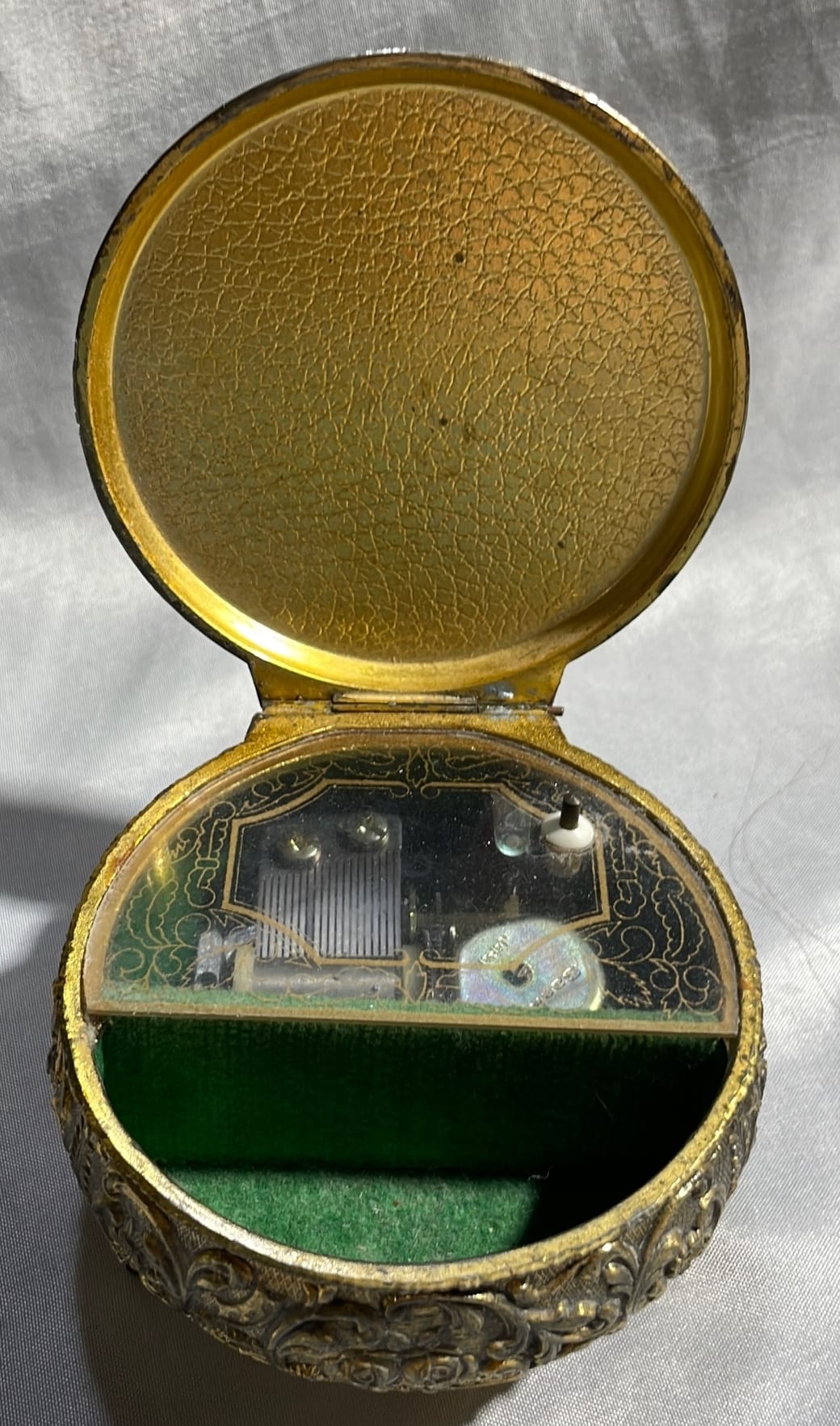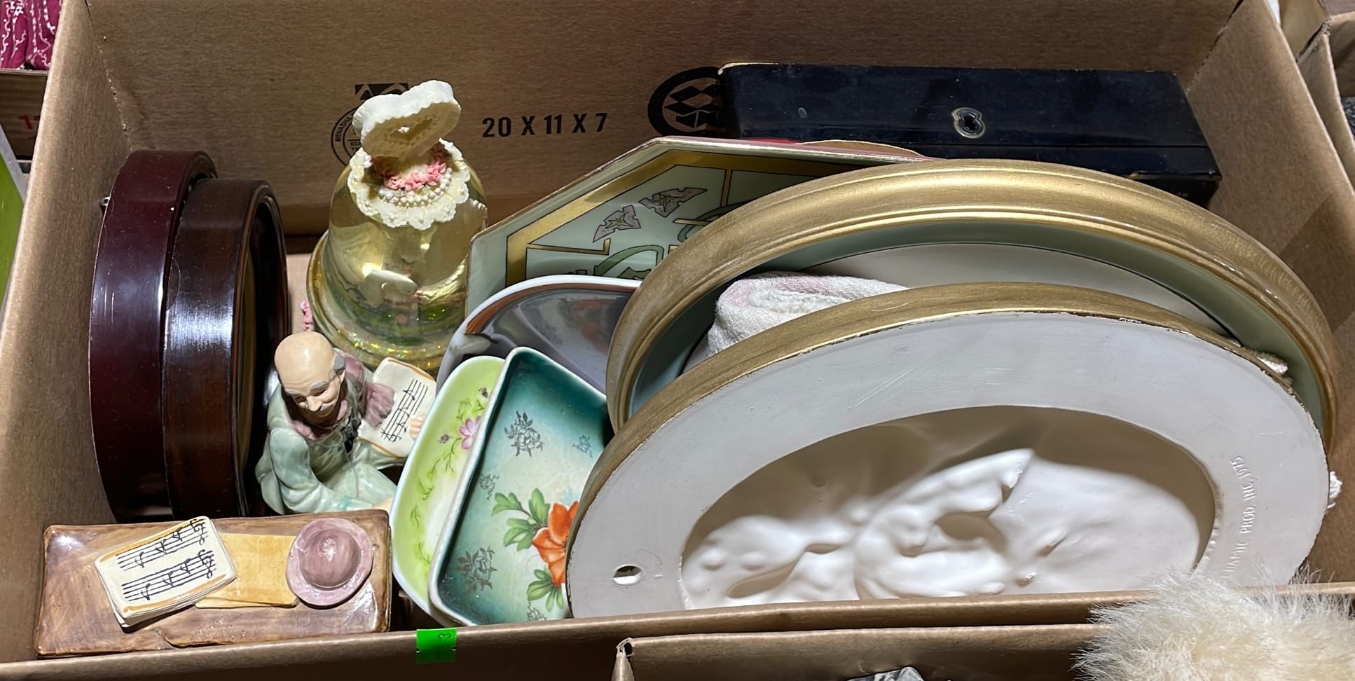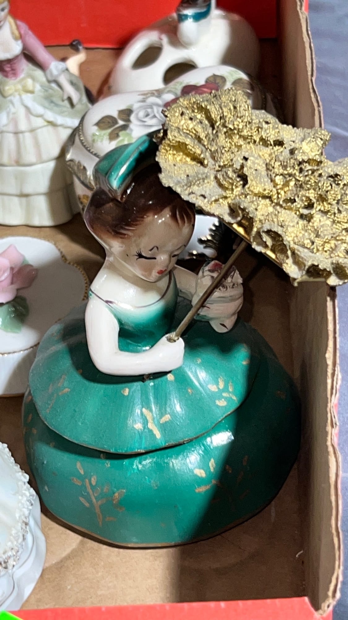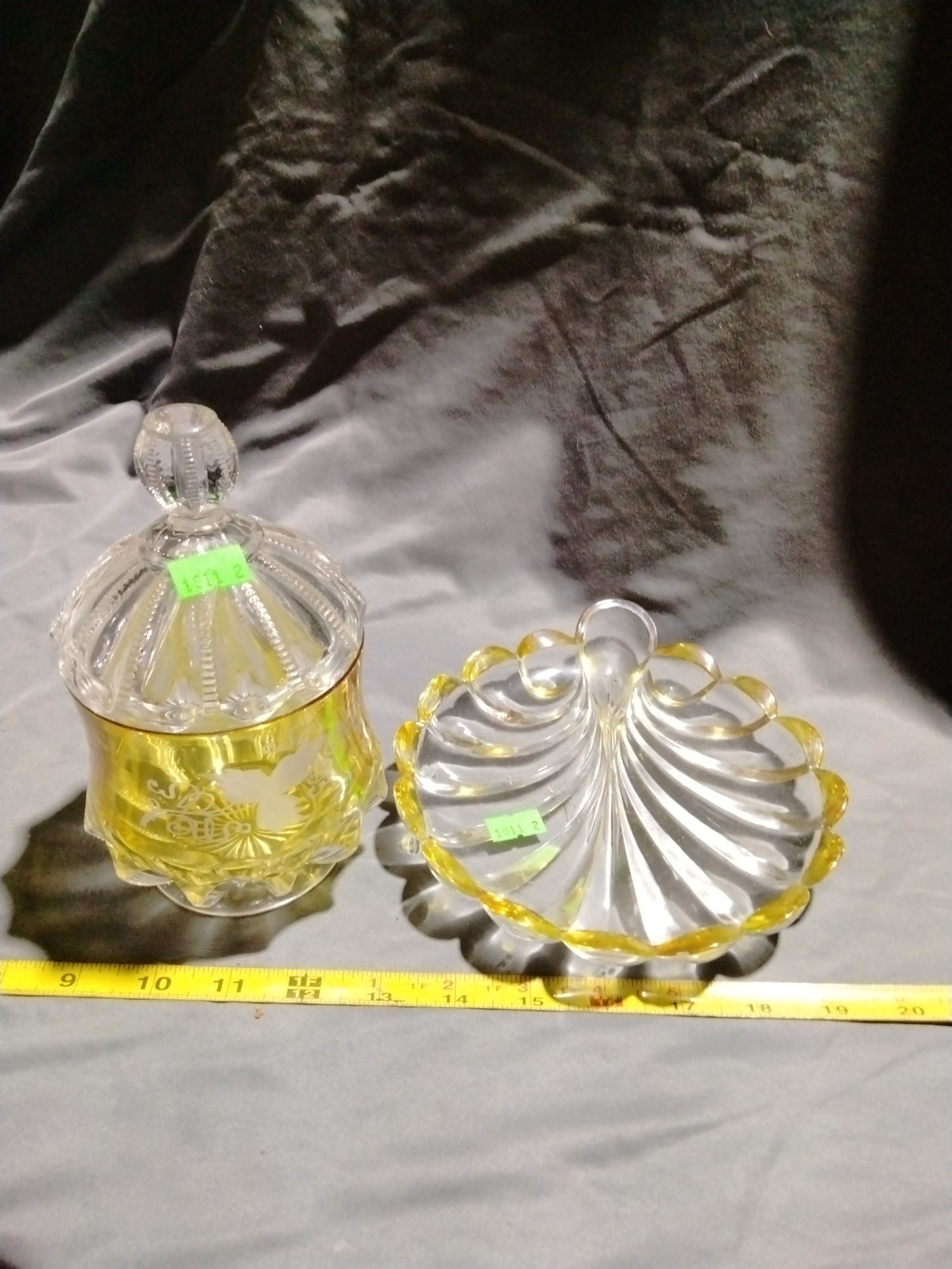 2010 Vintage metal music box ,5.5”, Avon porcelain covered music box , vintage powder jar , clear and ruby glass covered dish , frosted glass rabbit candle holder ,miscellaneous