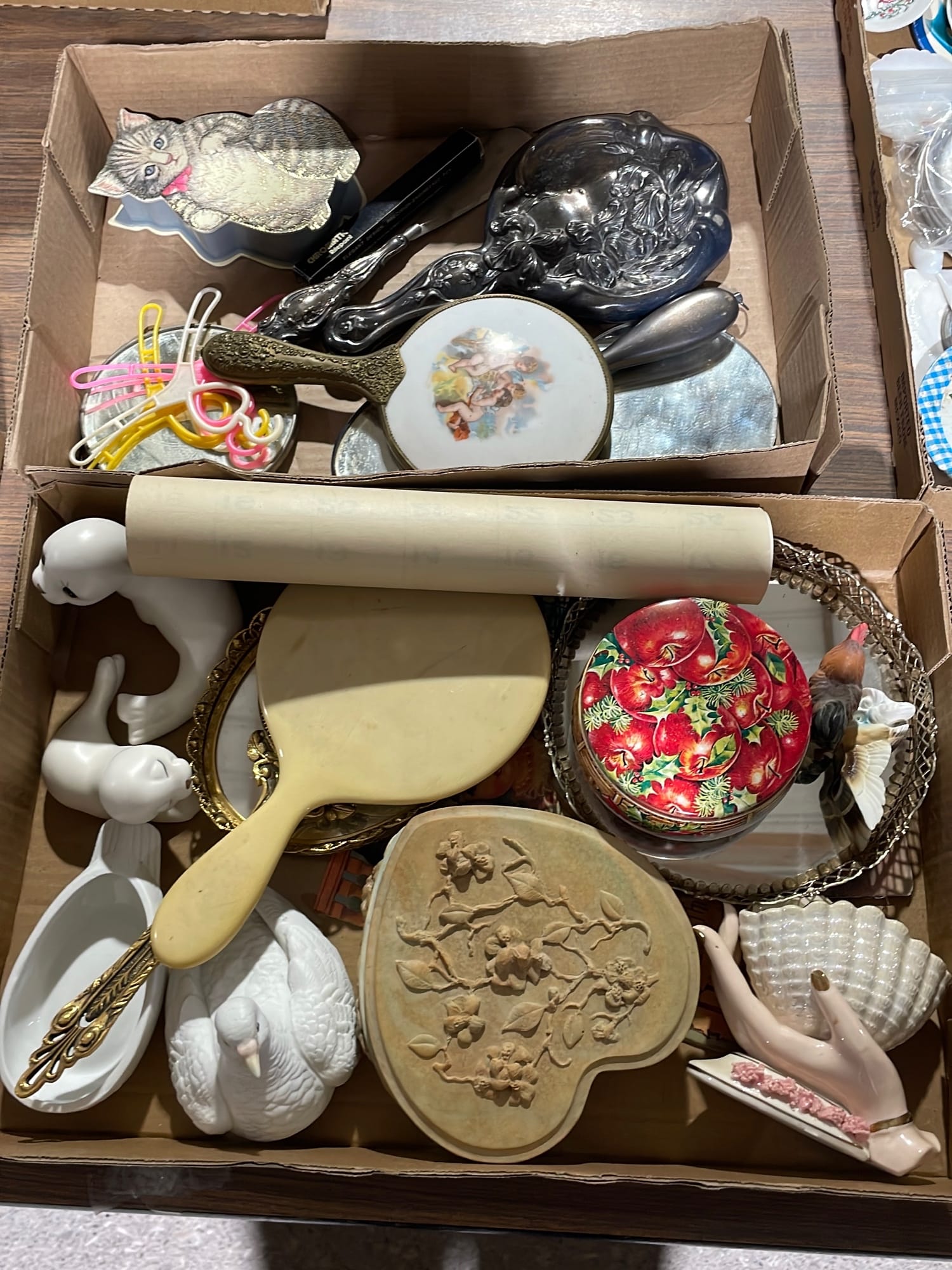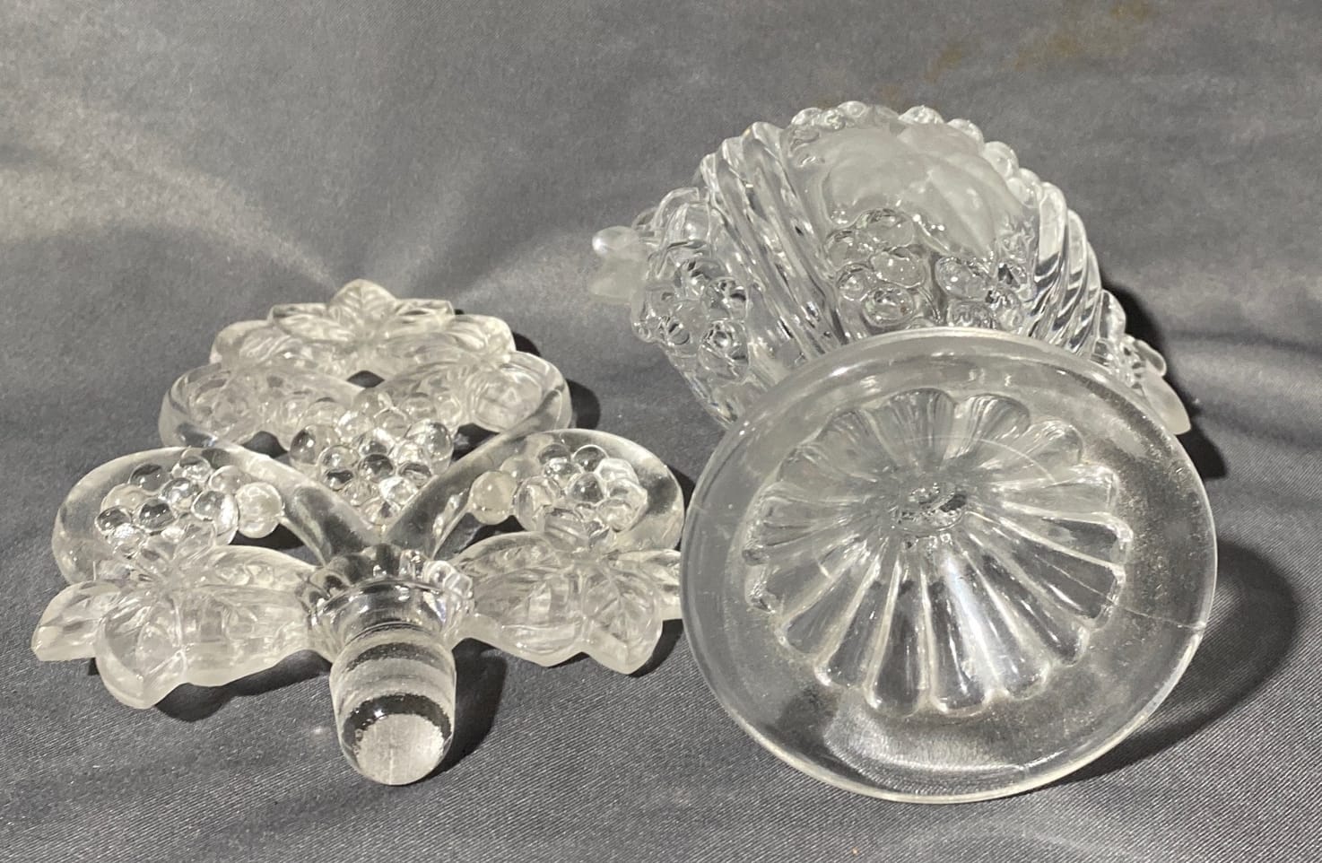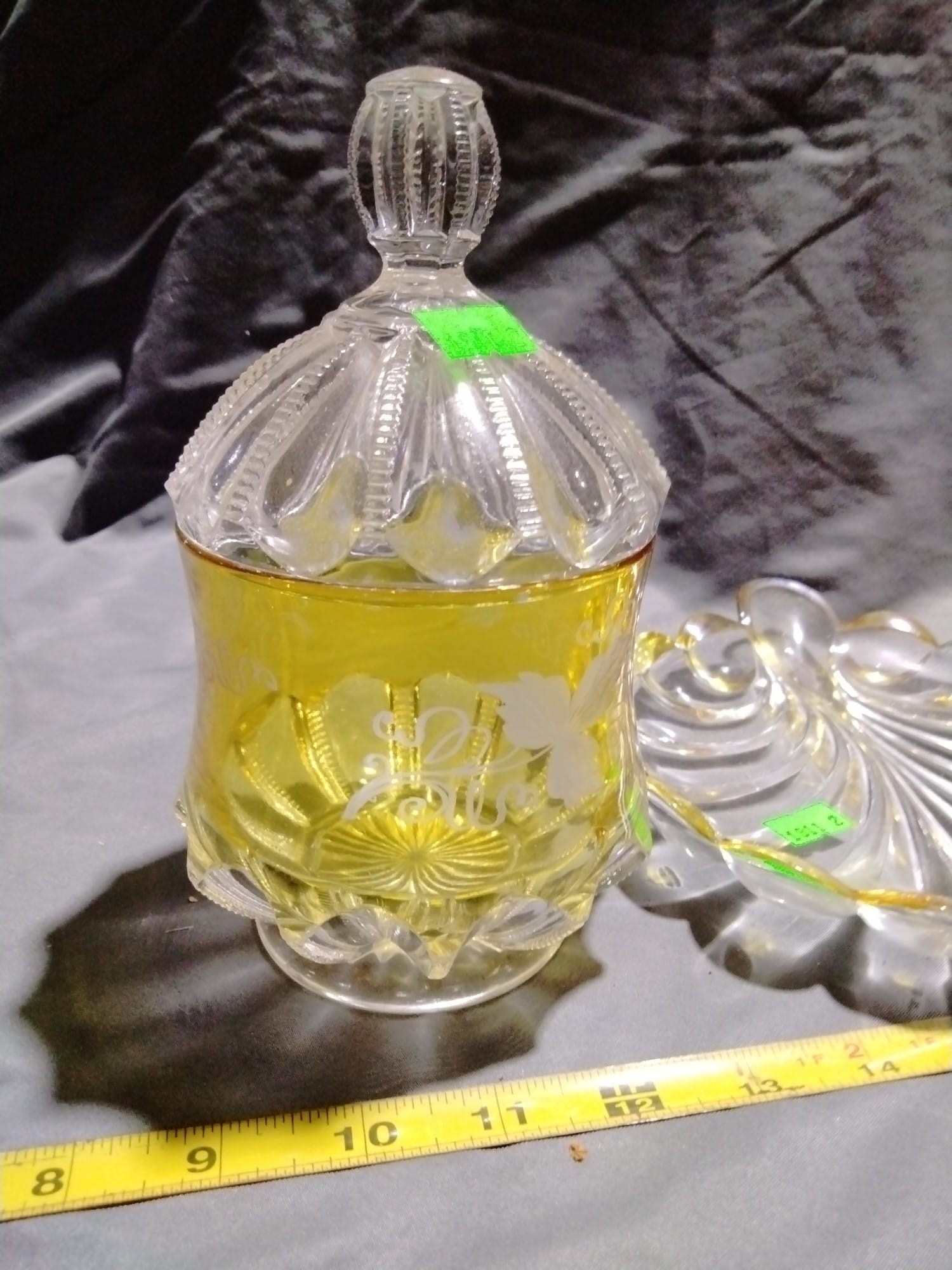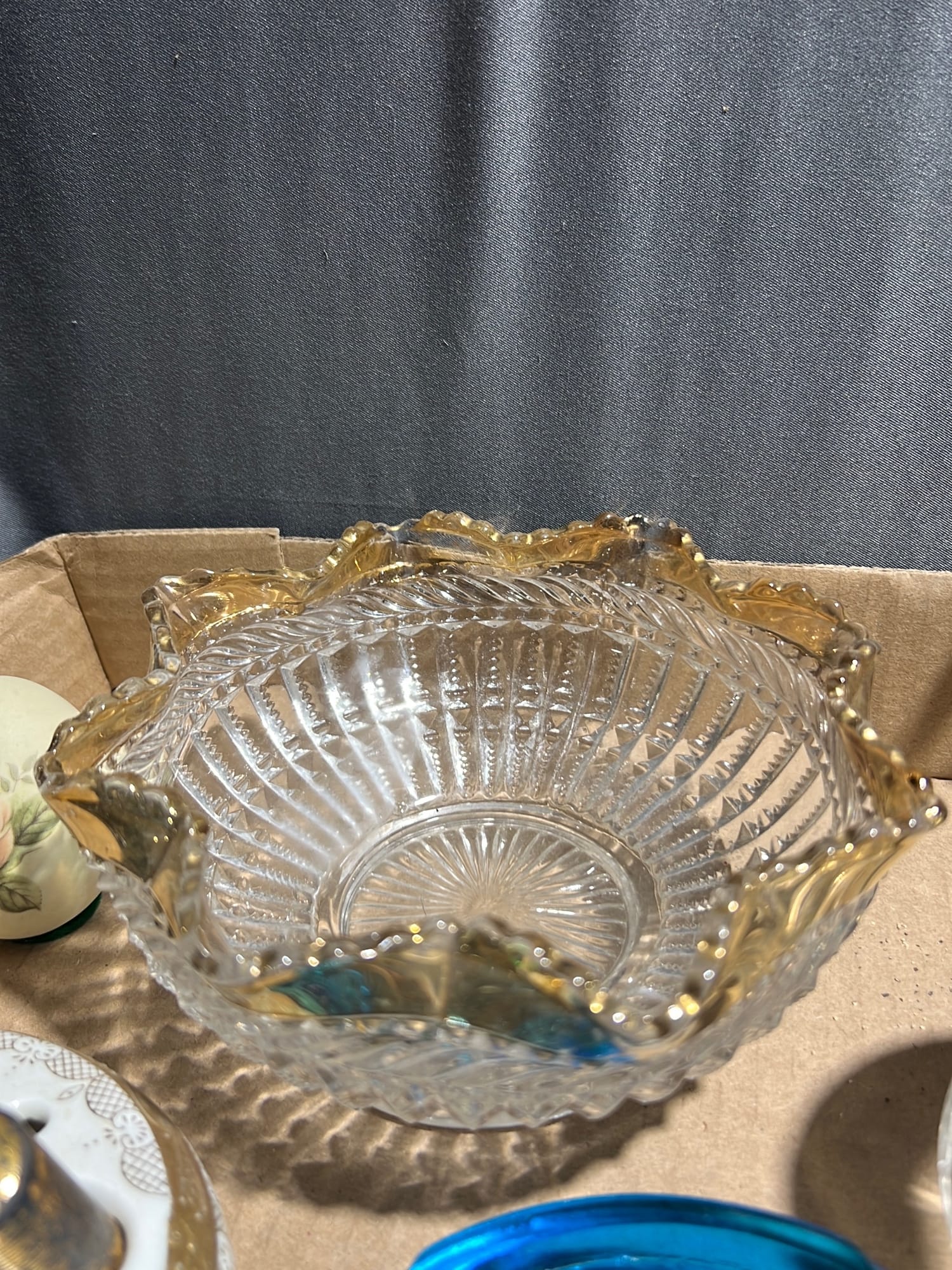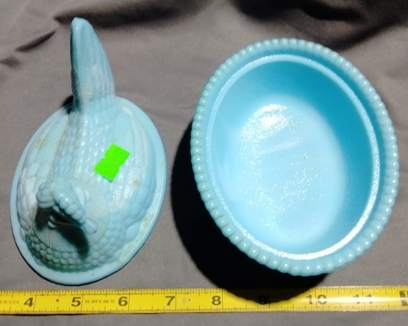 2010 Vintage metal music box ,5.5”, Avon porcelain covered music box , vintage powder jar , clear and ruby glass covered dish , frosted glass rabbit candle holder ,miscellaneous
