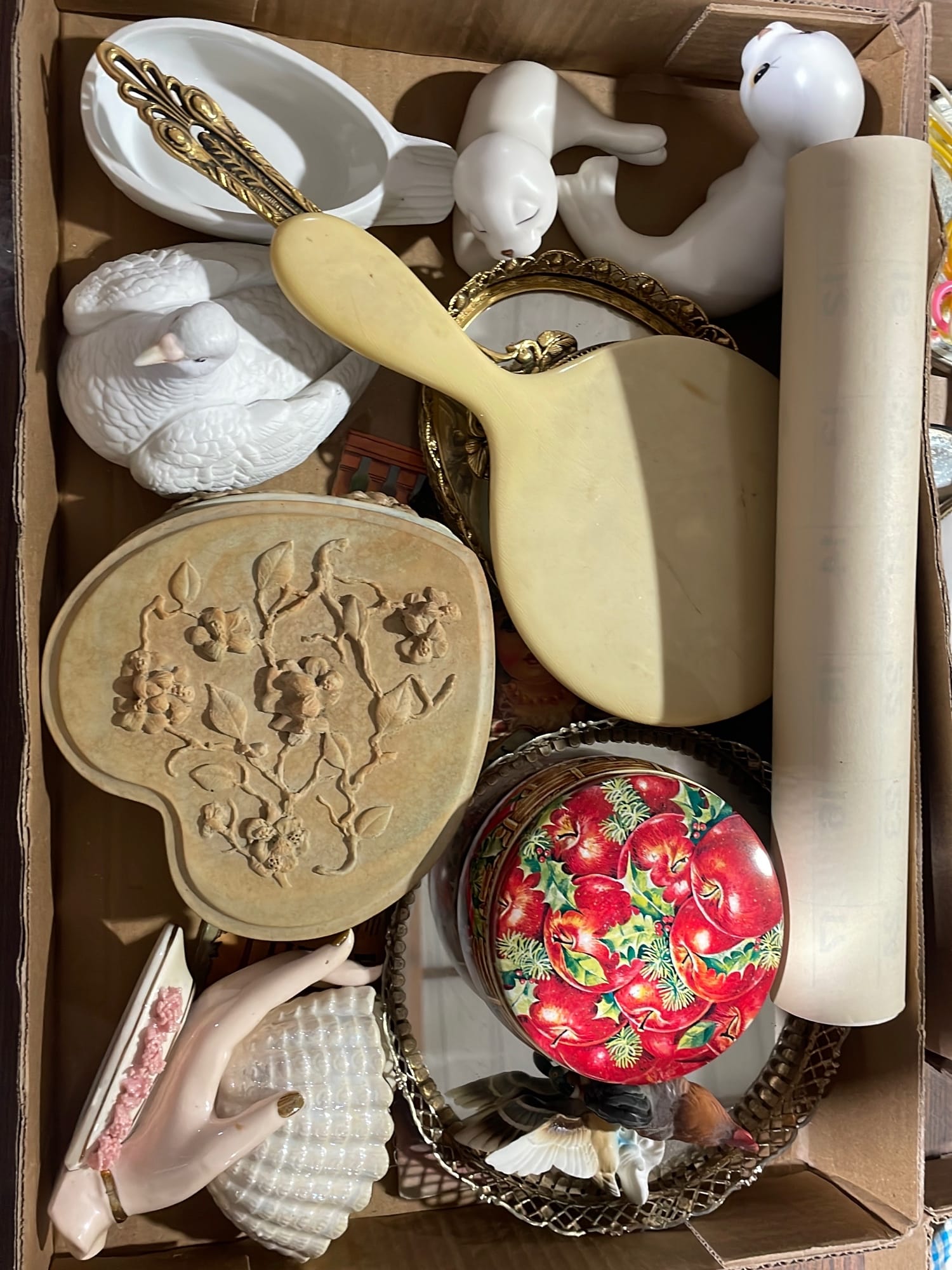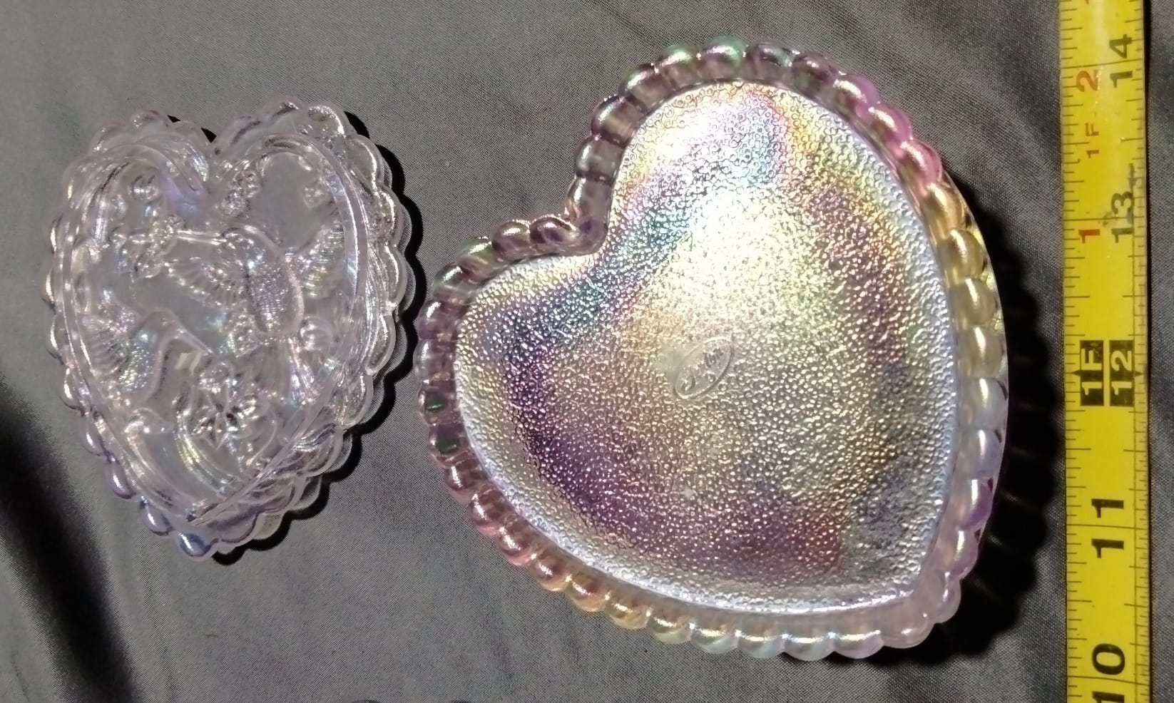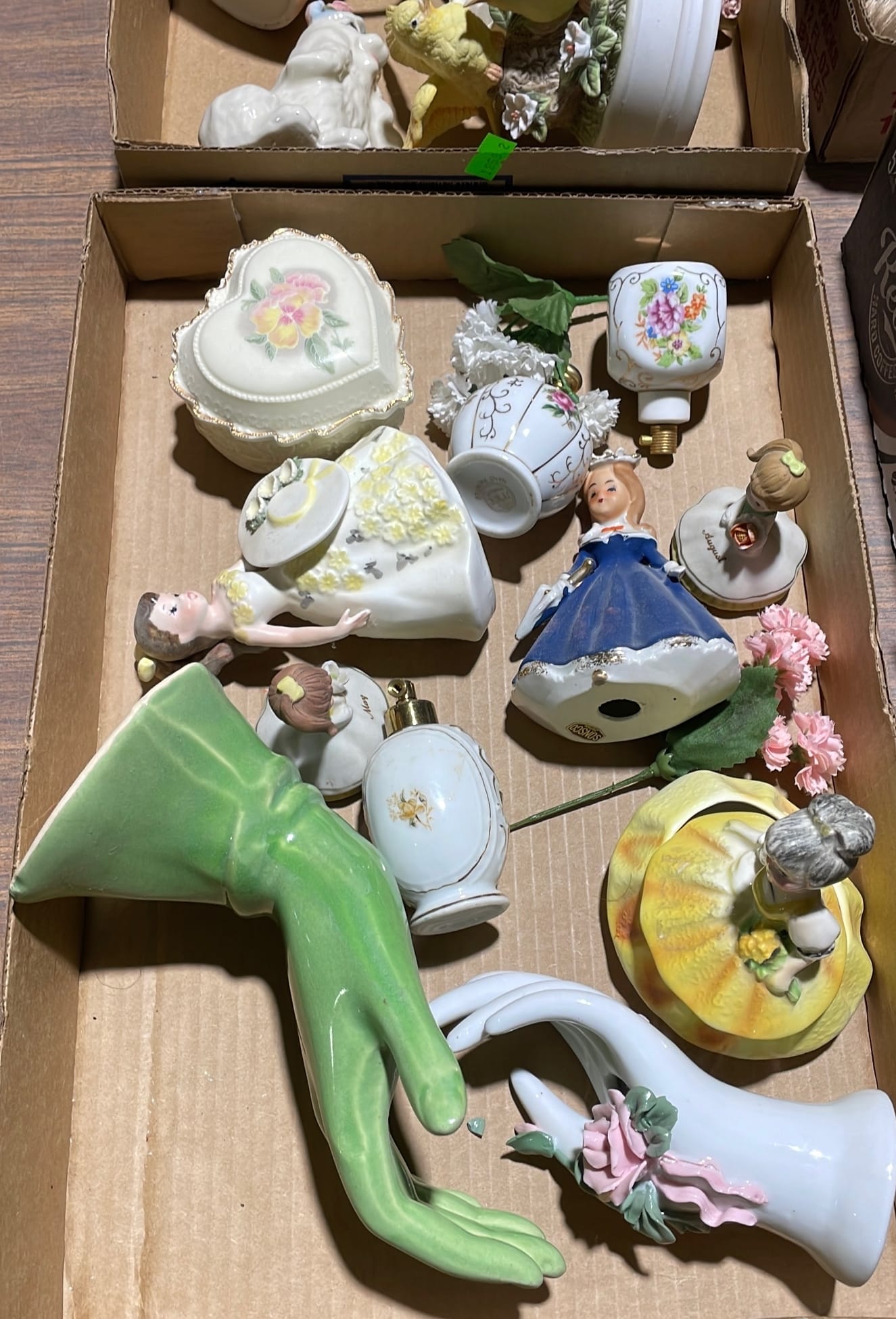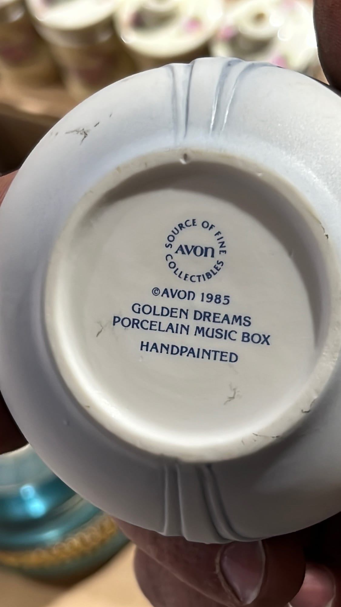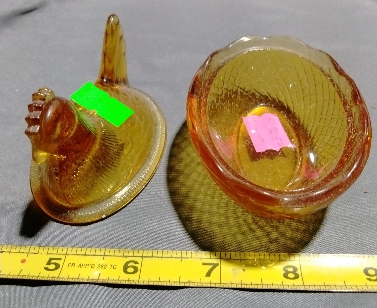 2010 Vintage metal music box ,5.5”, Avon porcelain covered music box , vintage powder jar , clear and ruby glass covered dish , frosted glass rabbit candle holder ,miscellaneous