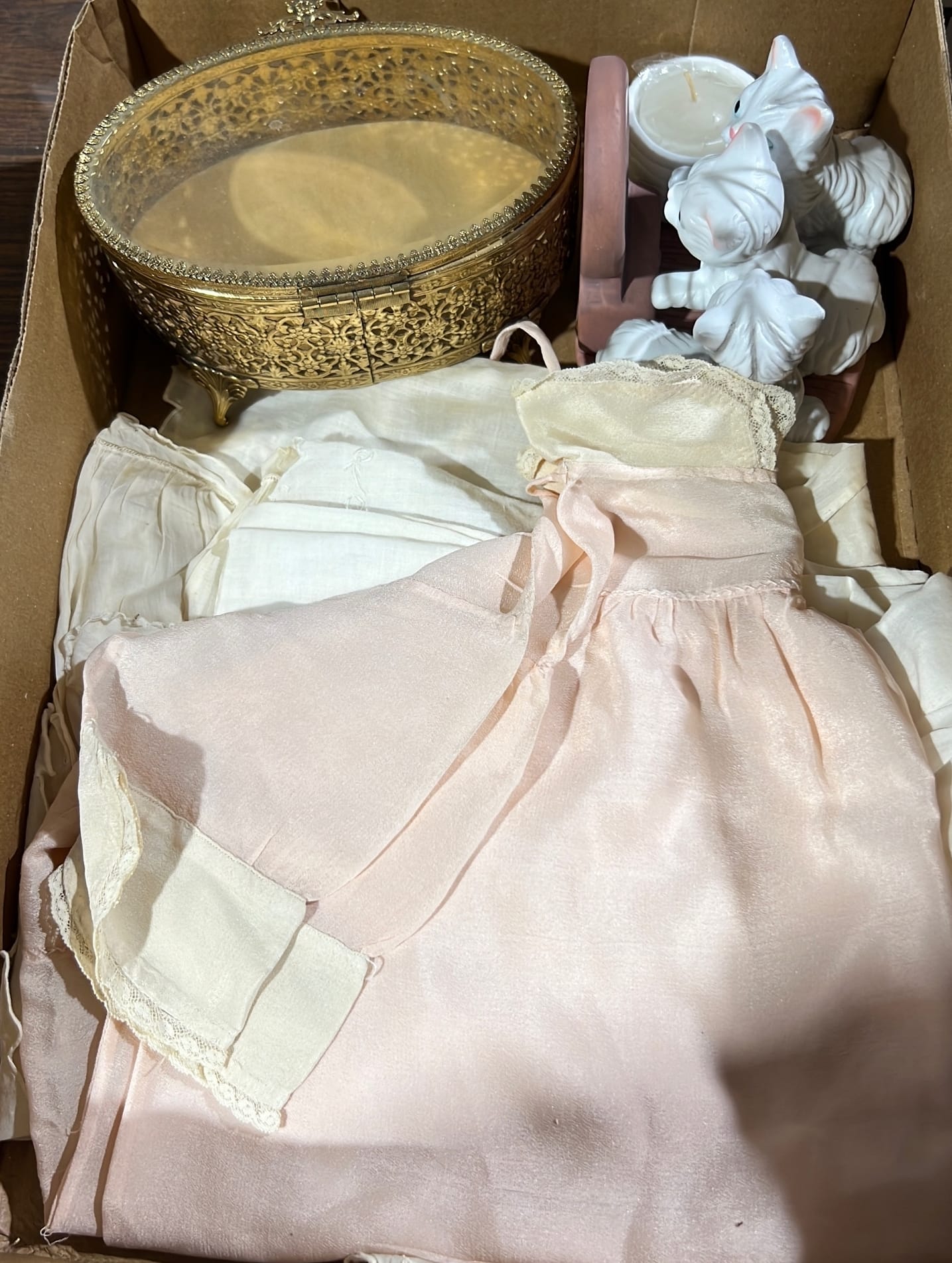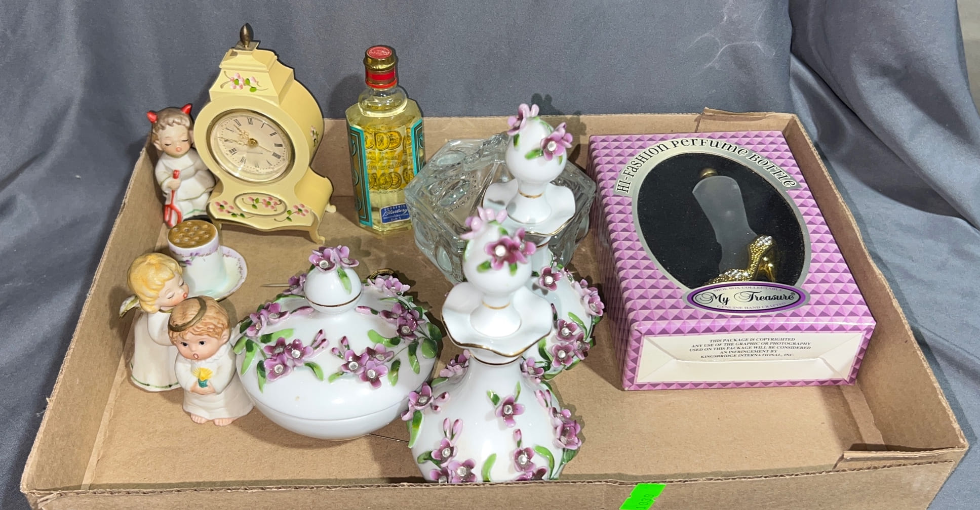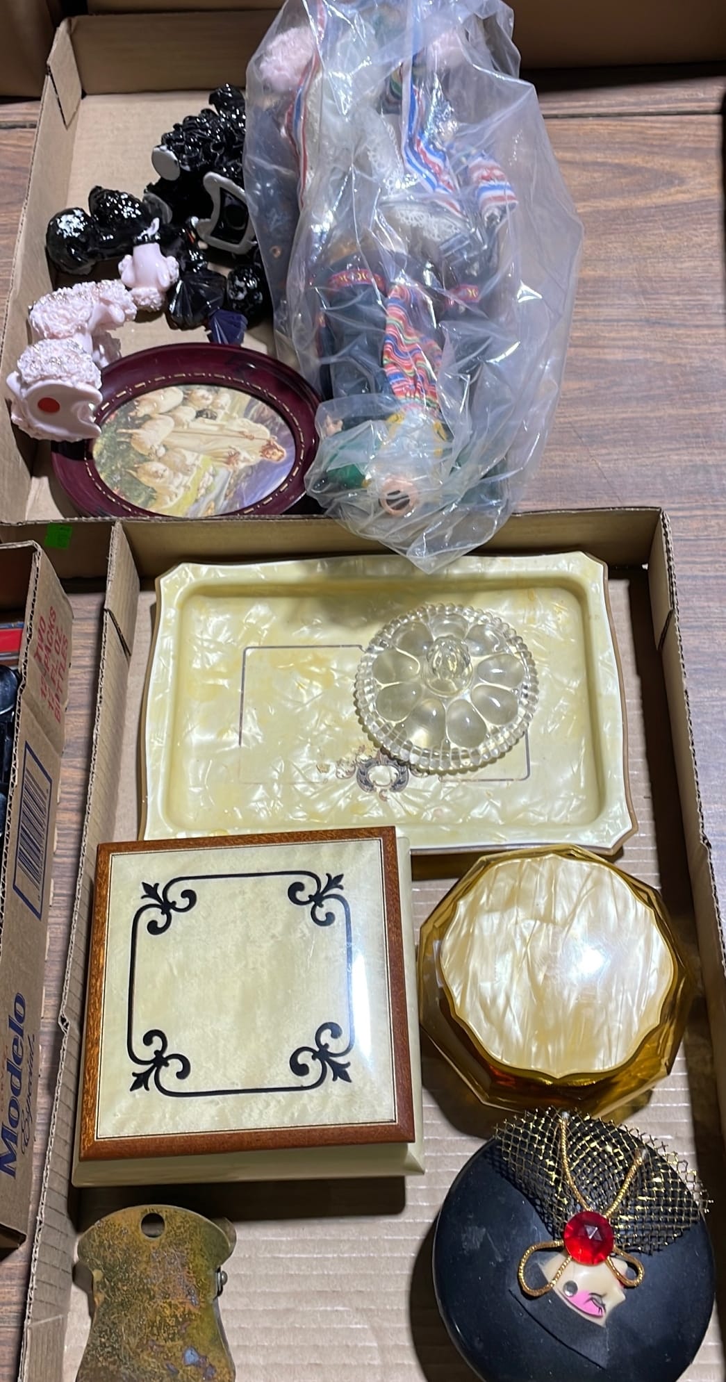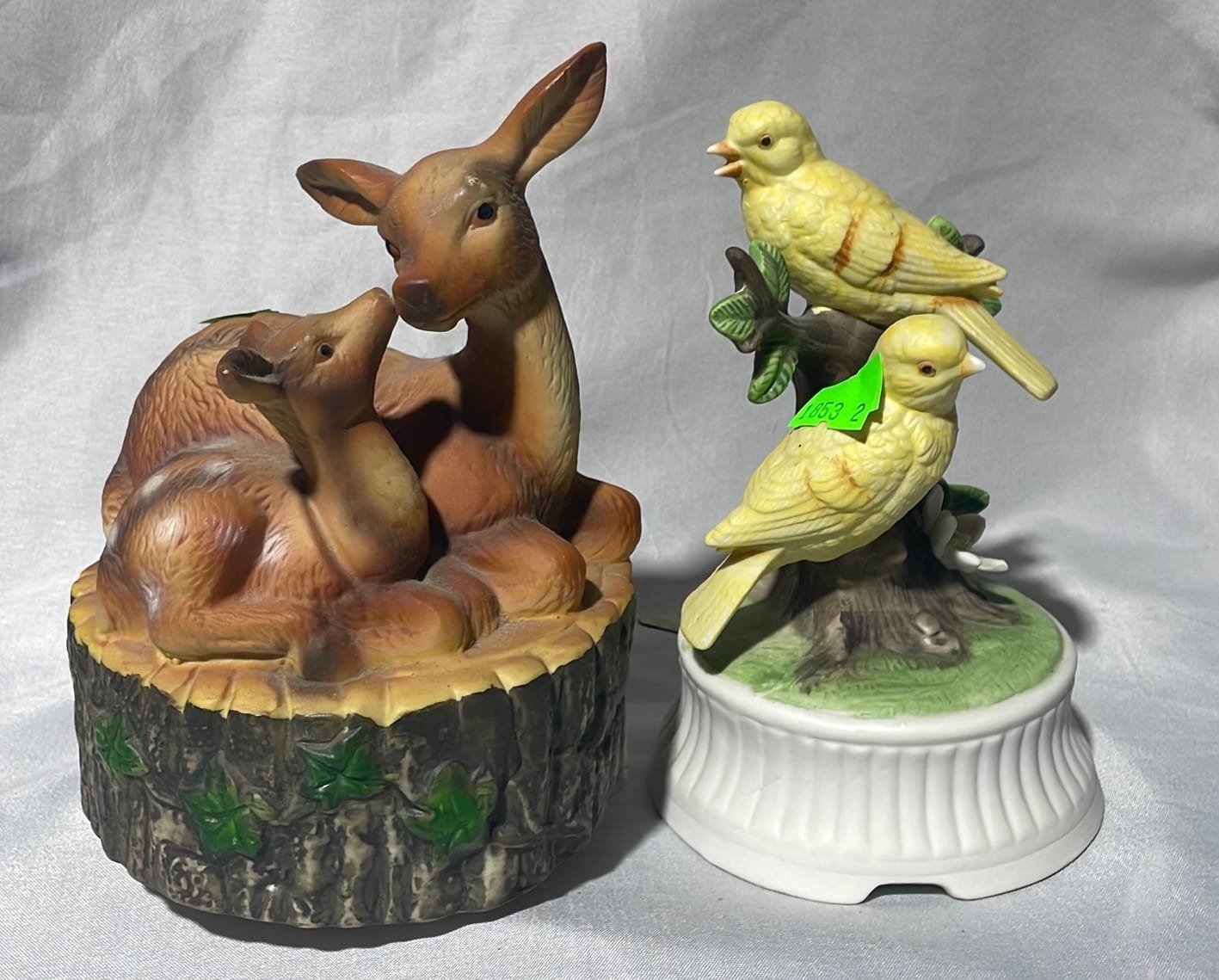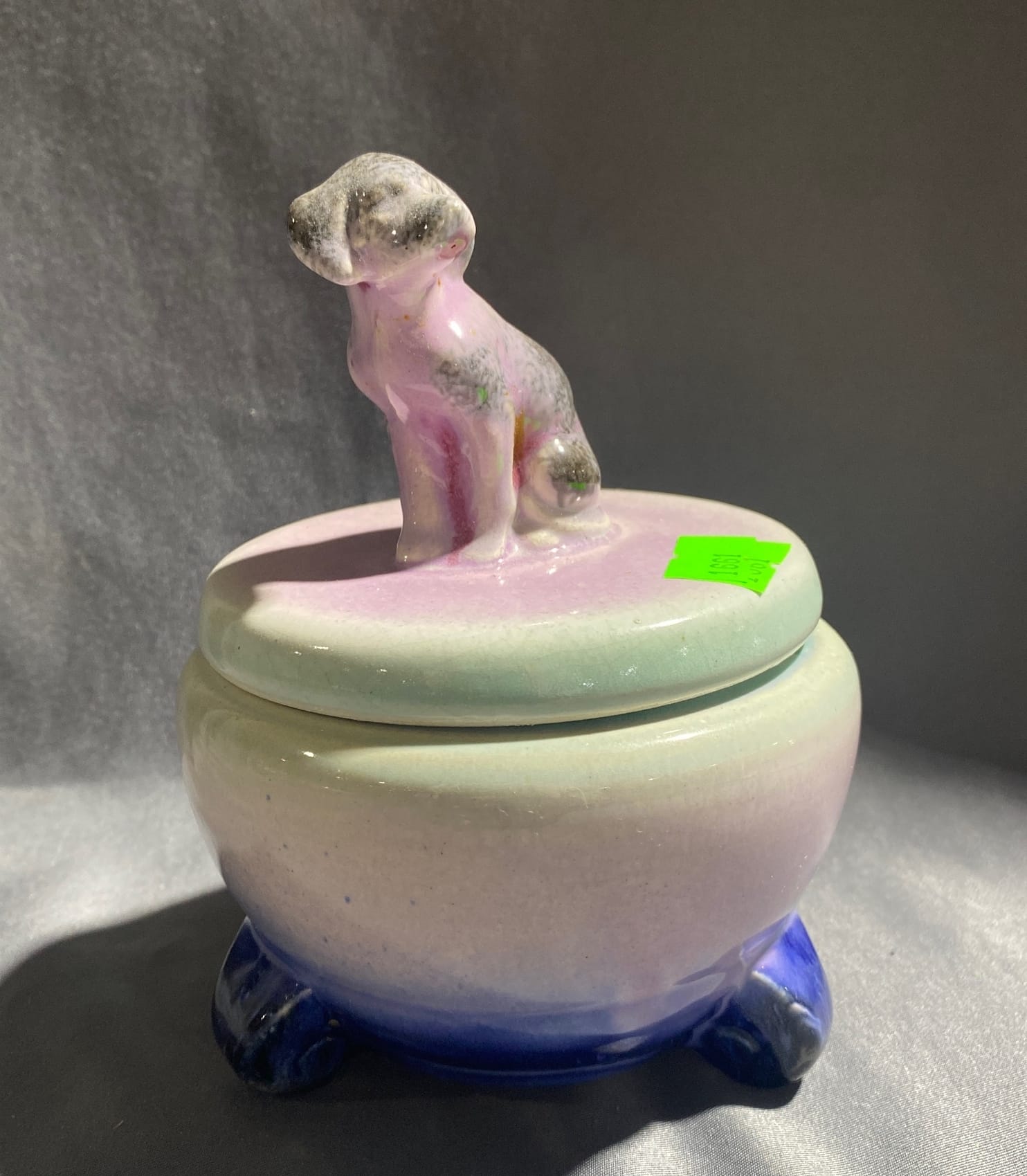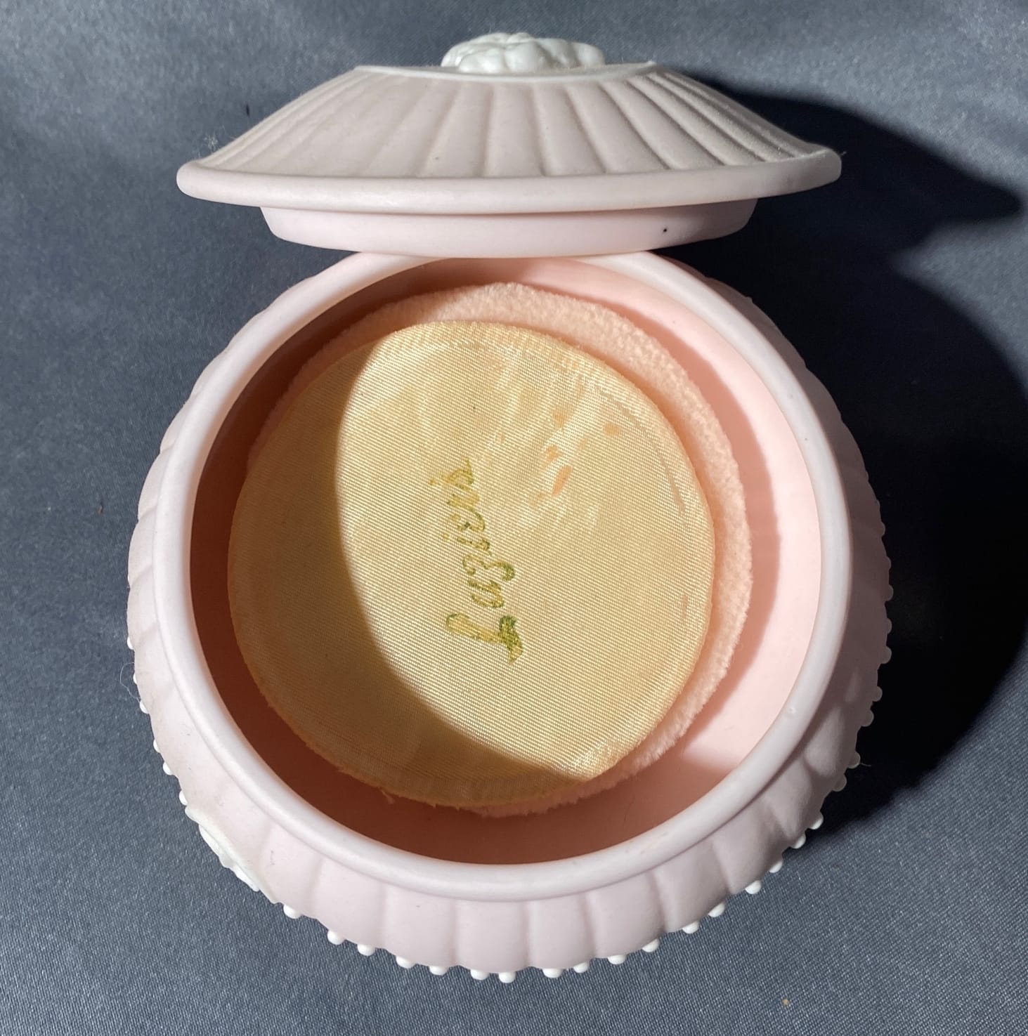 2010 Vintage metal music box ,5.5”, Avon porcelain covered music box , vintage powder jar , clear and ruby glass covered dish , frosted glass rabbit candle holder ,miscellaneous