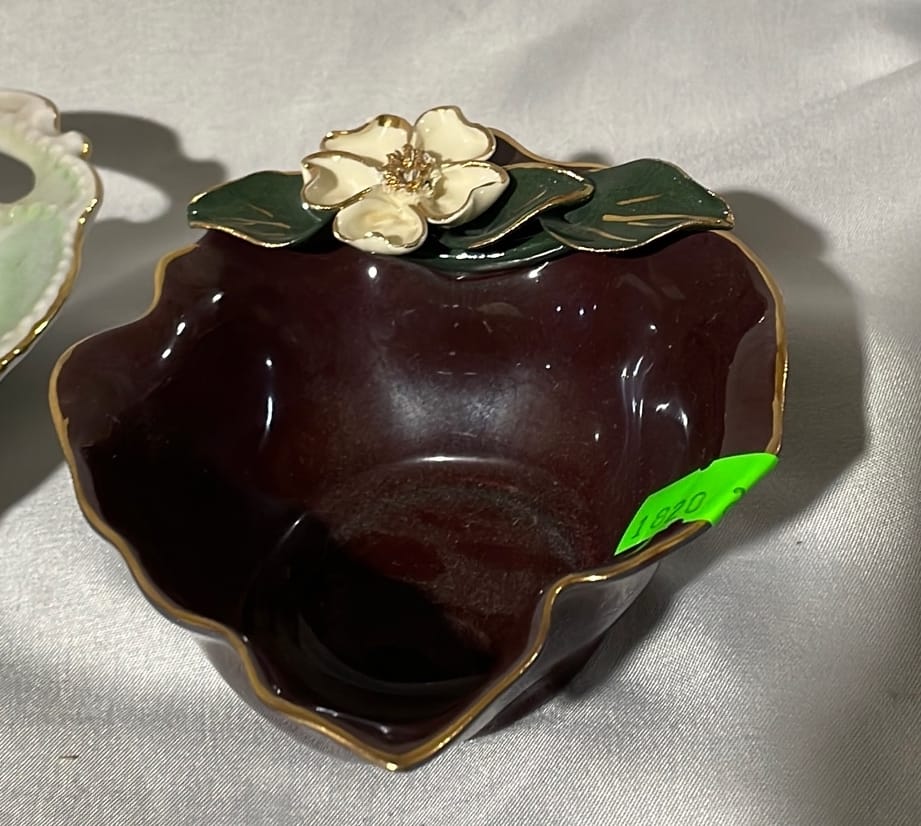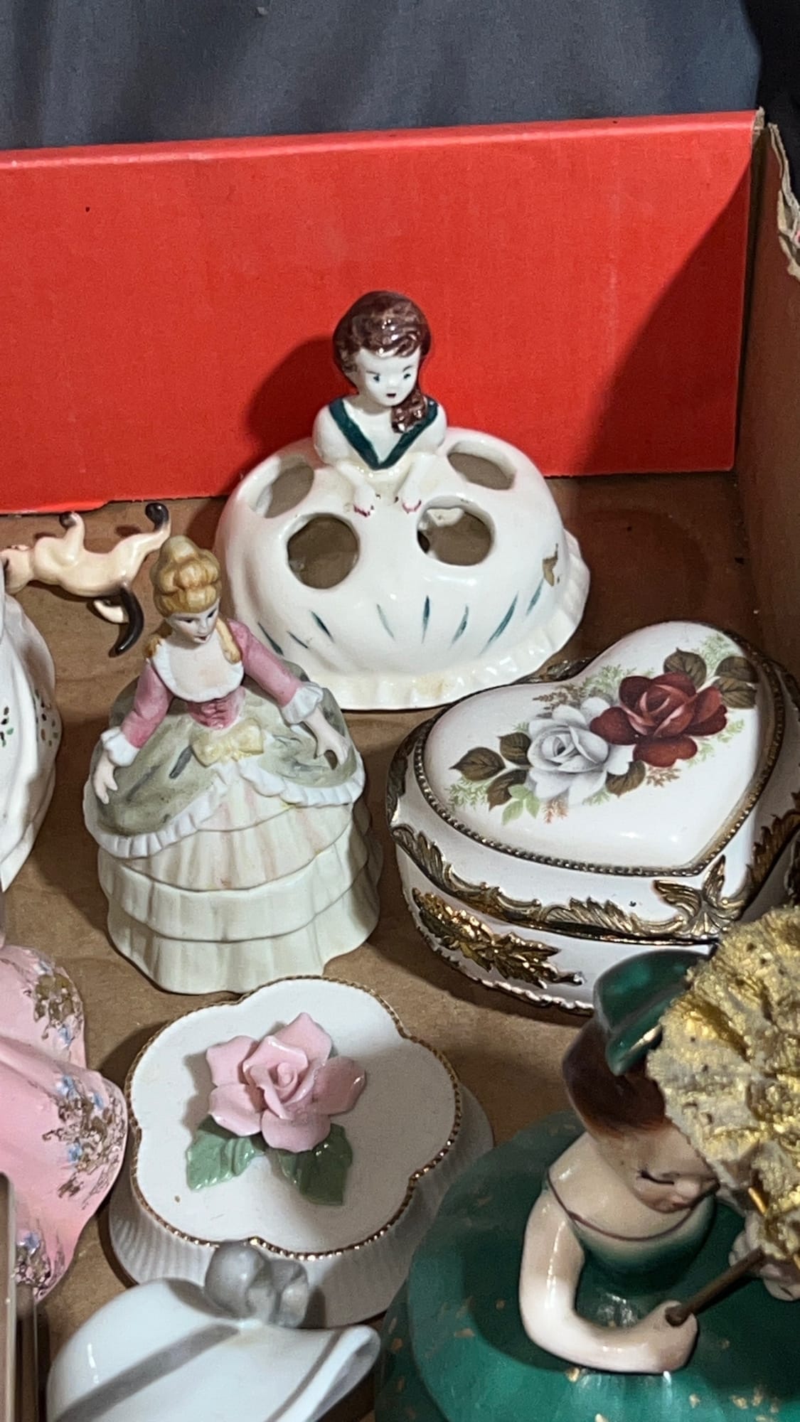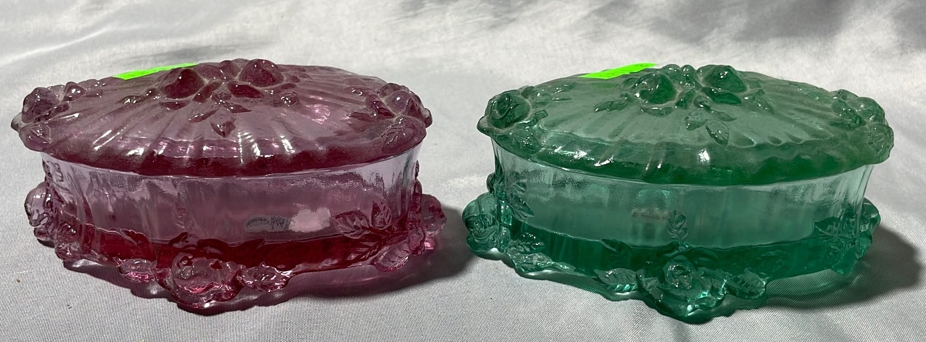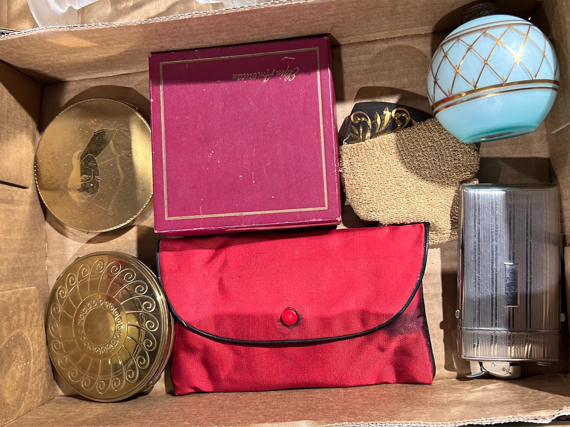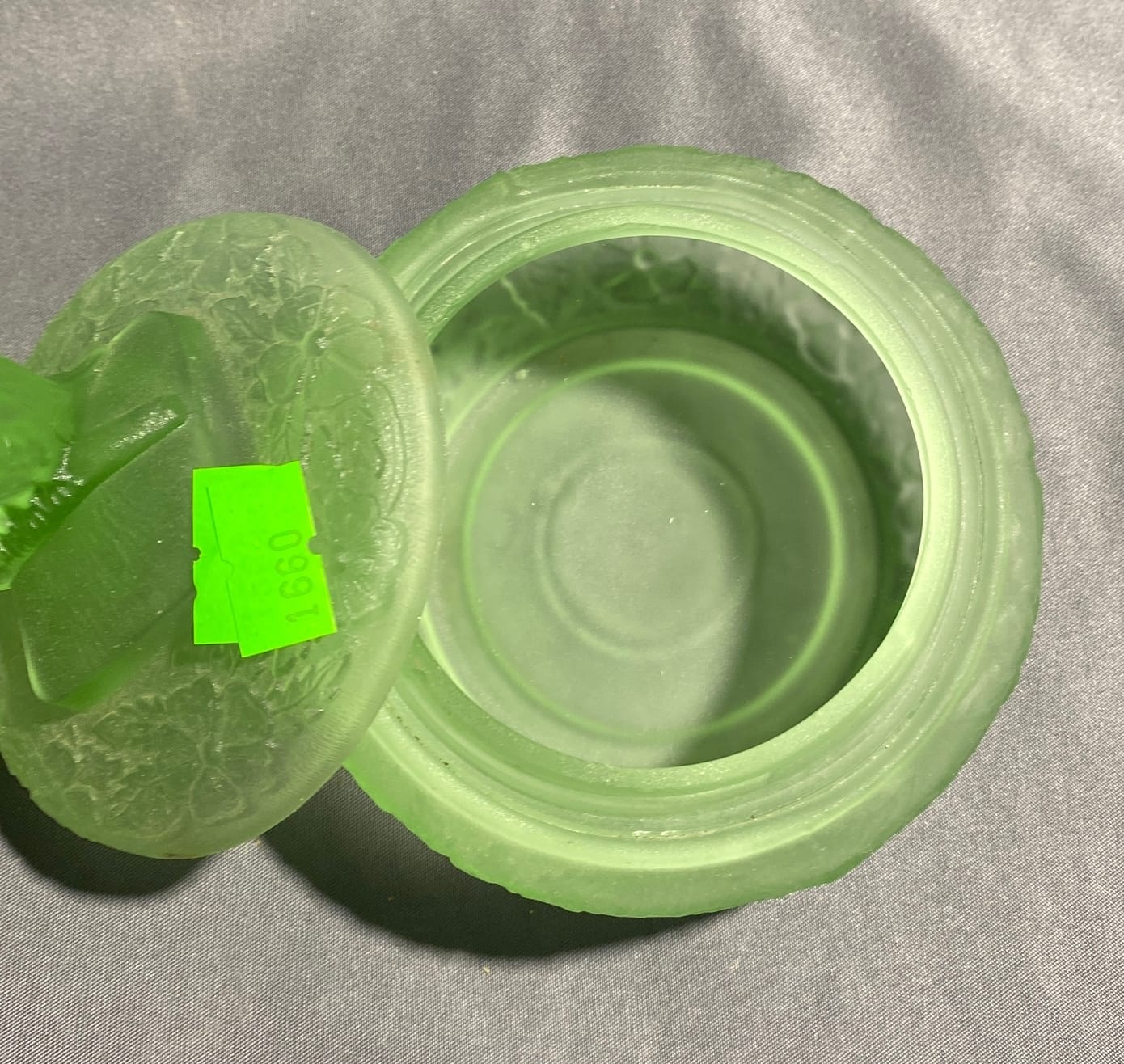 2010 Vintage metal music box ,5.5”, Avon porcelain covered music box , vintage powder jar , clear and ruby glass covered dish , frosted glass rabbit candle holder ,miscellaneous