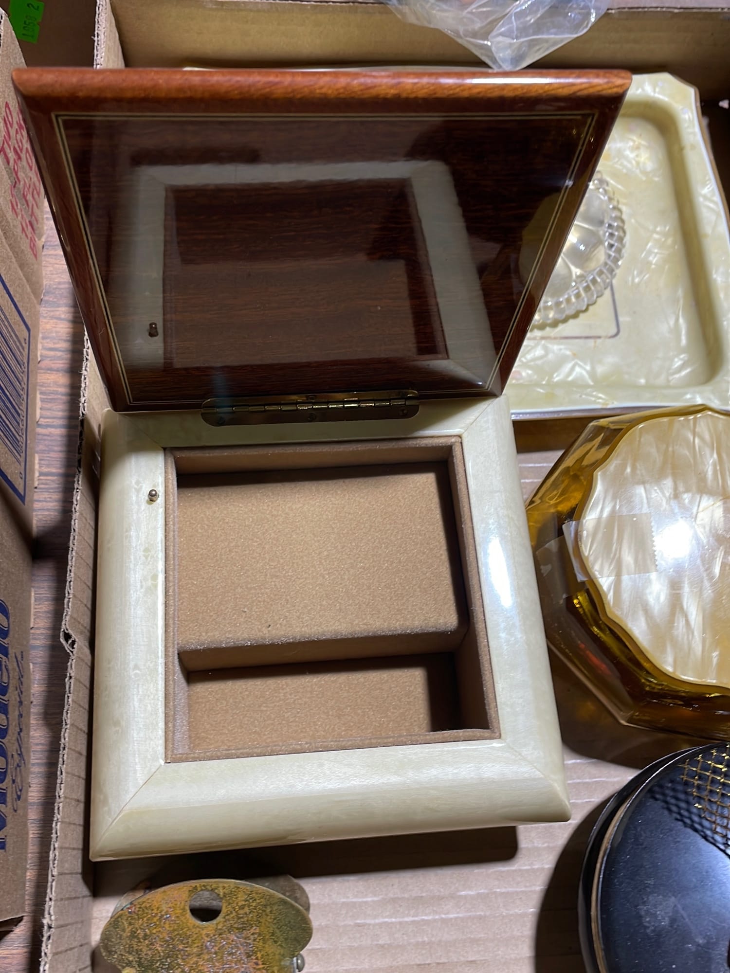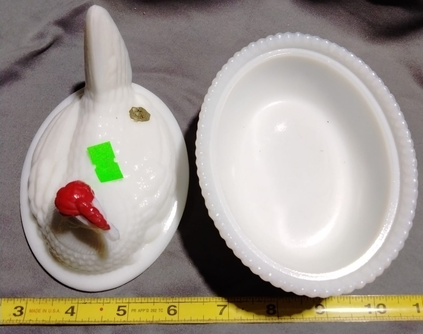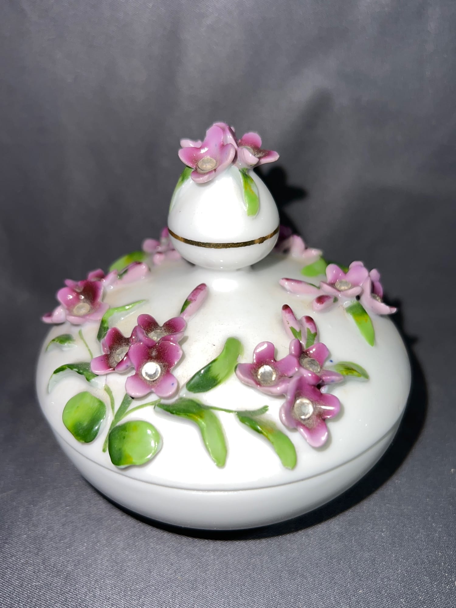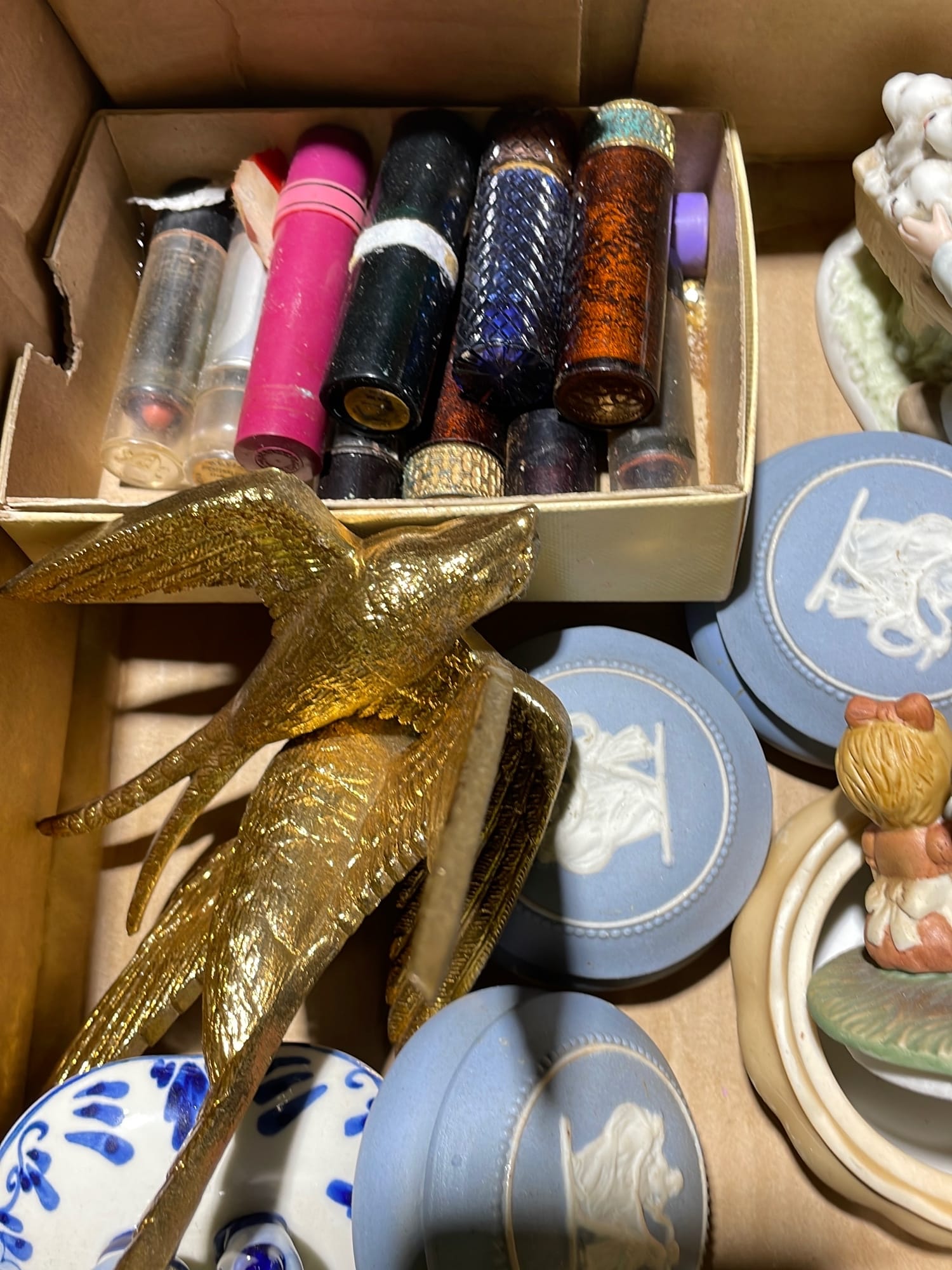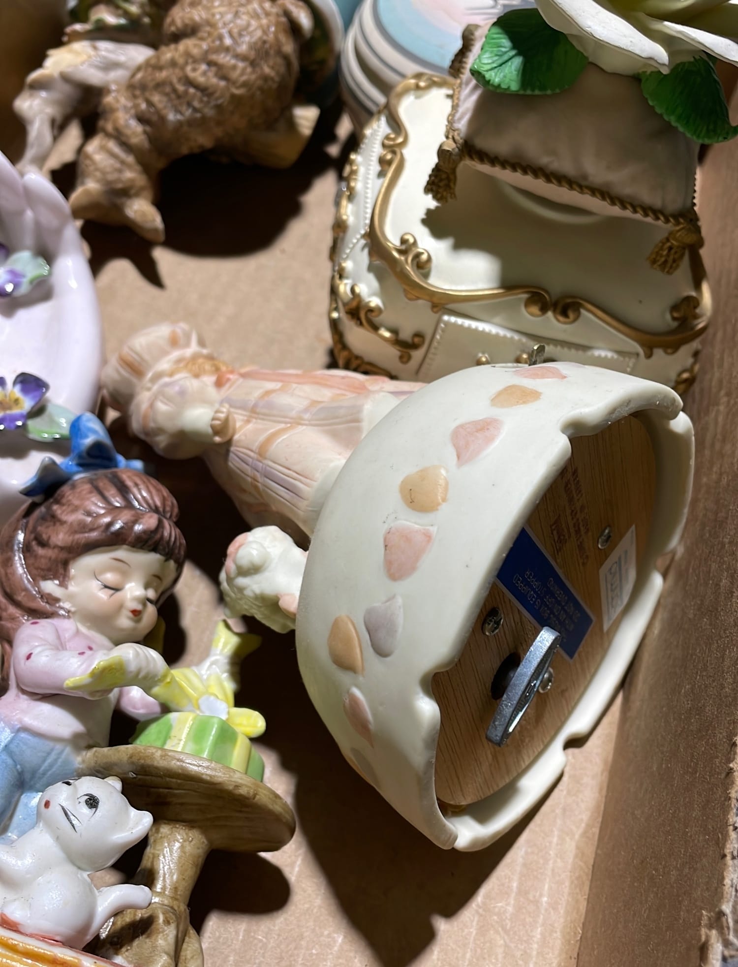 2010 Vintage metal music box ,5.5”, Avon porcelain covered music box , vintage powder jar , clear and ruby glass covered dish , frosted glass rabbit candle holder ,miscellaneous