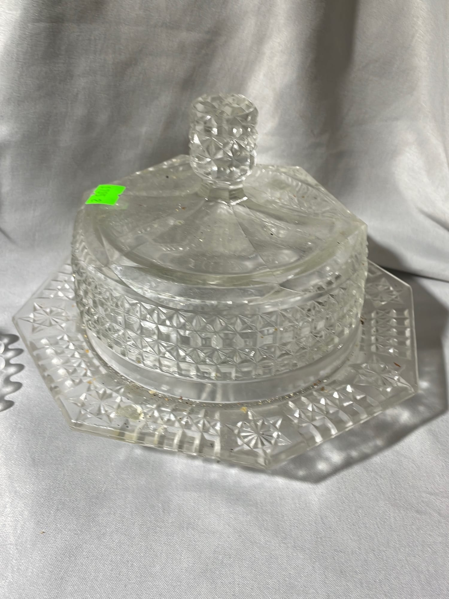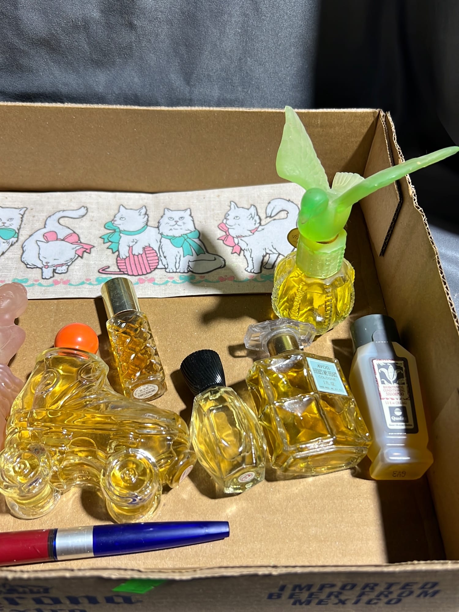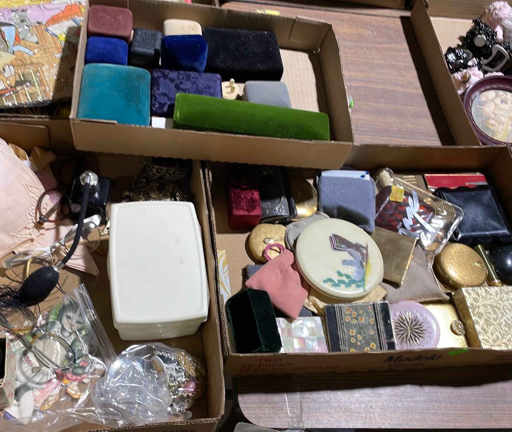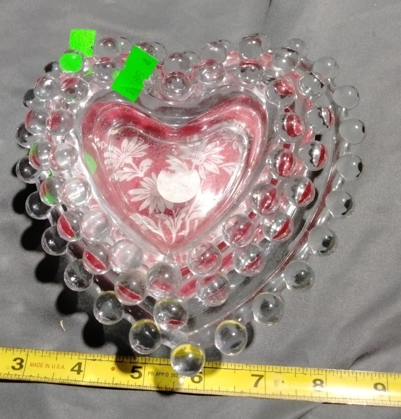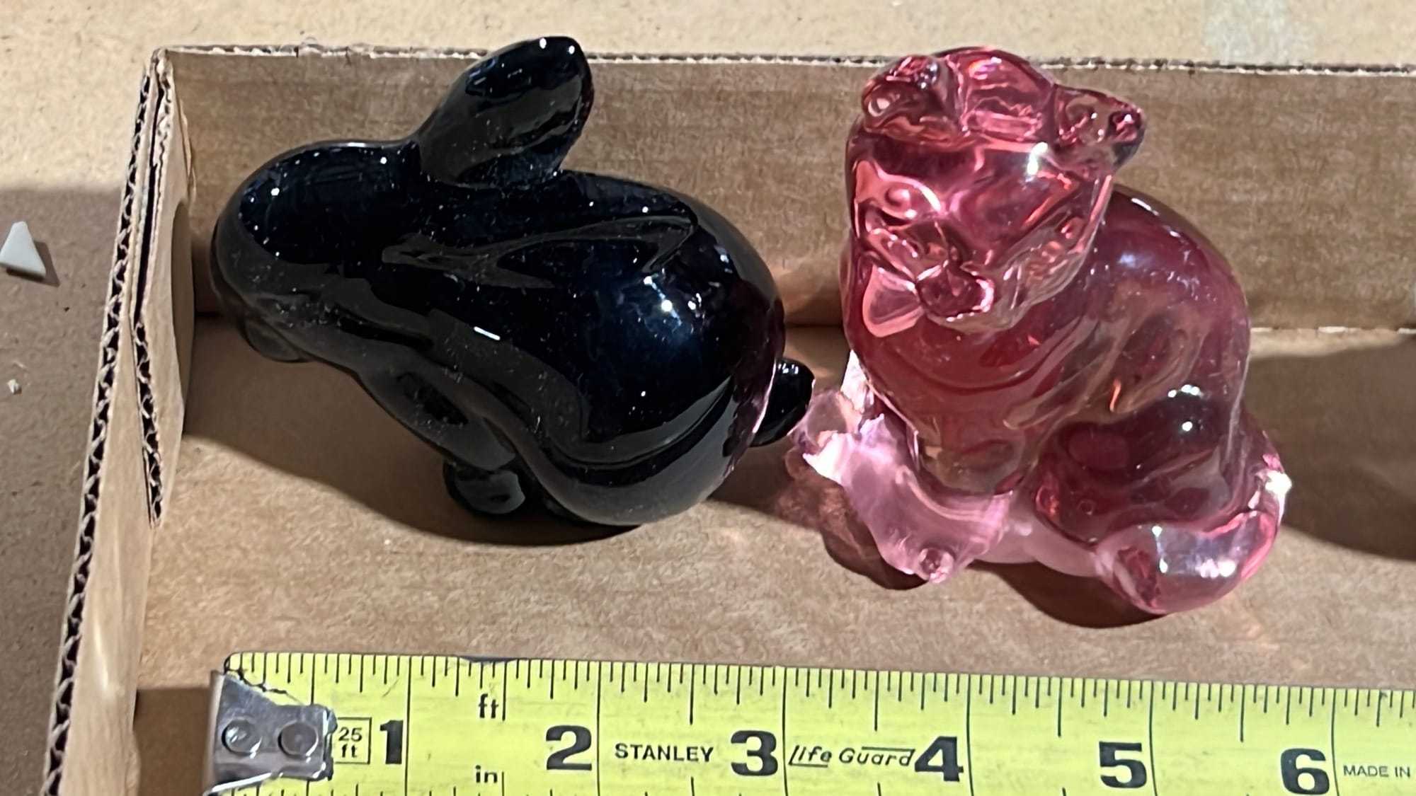 2010 Vintage metal music box ,5.5”, Avon porcelain covered music box , vintage powder jar , clear and ruby glass covered dish , frosted glass rabbit candle holder ,miscellaneous