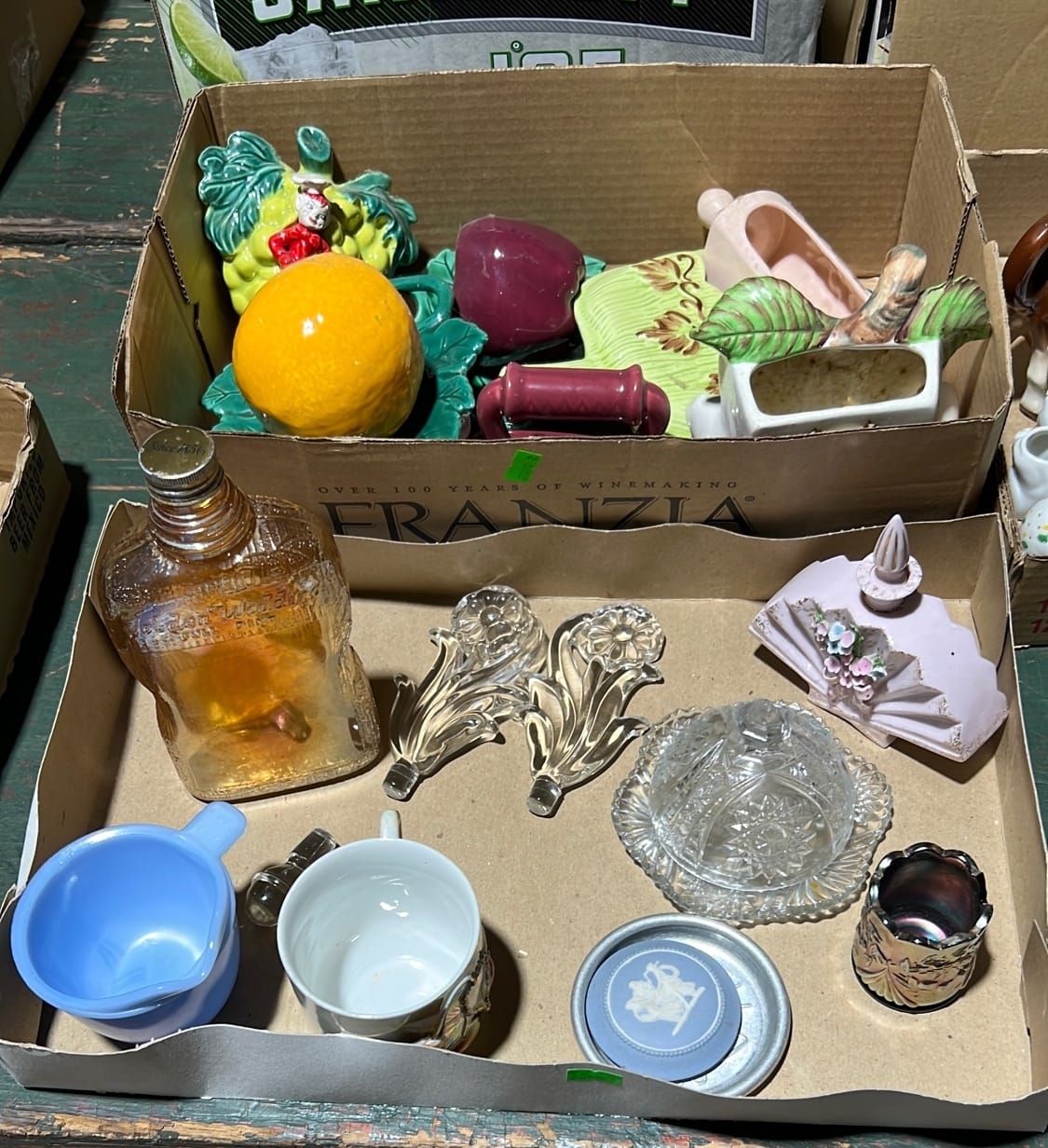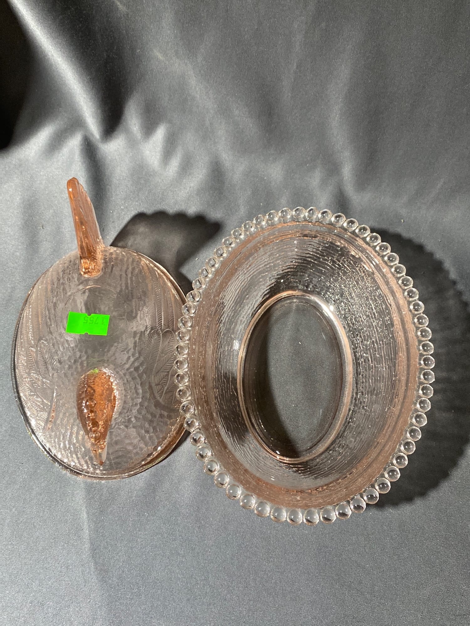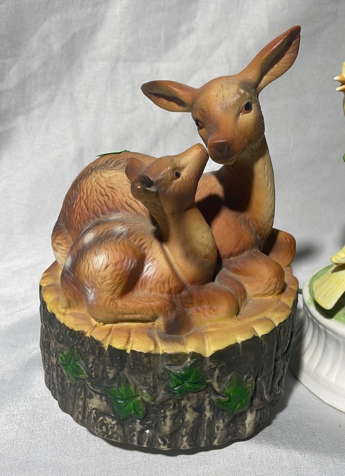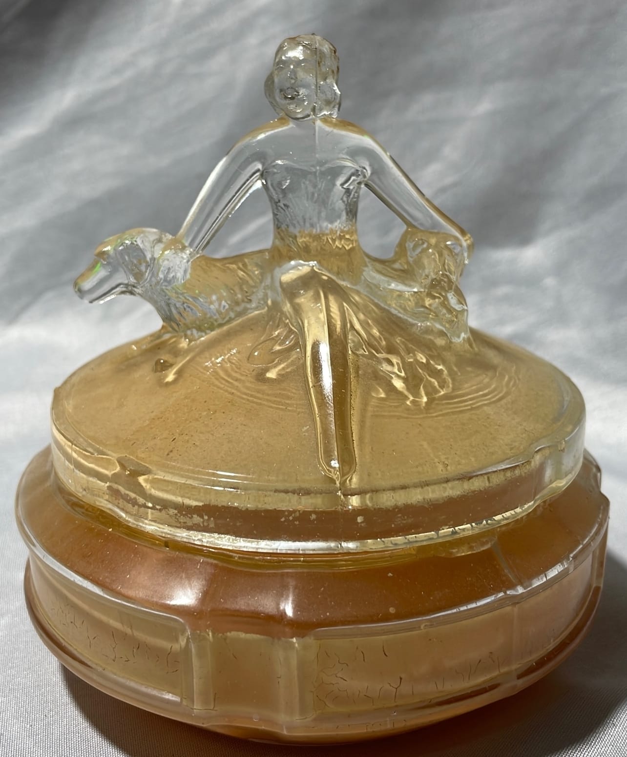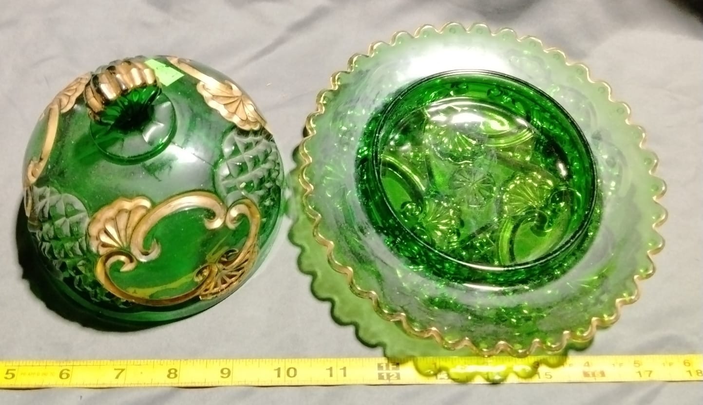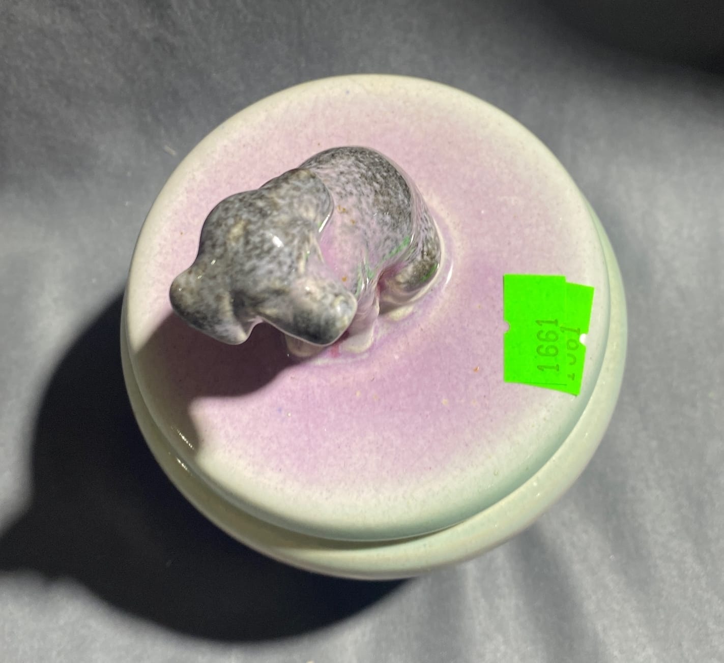 2010 Vintage metal music box ,5.5”, Avon porcelain covered music box , vintage powder jar , clear and ruby glass covered dish , frosted glass rabbit candle holder ,miscellaneous