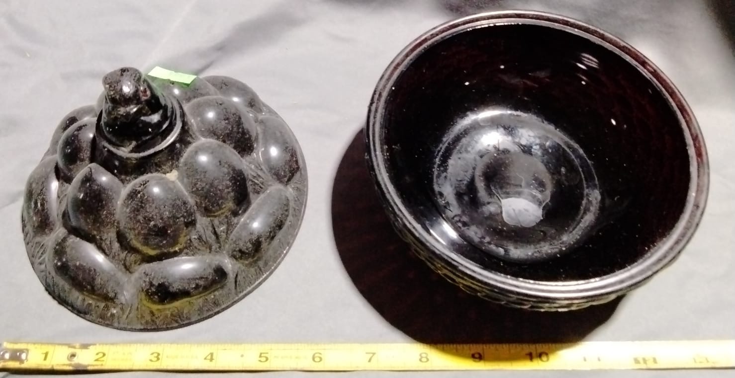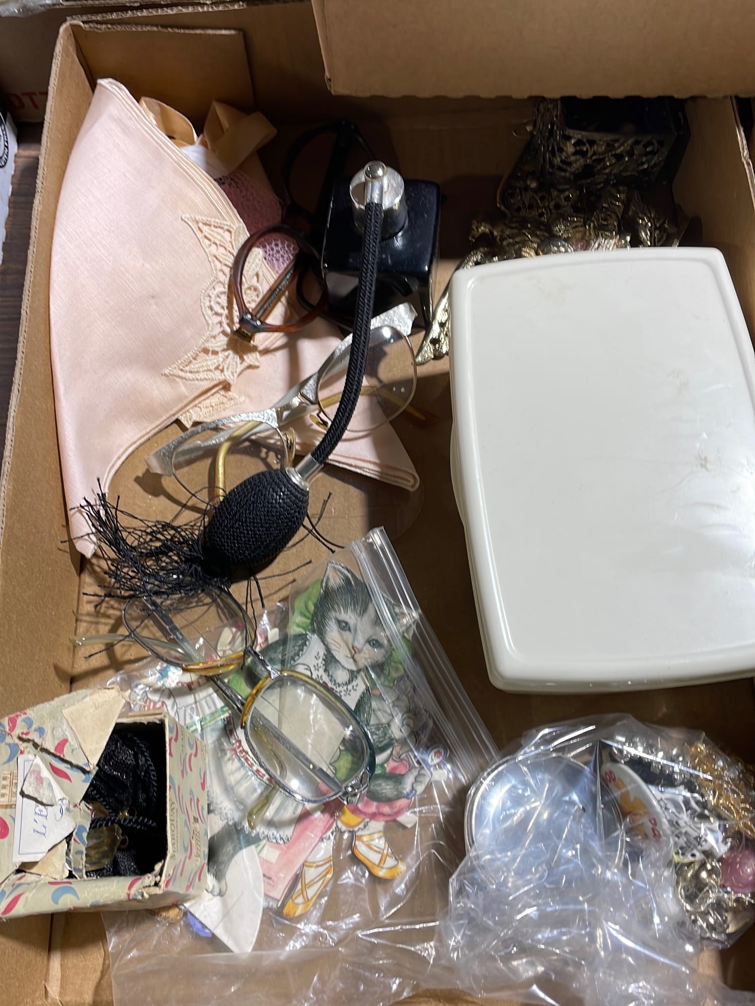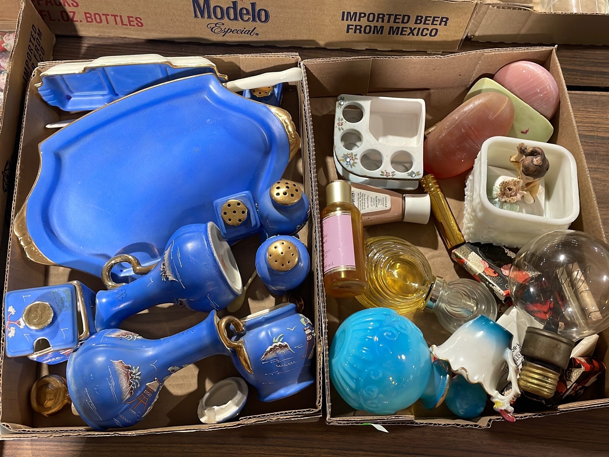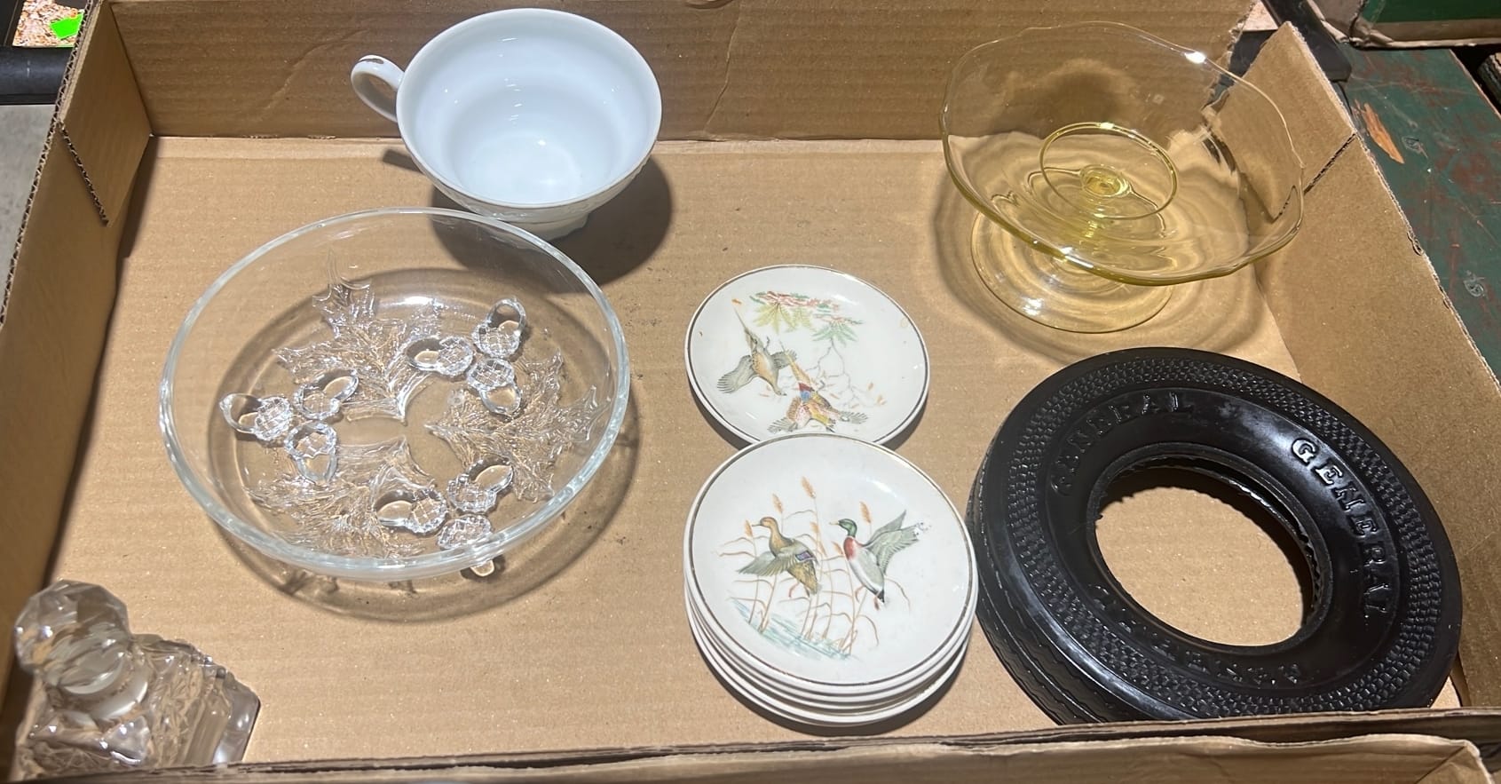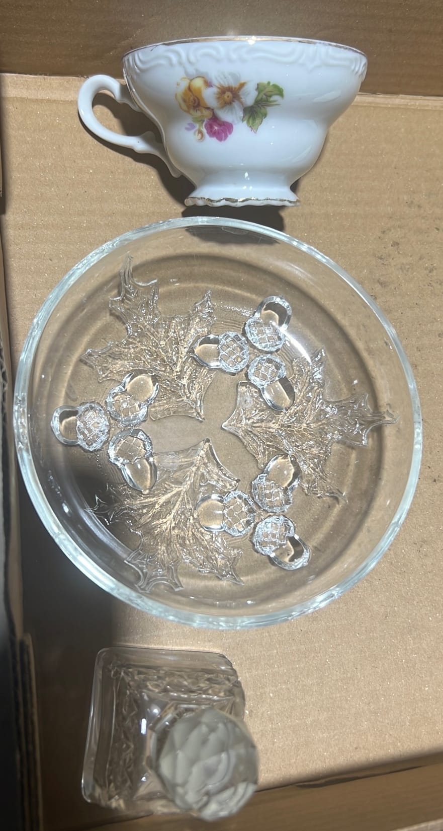 2010 Vintage metal music box ,5.5”, Avon porcelain covered music box , vintage powder jar , clear and ruby glass covered dish , frosted glass rabbit candle holder ,miscellaneous