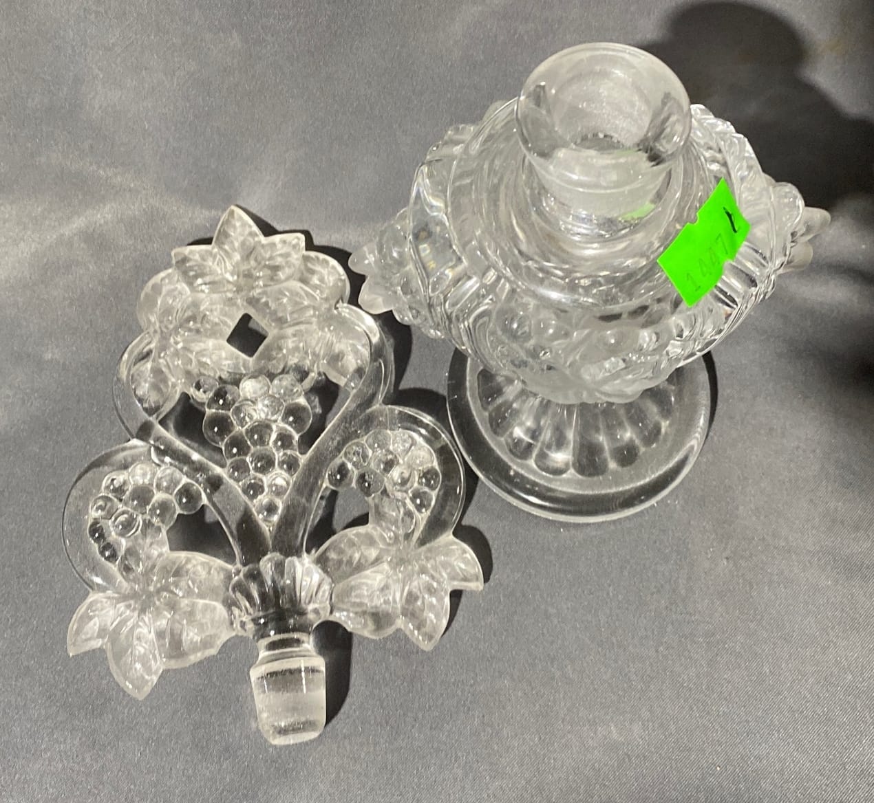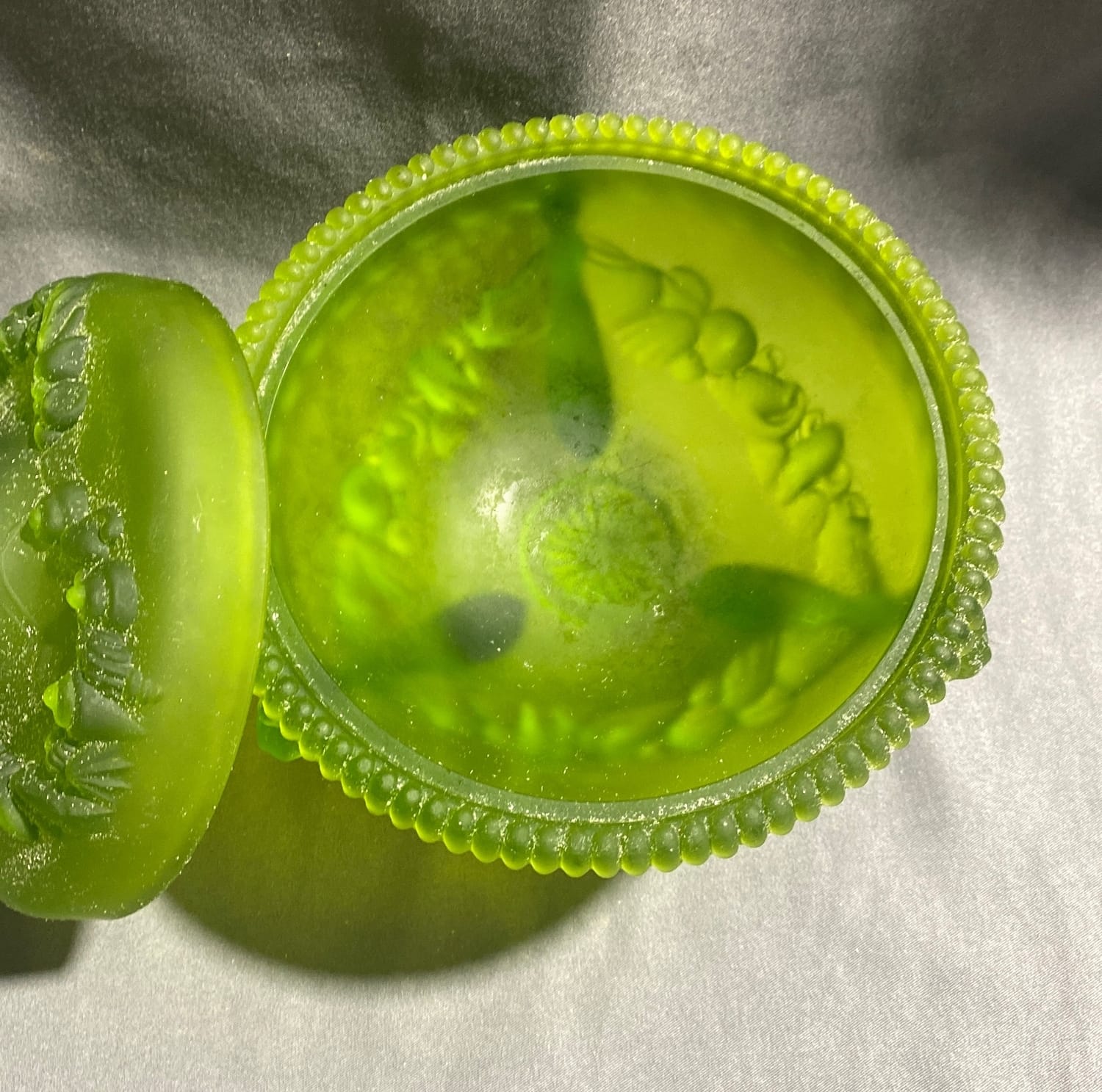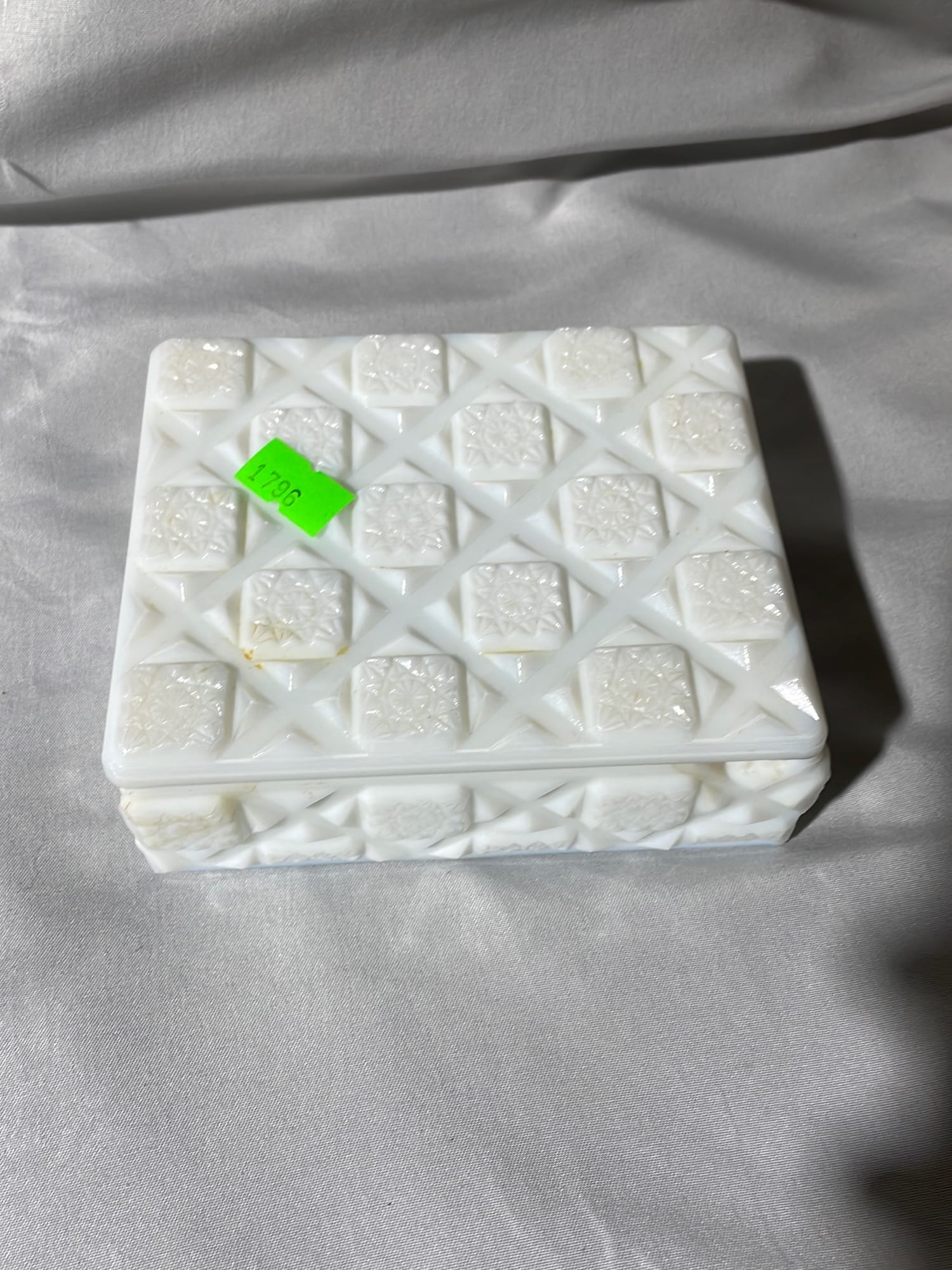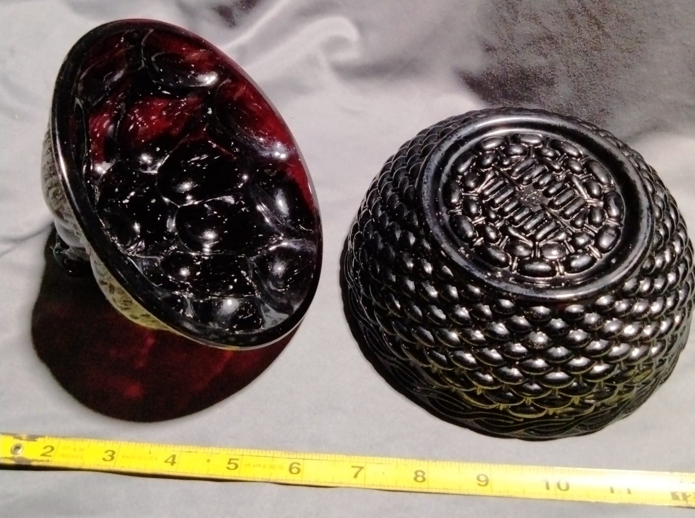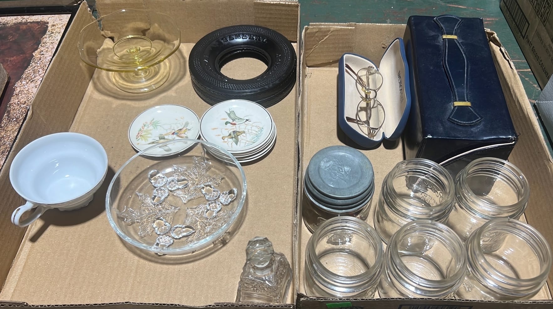 2010 Vintage metal music box ,5.5”, Avon porcelain covered music box , vintage powder jar , clear and ruby glass covered dish , frosted glass rabbit candle holder ,miscellaneous