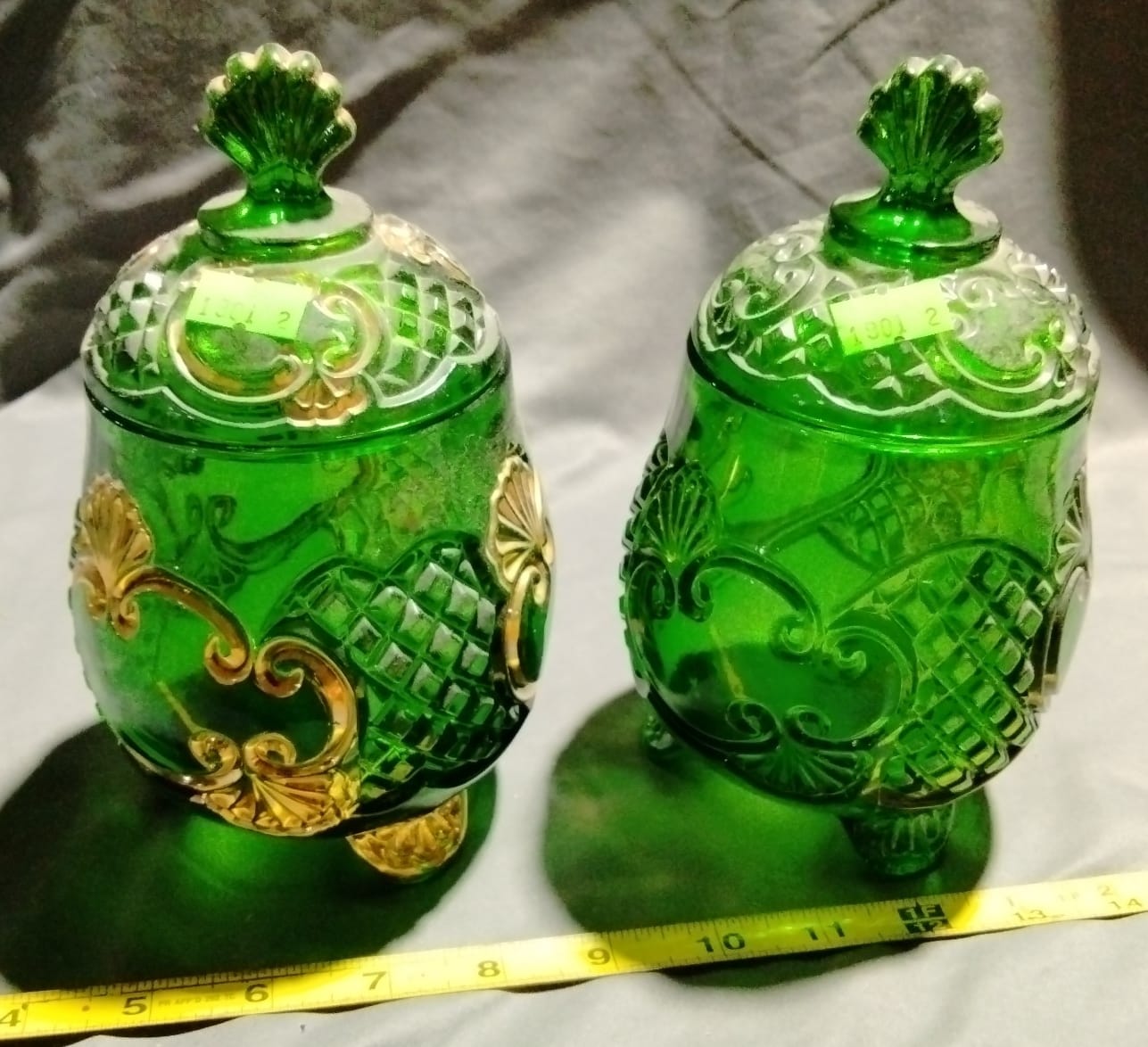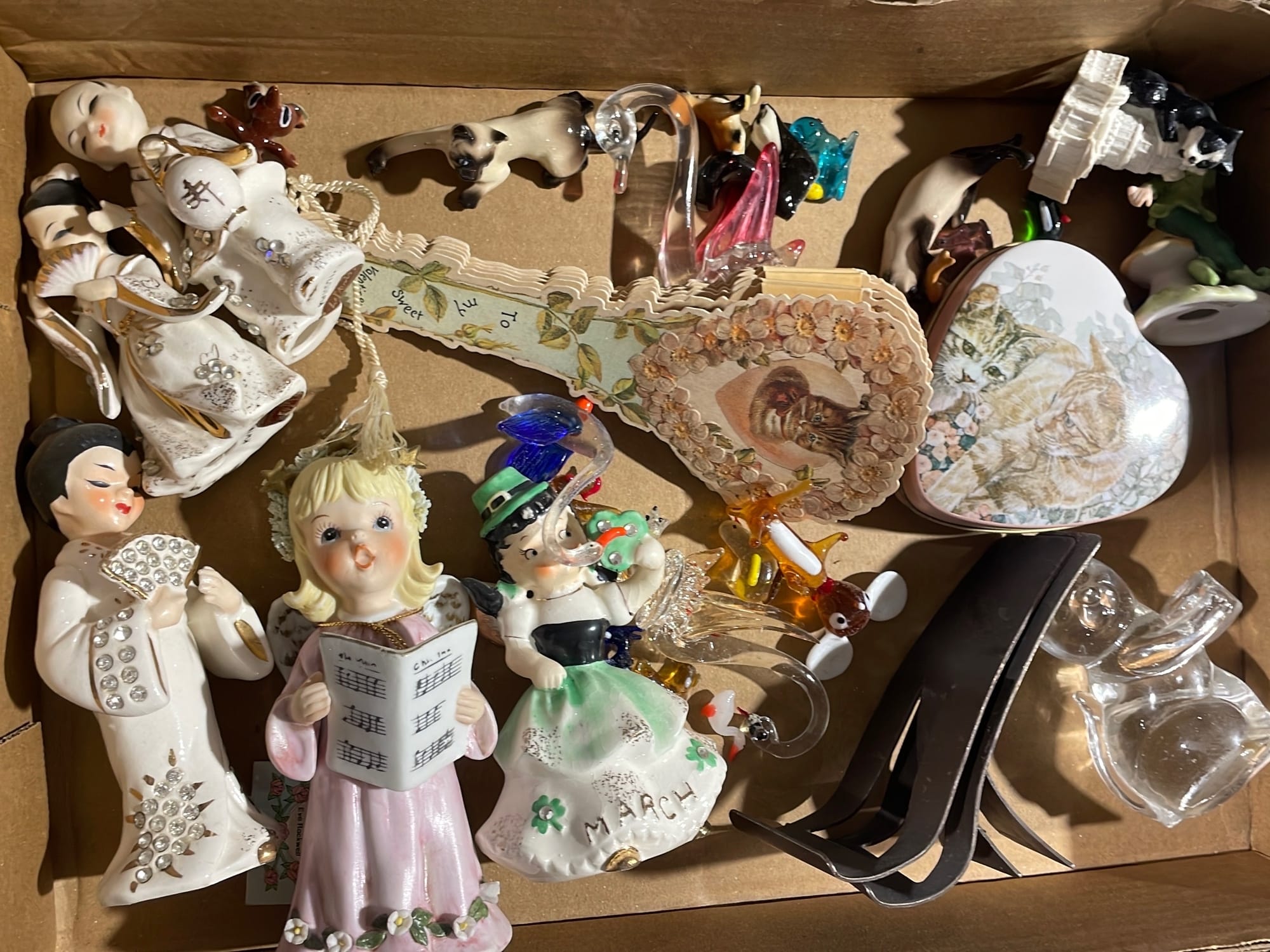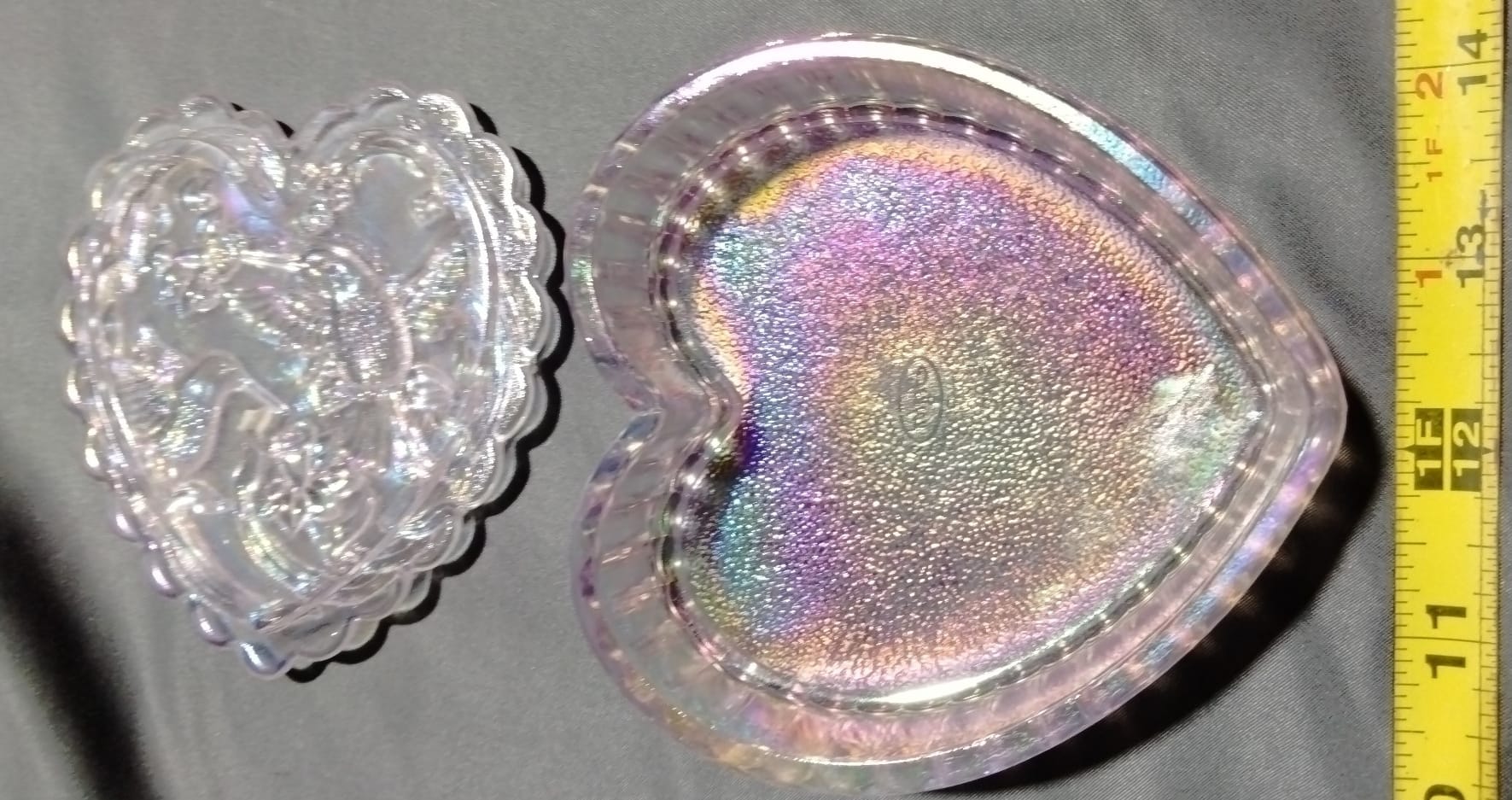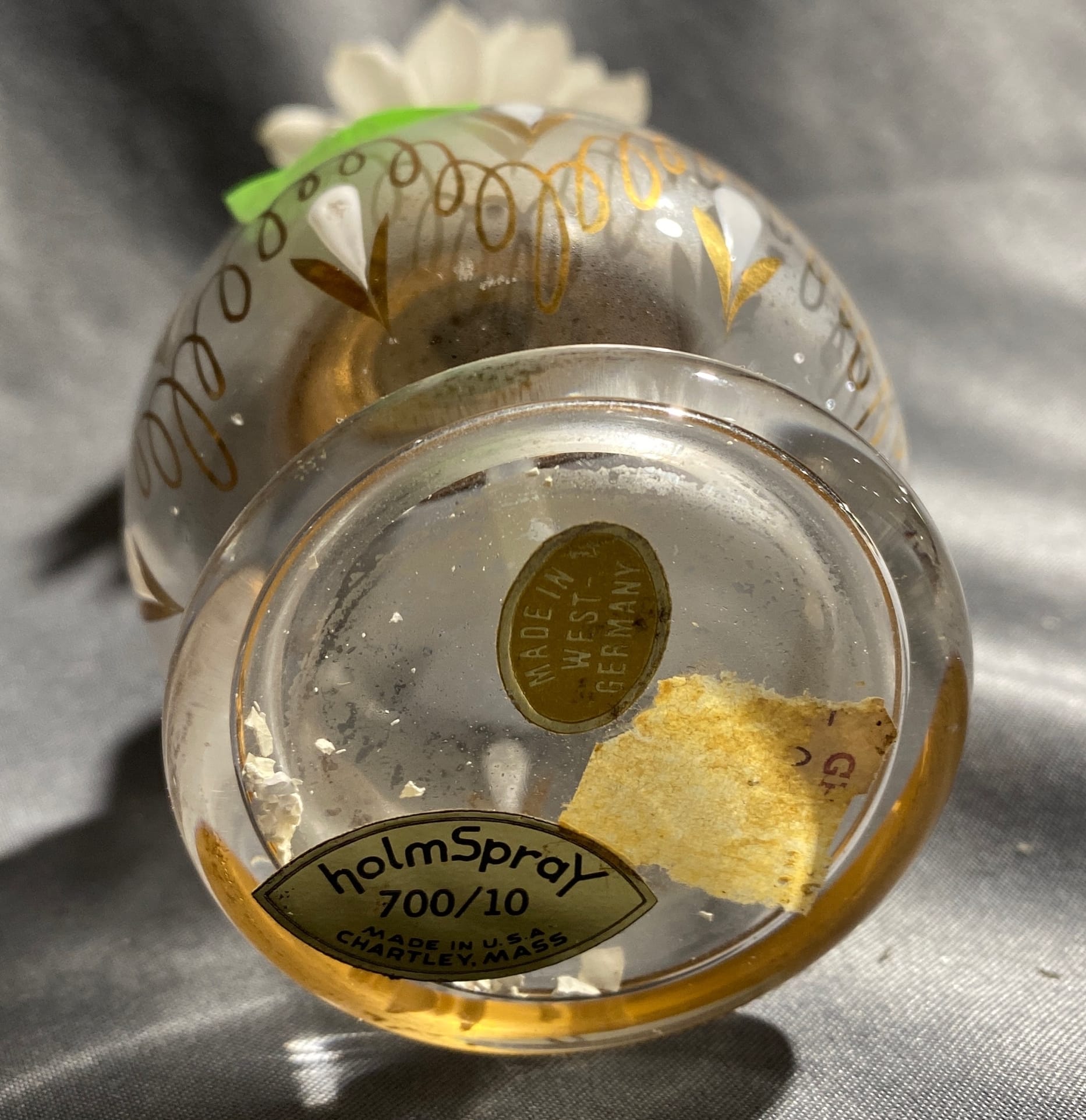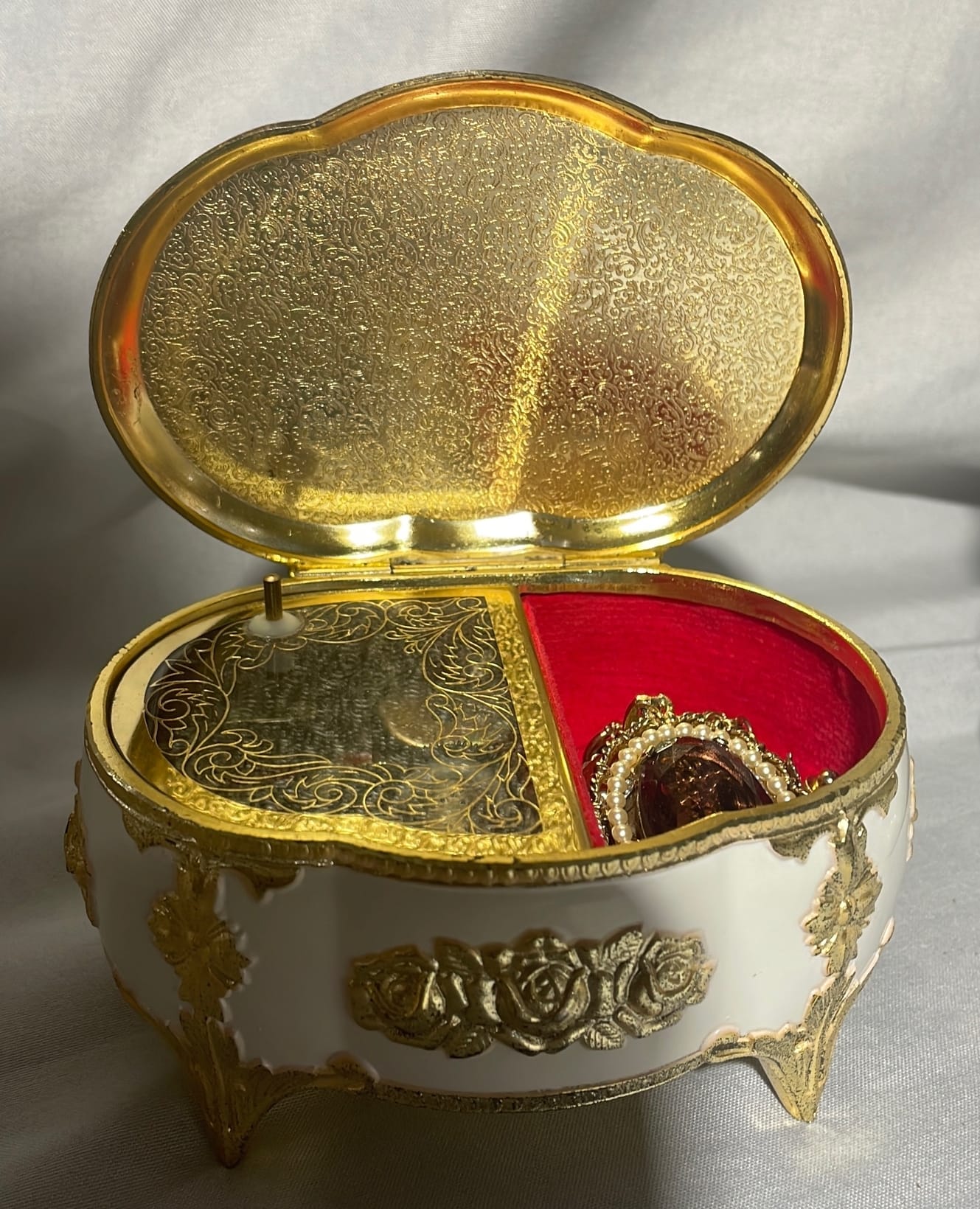 2010 Vintage metal music box ,5.5”, Avon porcelain covered music box , vintage powder jar , clear and ruby glass covered dish , frosted glass rabbit candle holder ,miscellaneous