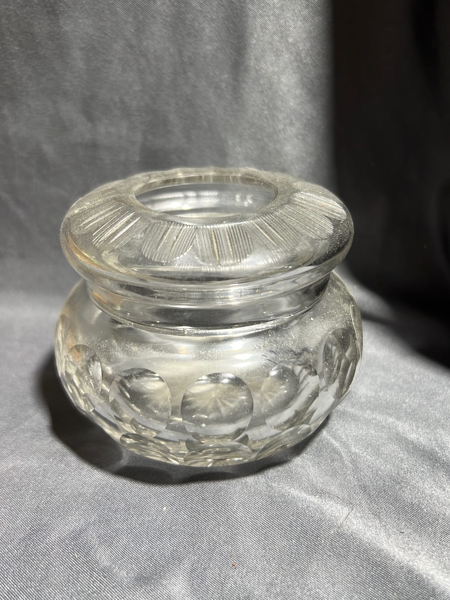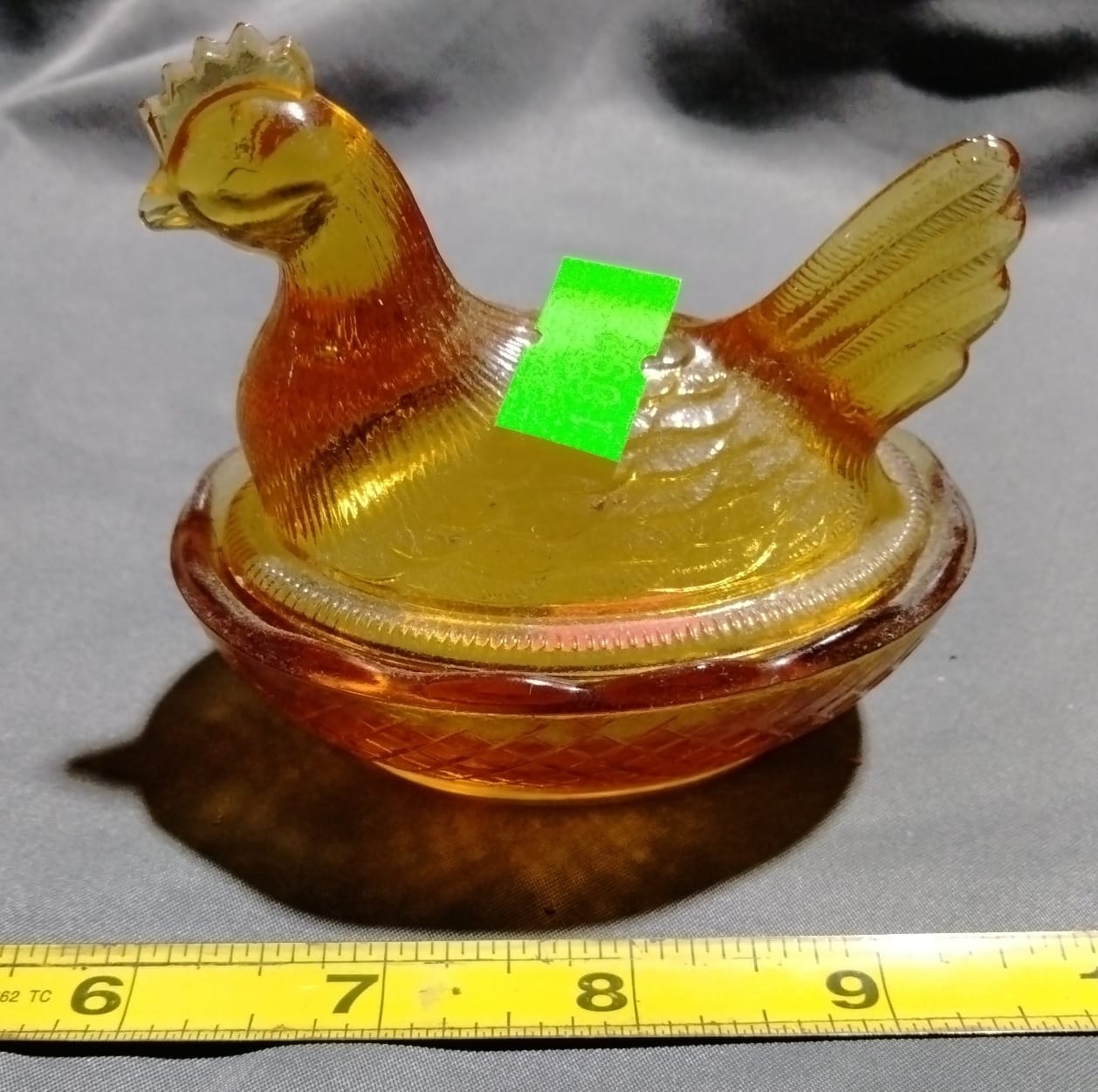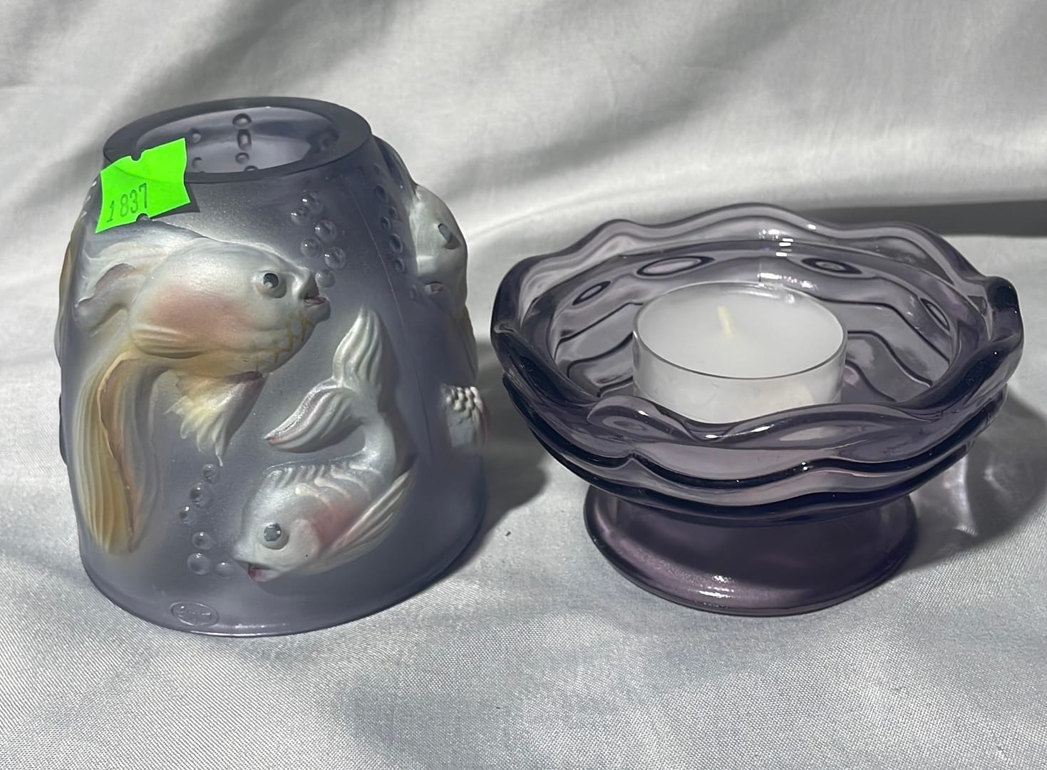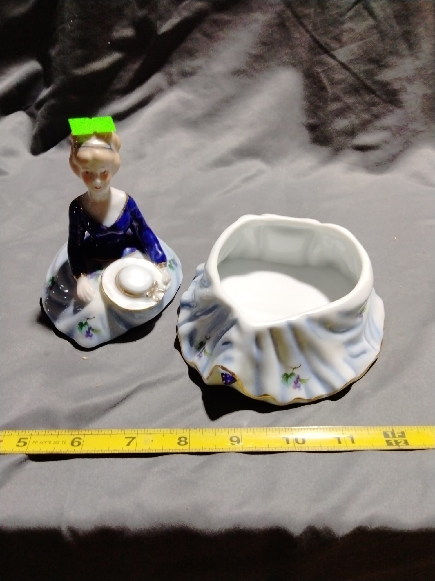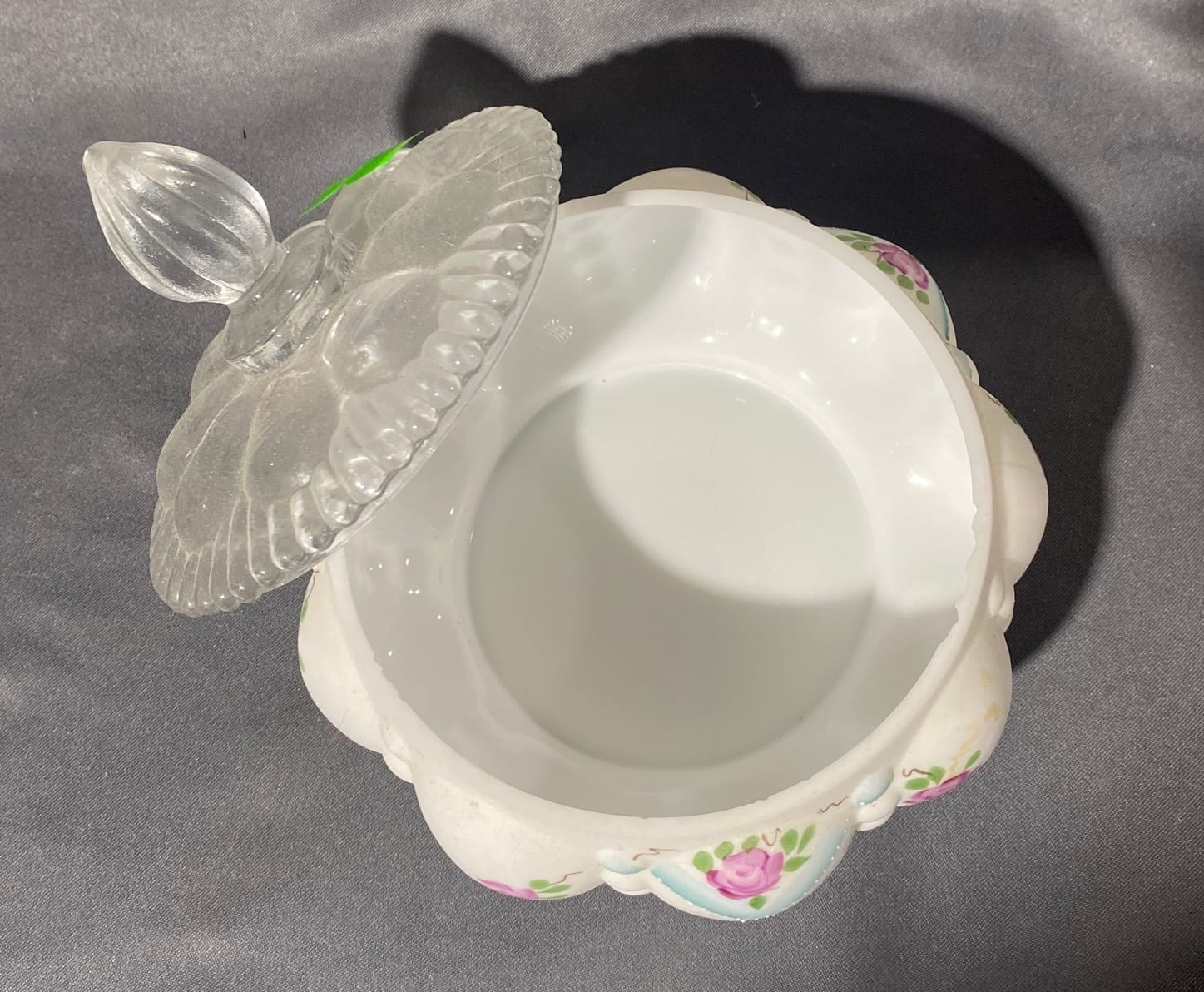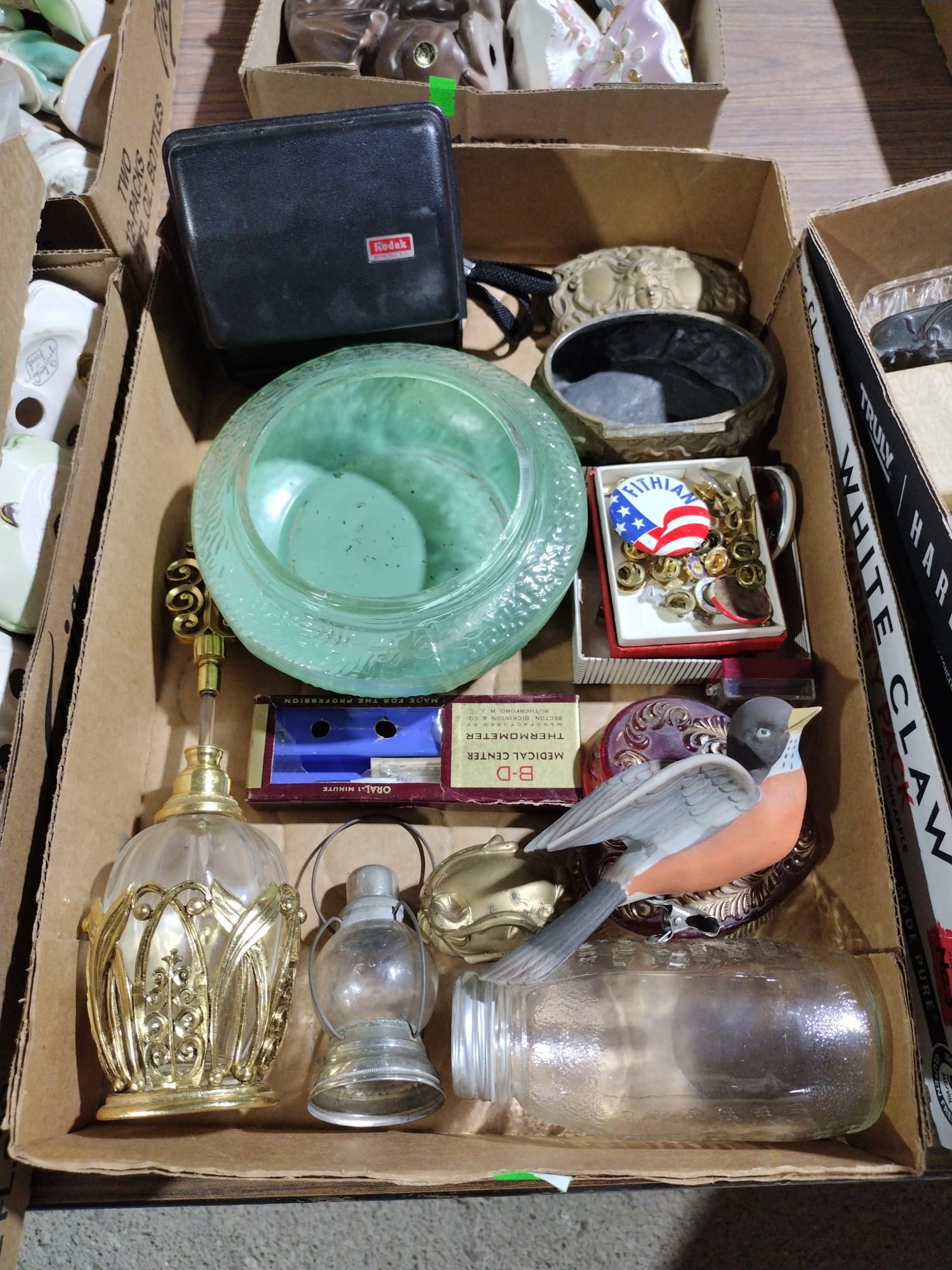 2010 Vintage metal music box ,5.5”, Avon porcelain covered music box , vintage powder jar , clear and ruby glass covered dish , frosted glass rabbit candle holder ,miscellaneous