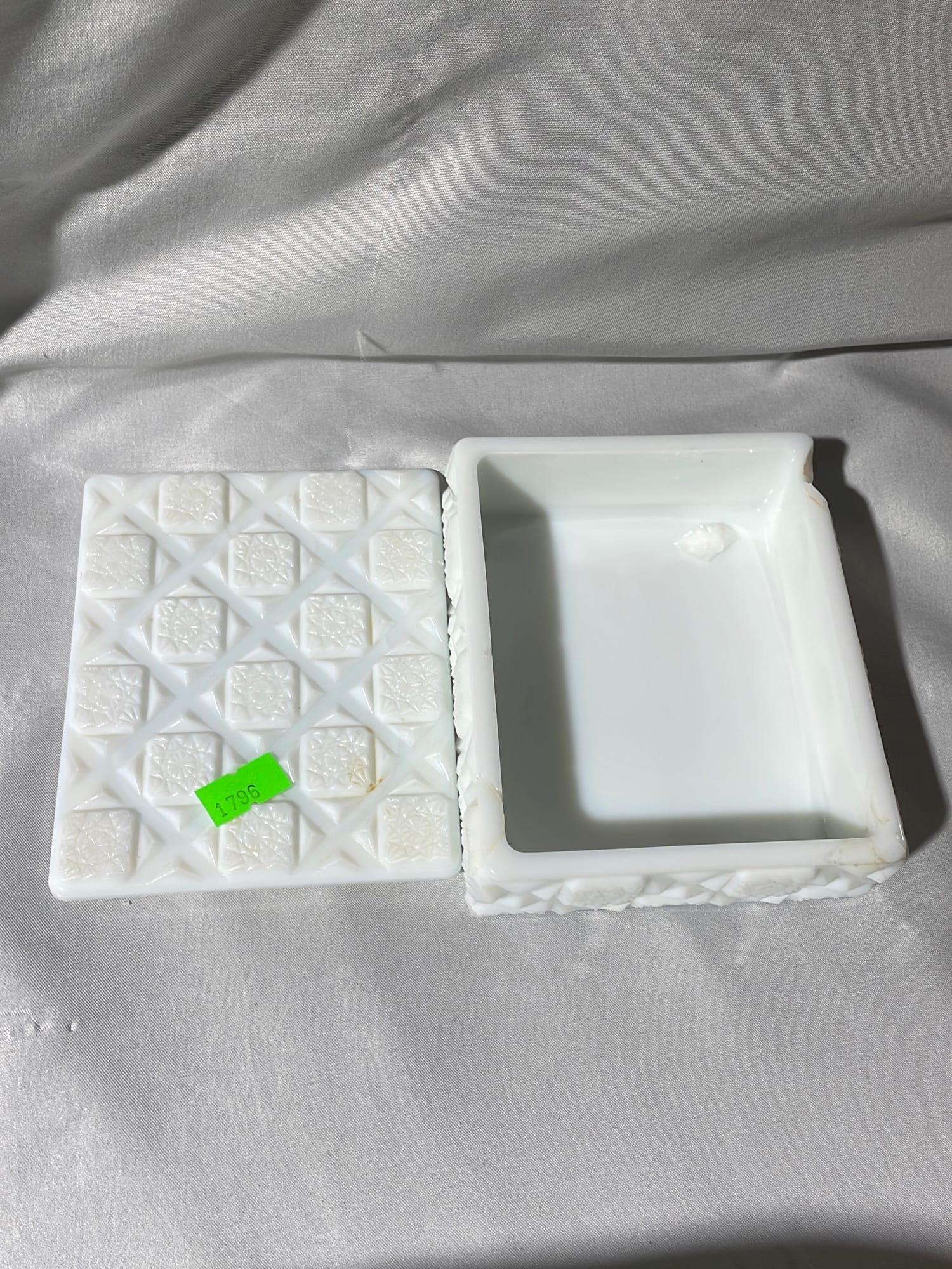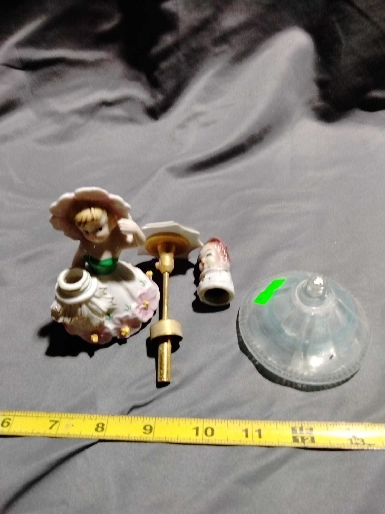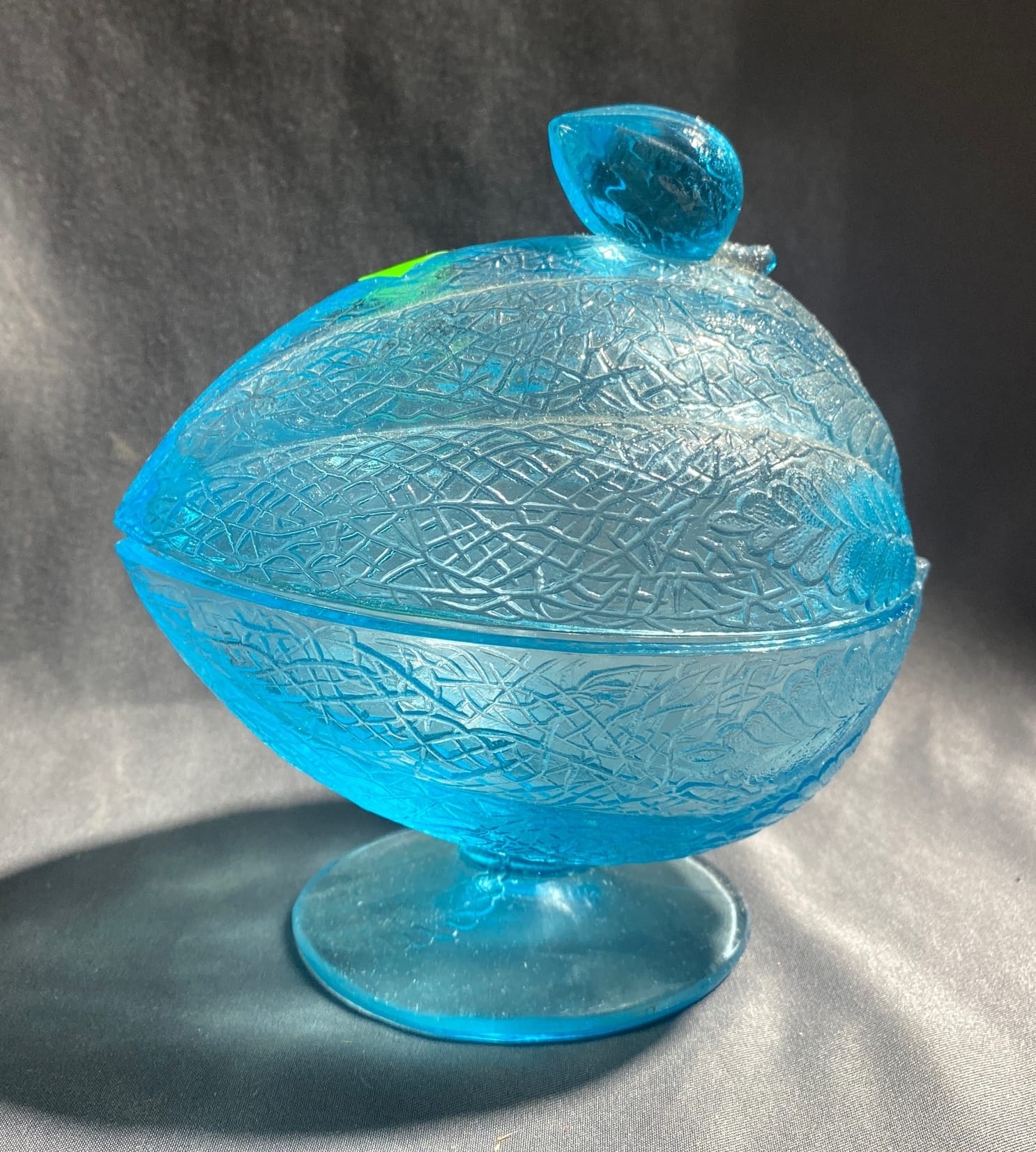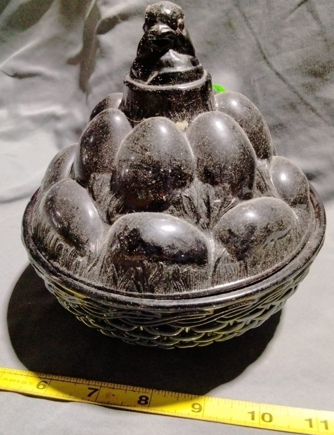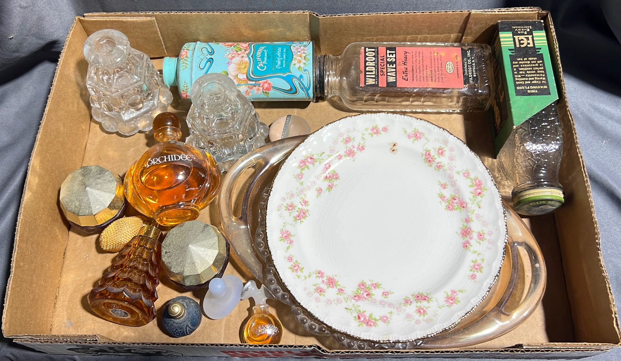 2010 Vintage metal music box ,5.5”, Avon porcelain covered music box , vintage powder jar , clear and ruby glass covered dish , frosted glass rabbit candle holder ,miscellaneous