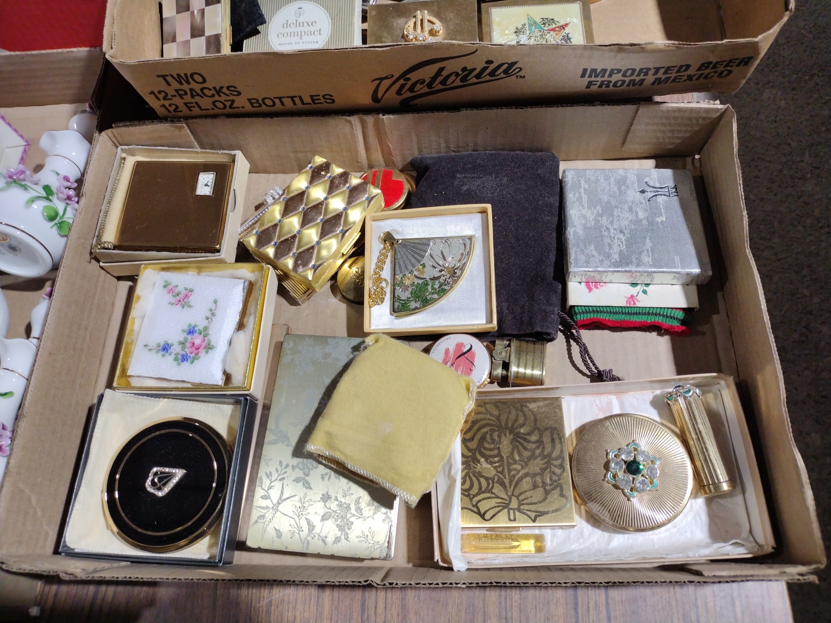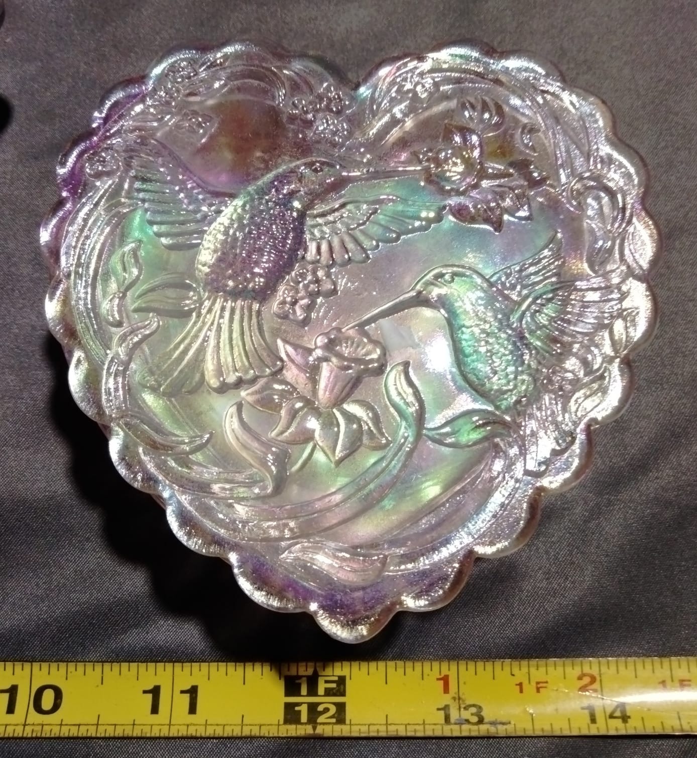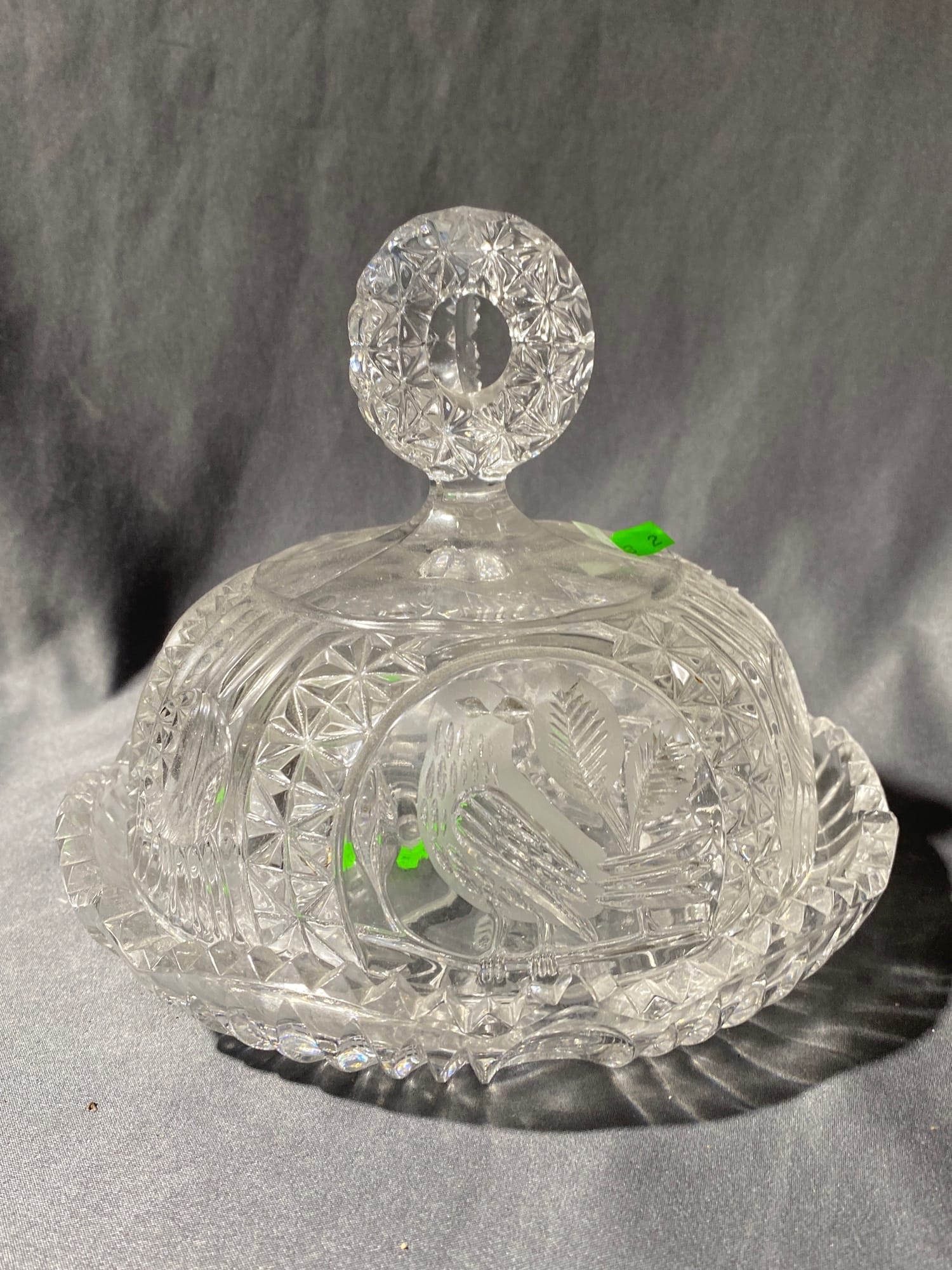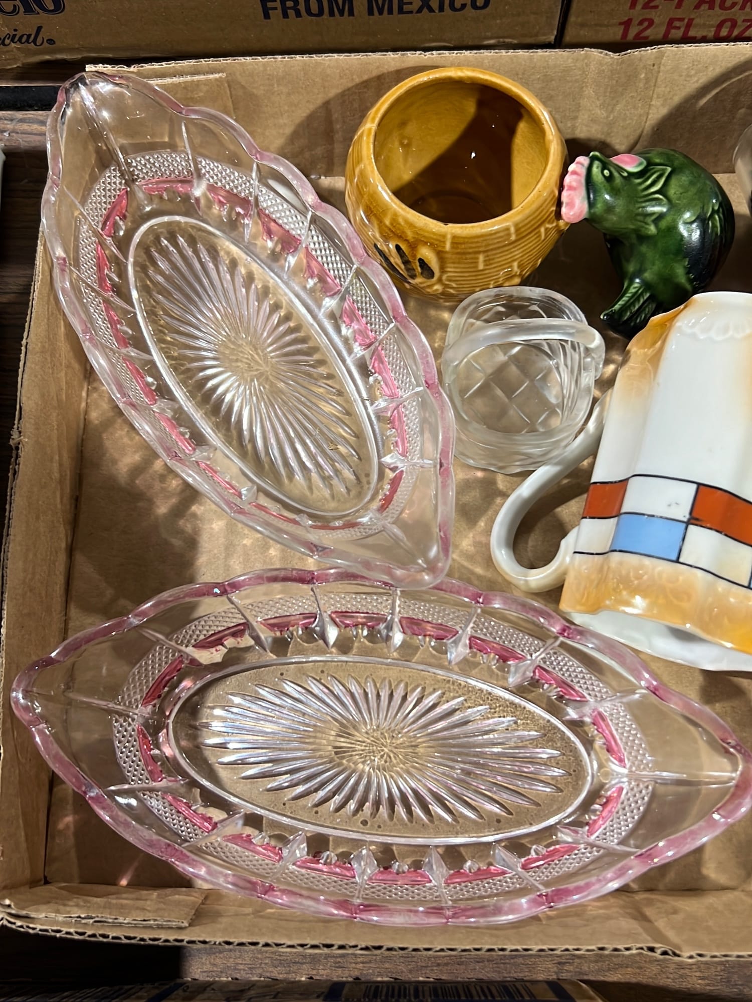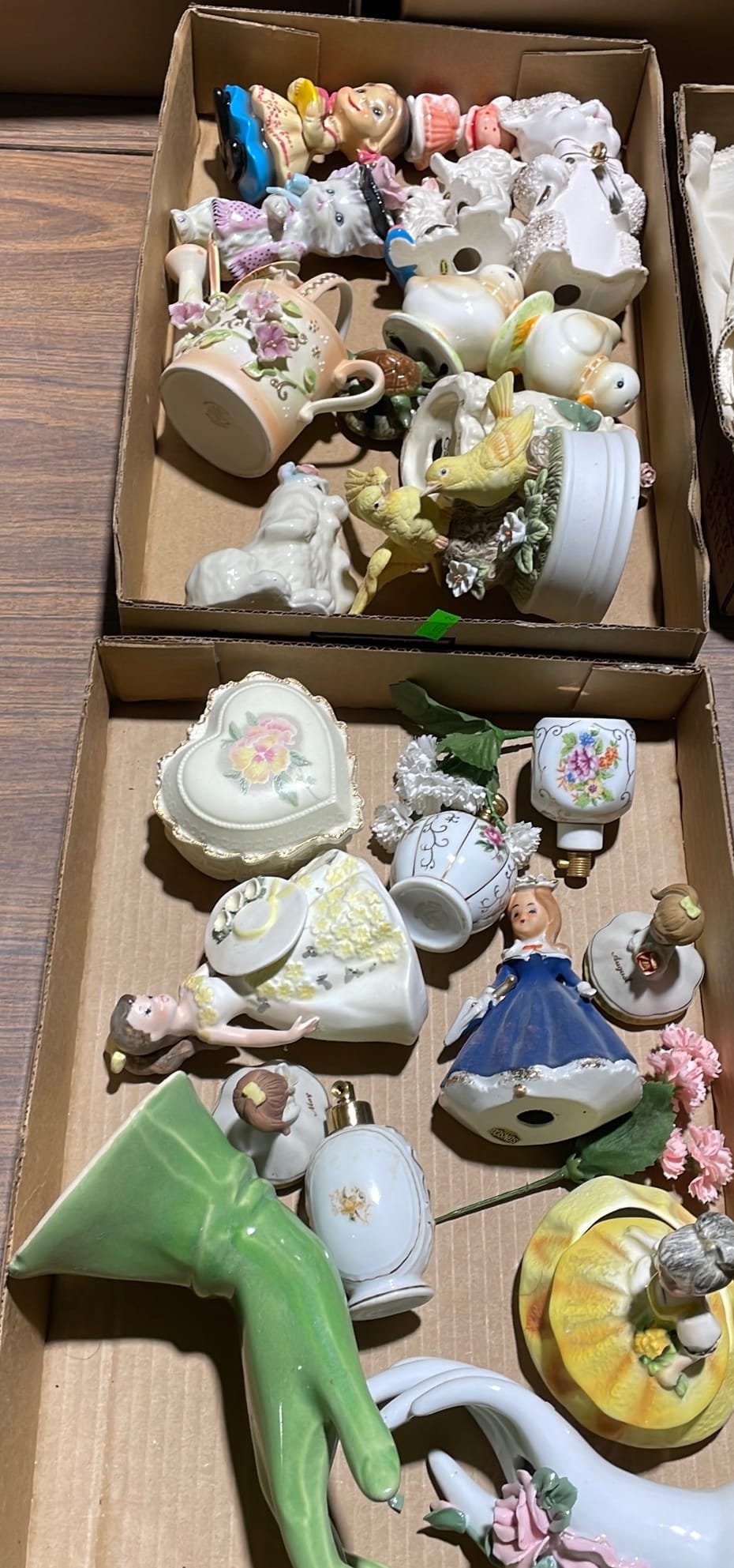 2010 Vintage metal music box ,5.5”, Avon porcelain covered music box , vintage powder jar , clear and ruby glass covered dish , frosted glass rabbit candle holder ,miscellaneous