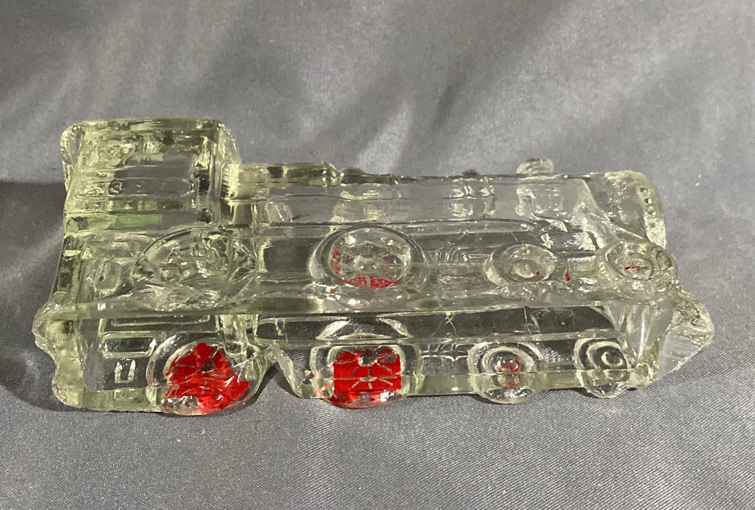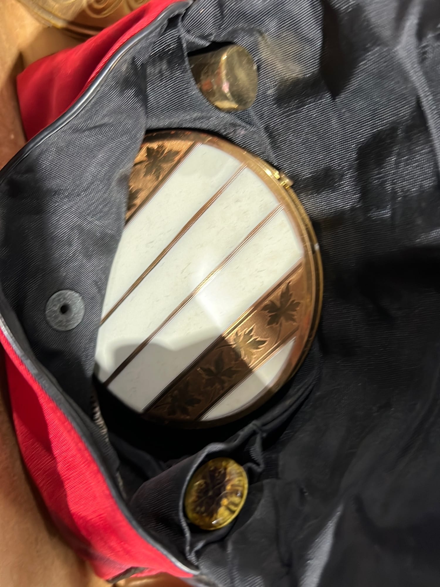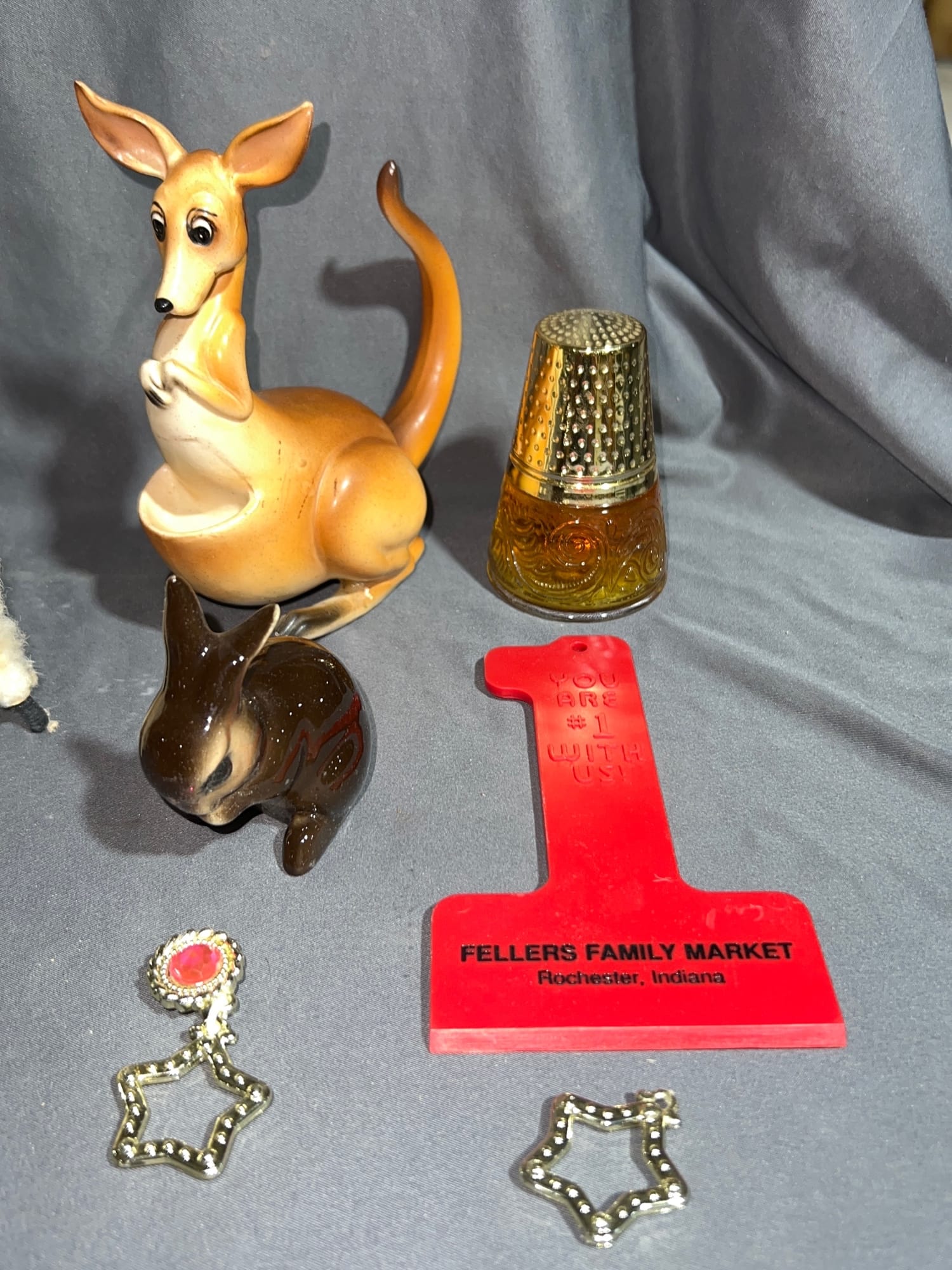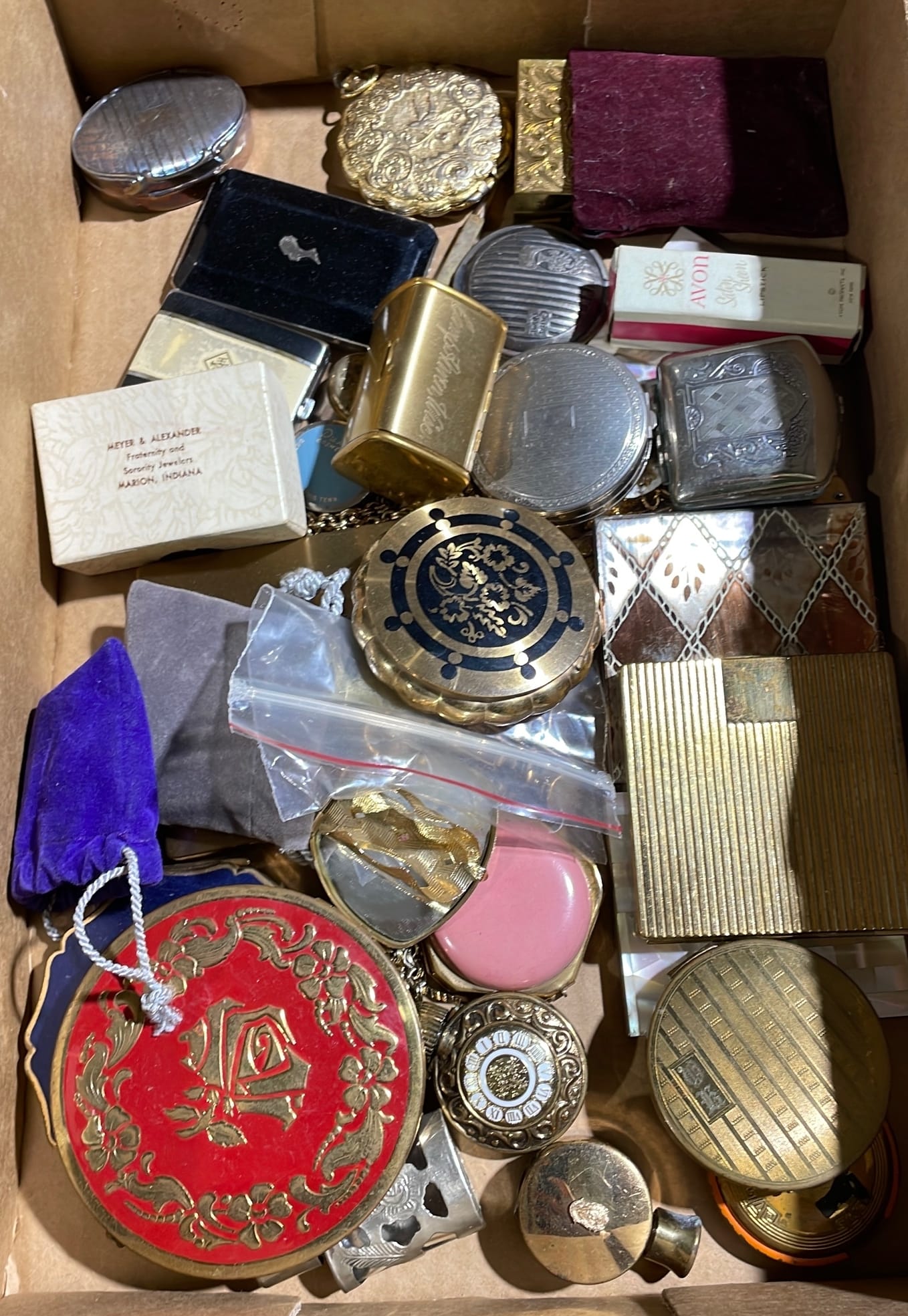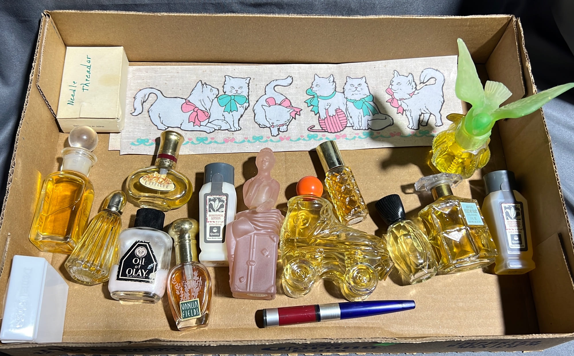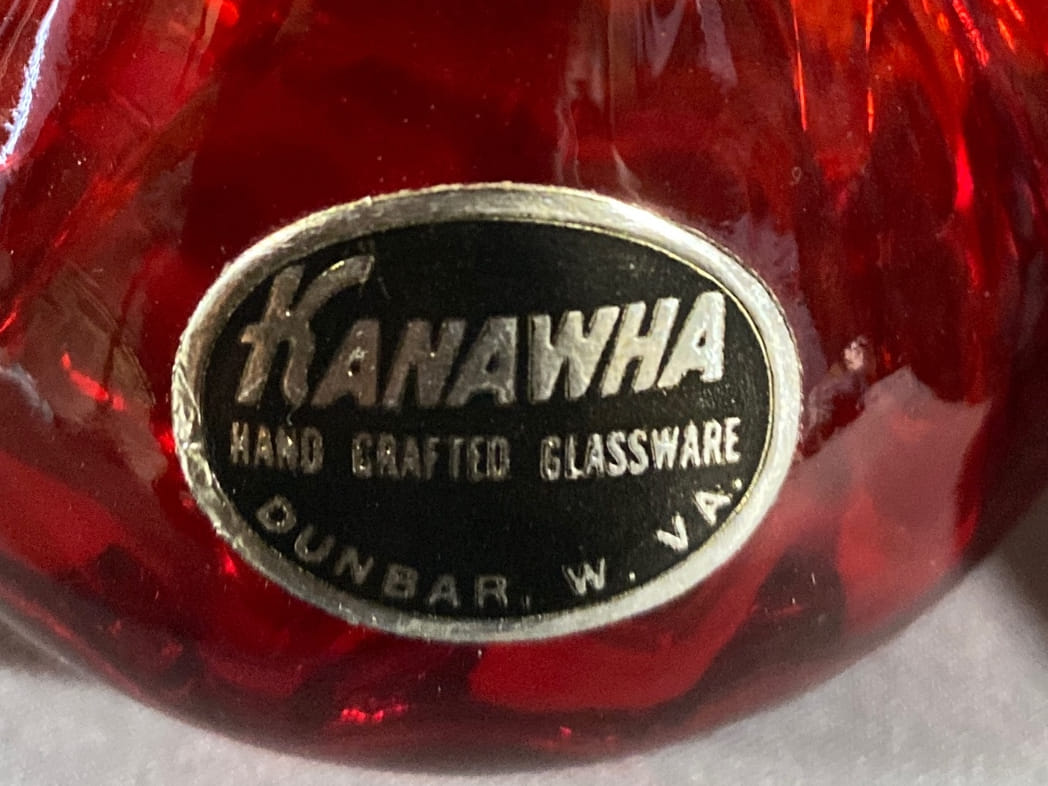 2010 Vintage metal music box ,5.5”, Avon porcelain covered music box , vintage powder jar , clear and ruby glass covered dish , frosted glass rabbit candle holder ,miscellaneous
