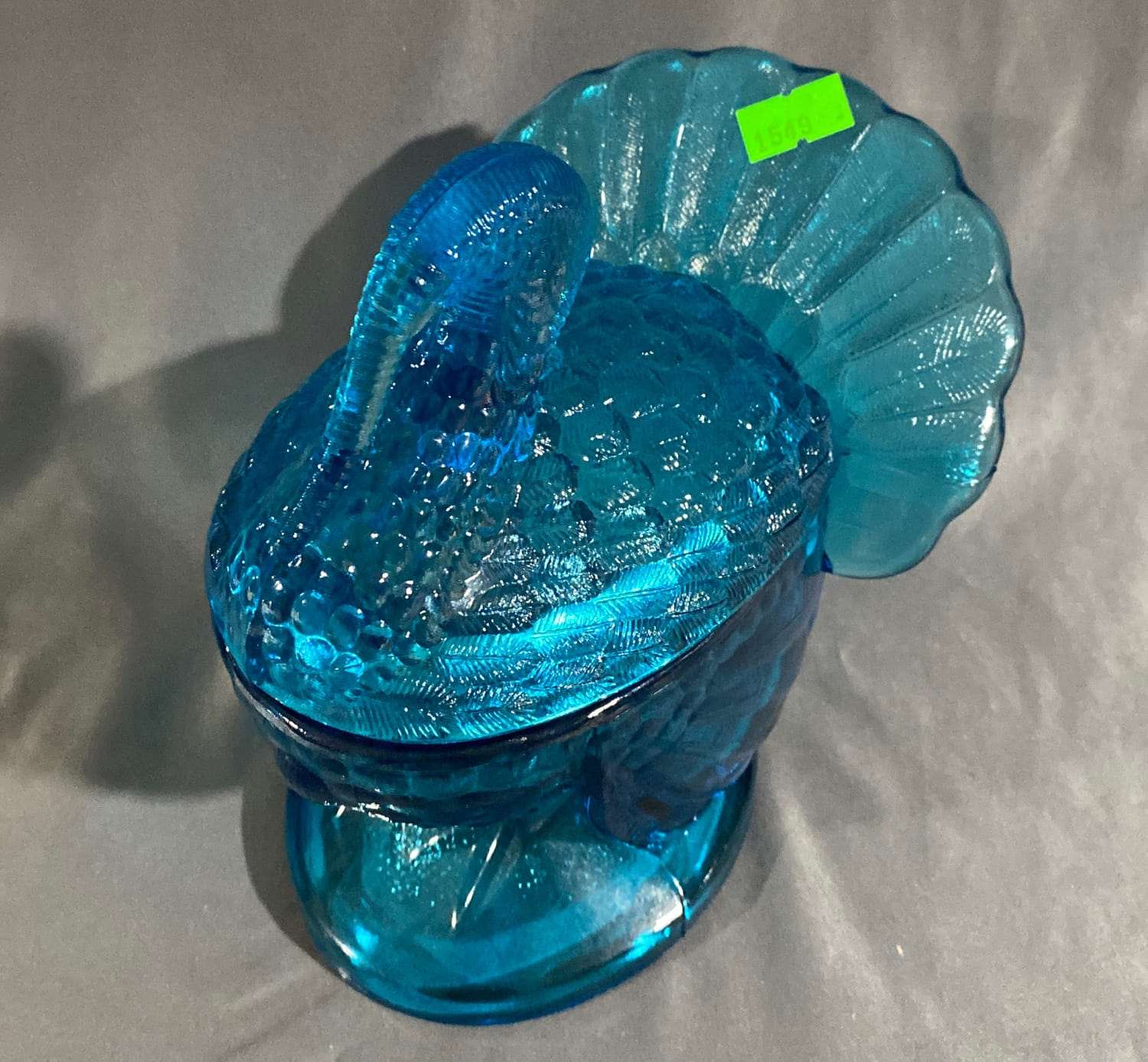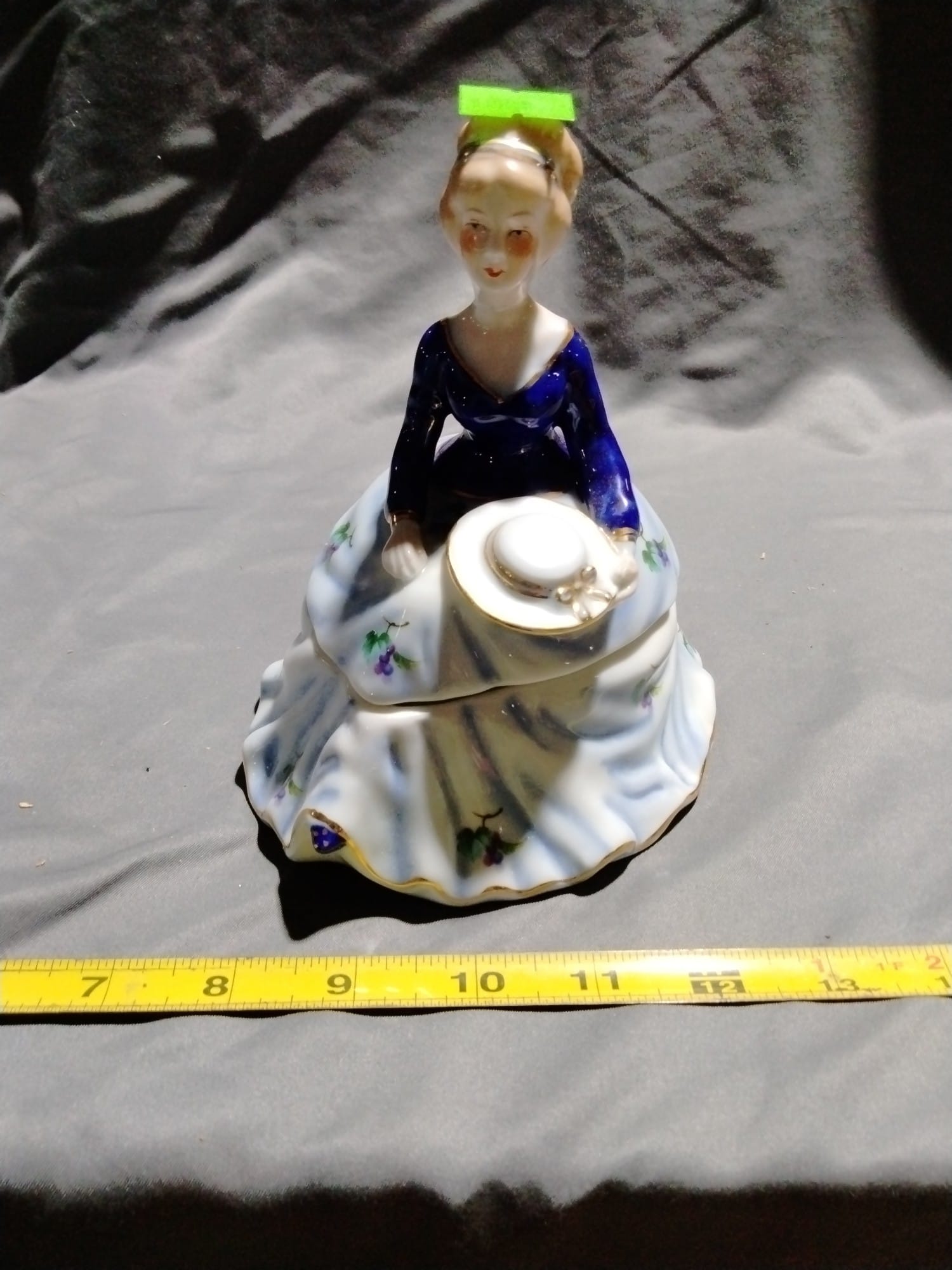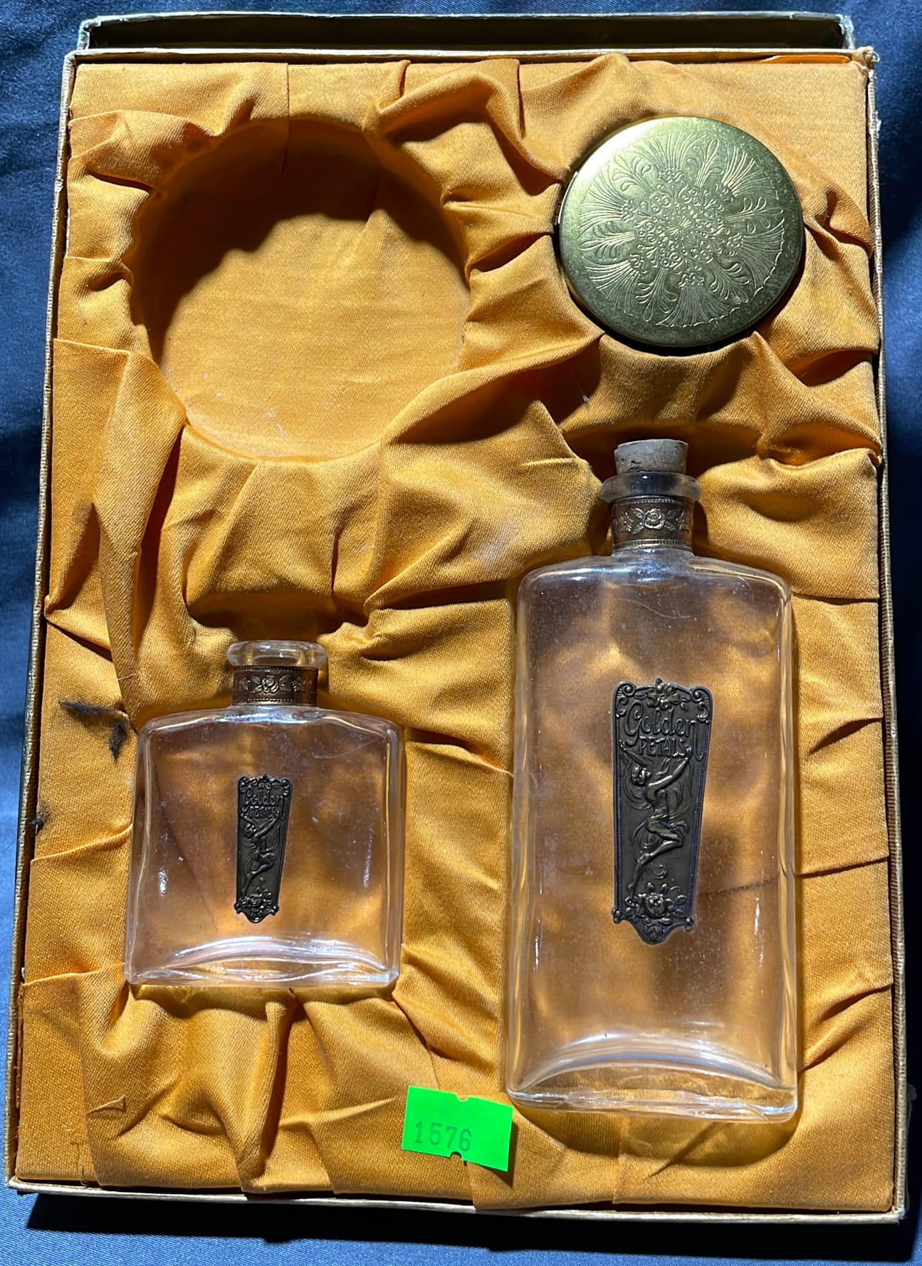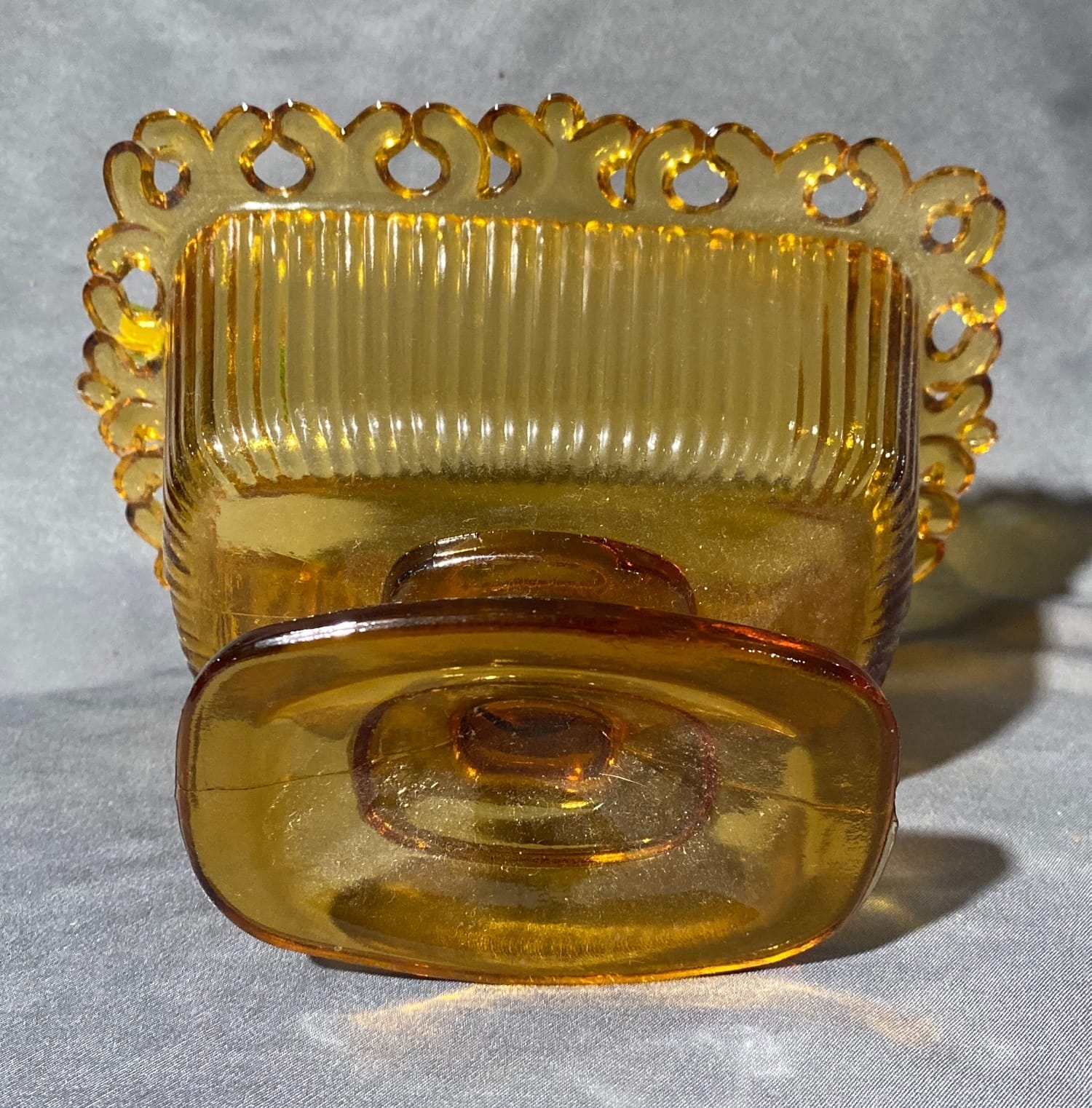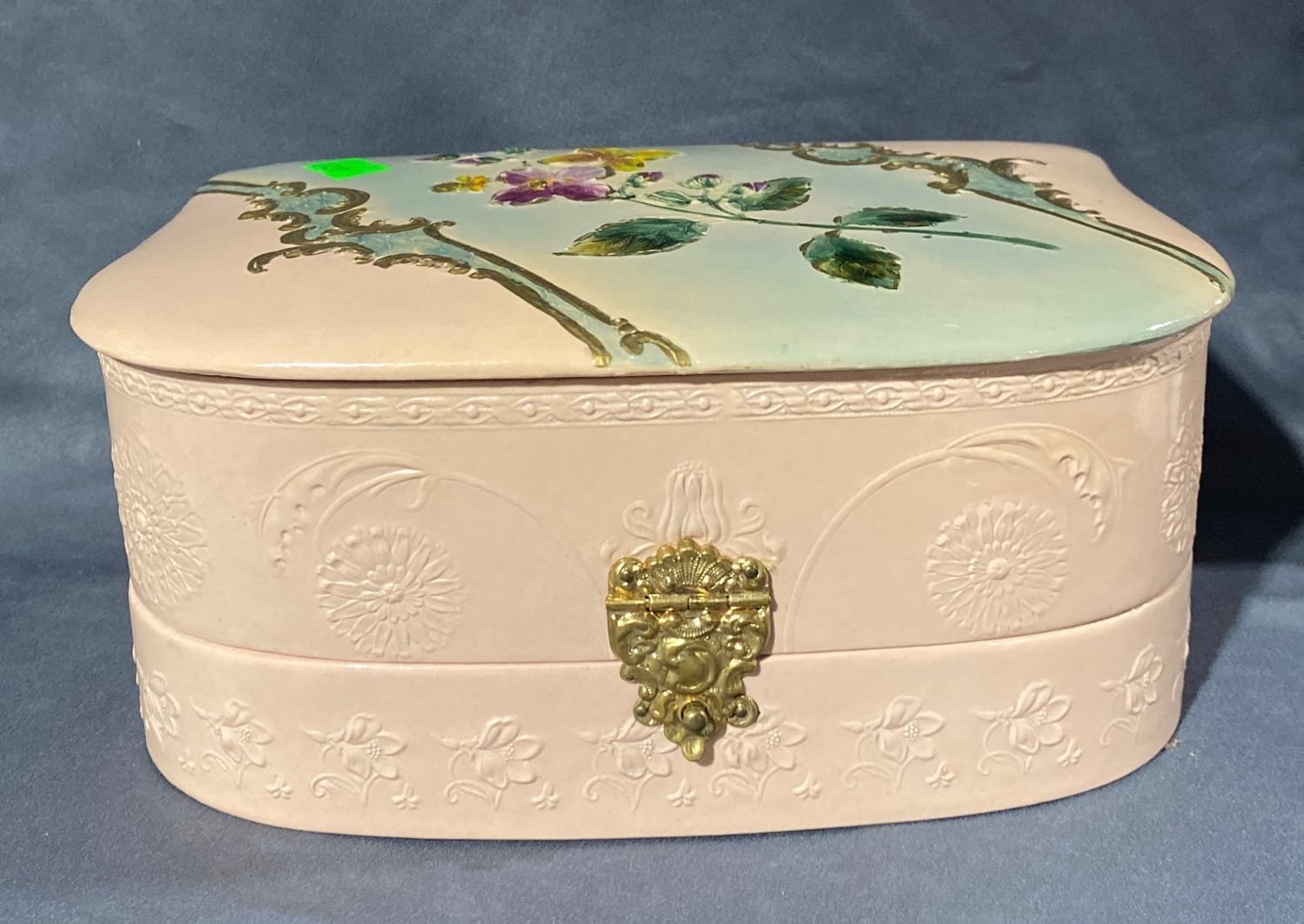 2010 Vintage metal music box ,5.5”, Avon porcelain covered music box , vintage powder jar , clear and ruby glass covered dish , frosted glass rabbit candle holder ,miscellaneous