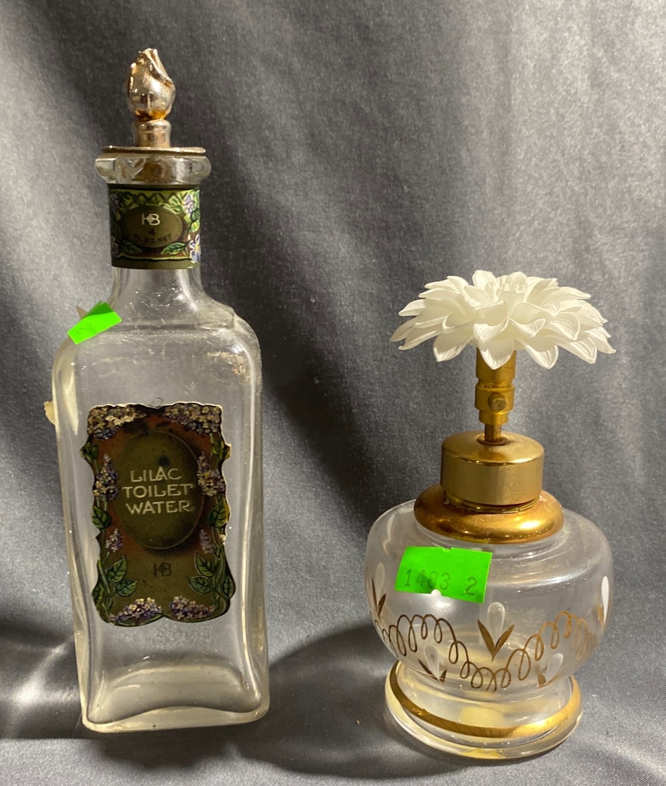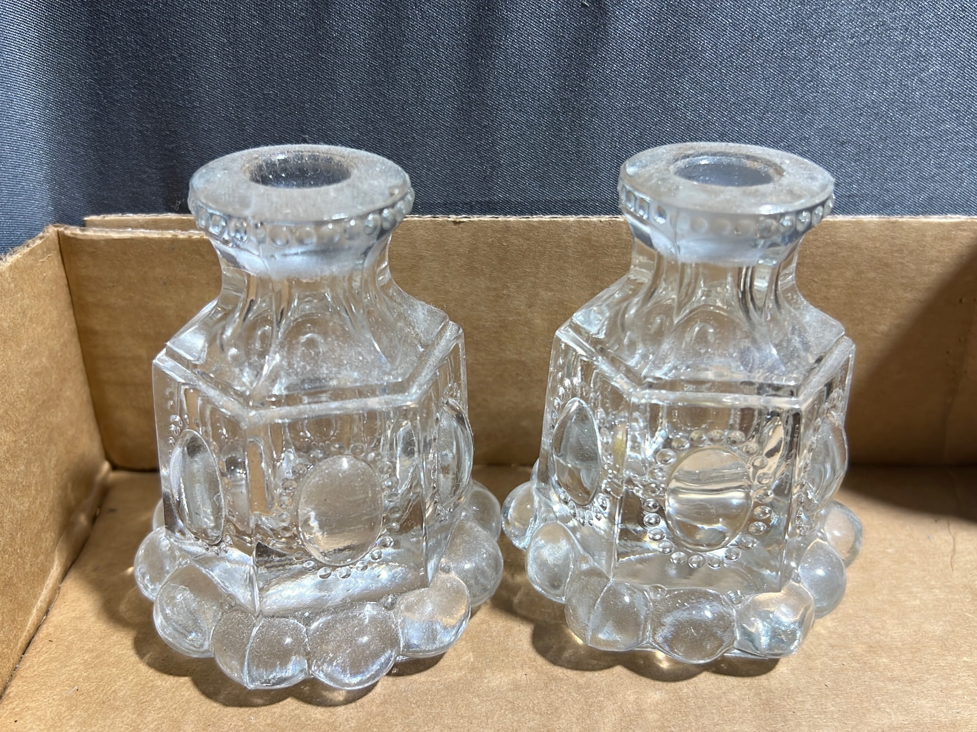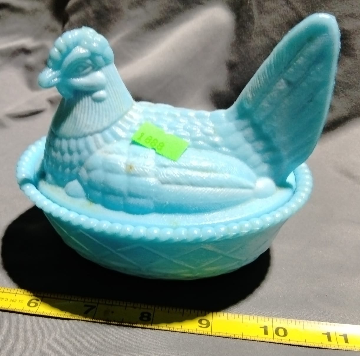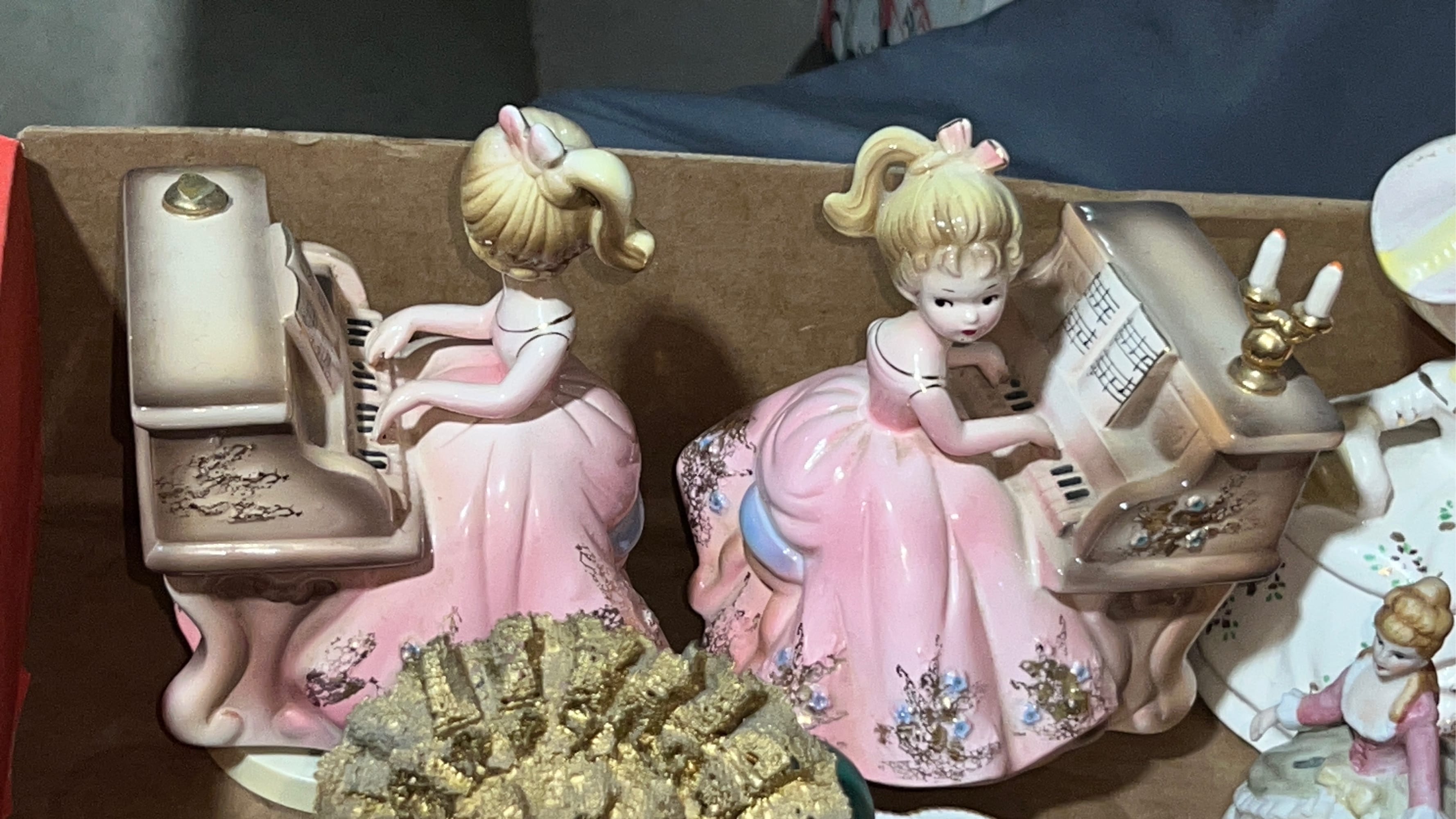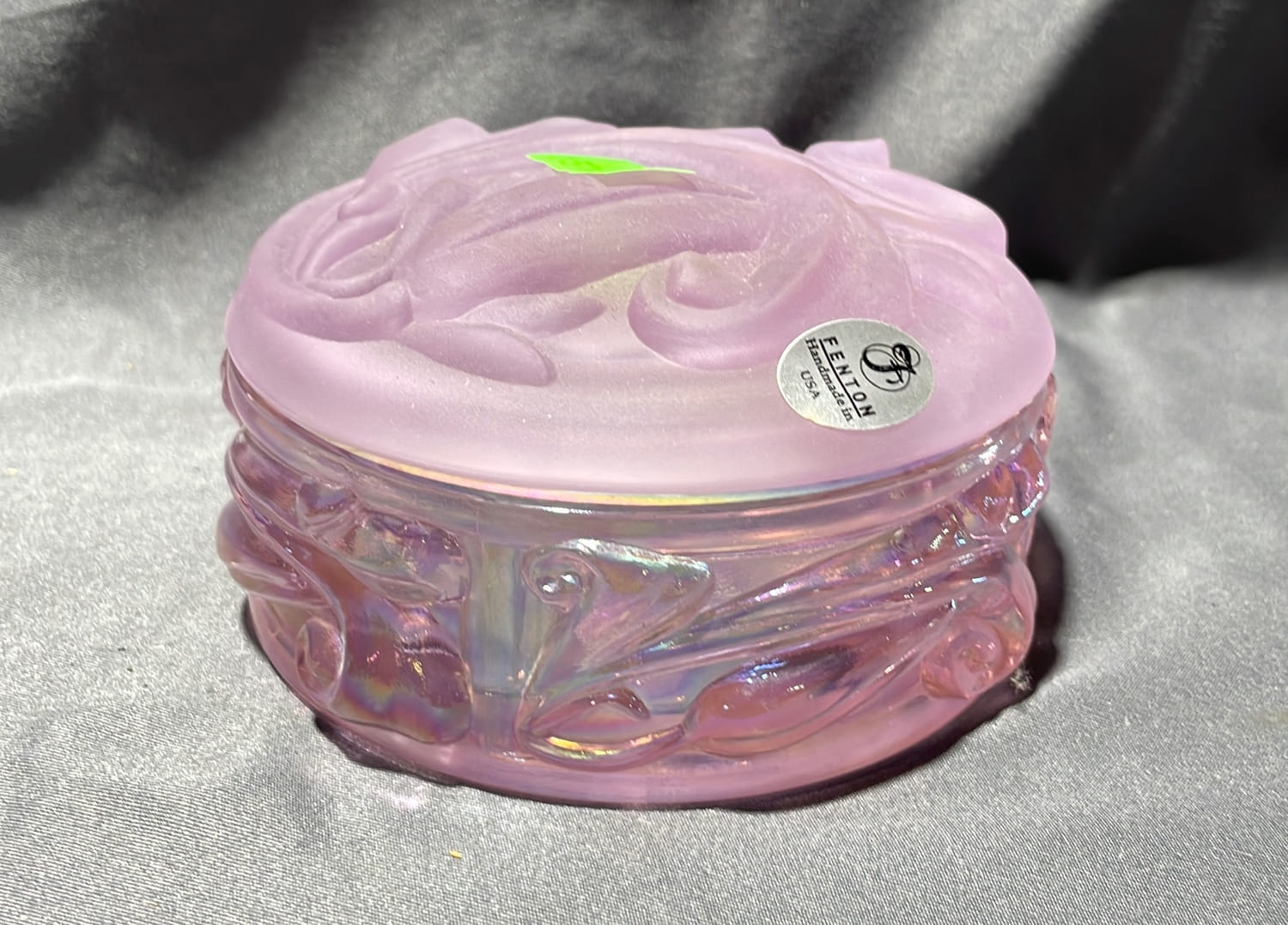 2010 Vintage metal music box ,5.5”, Avon porcelain covered music box , vintage powder jar , clear and ruby glass covered dish , frosted glass rabbit candle holder ,miscellaneous