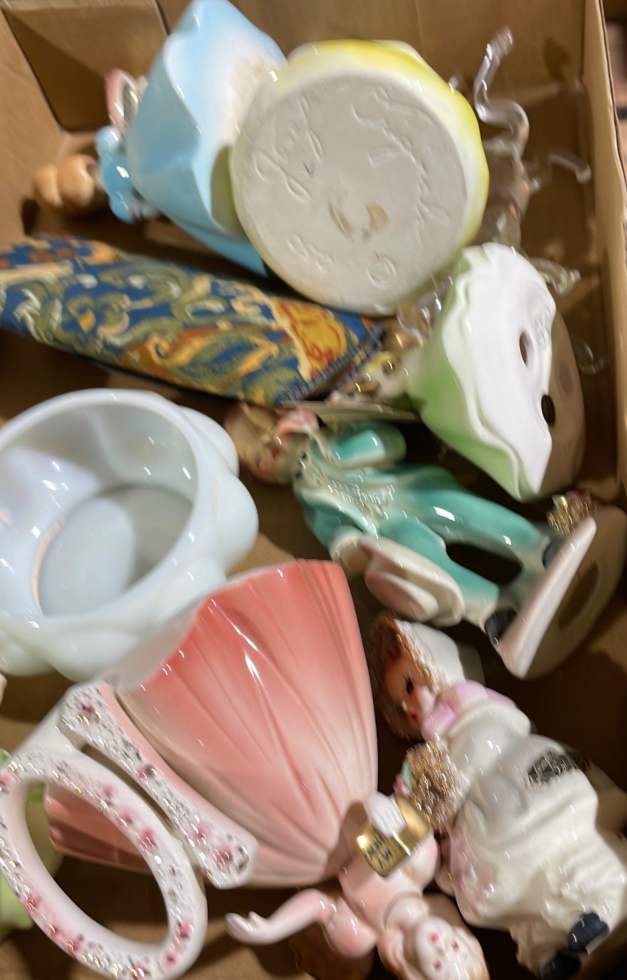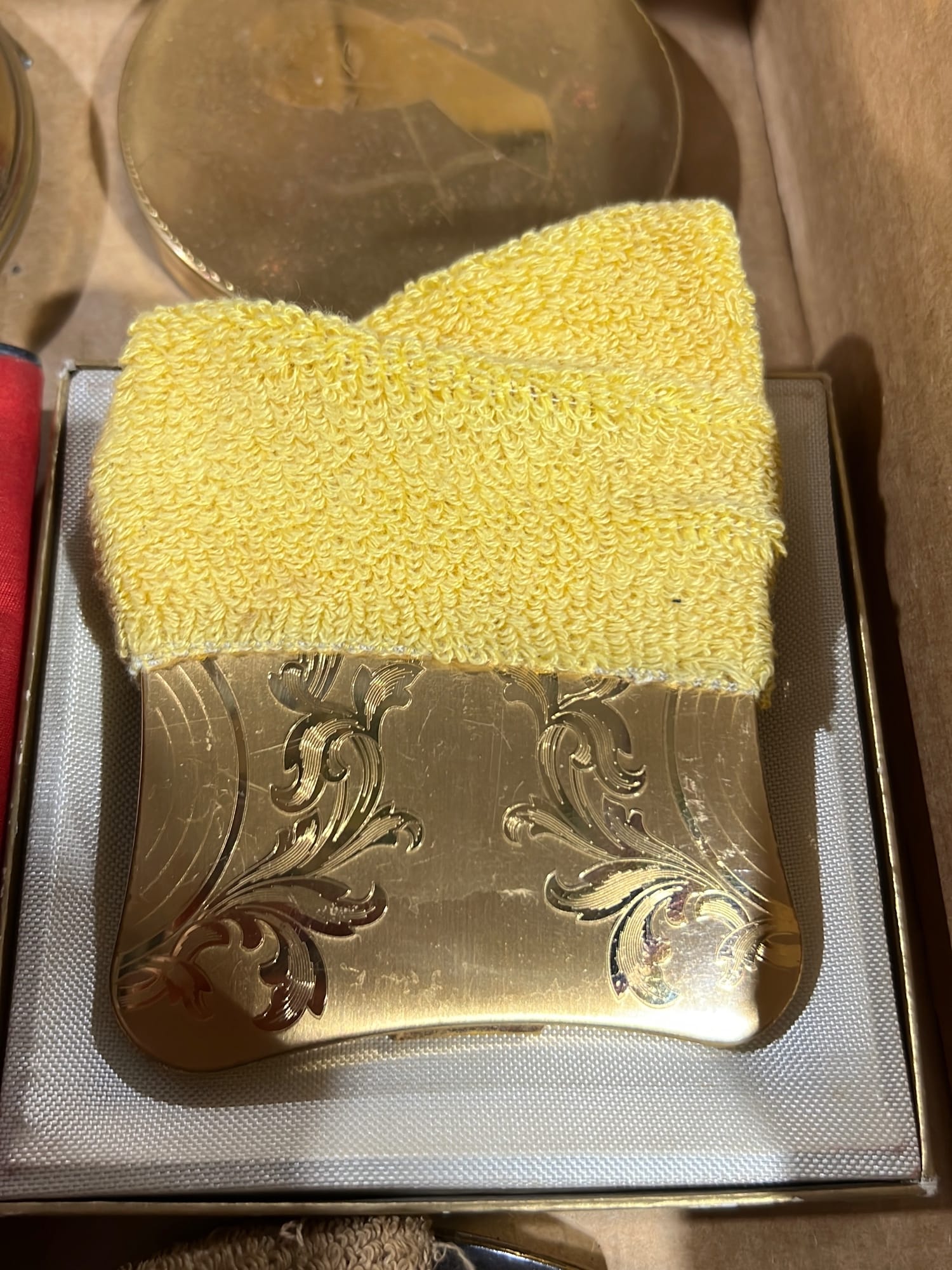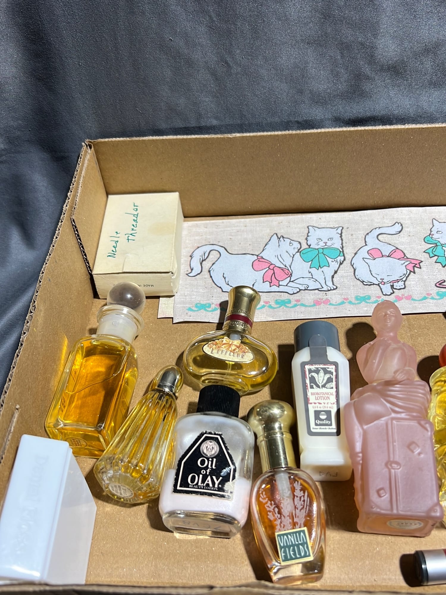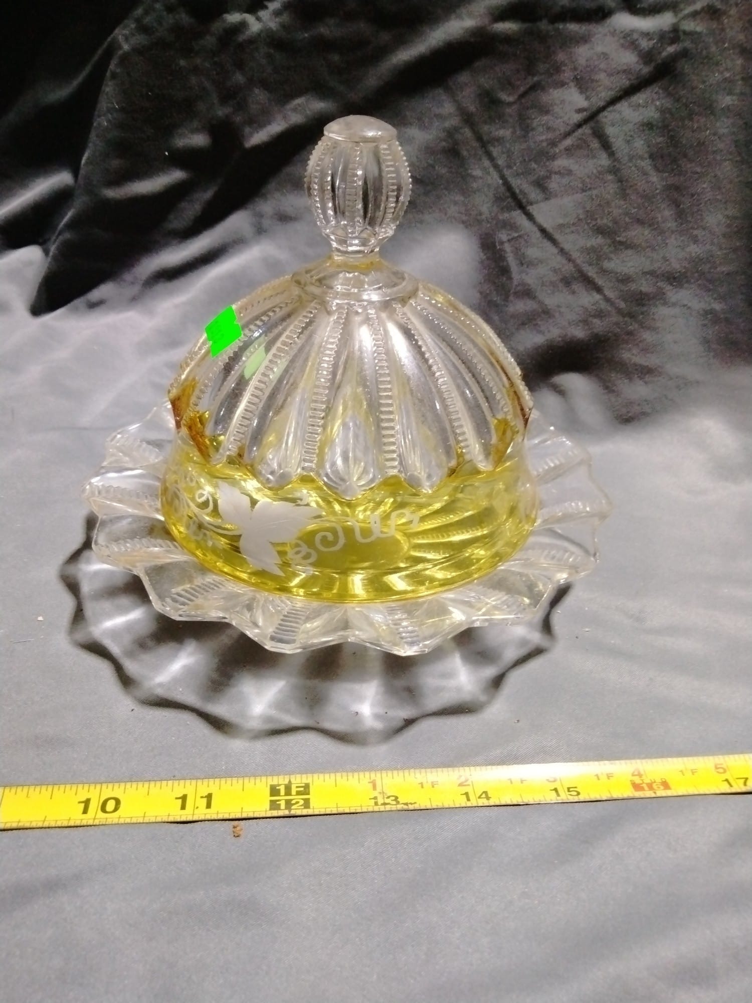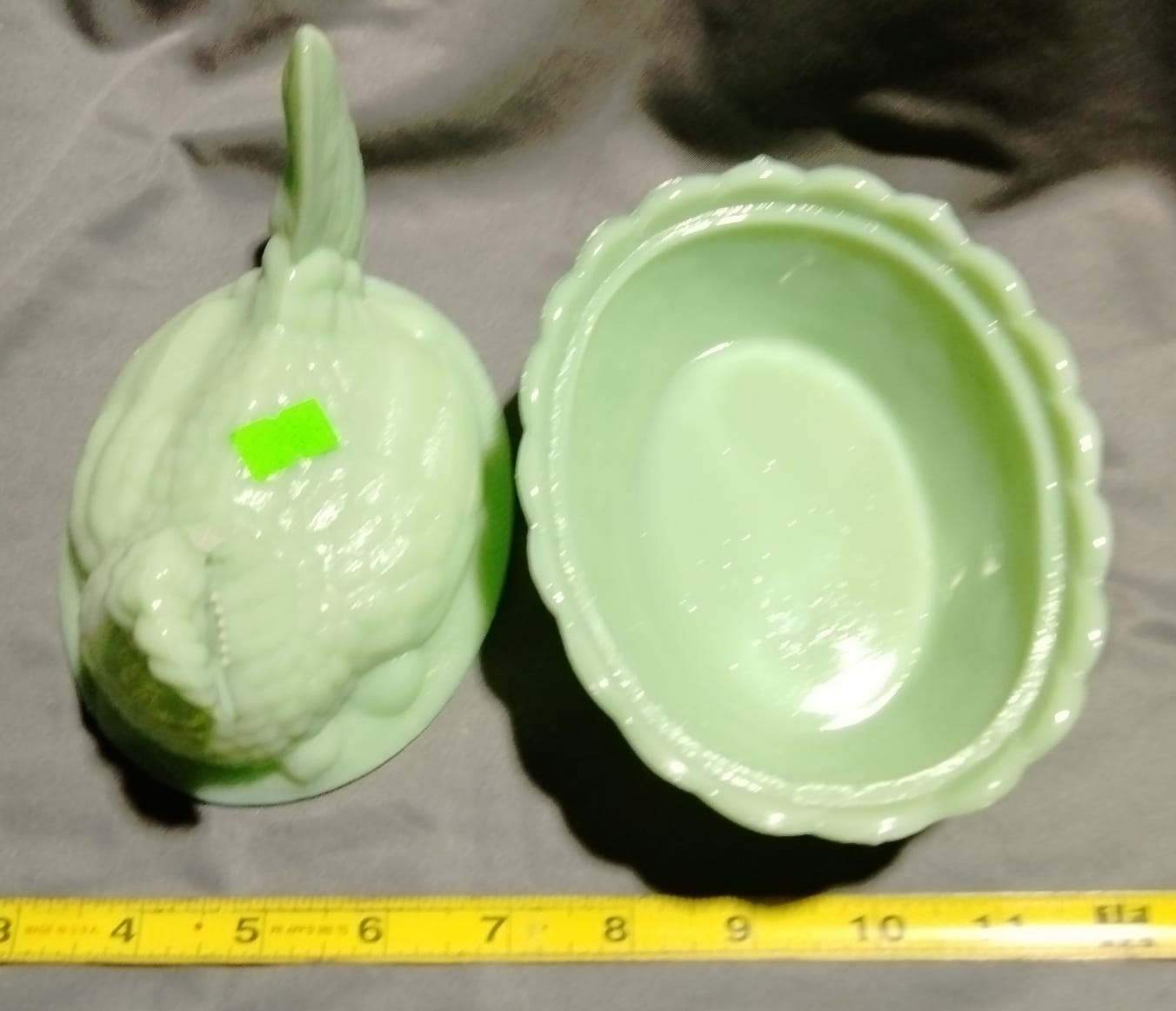 2010 Vintage metal music box ,5.5”, Avon porcelain covered music box , vintage powder jar , clear and ruby glass covered dish , frosted glass rabbit candle holder ,miscellaneous