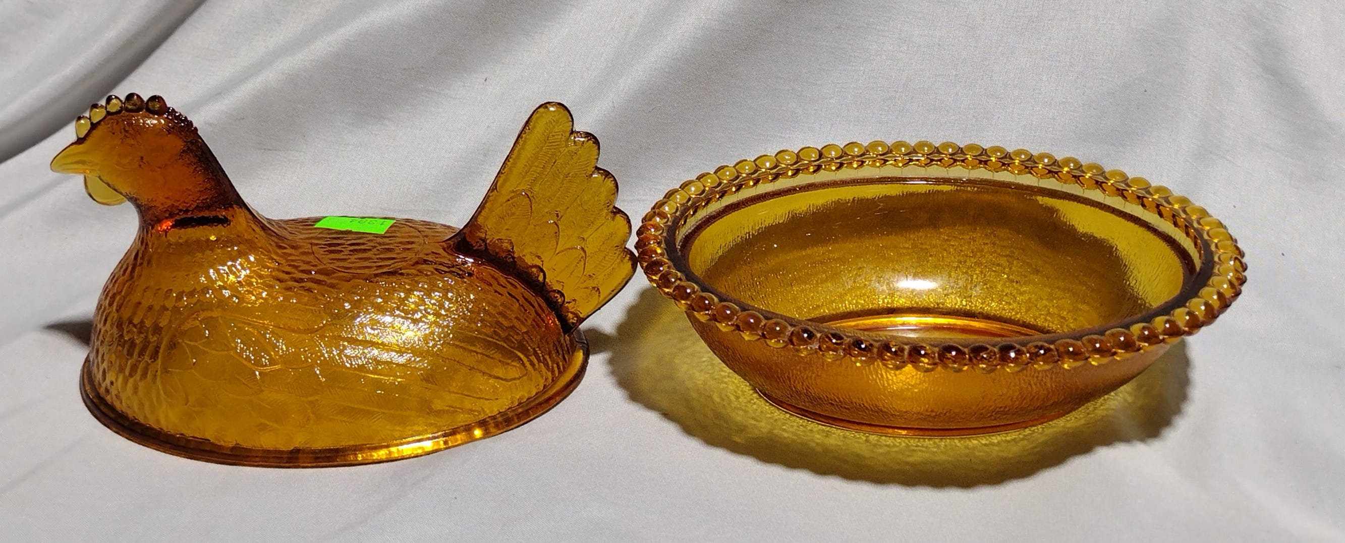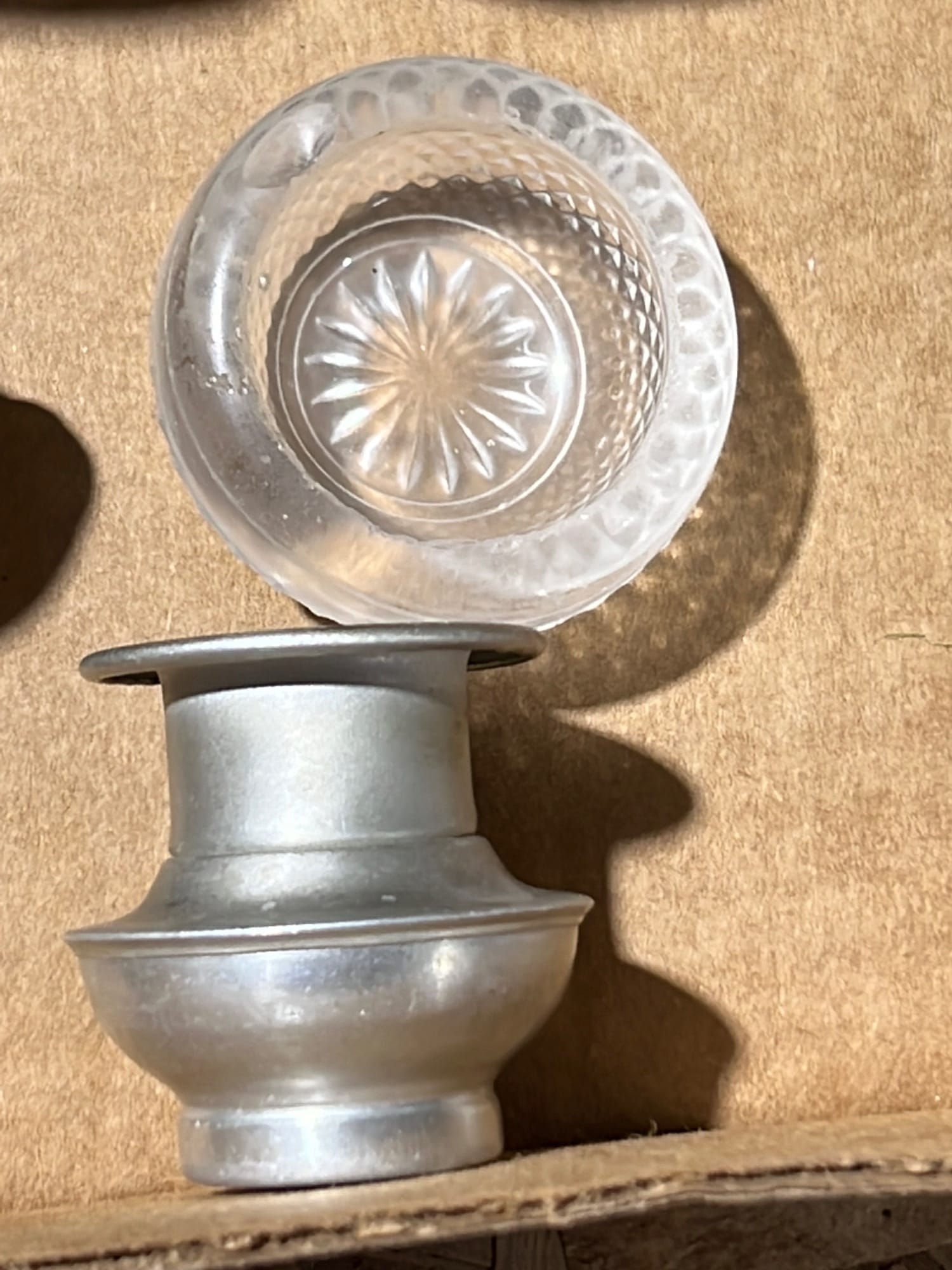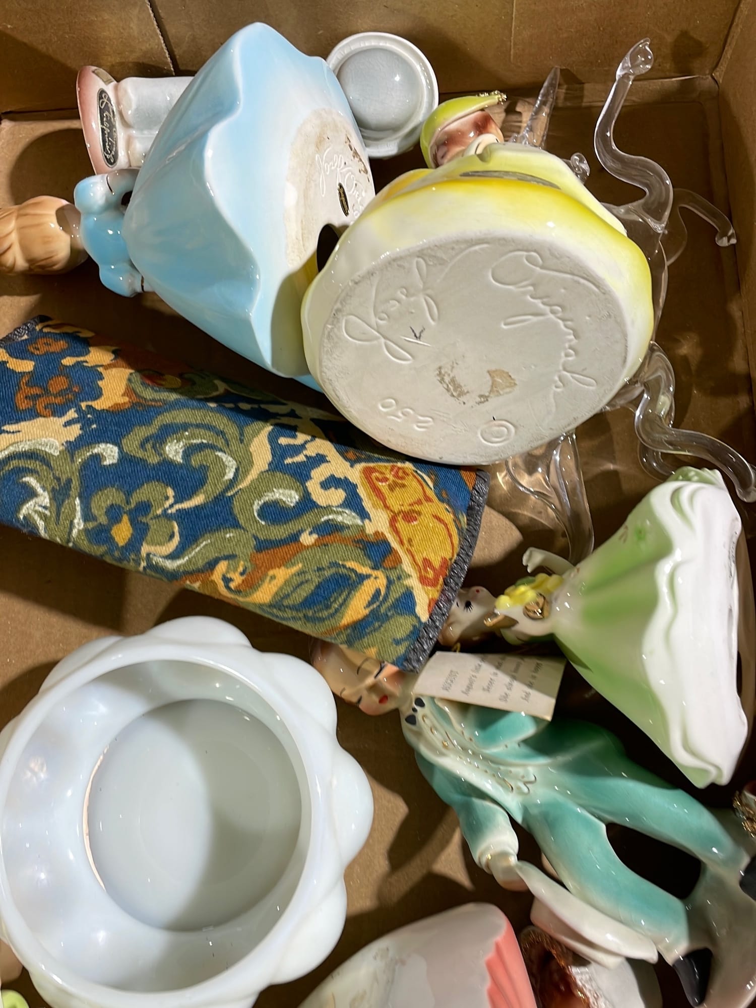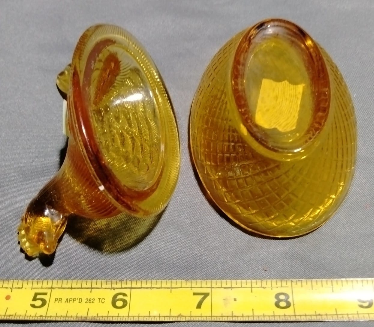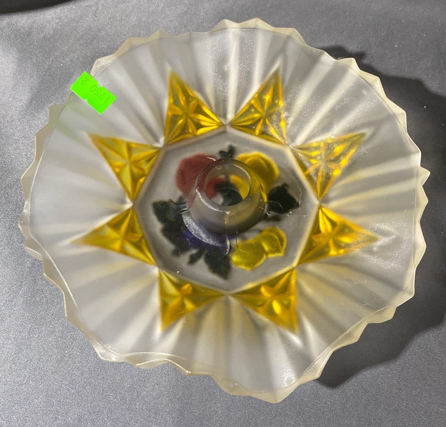 2010 Vintage metal music box ,5.5”, Avon porcelain covered music box , vintage powder jar , clear and ruby glass covered dish , frosted glass rabbit candle holder ,miscellaneous
