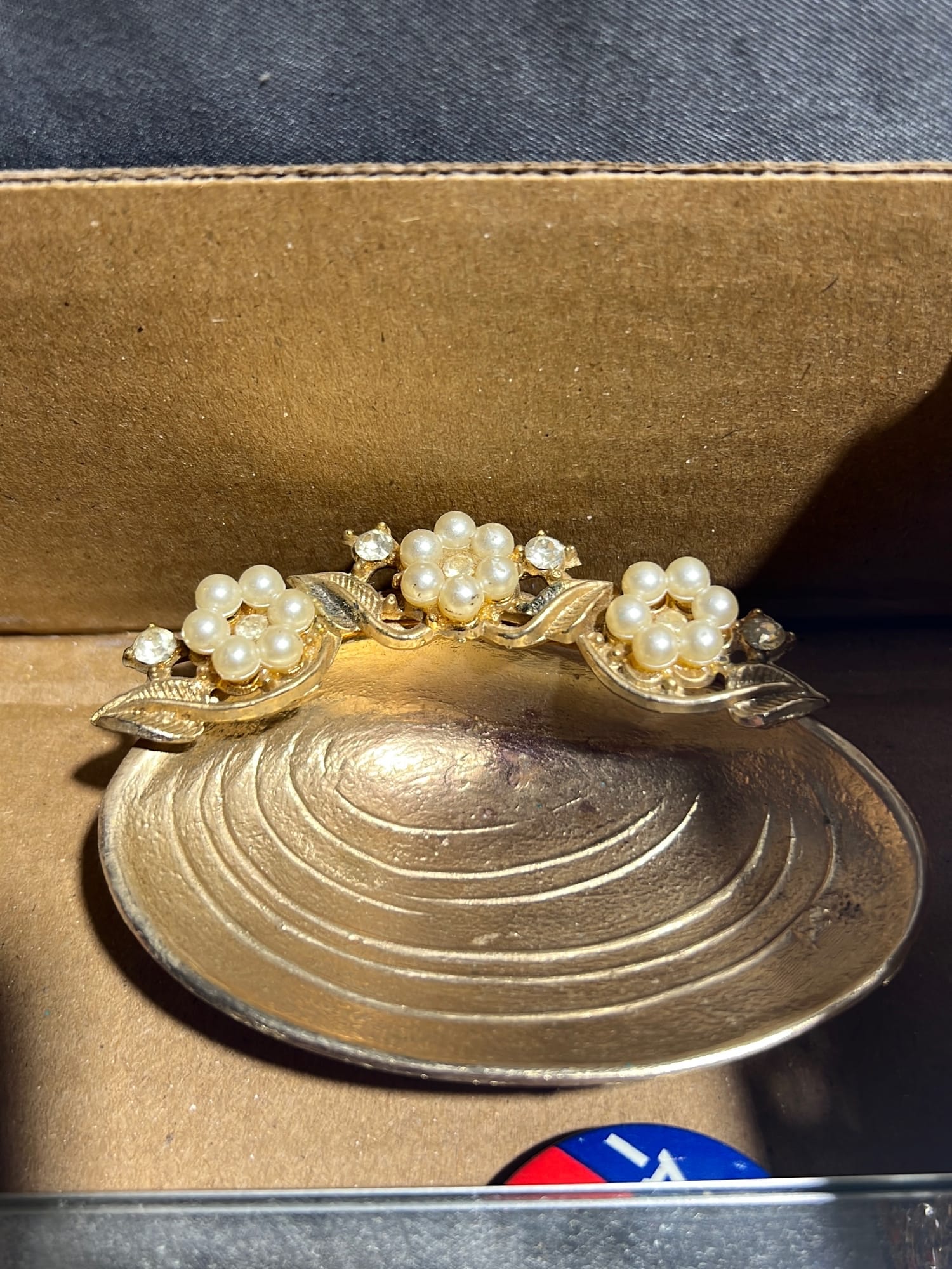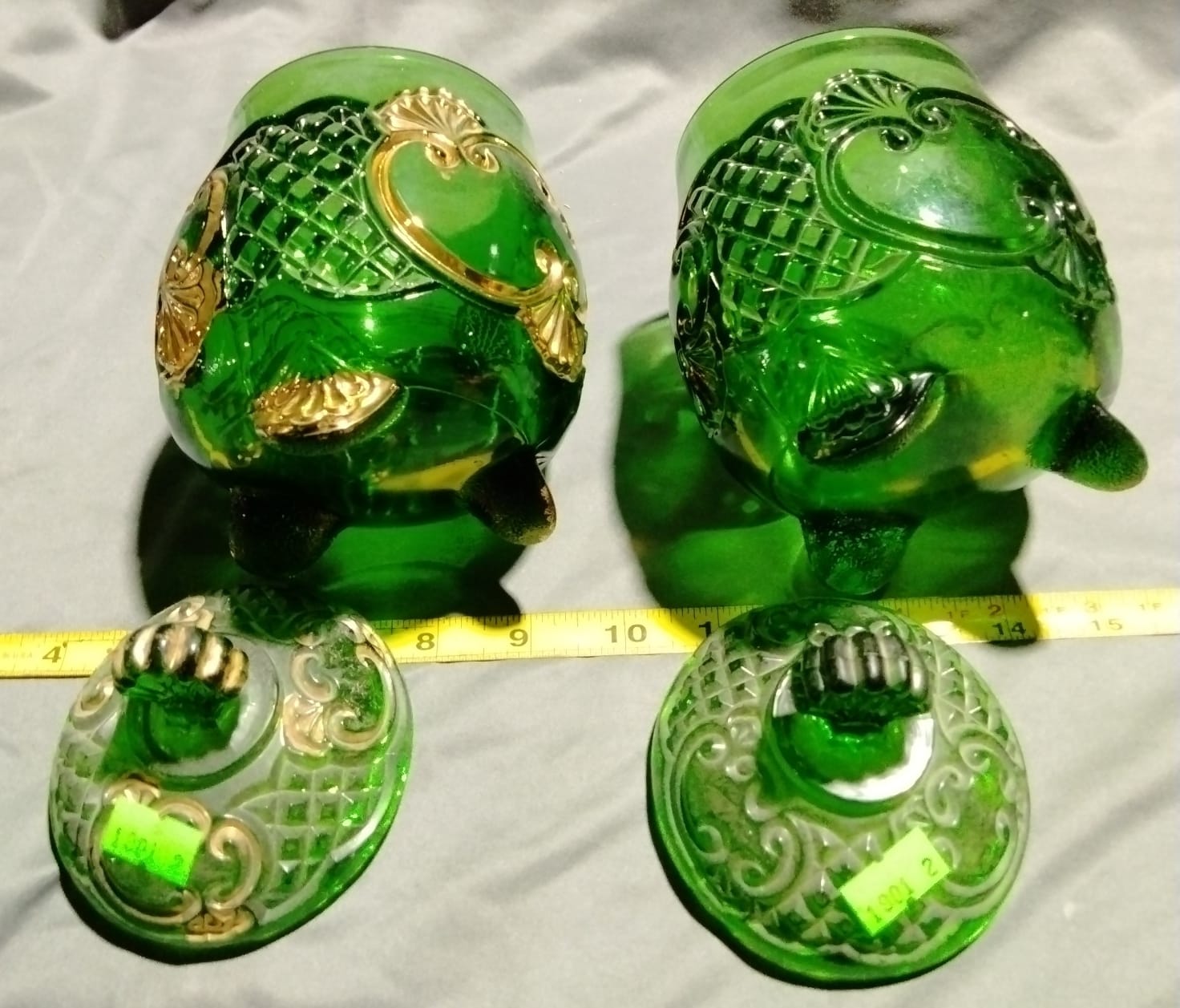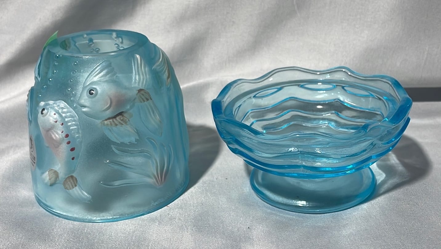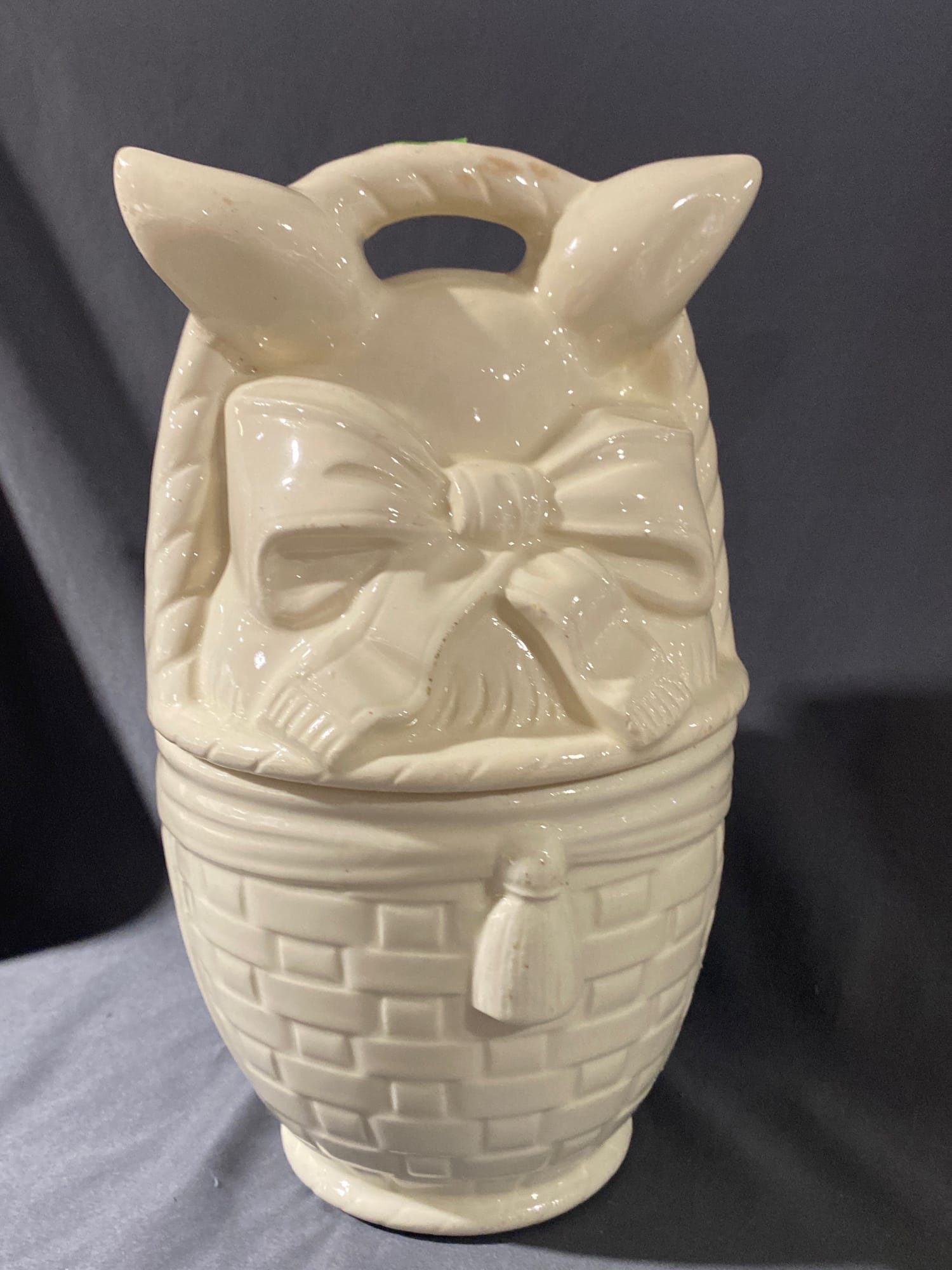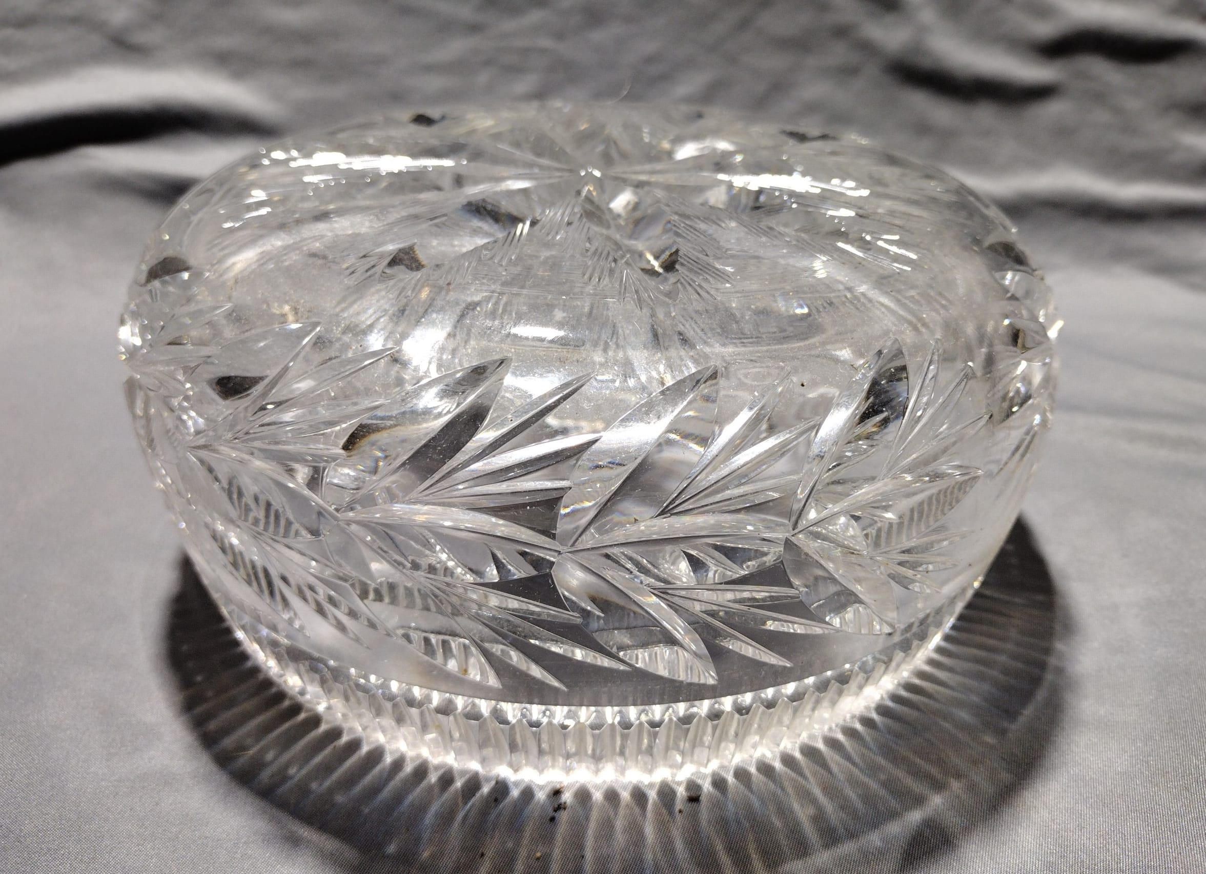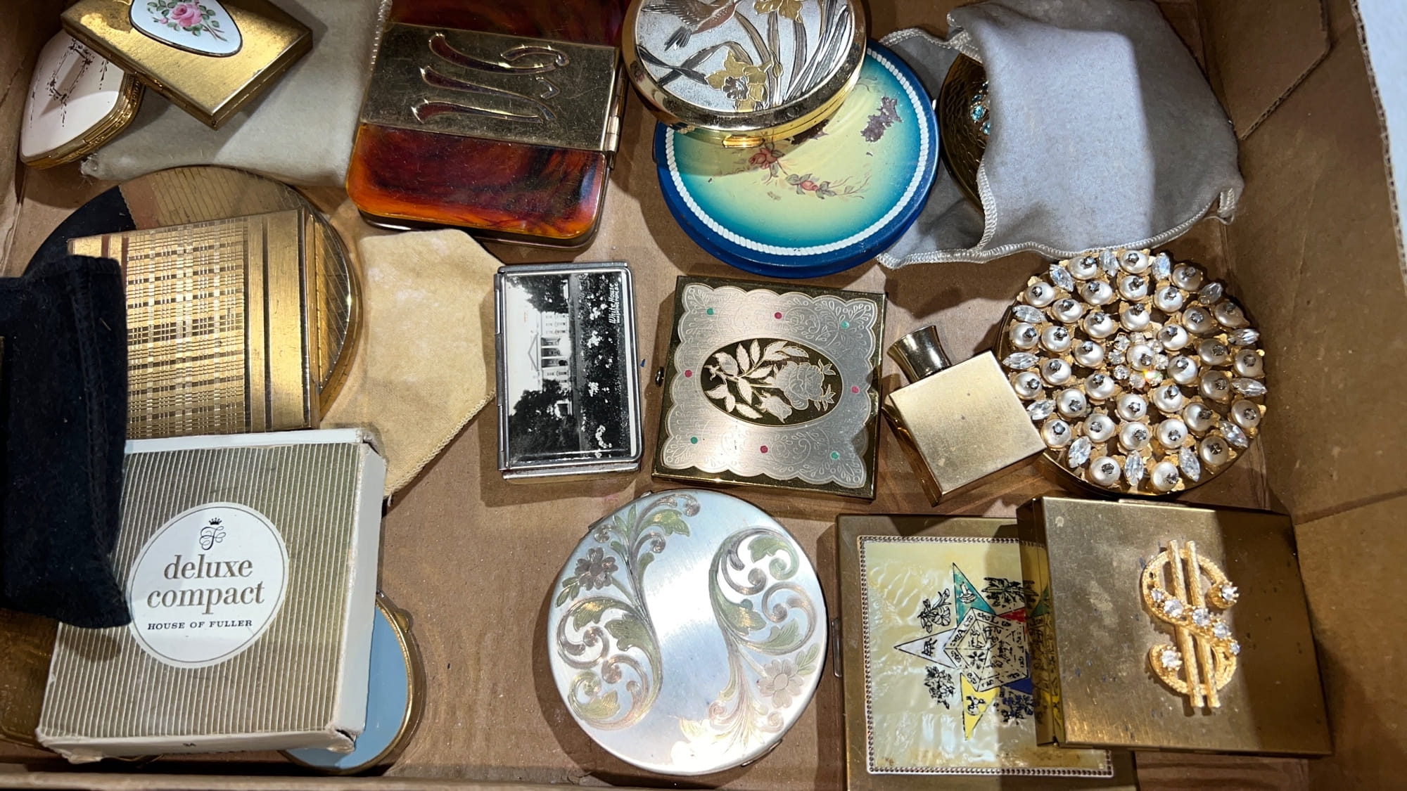 2010 Vintage metal music box ,5.5”, Avon porcelain covered music box , vintage powder jar , clear and ruby glass covered dish , frosted glass rabbit candle holder ,miscellaneous