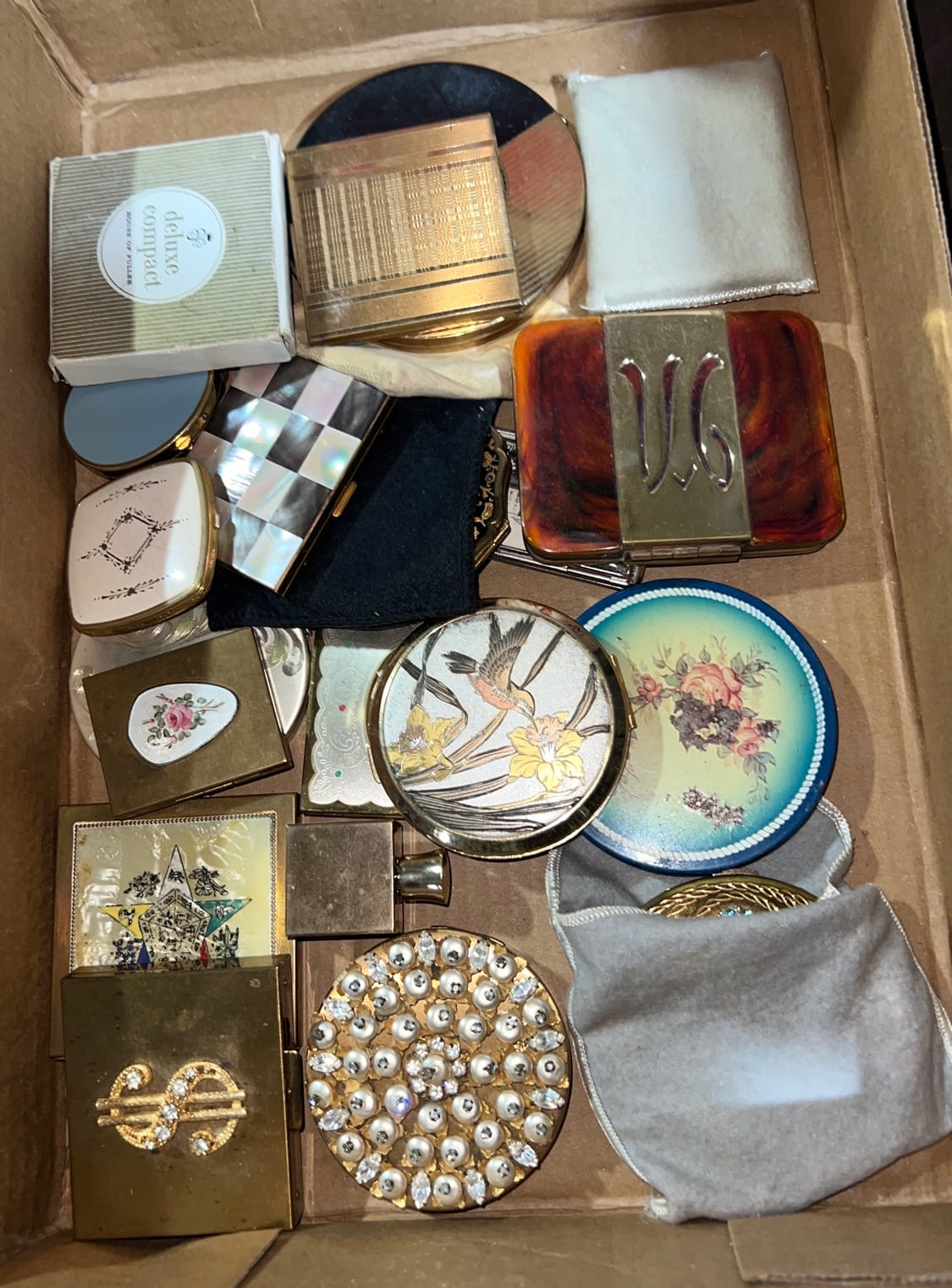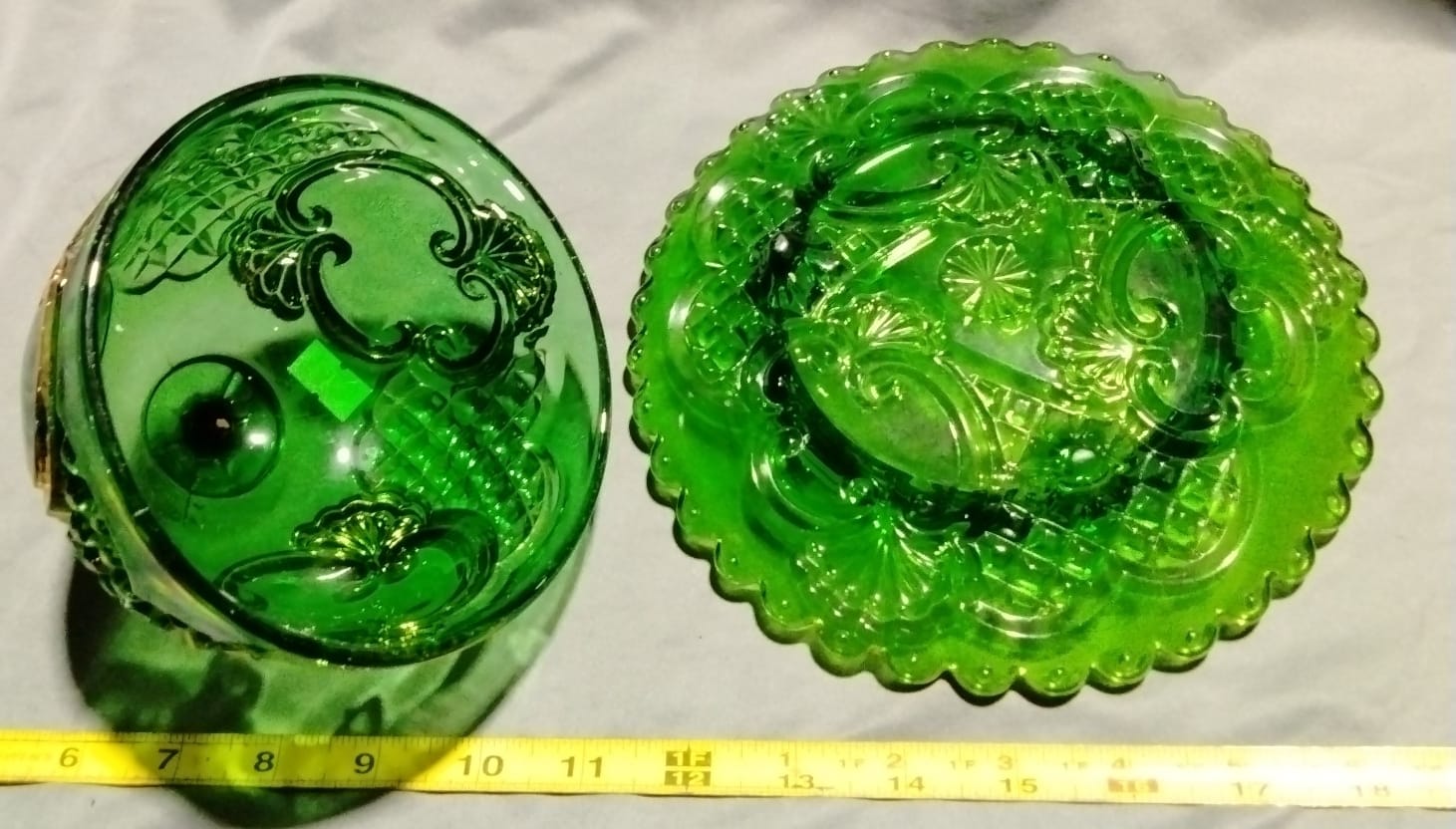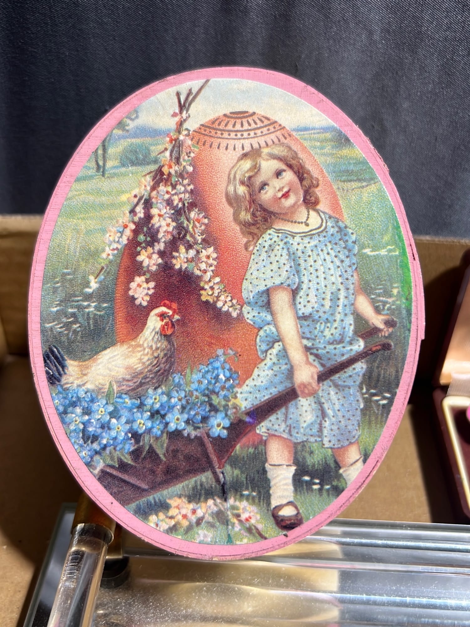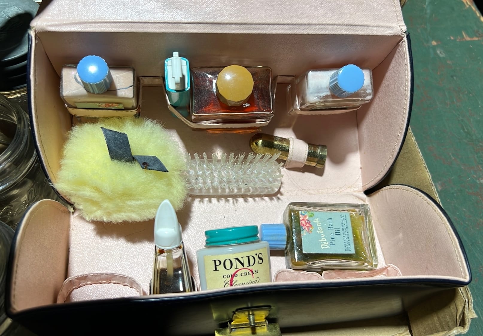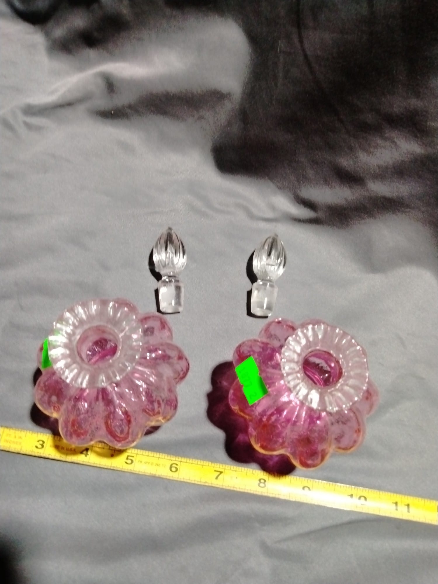 2010 Vintage metal music box ,5.5”, Avon porcelain covered music box , vintage powder jar , clear and ruby glass covered dish , frosted glass rabbit candle holder ,miscellaneous
