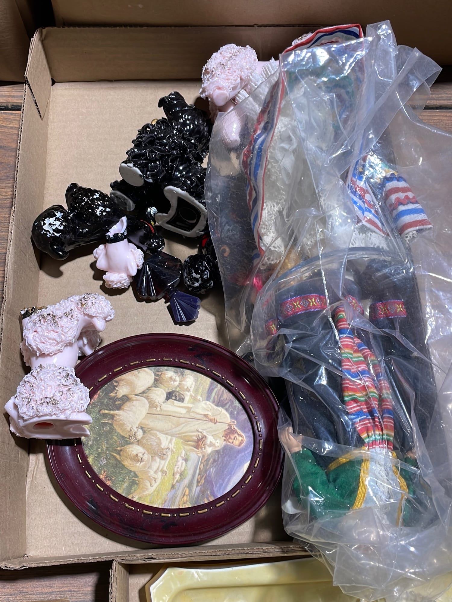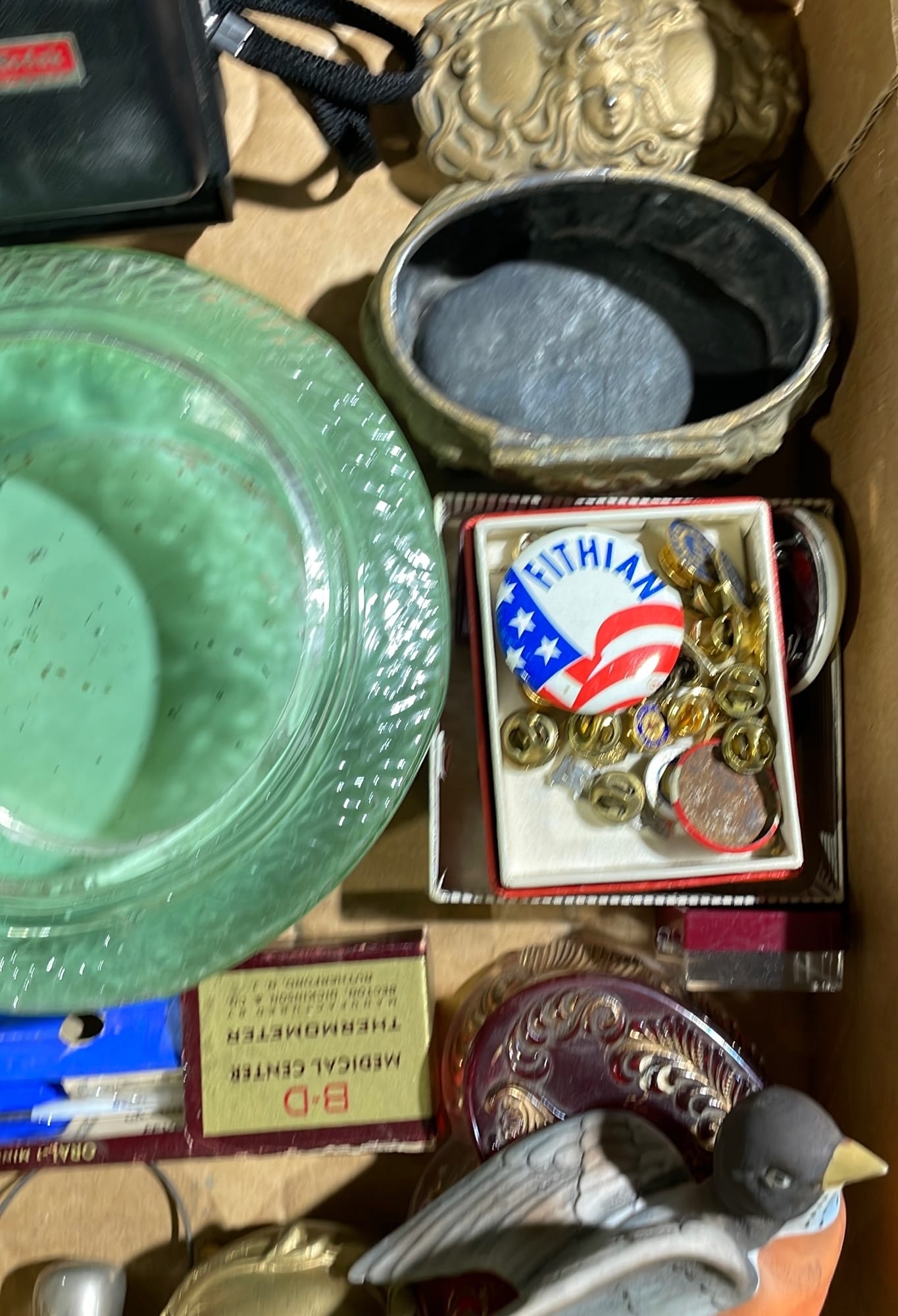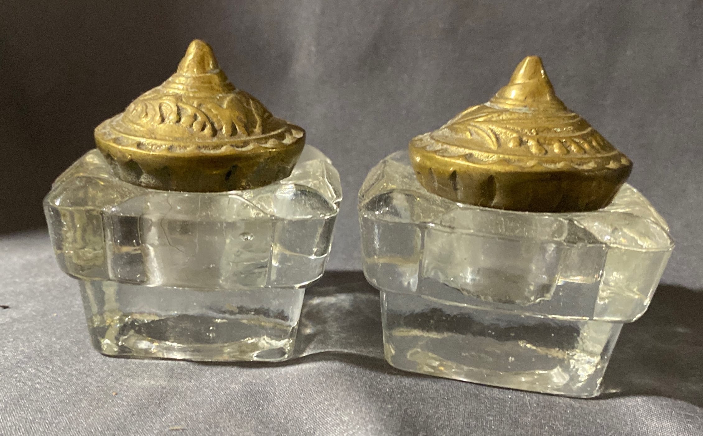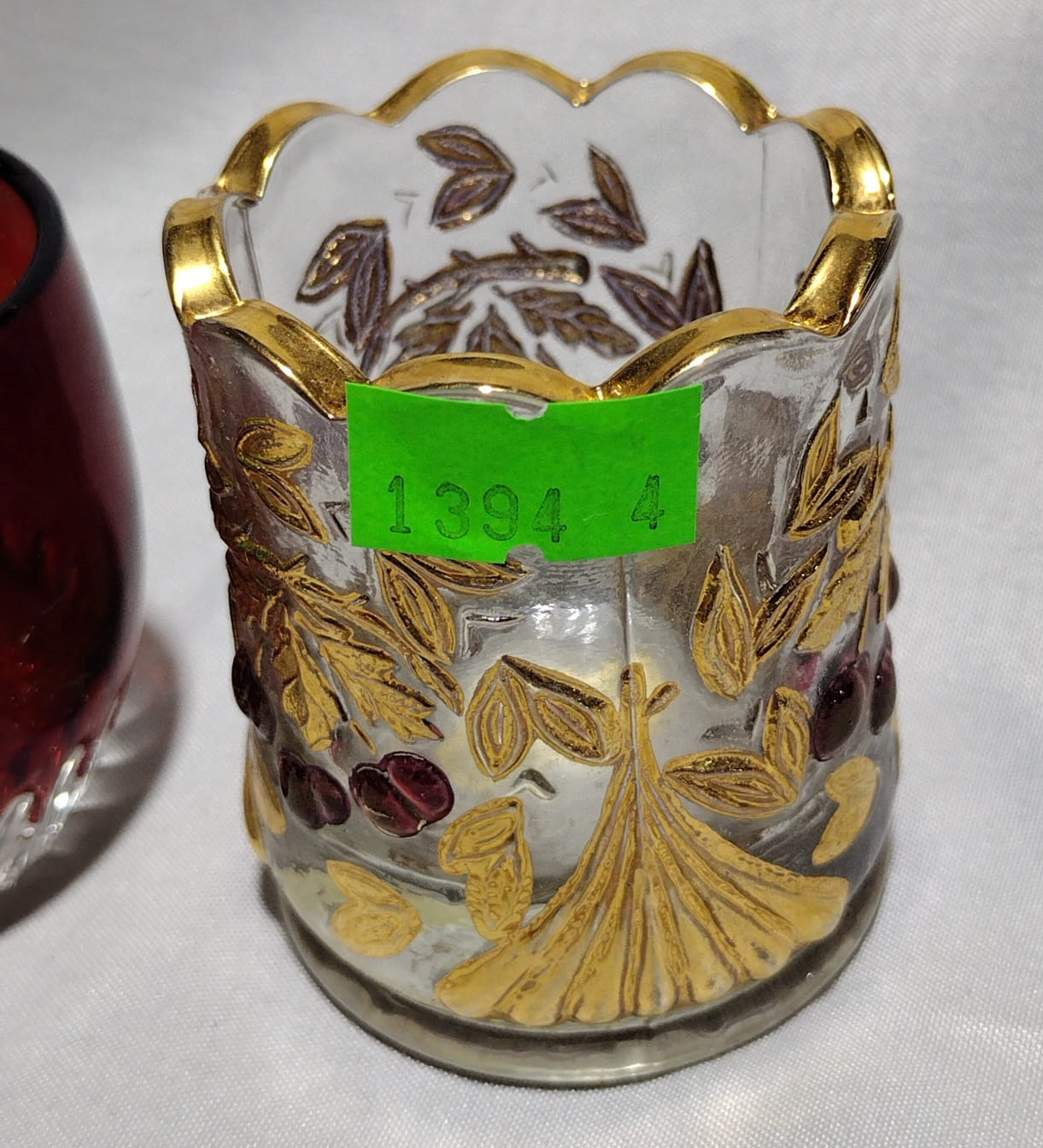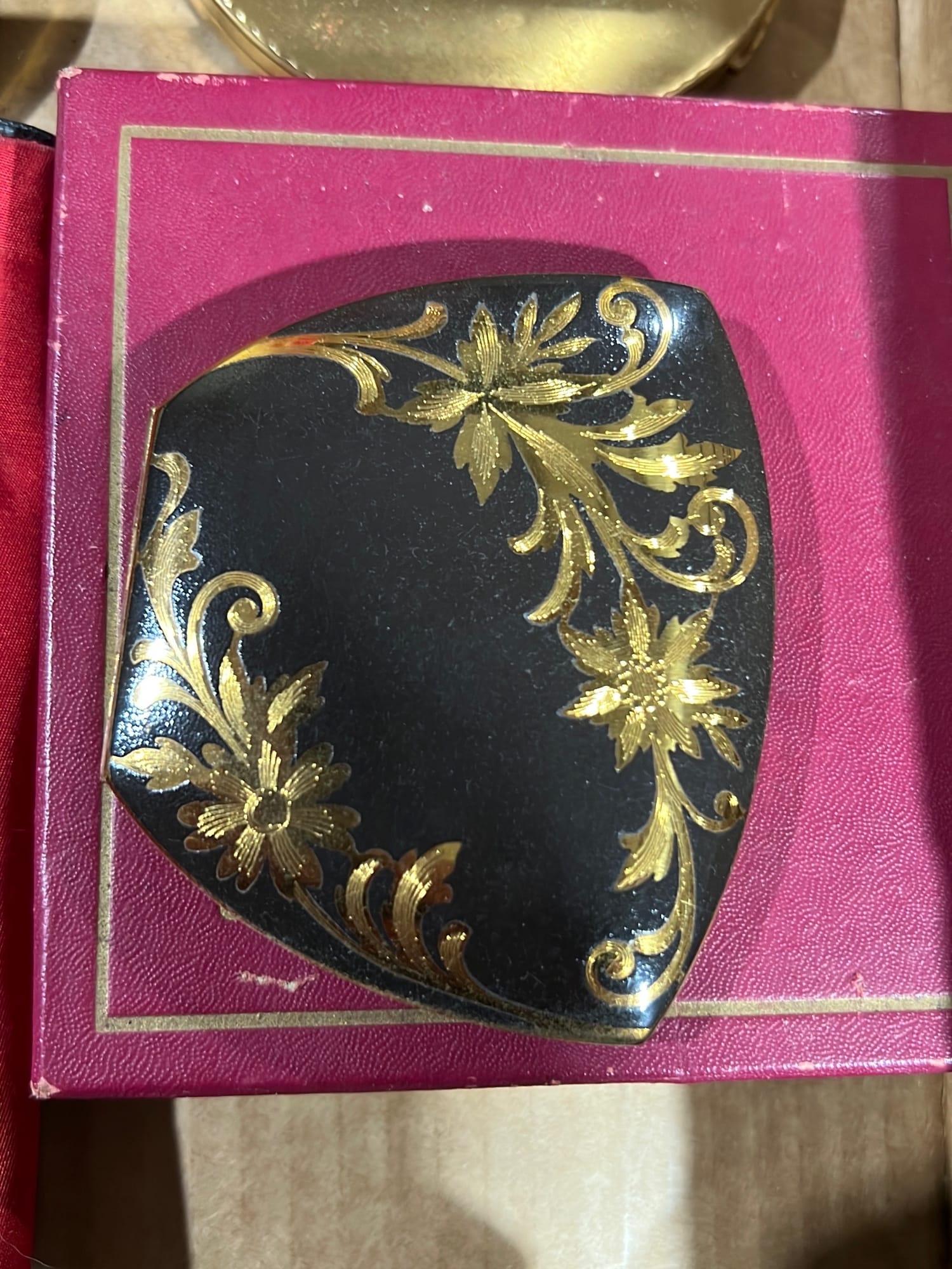 2010 Vintage metal music box ,5.5”, Avon porcelain covered music box , vintage powder jar , clear and ruby glass covered dish , frosted glass rabbit candle holder ,miscellaneous