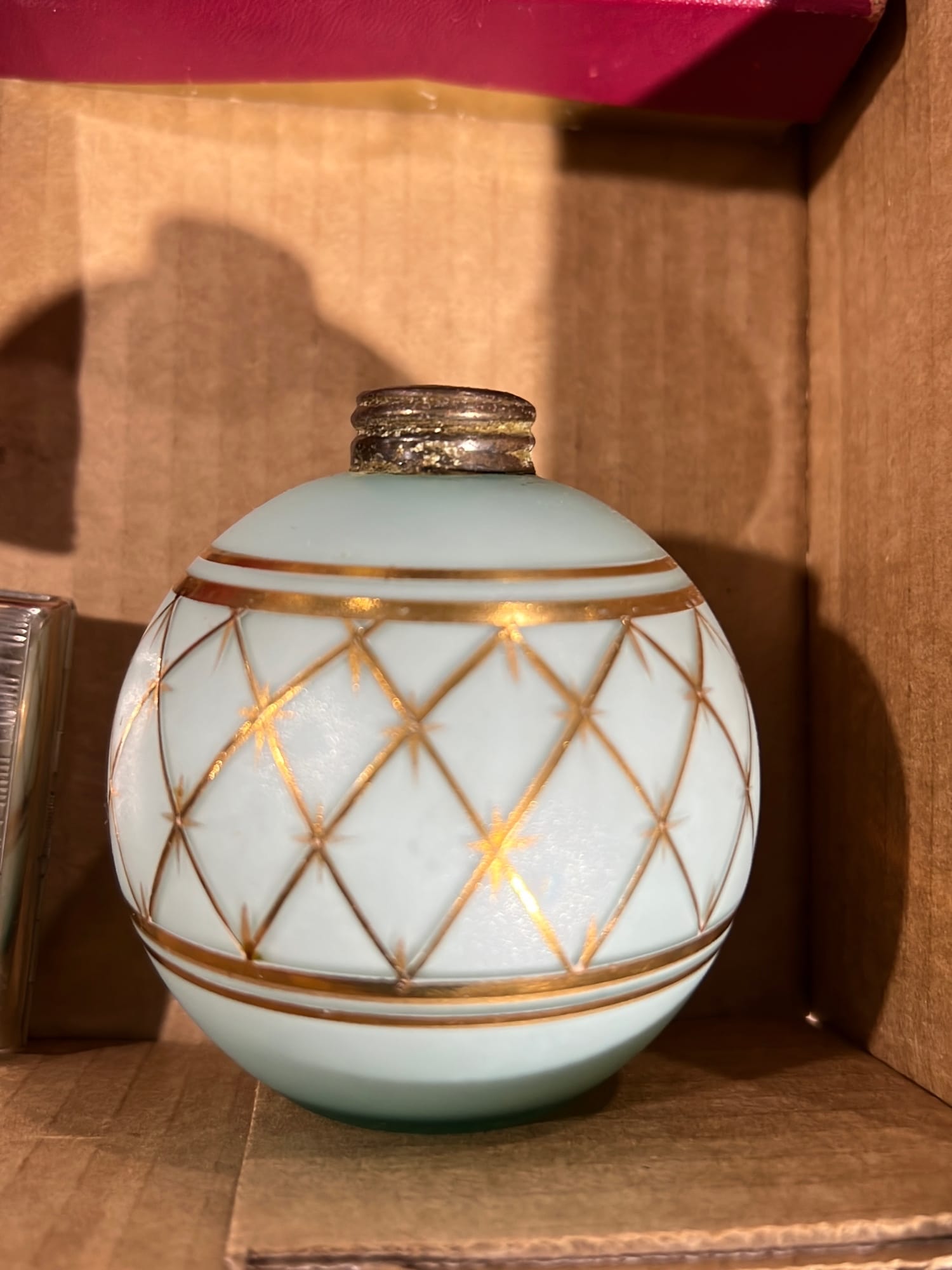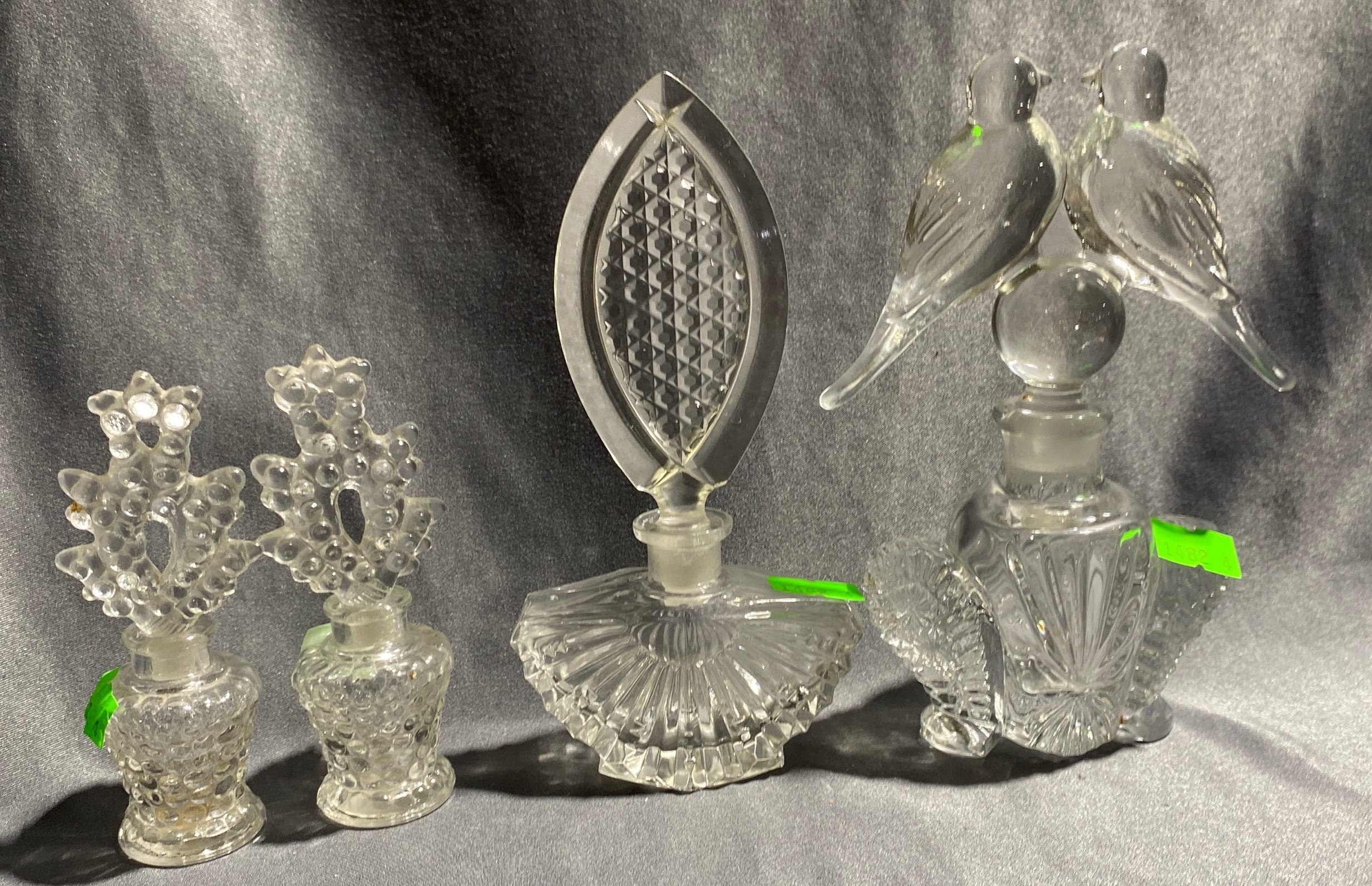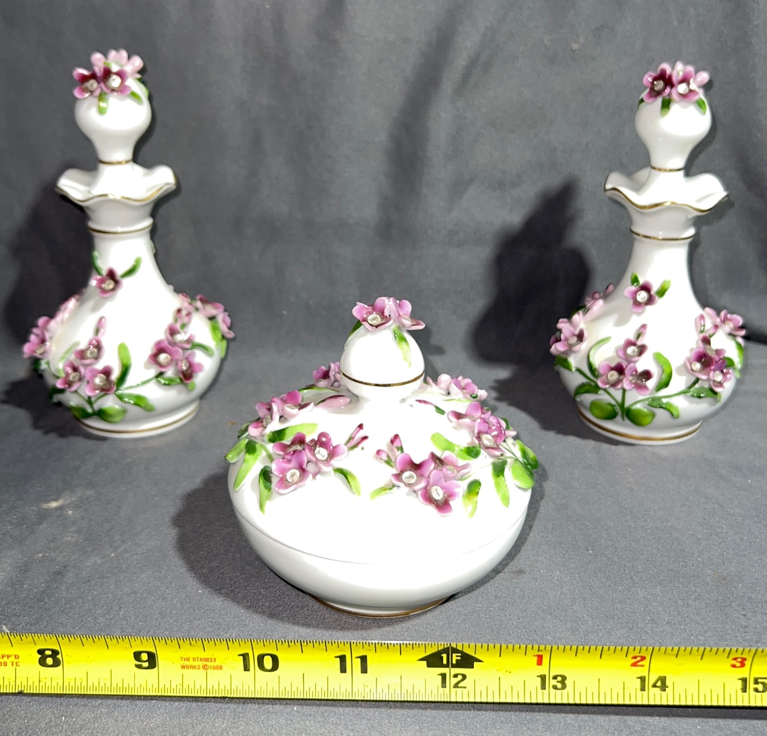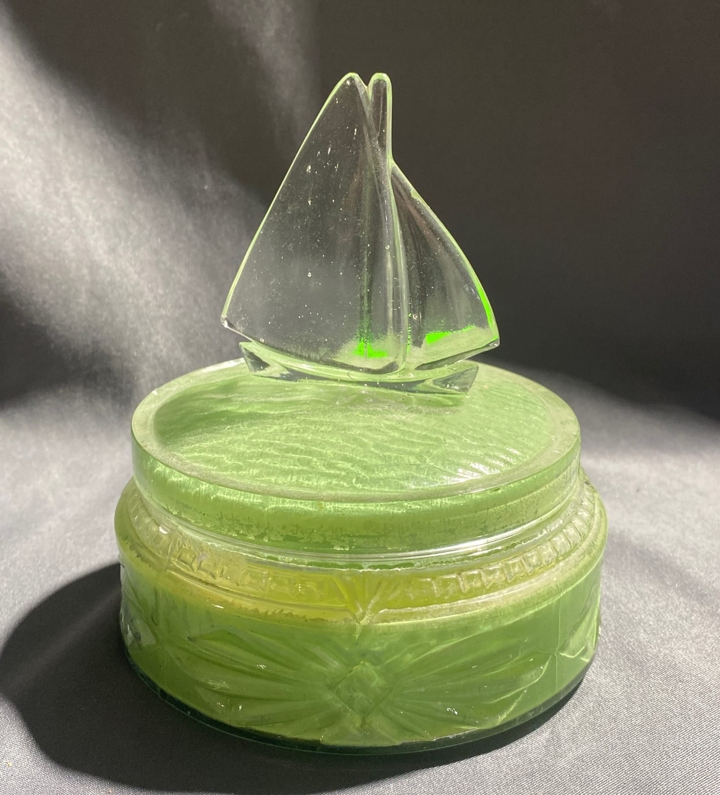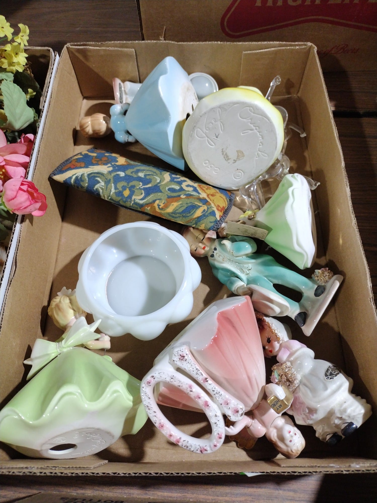 2010 Vintage metal music box ,5.5”, Avon porcelain covered music box , vintage powder jar , clear and ruby glass covered dish , frosted glass rabbit candle holder ,miscellaneous