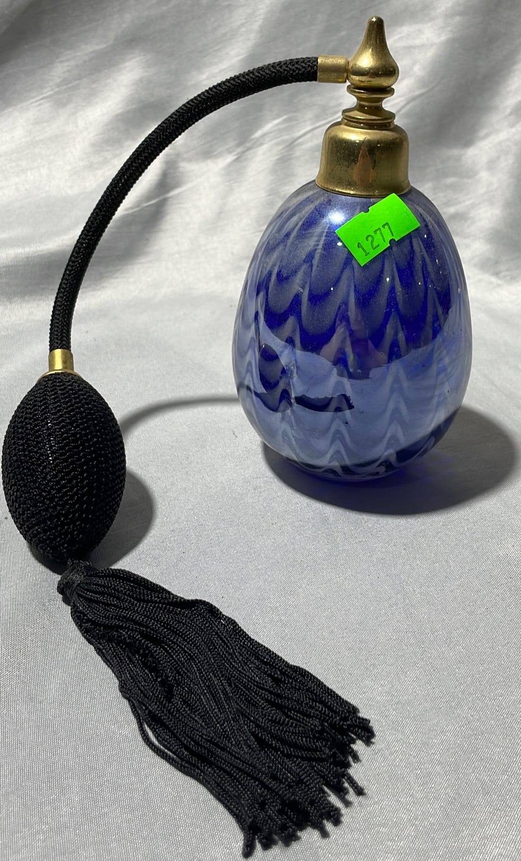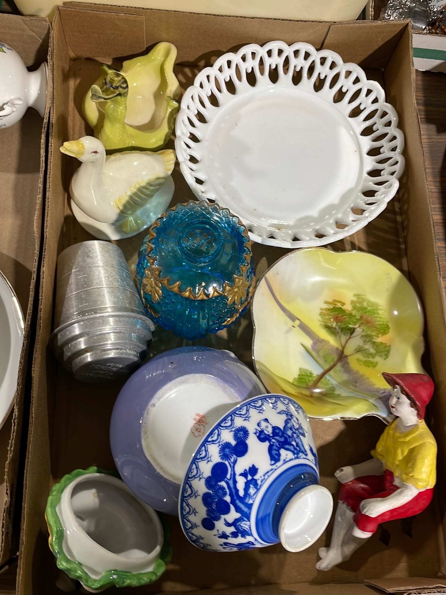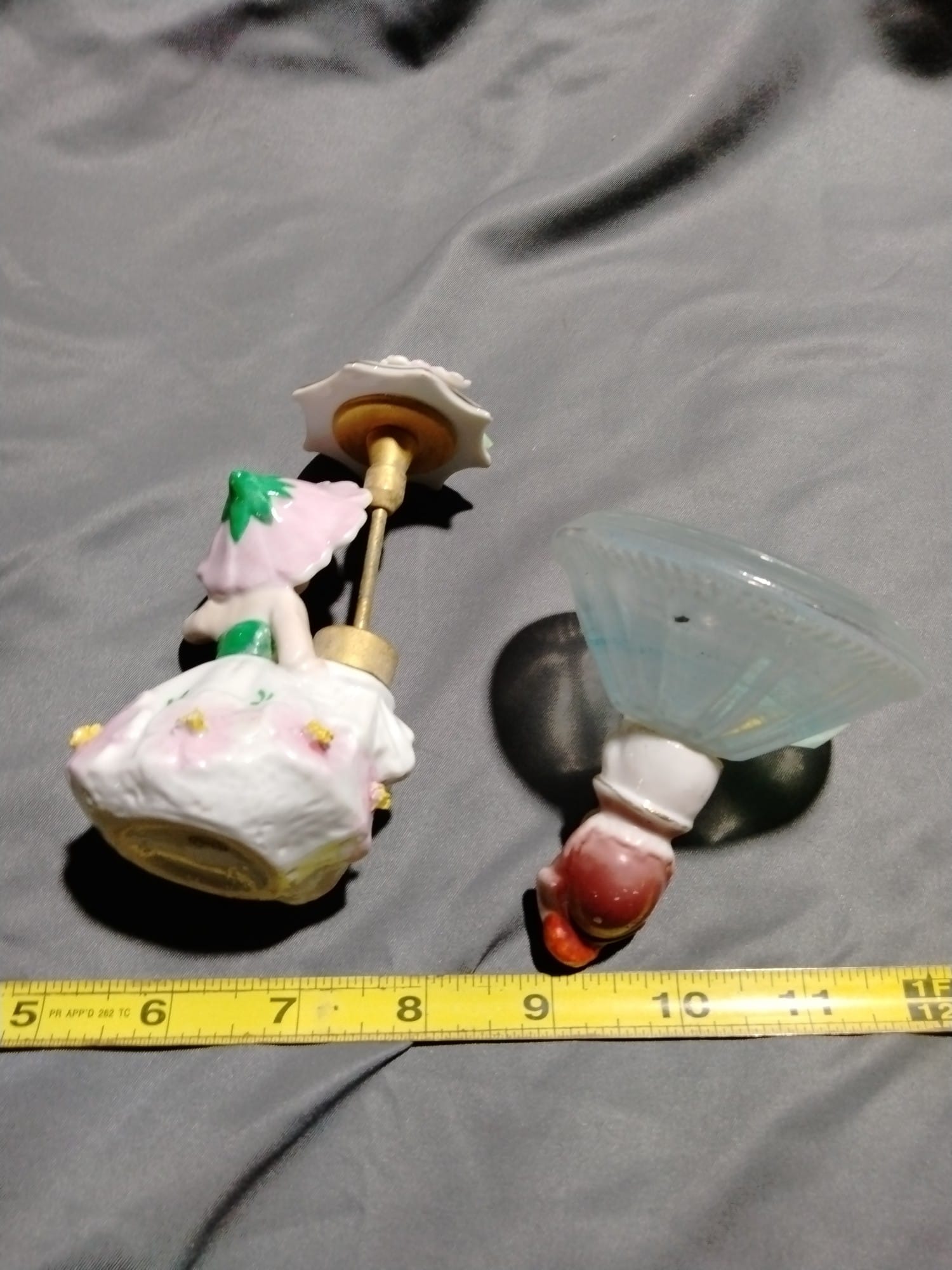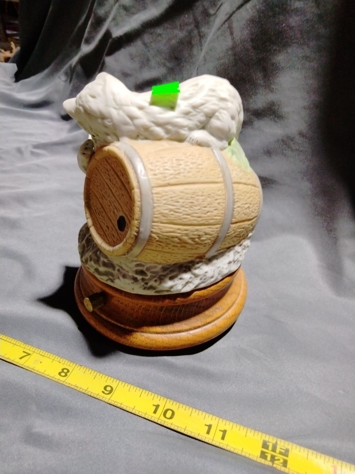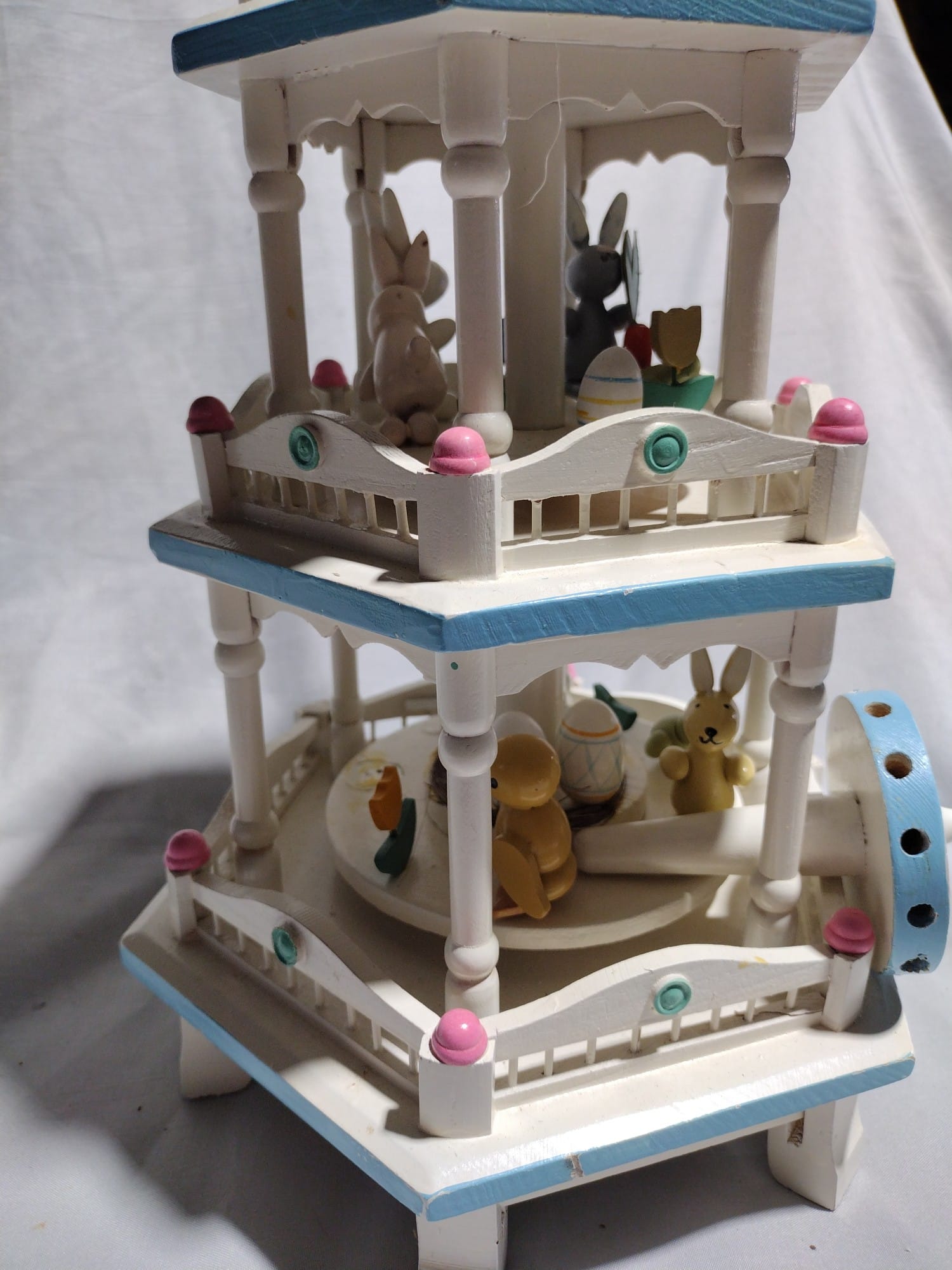 2010 Vintage metal music box ,5.5”, Avon porcelain covered music box , vintage powder jar , clear and ruby glass covered dish , frosted glass rabbit candle holder ,miscellaneous