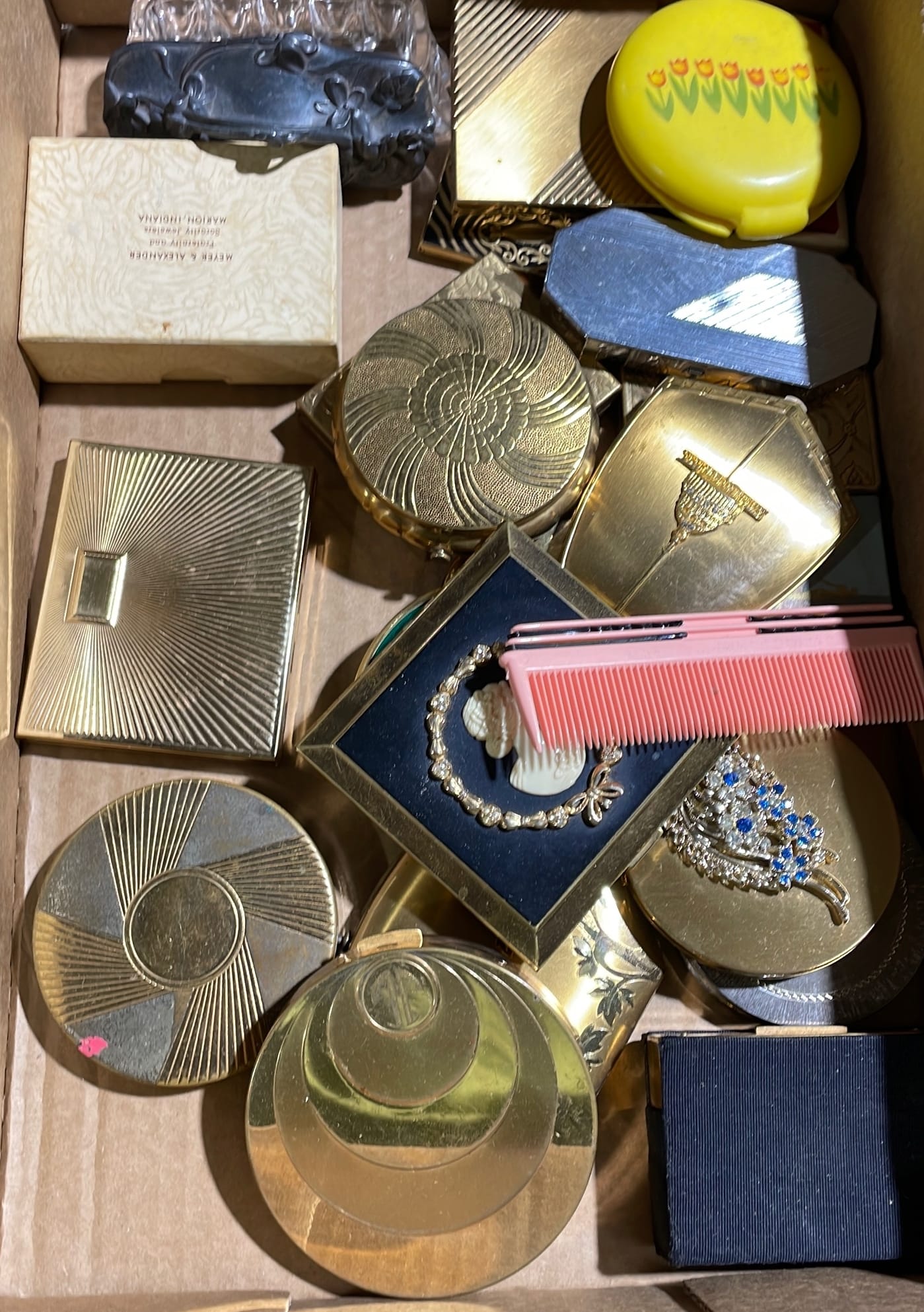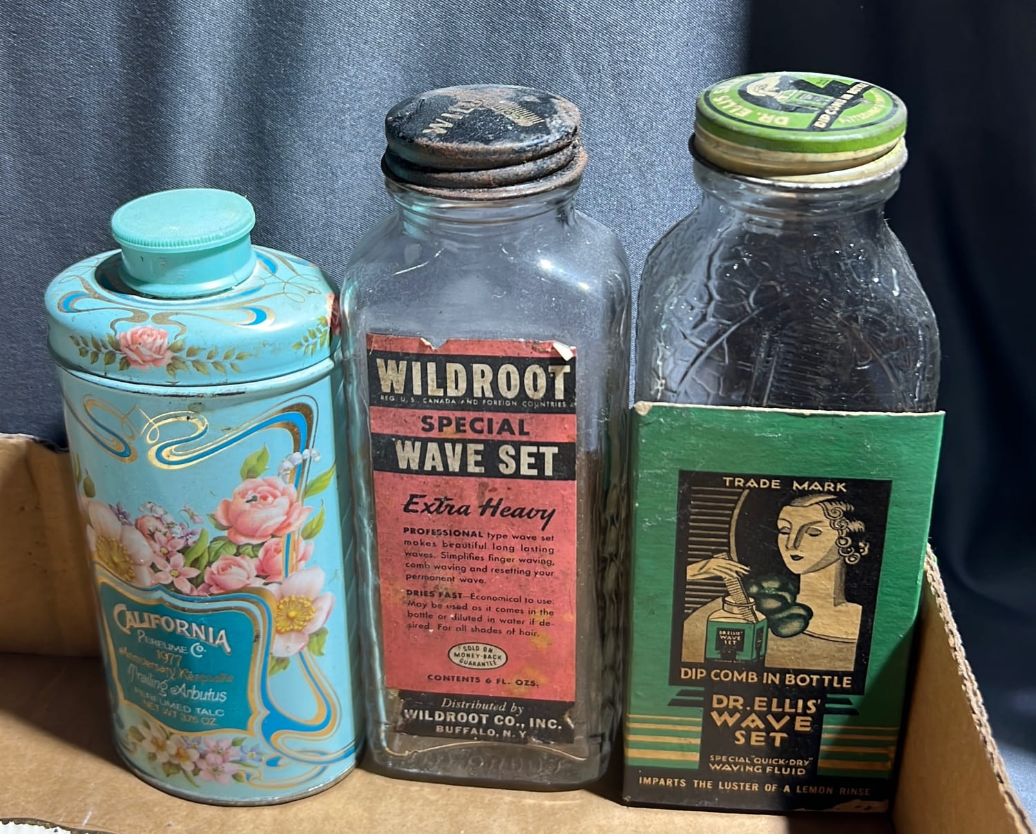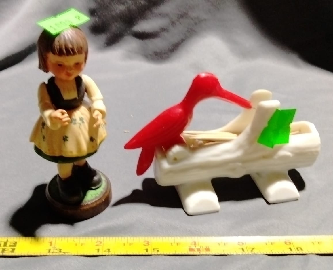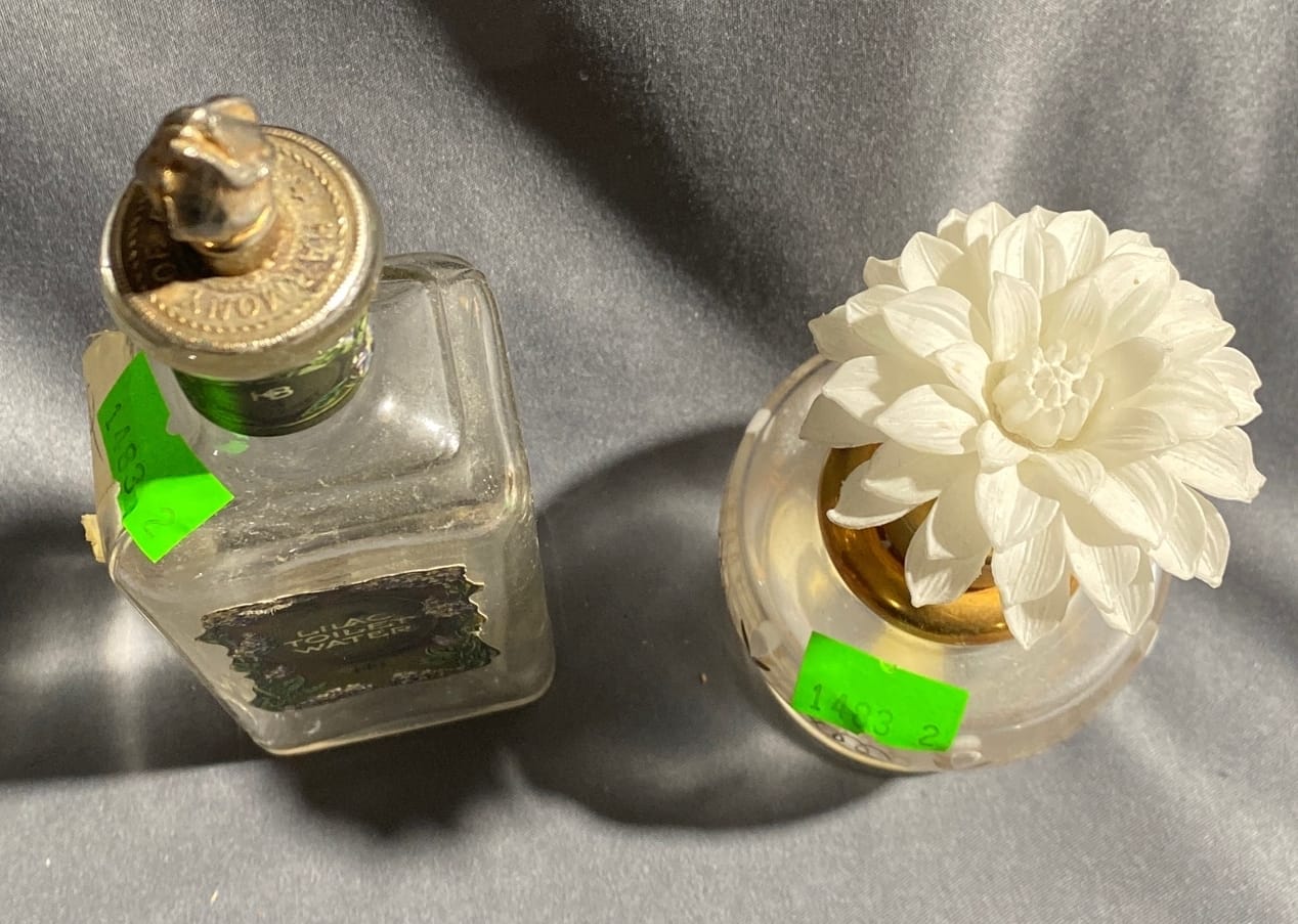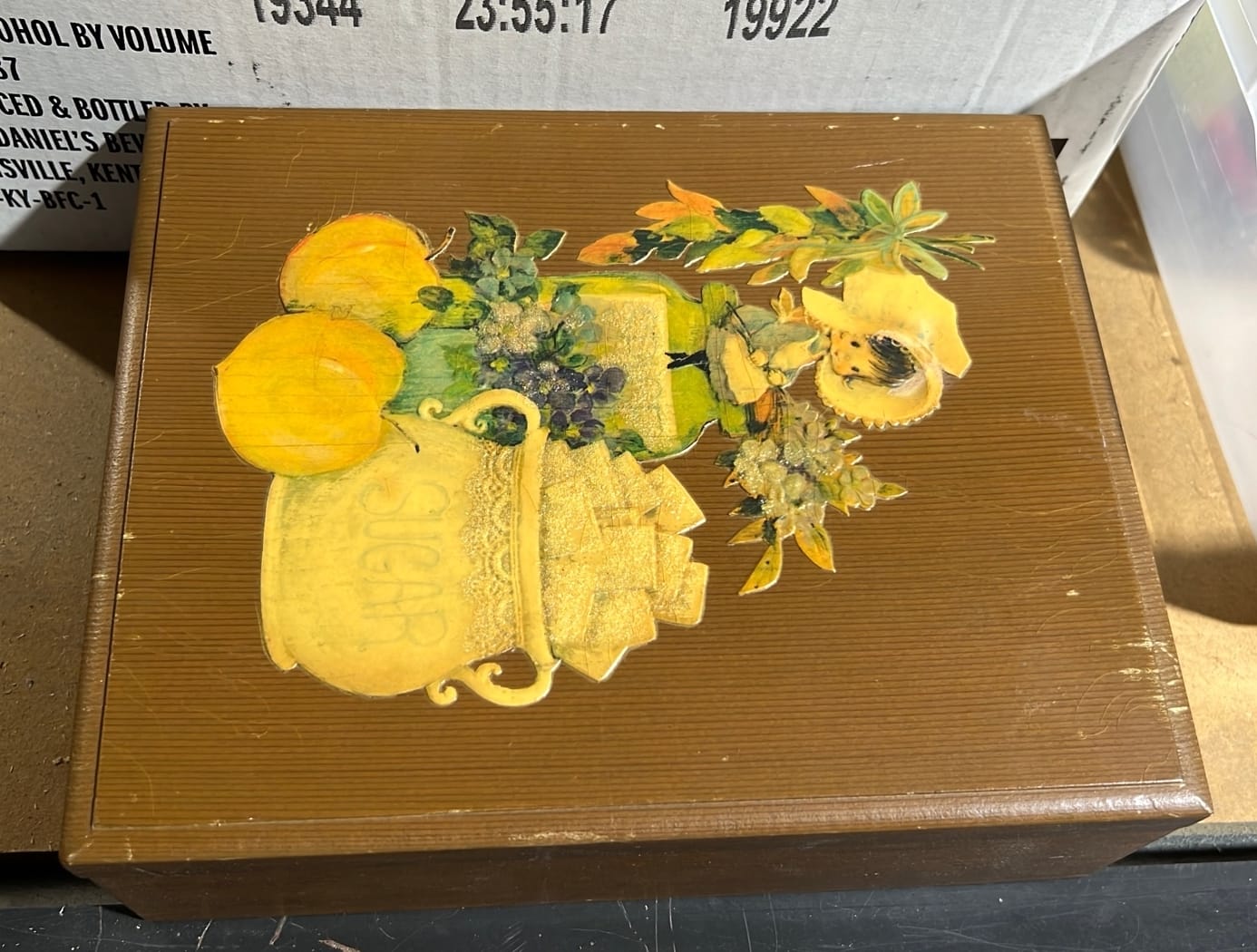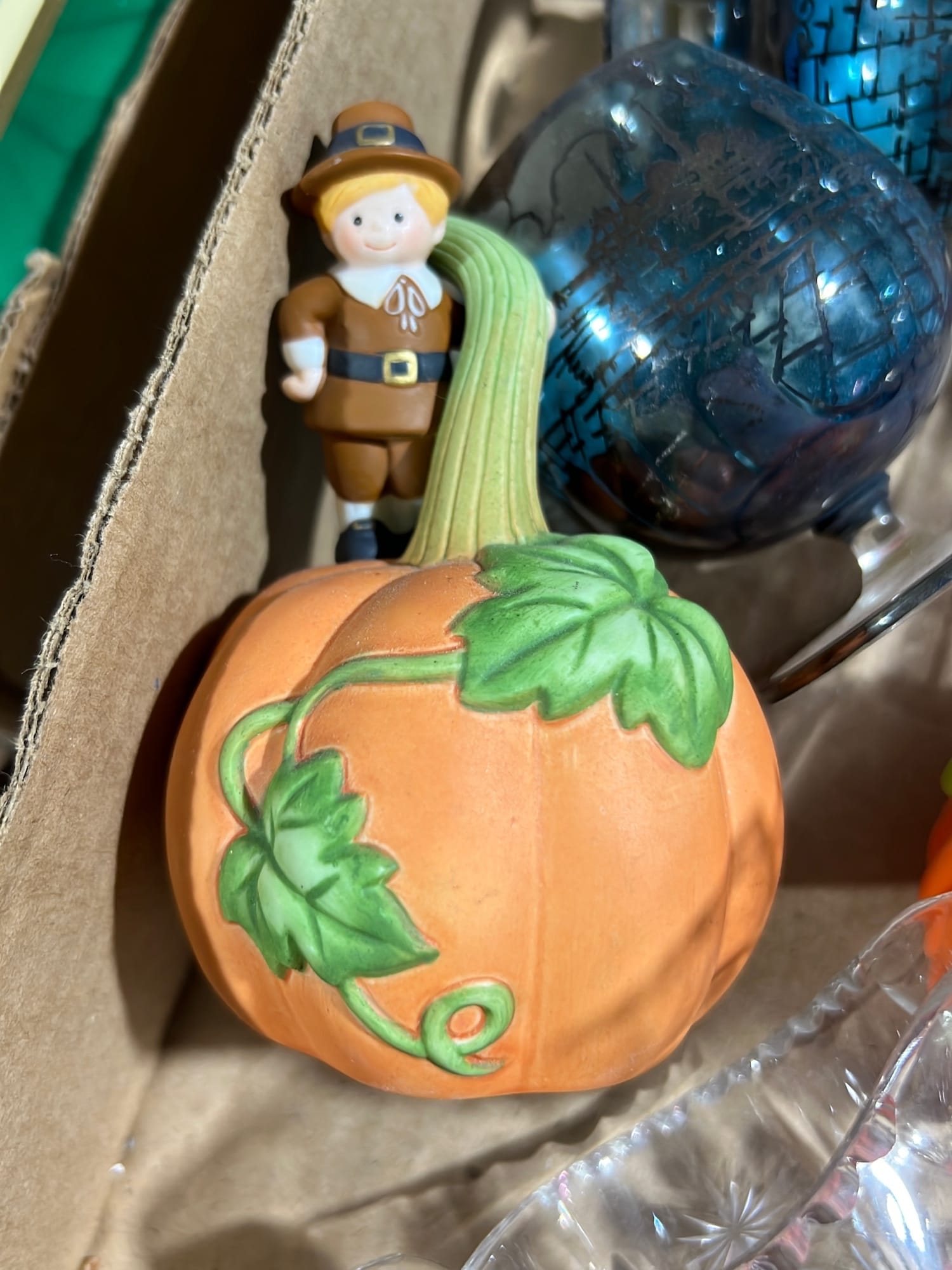 2010 Vintage metal music box ,5.5”, Avon porcelain covered music box , vintage powder jar , clear and ruby glass covered dish , frosted glass rabbit candle holder ,miscellaneous