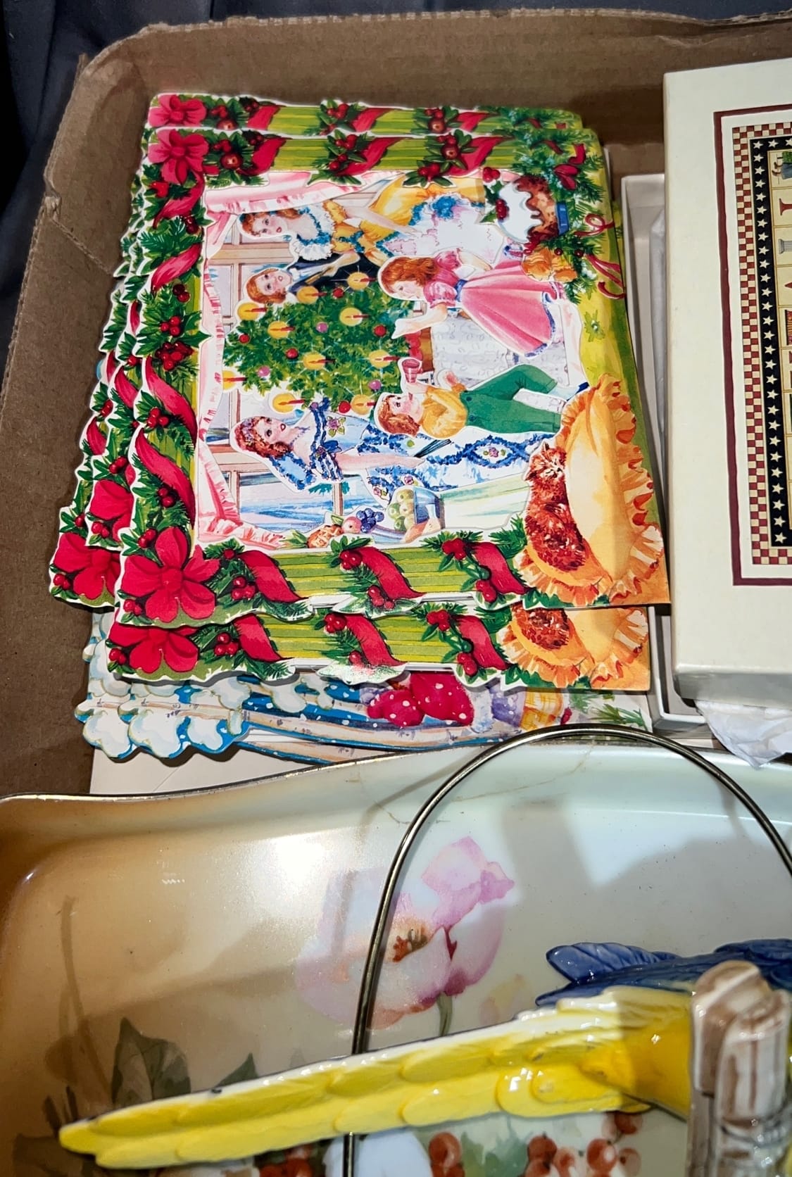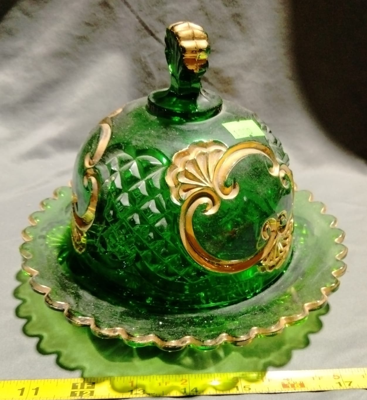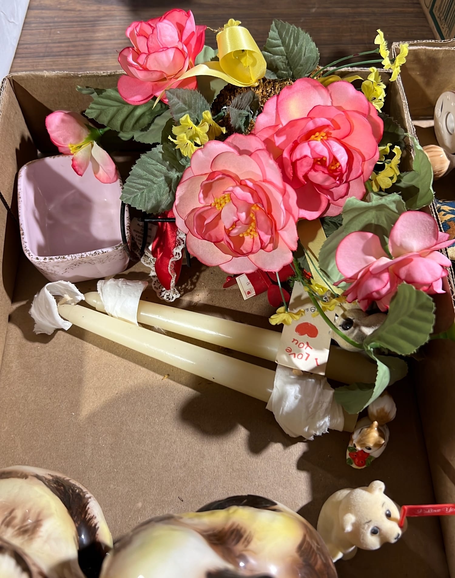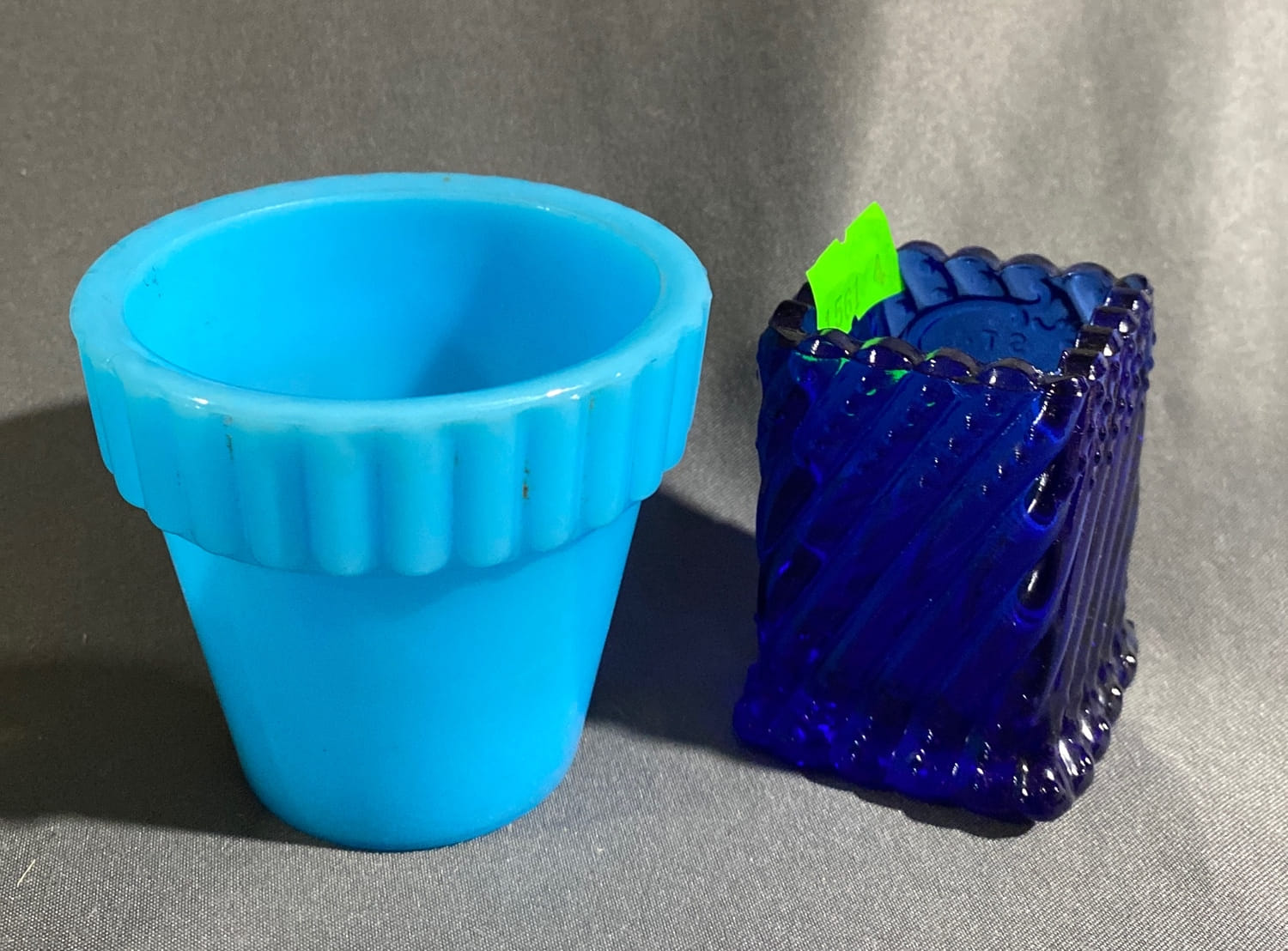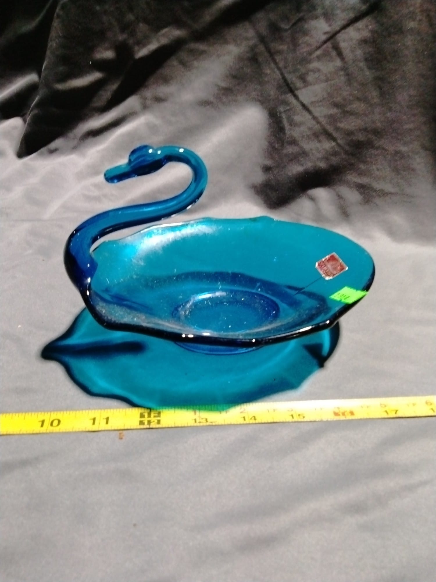 2010 Vintage metal music box ,5.5”, Avon porcelain covered music box , vintage powder jar , clear and ruby glass covered dish , frosted glass rabbit candle holder ,miscellaneous