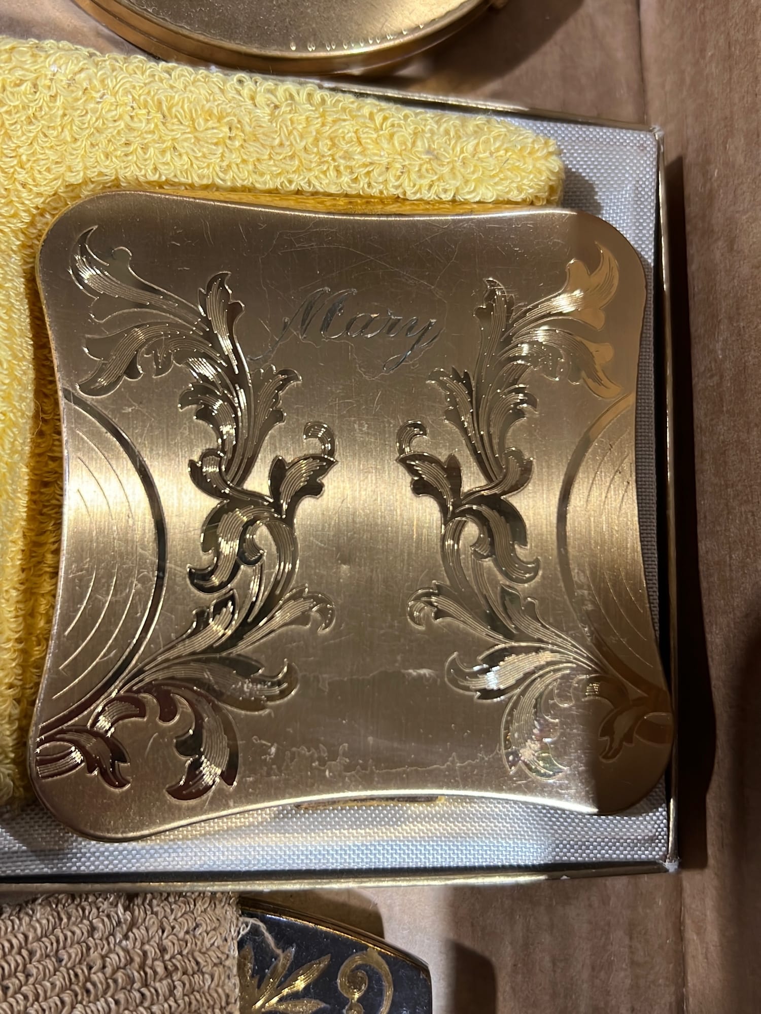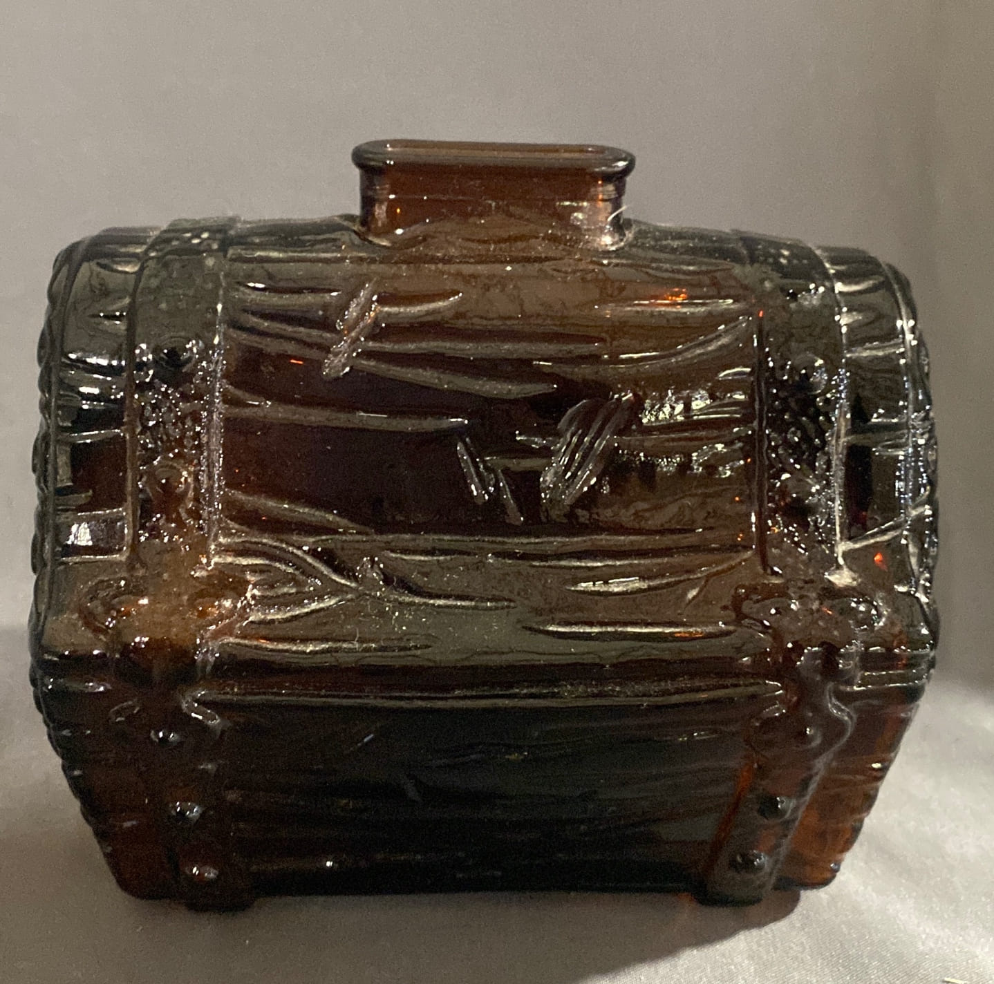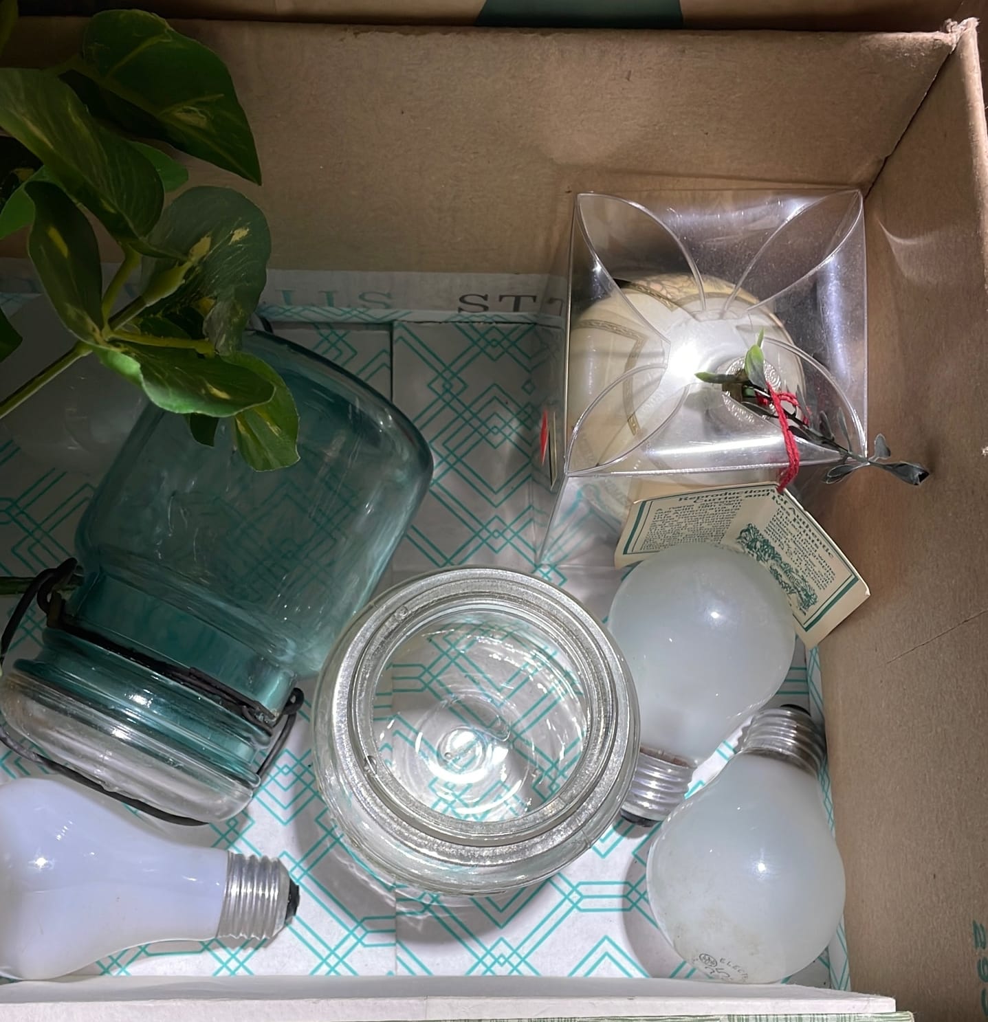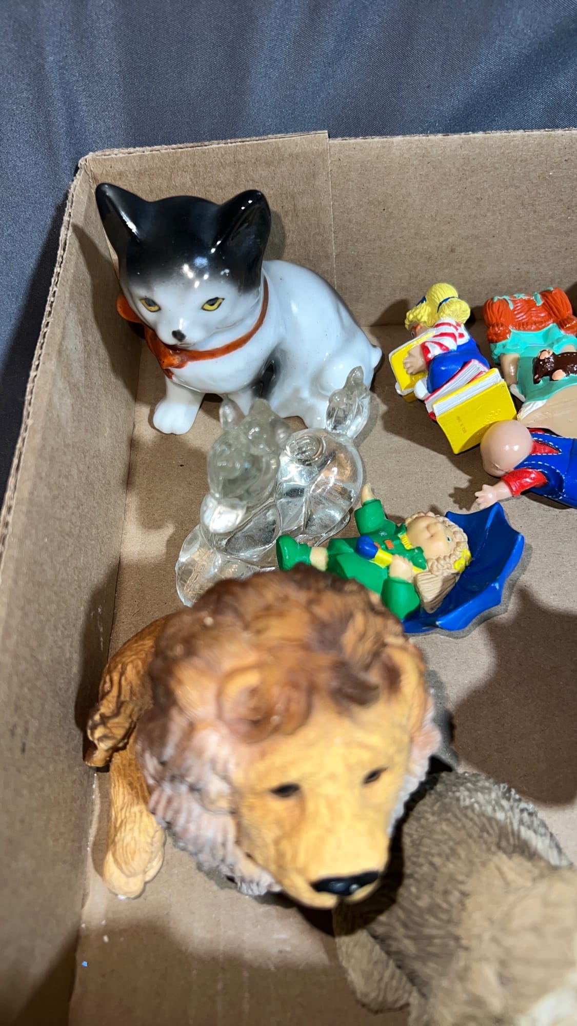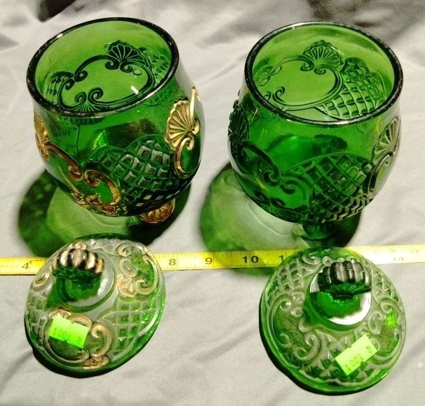 2010 Vintage metal music box ,5.5”, Avon porcelain covered music box , vintage powder jar , clear and ruby glass covered dish , frosted glass rabbit candle holder ,miscellaneous