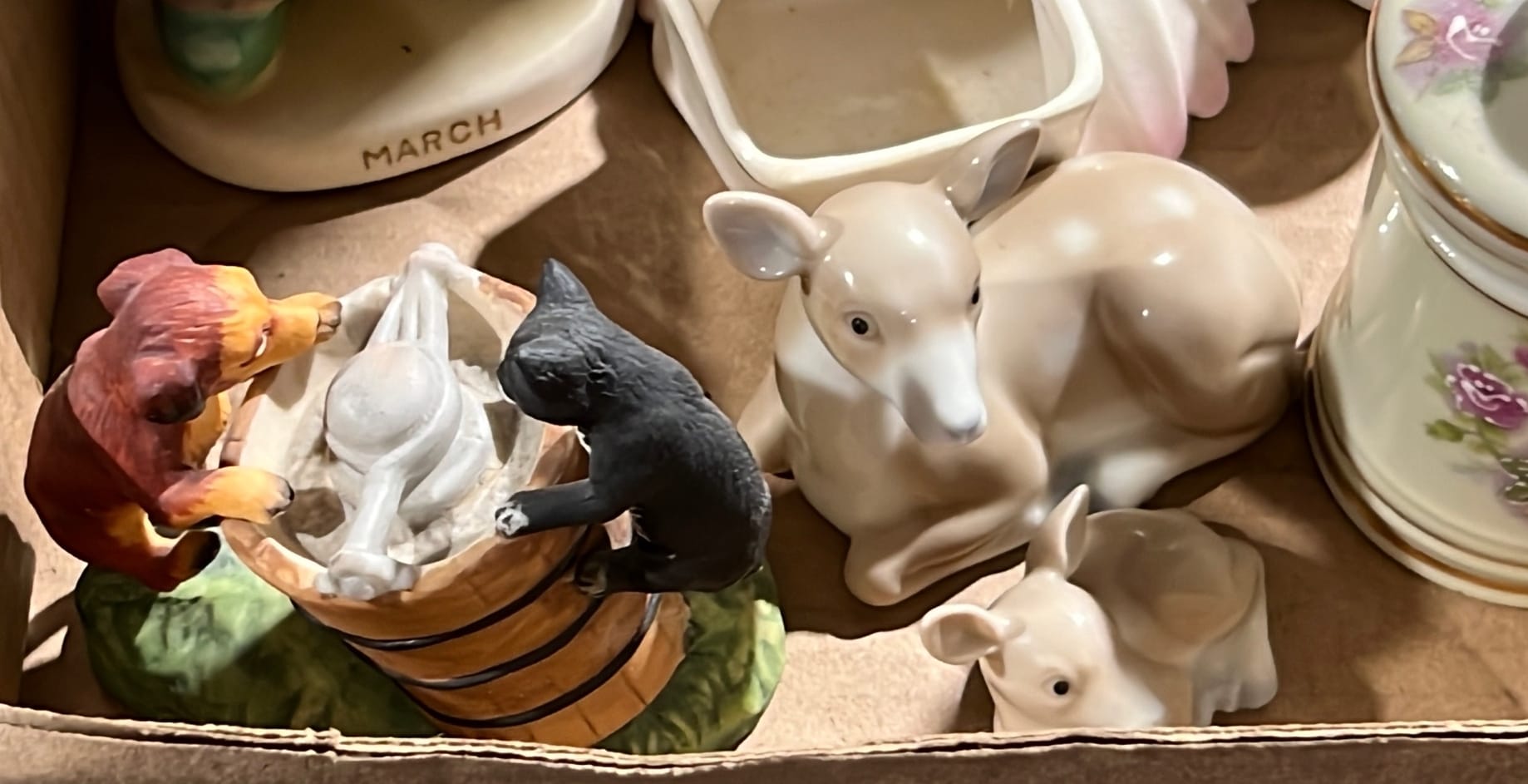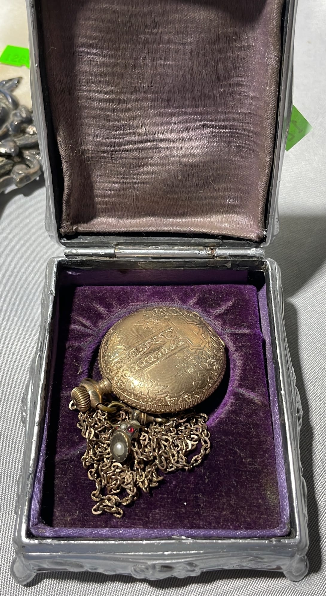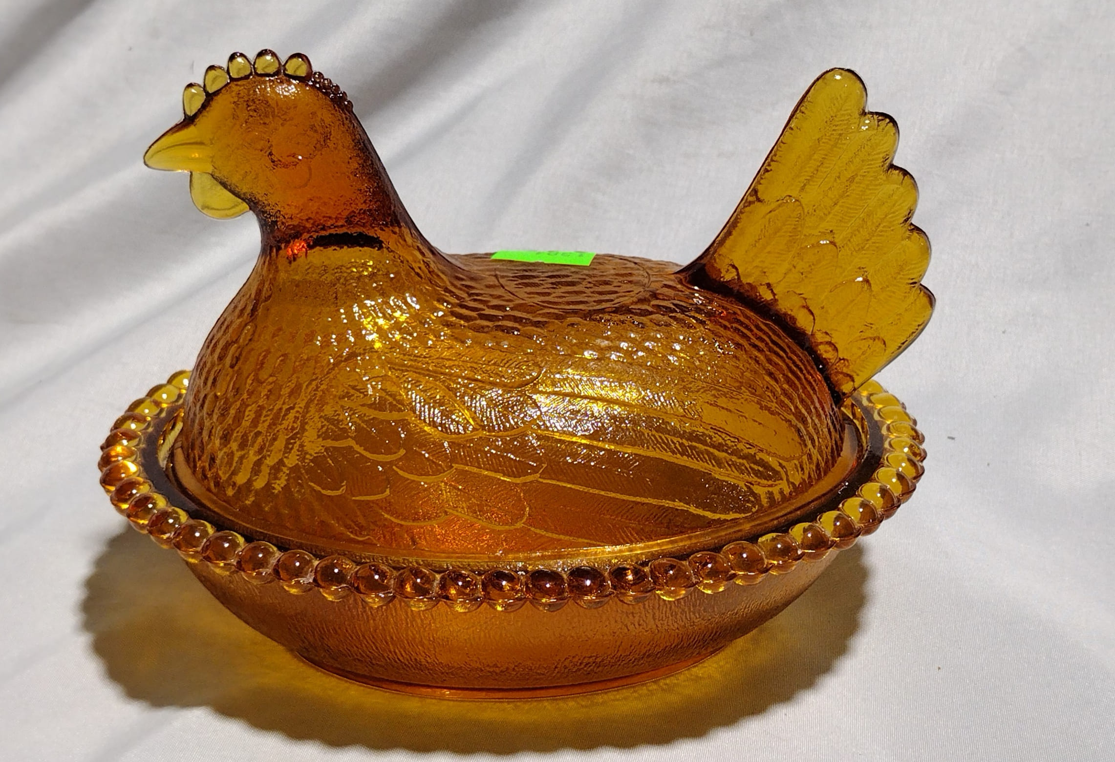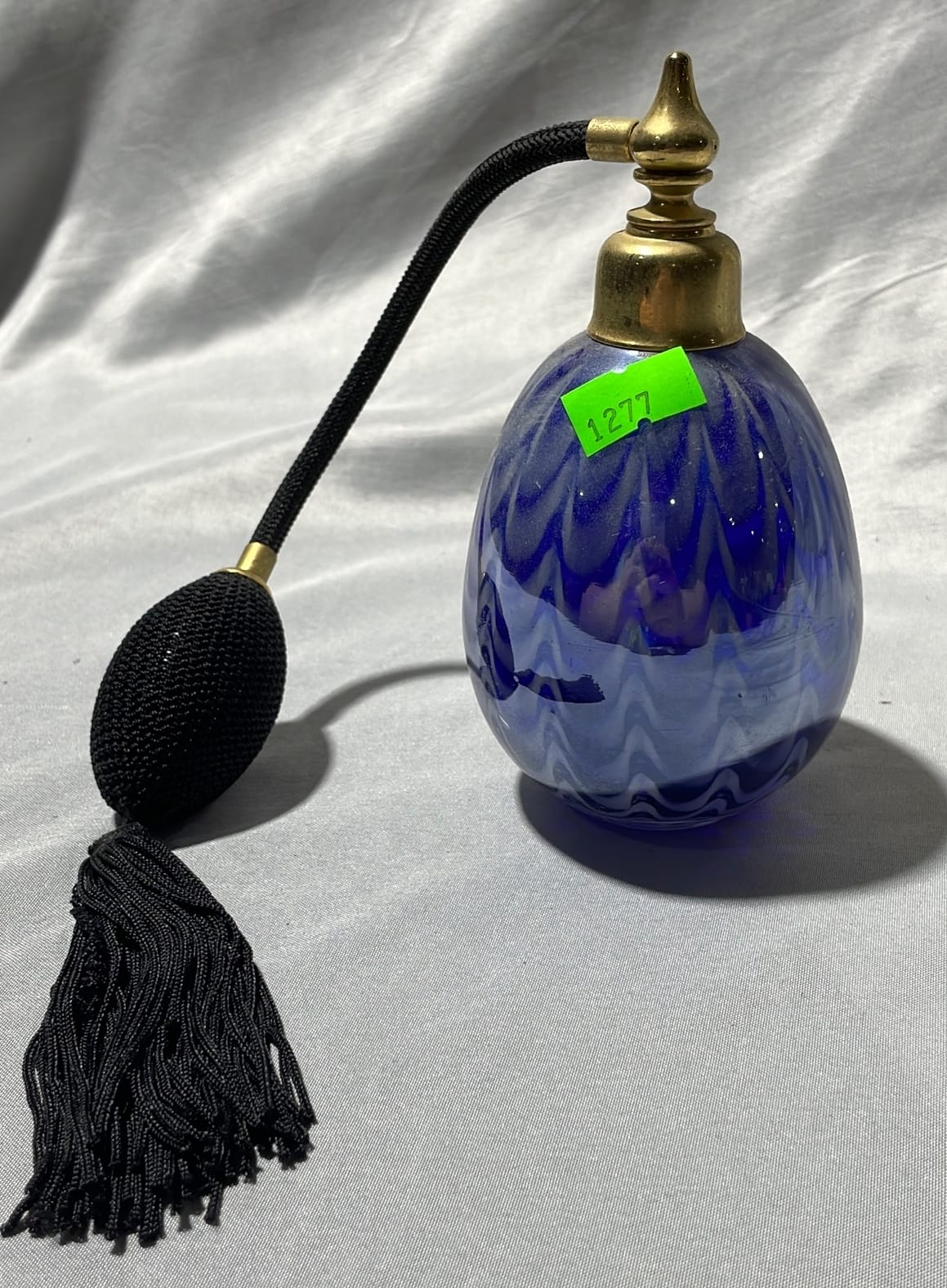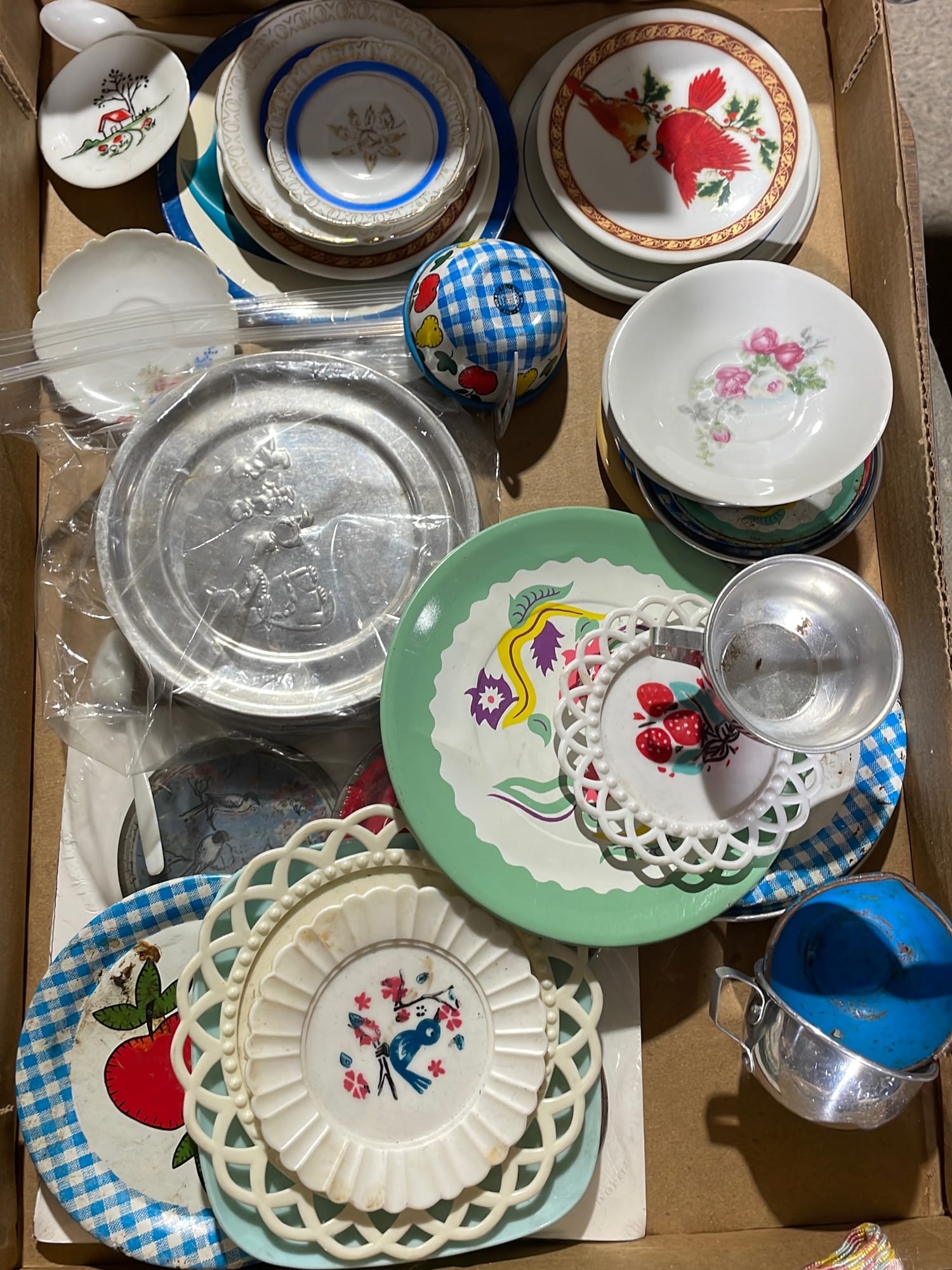 2010 Vintage metal music box ,5.5”, Avon porcelain covered music box , vintage powder jar , clear and ruby glass covered dish , frosted glass rabbit candle holder ,miscellaneous