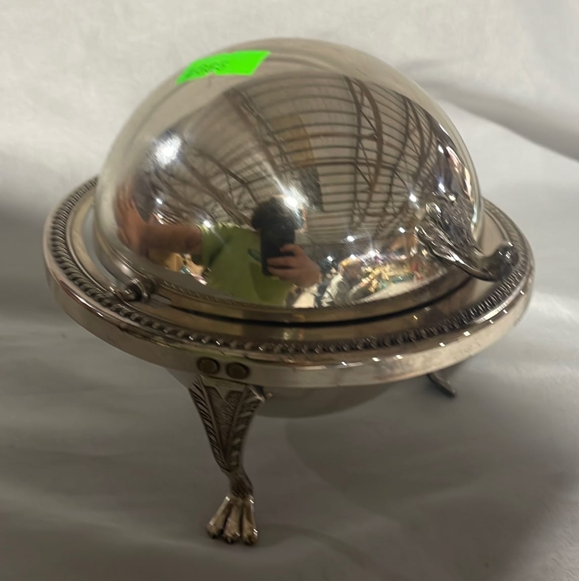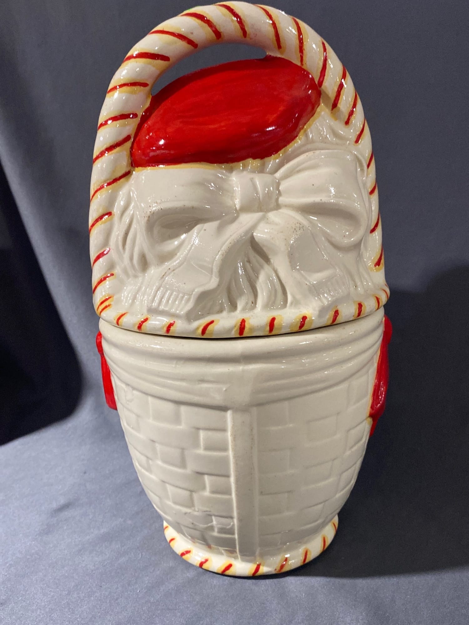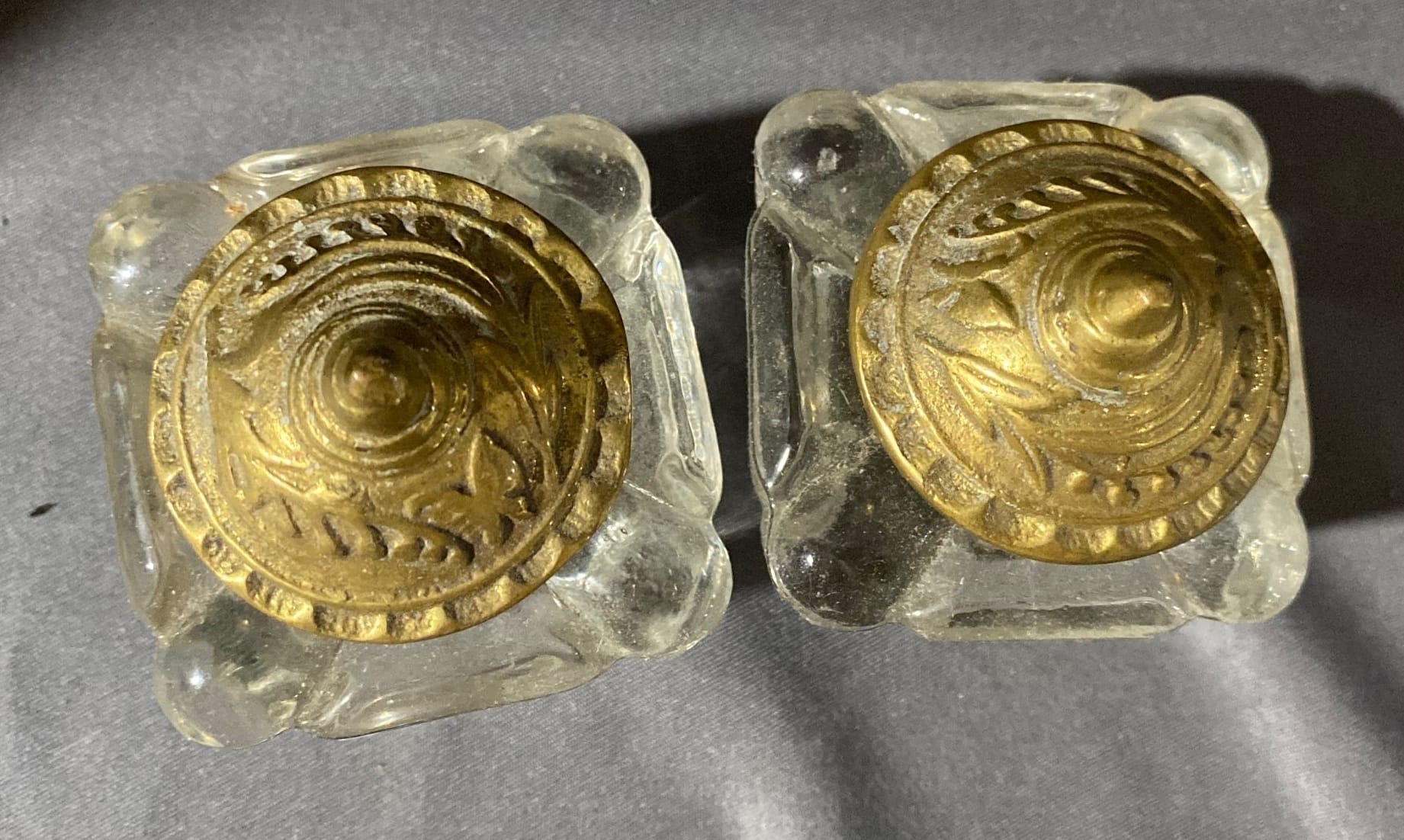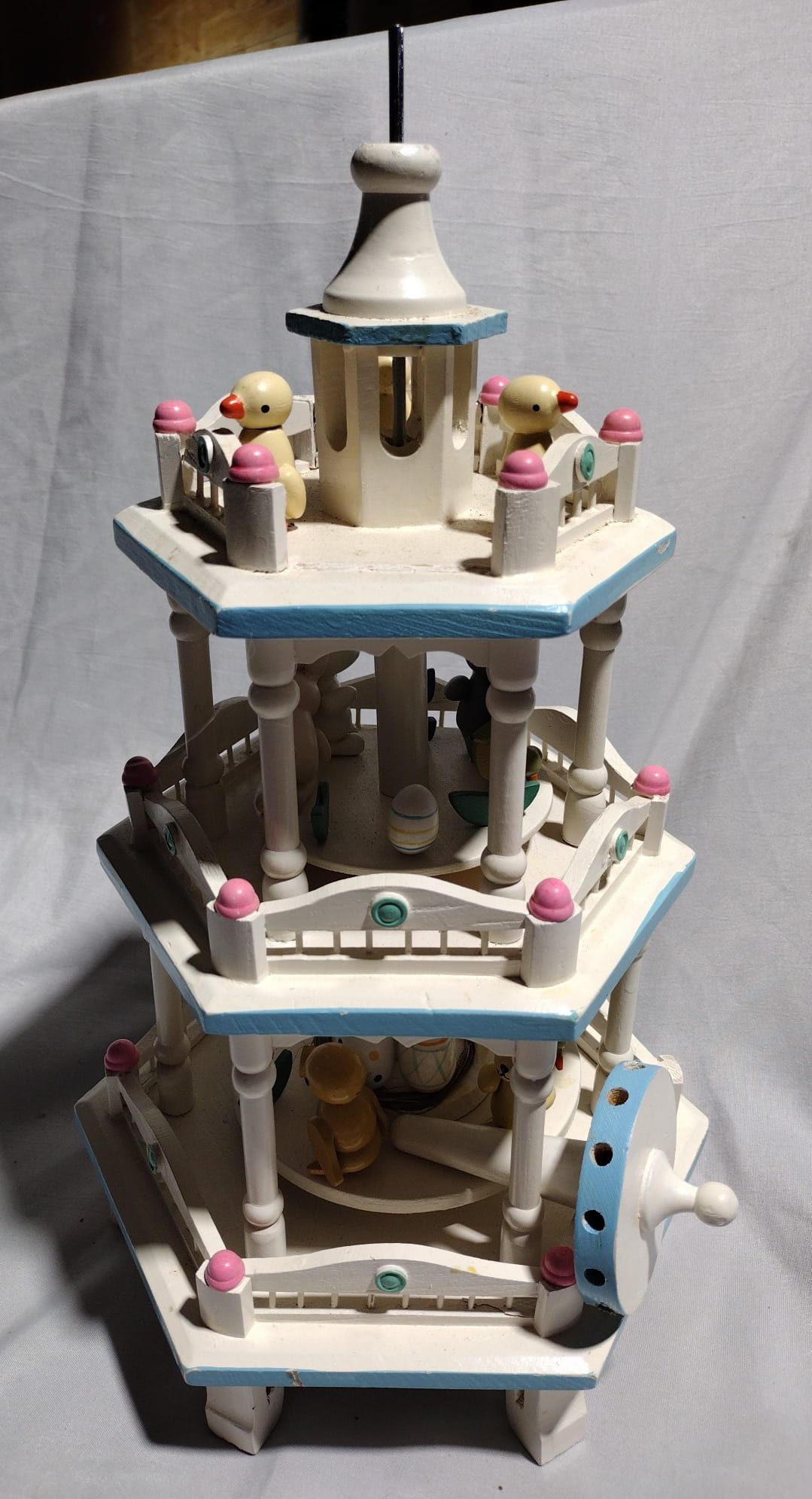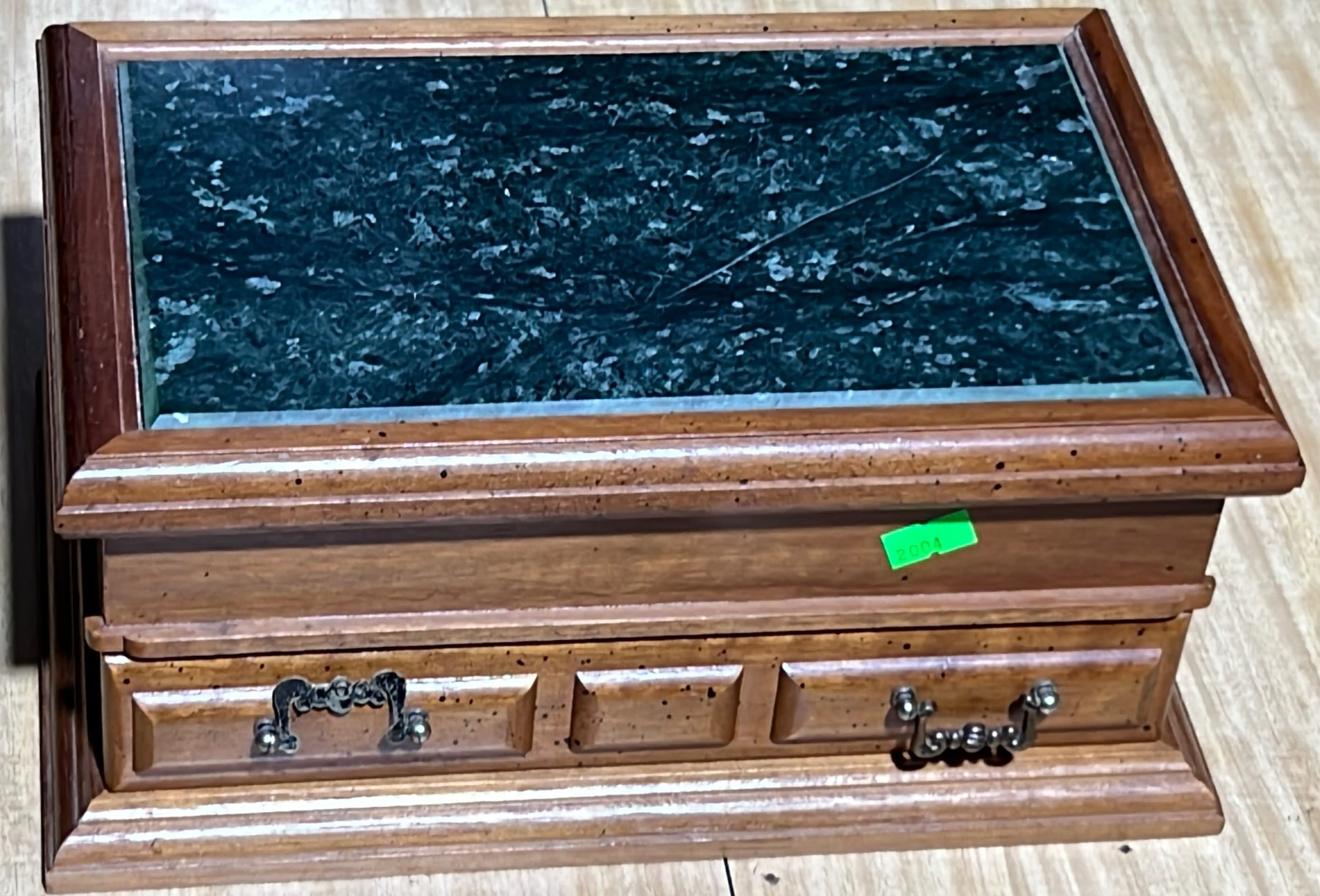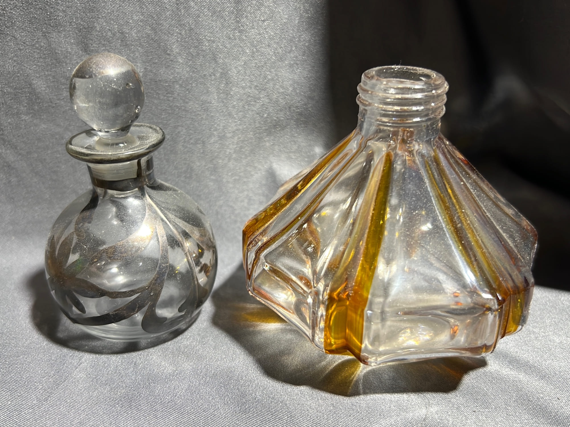 2010 Vintage metal music box ,5.5”, Avon porcelain covered music box , vintage powder jar , clear and ruby glass covered dish , frosted glass rabbit candle holder ,miscellaneous