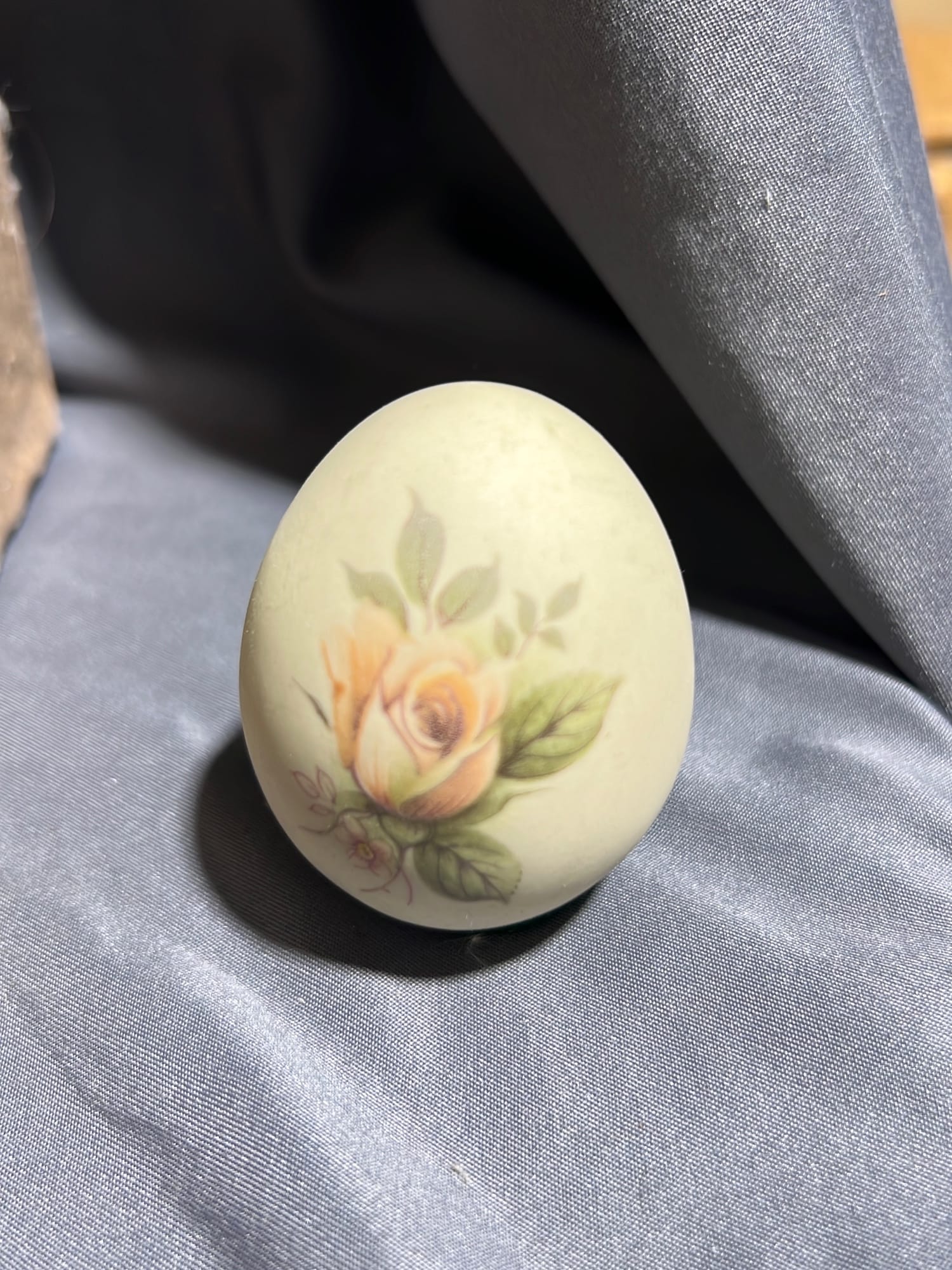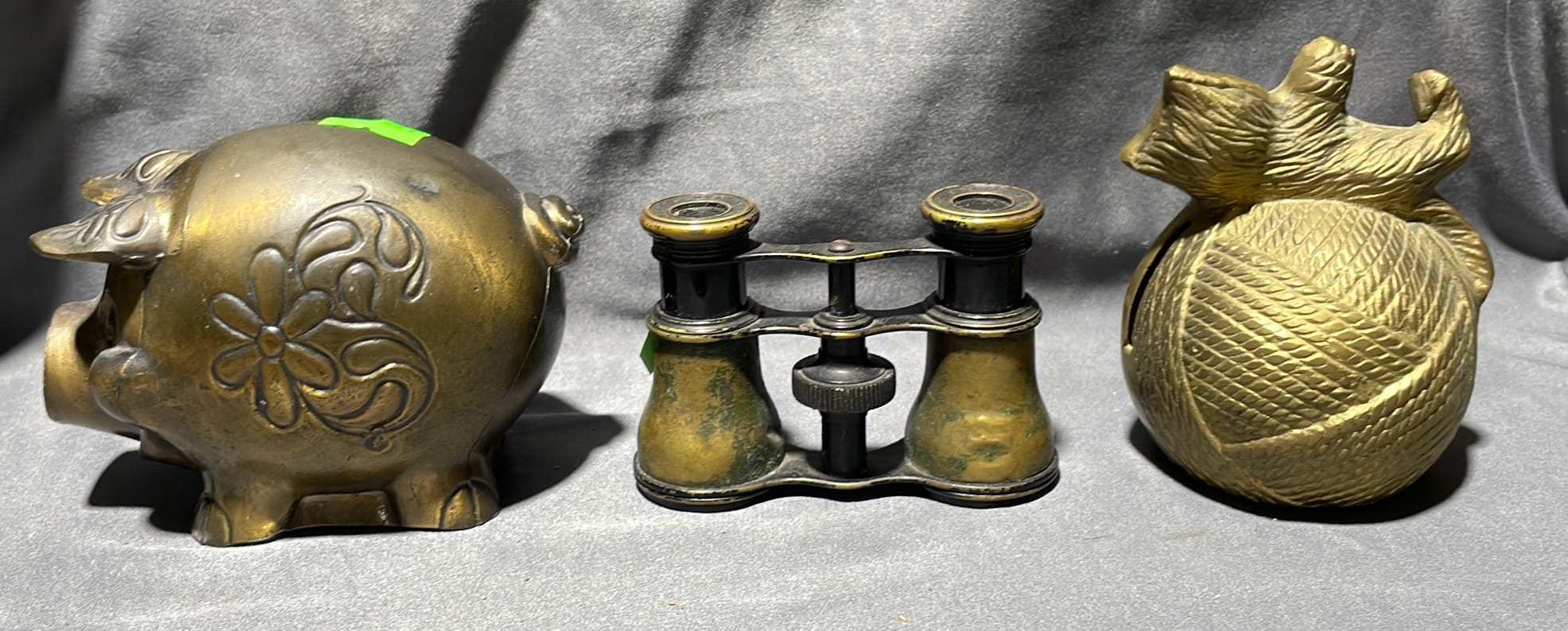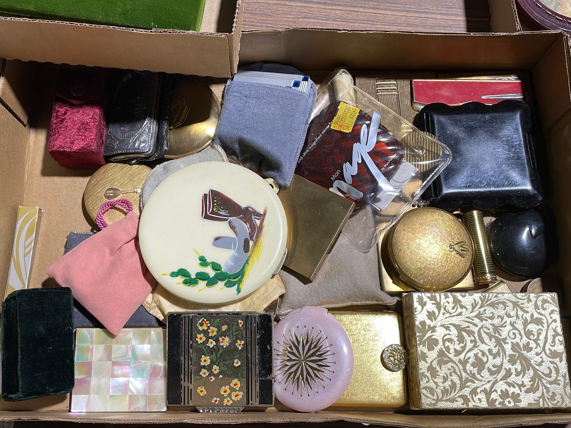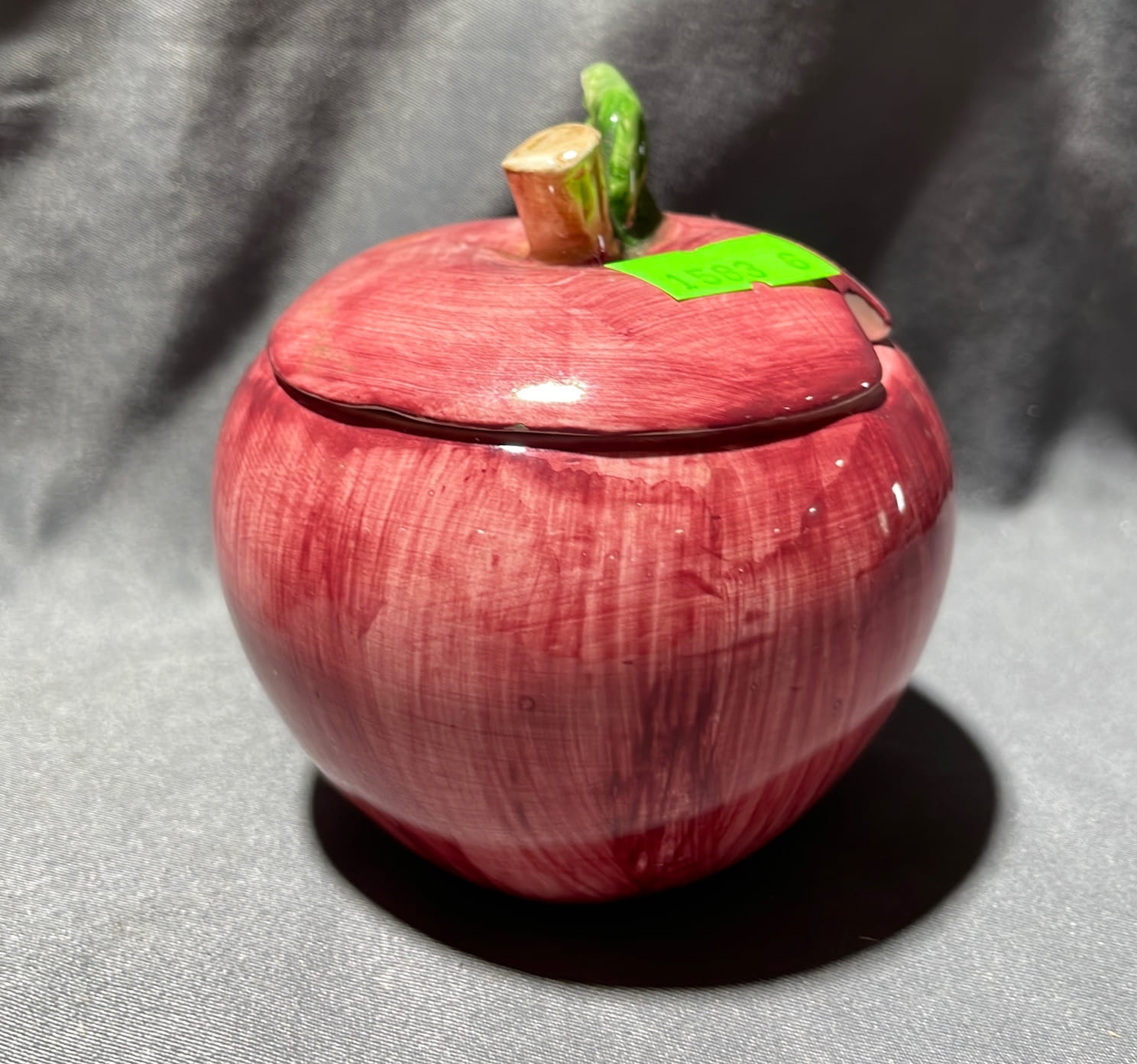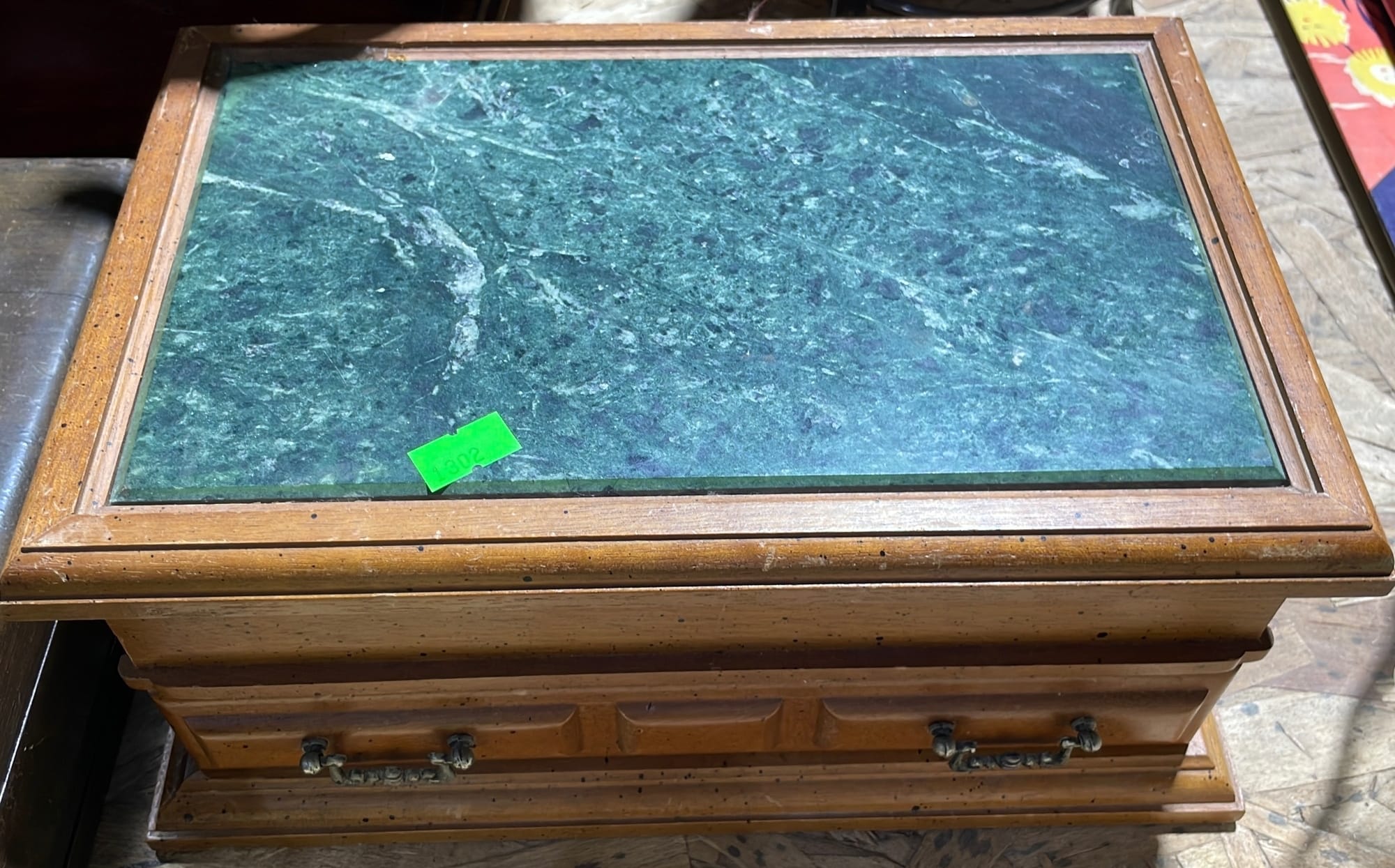 2010 Vintage metal music box ,5.5”, Avon porcelain covered music box , vintage powder jar , clear and ruby glass covered dish , frosted glass rabbit candle holder ,miscellaneous