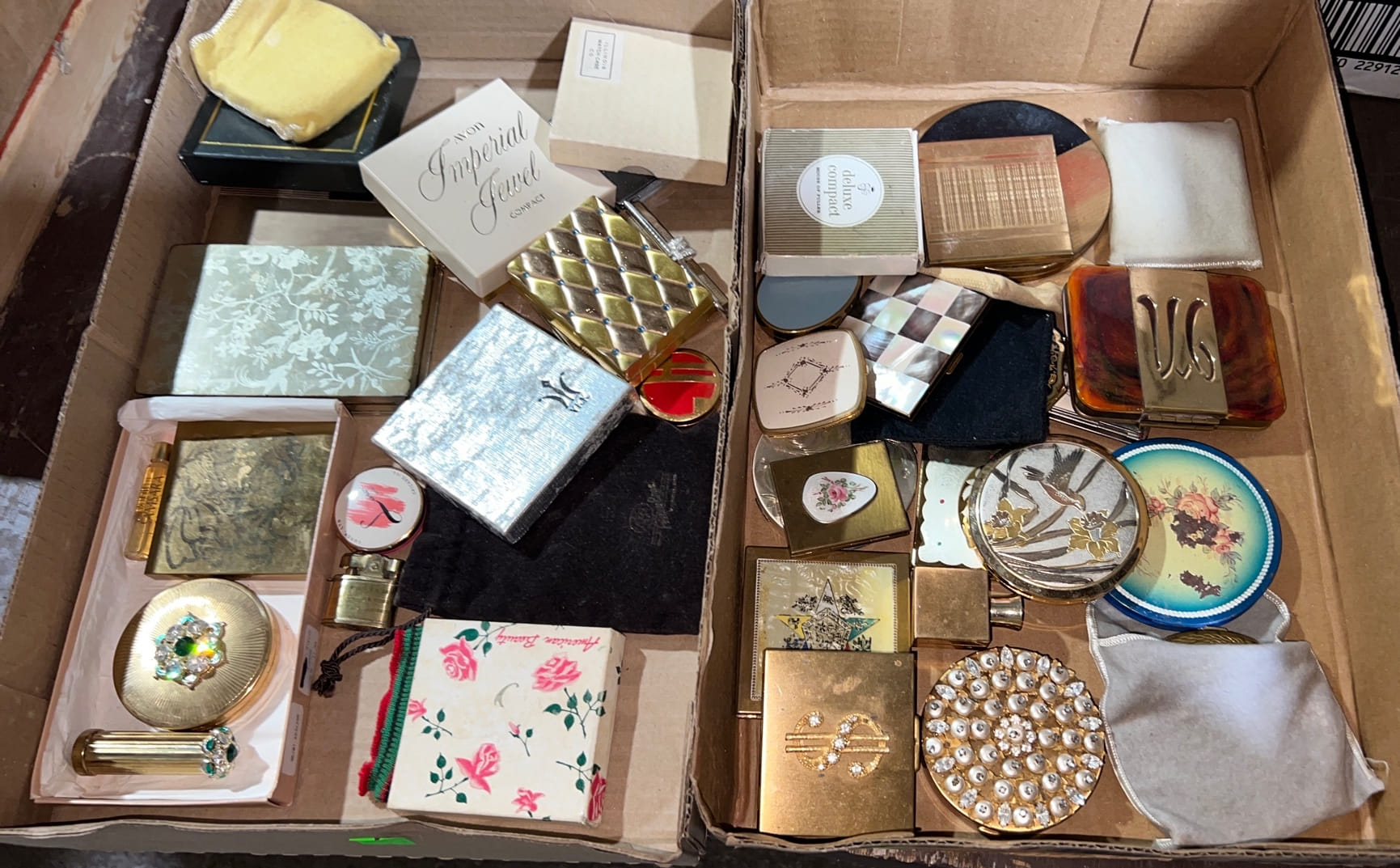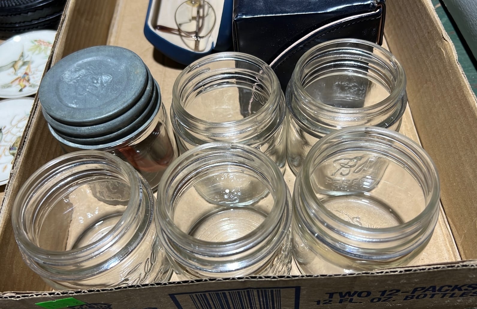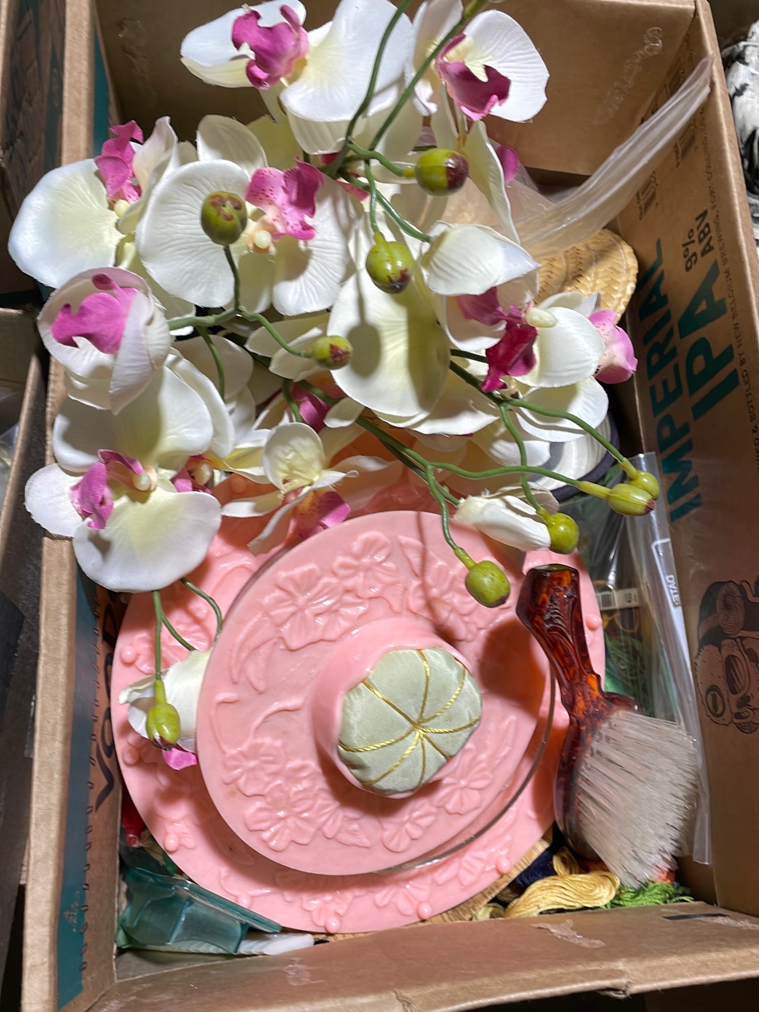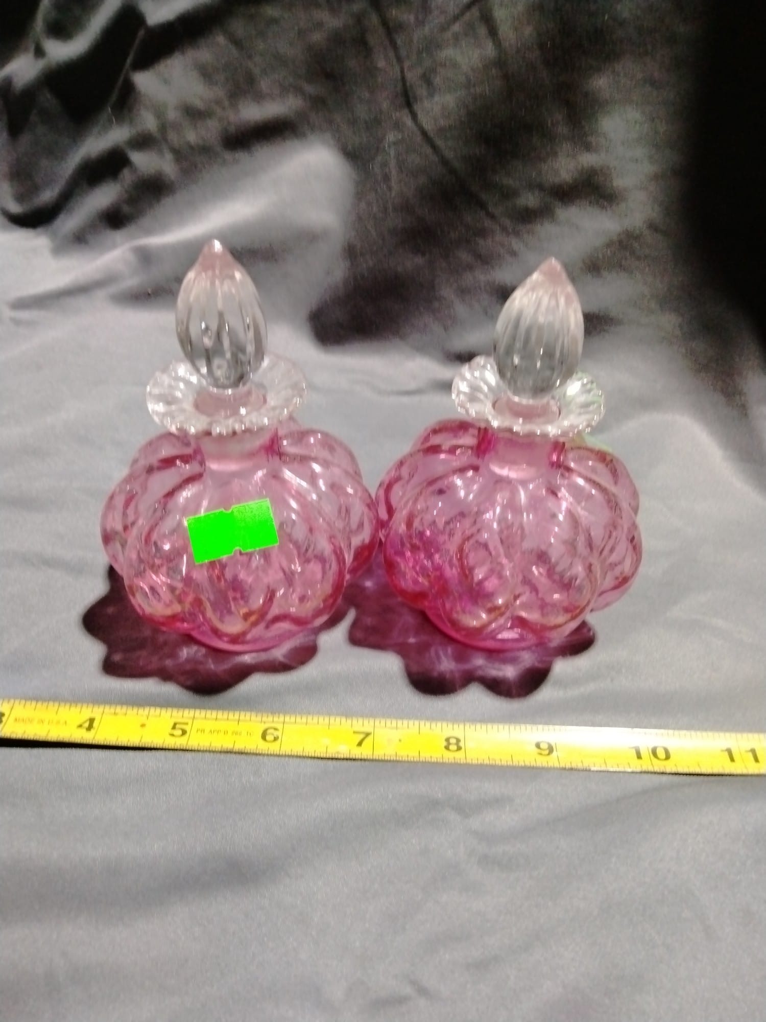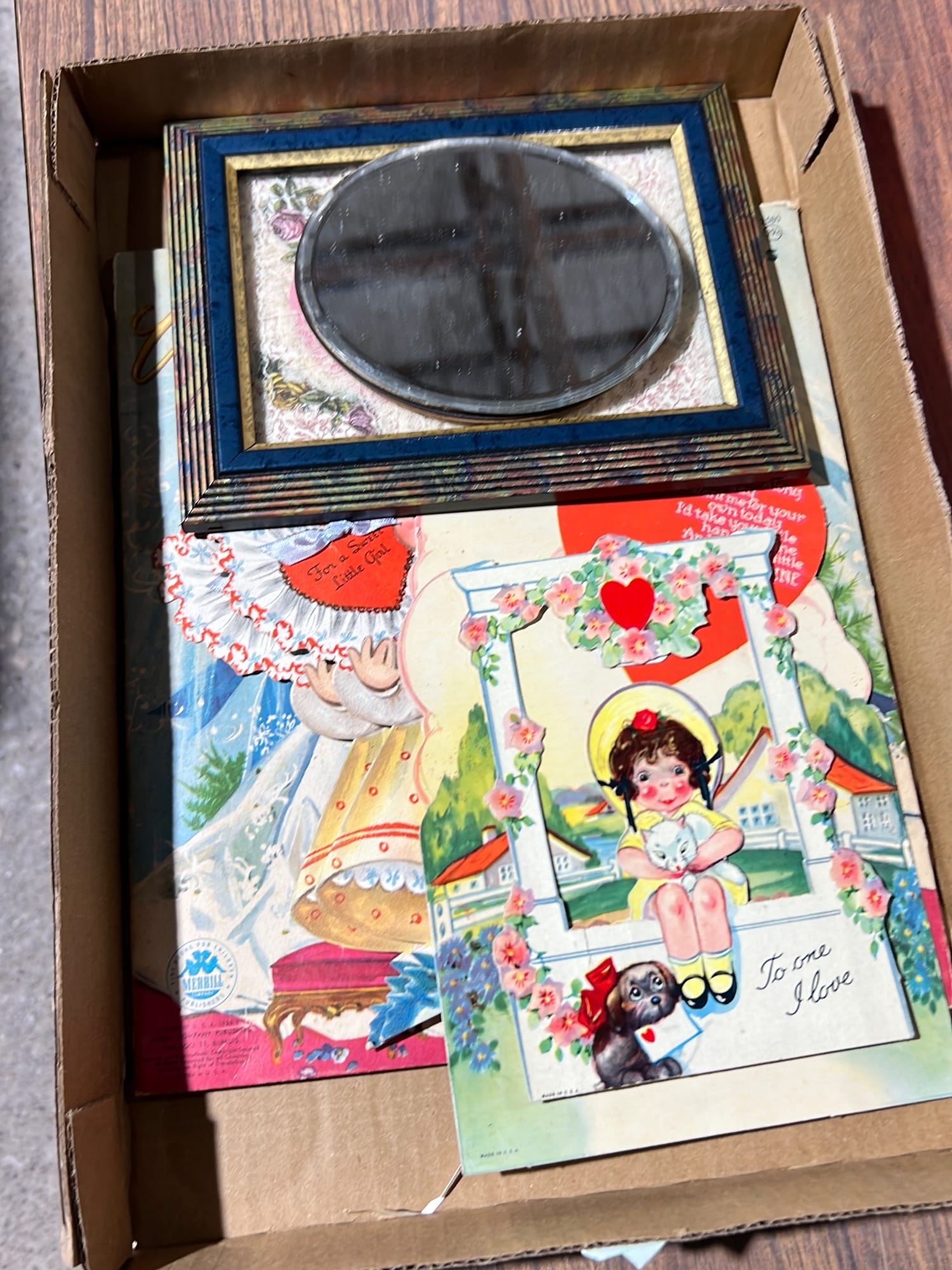 2010 Vintage metal music box ,5.5”, Avon porcelain covered music box , vintage powder jar , clear and ruby glass covered dish , frosted glass rabbit candle holder ,miscellaneous