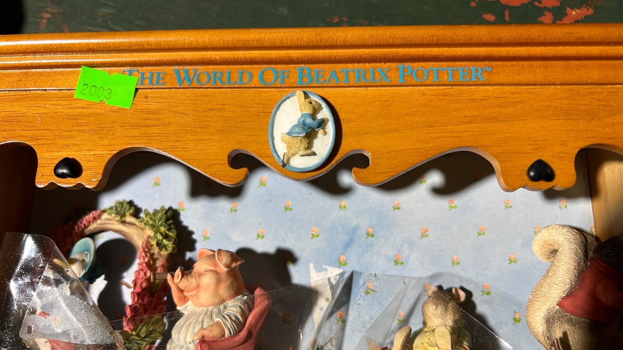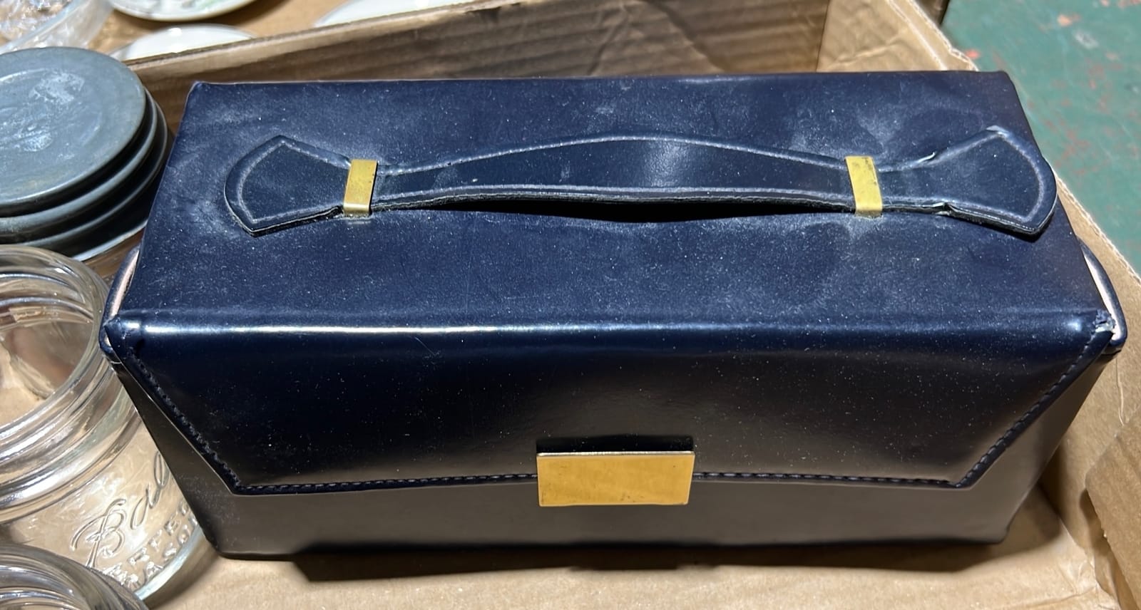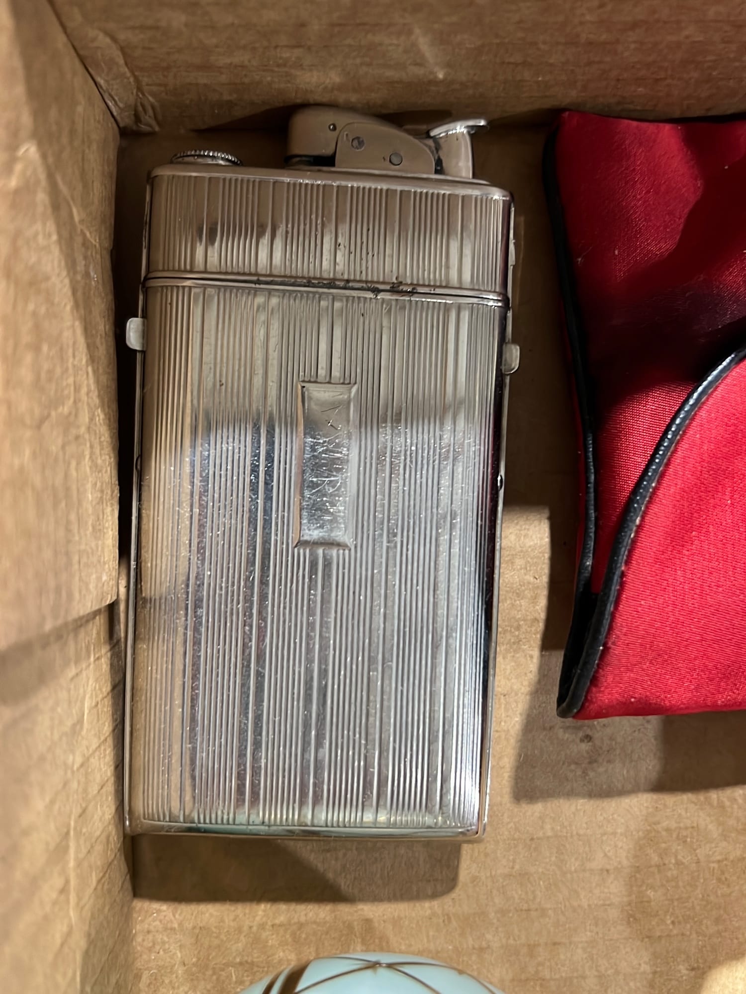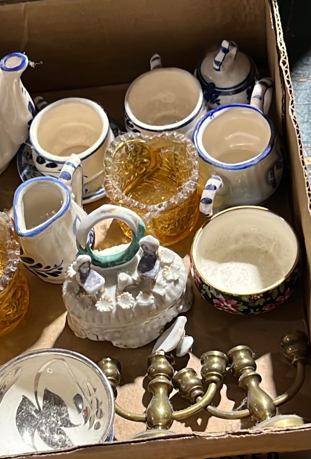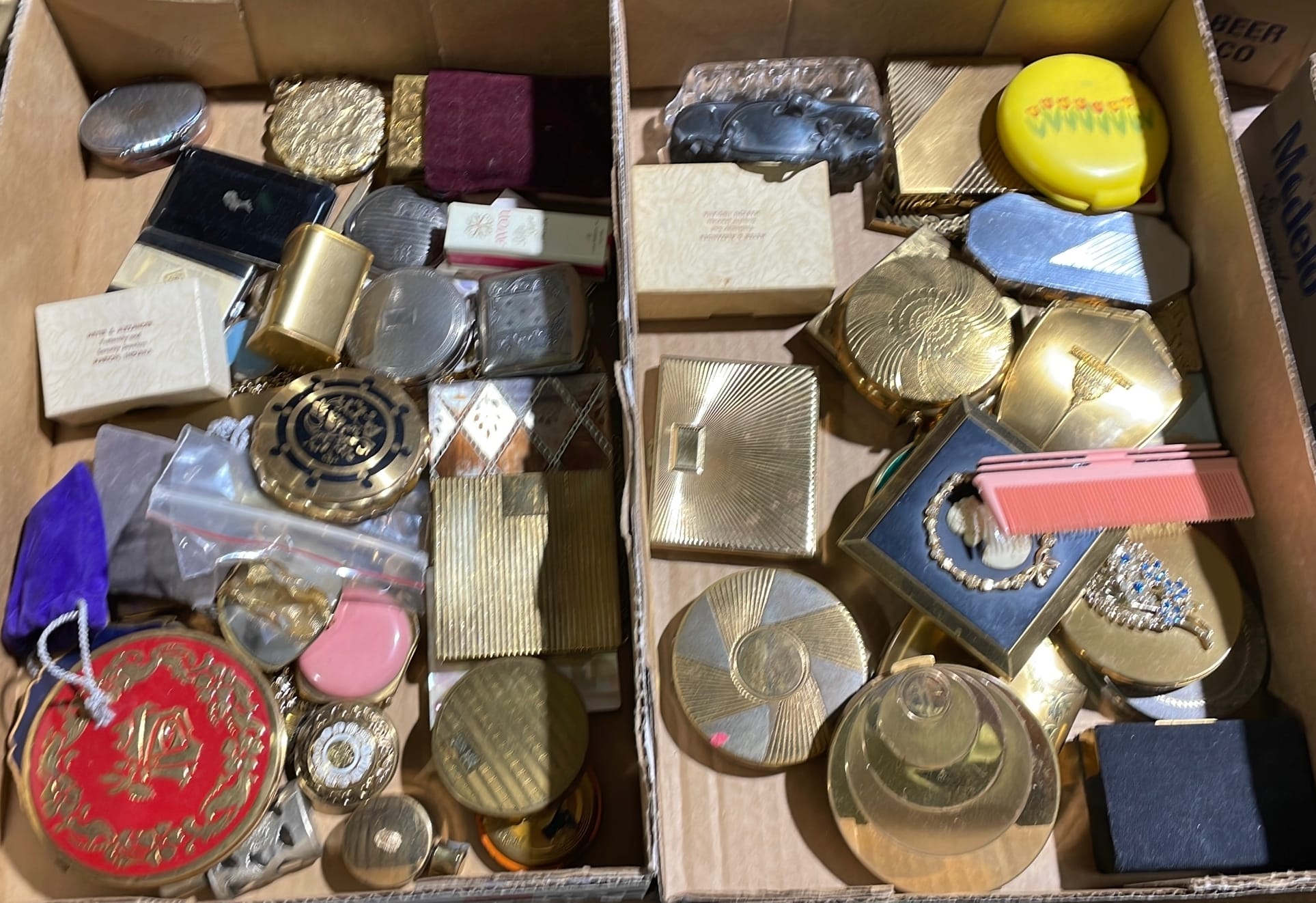 2010 Vintage metal music box ,5.5”, Avon porcelain covered music box , vintage powder jar , clear and ruby glass covered dish , frosted glass rabbit candle holder ,miscellaneous