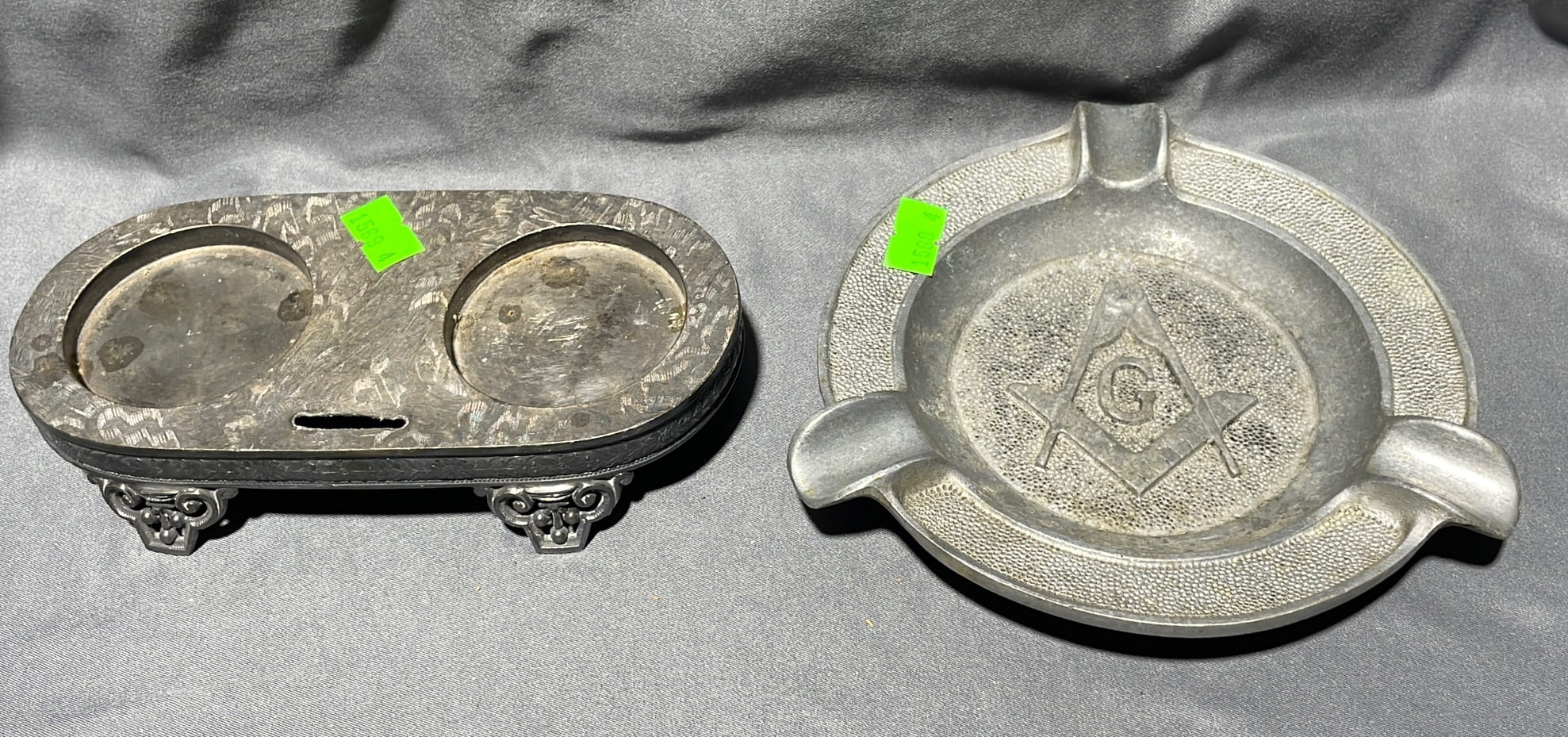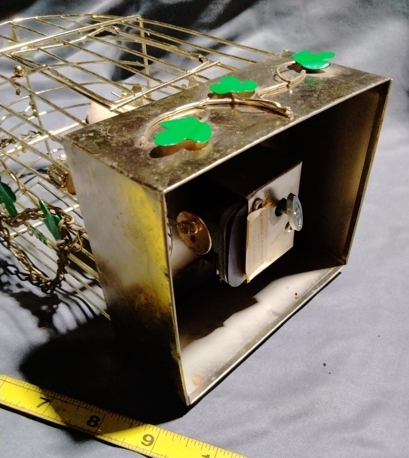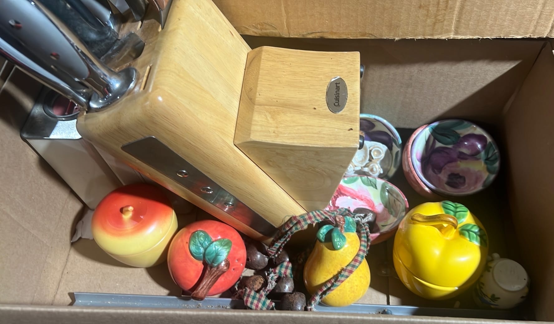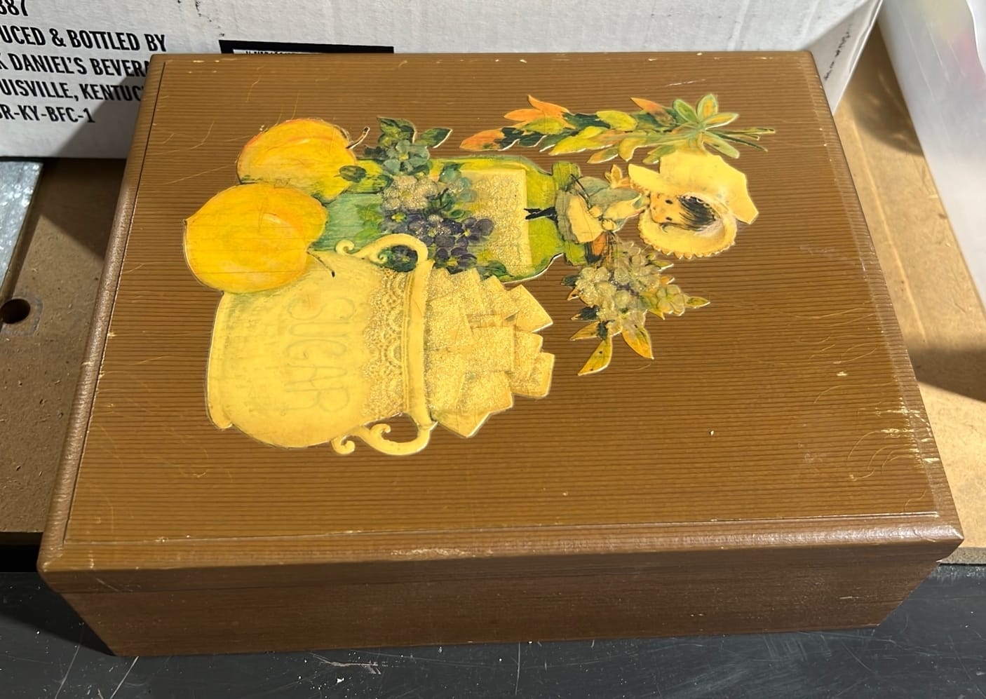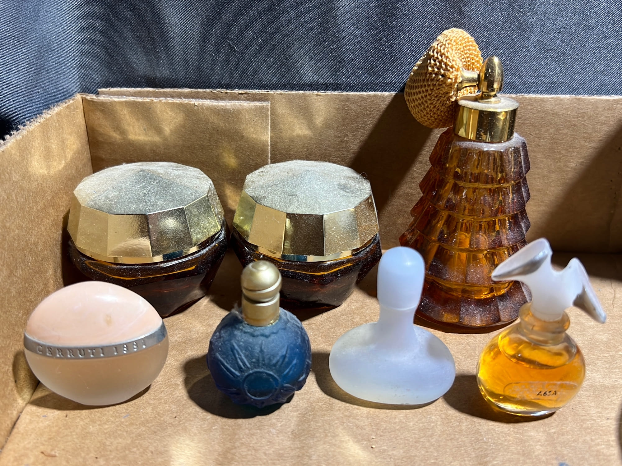 2010 Vintage metal music box ,5.5”, Avon porcelain covered music box , vintage powder jar , clear and ruby glass covered dish , frosted glass rabbit candle holder ,miscellaneous