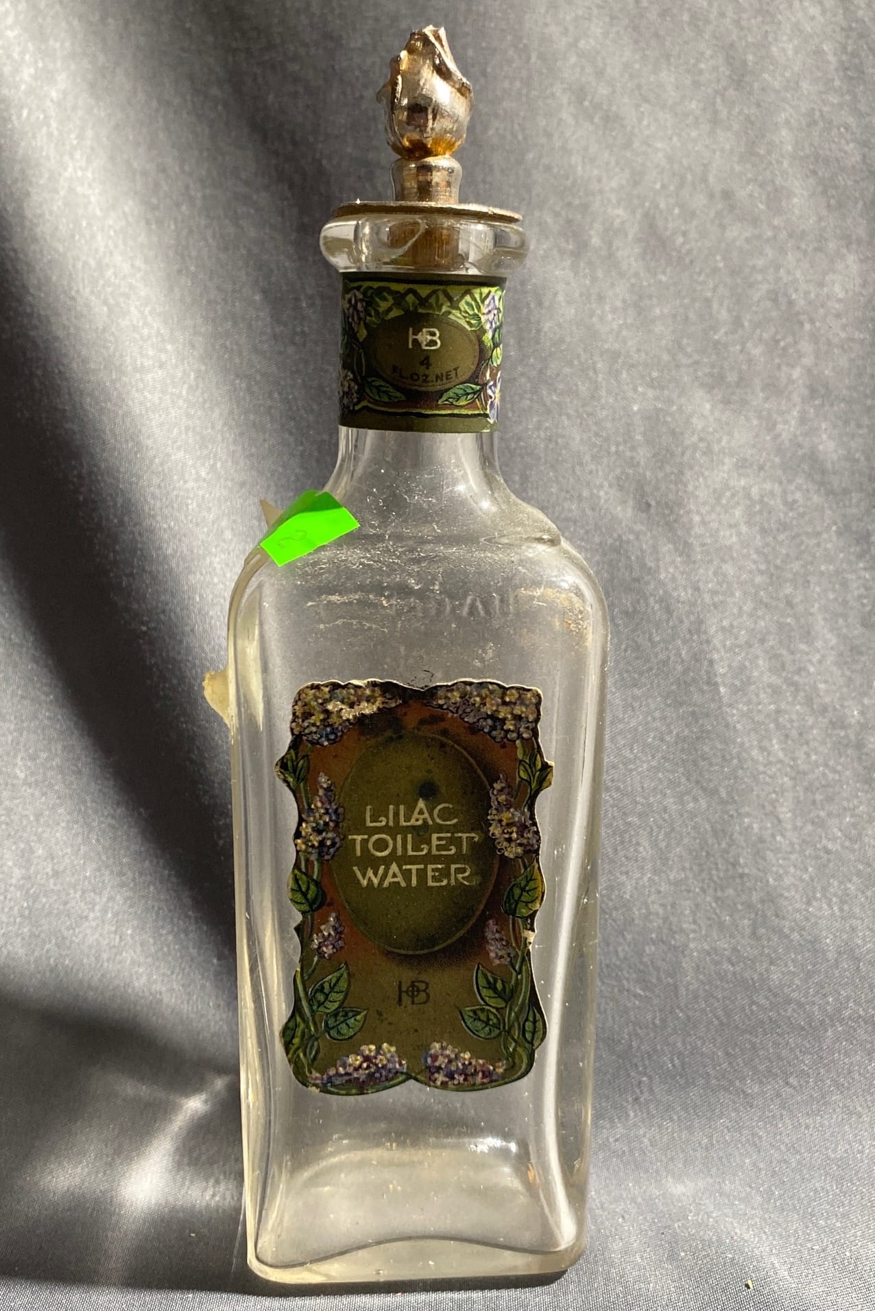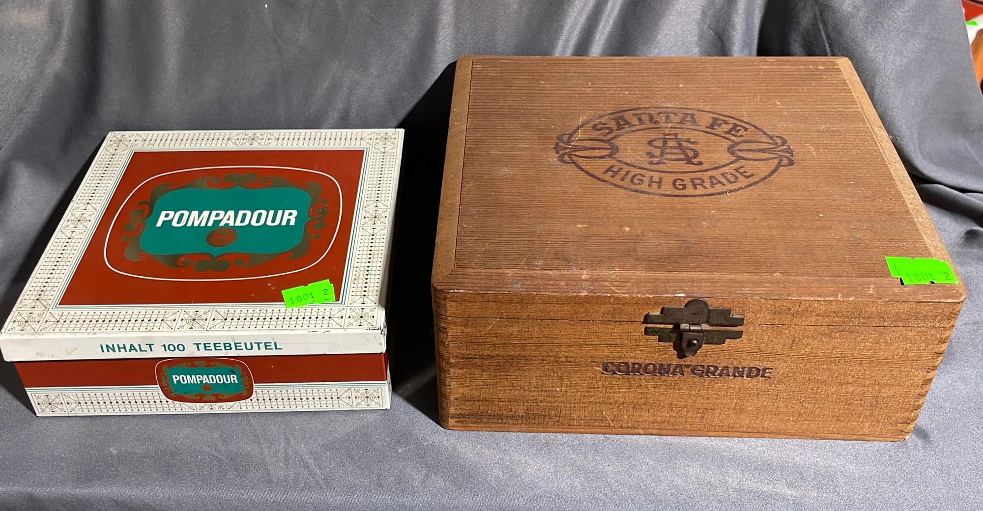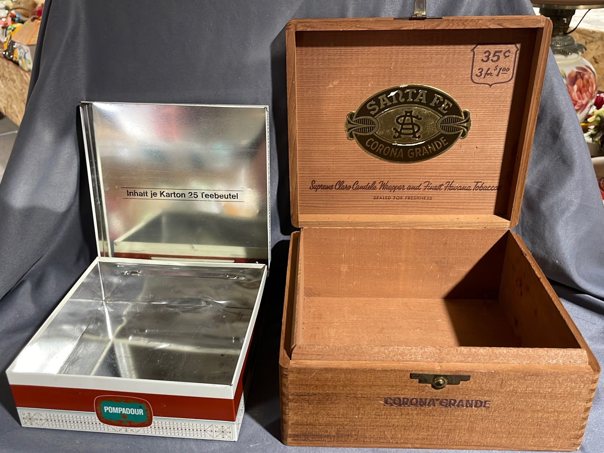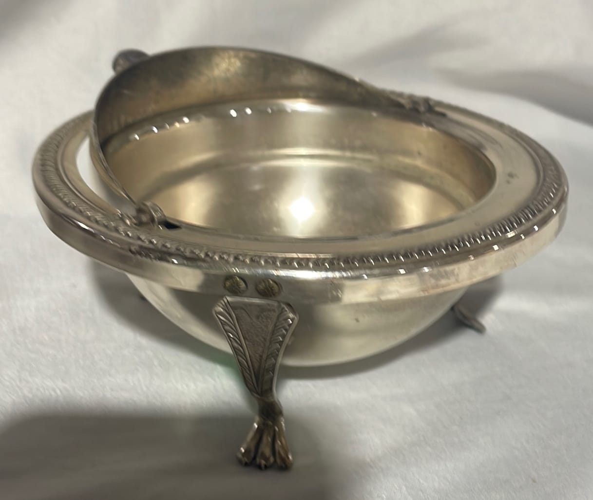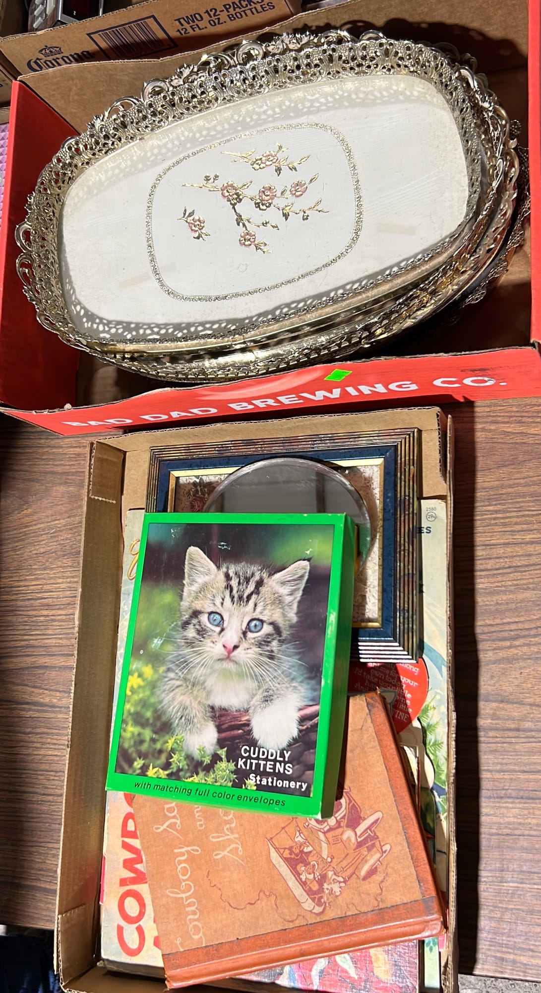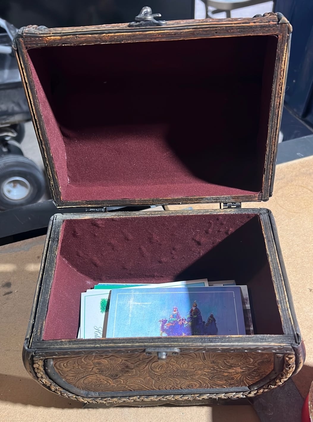 2010 Vintage metal music box ,5.5”, Avon porcelain covered music box , vintage powder jar , clear and ruby glass covered dish , frosted glass rabbit candle holder ,miscellaneous