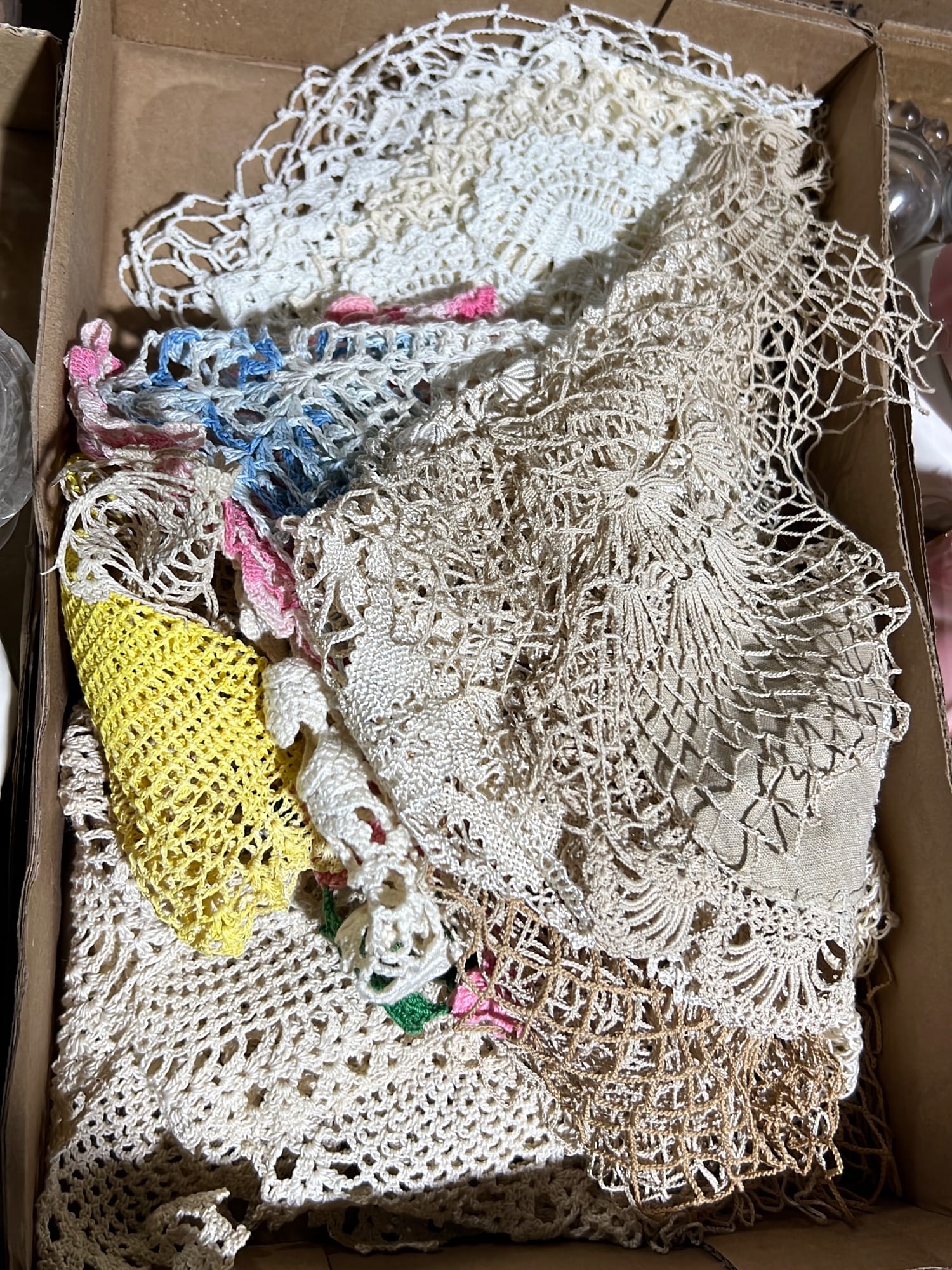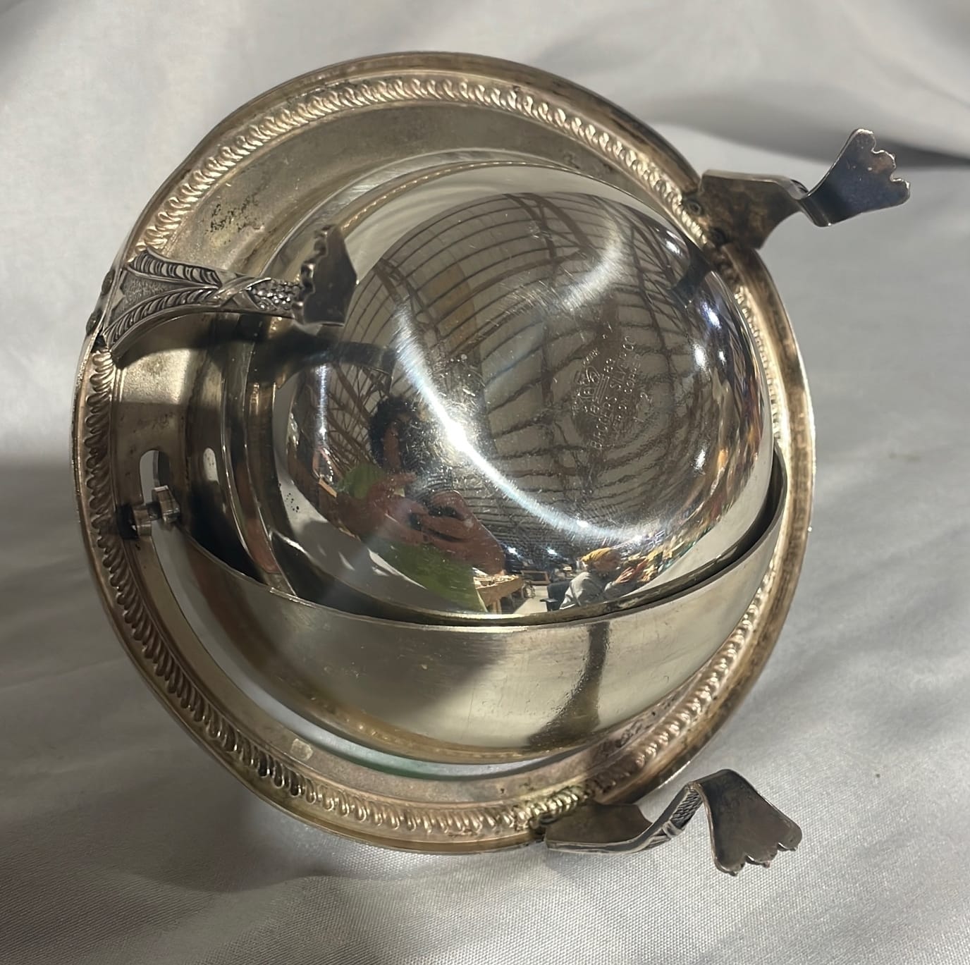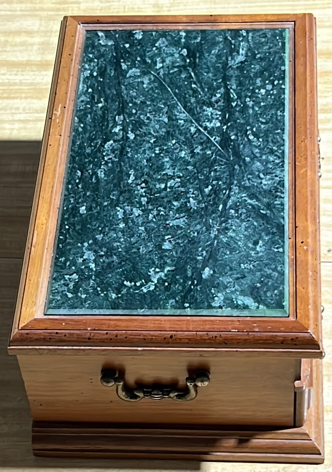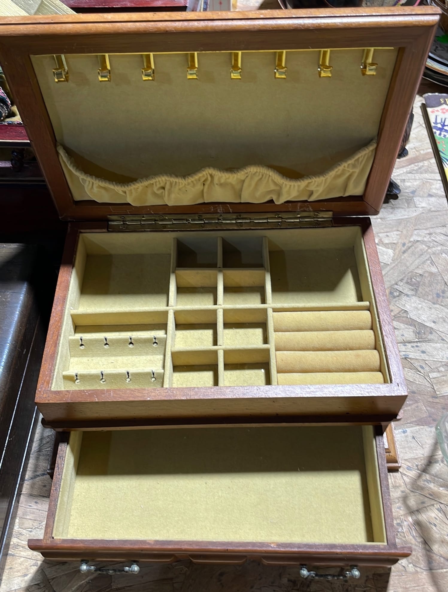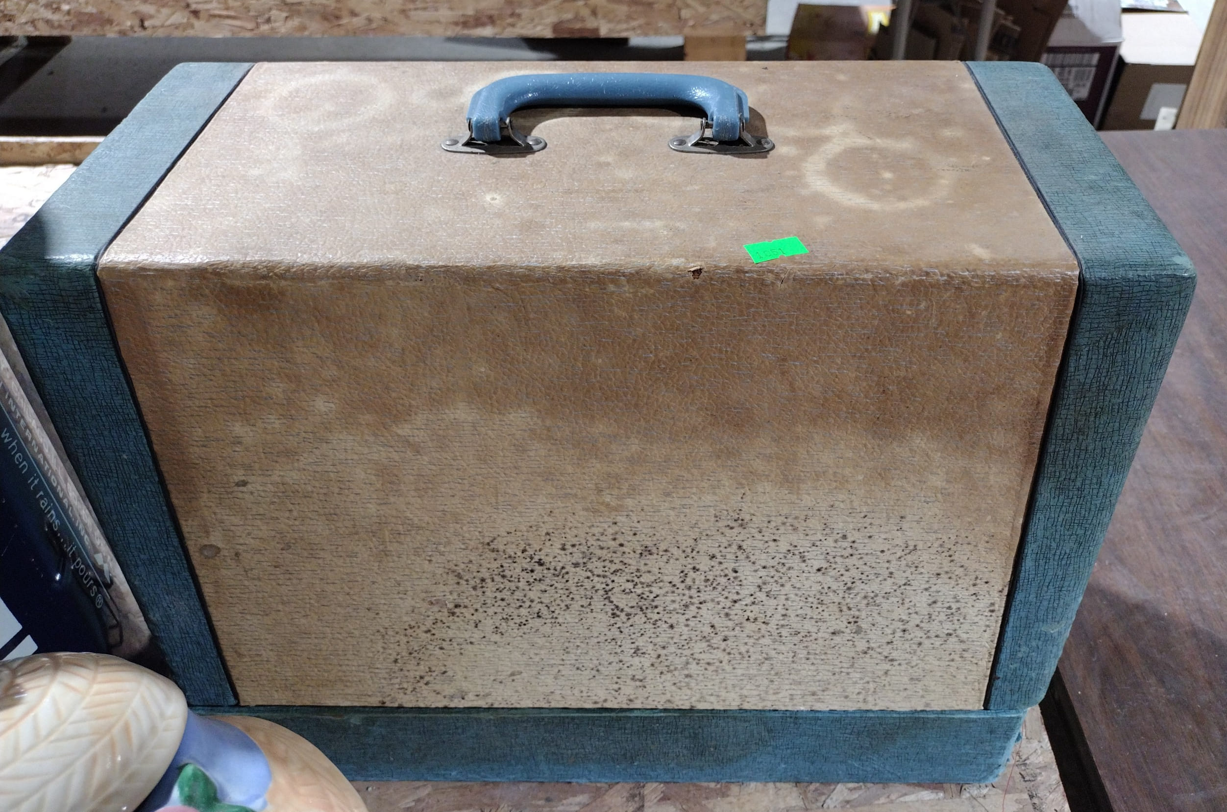 2010 Vintage metal music box ,5.5”, Avon porcelain covered music box , vintage powder jar , clear and ruby glass covered dish , frosted glass rabbit candle holder ,miscellaneous