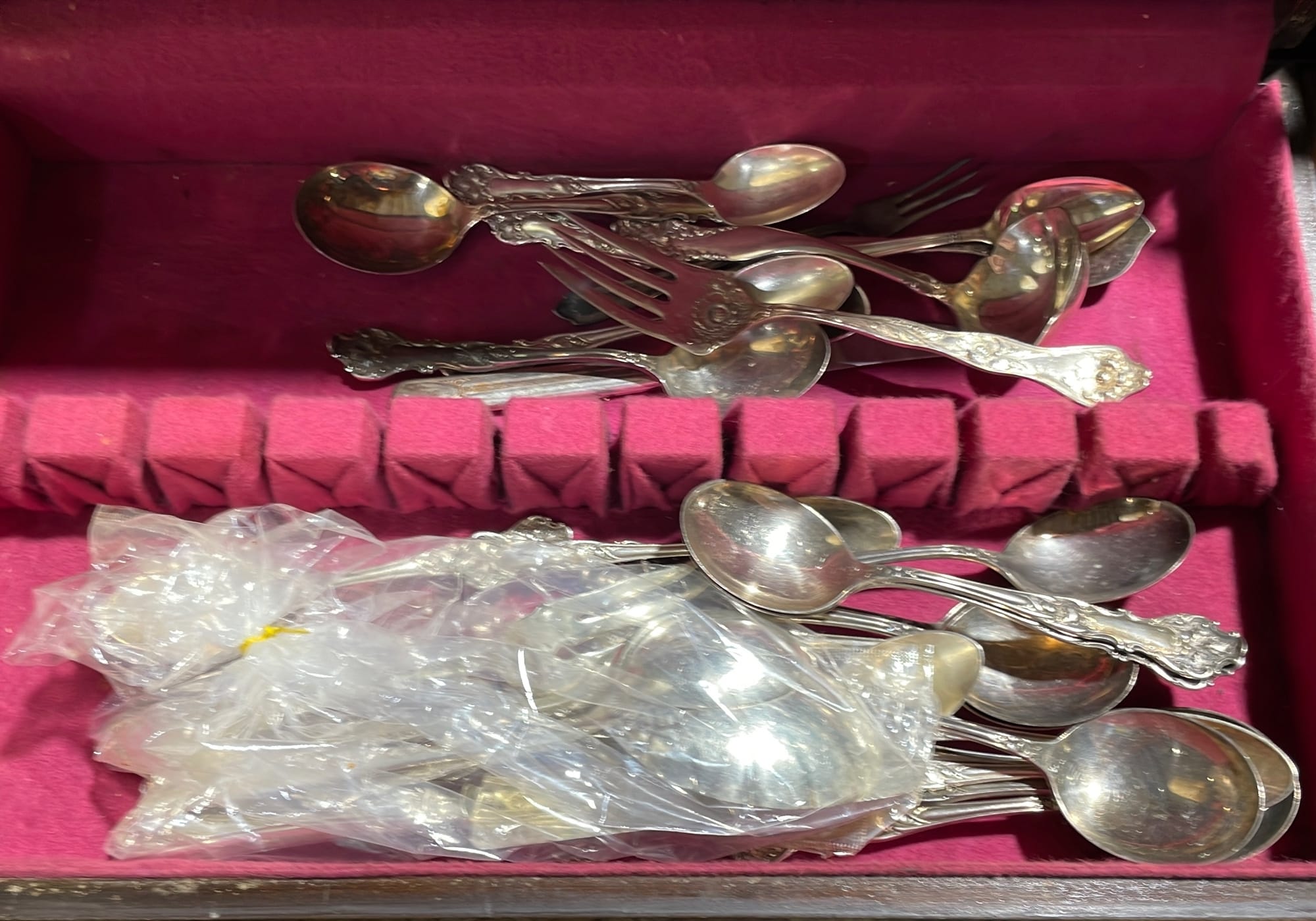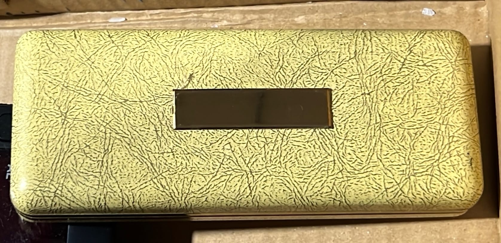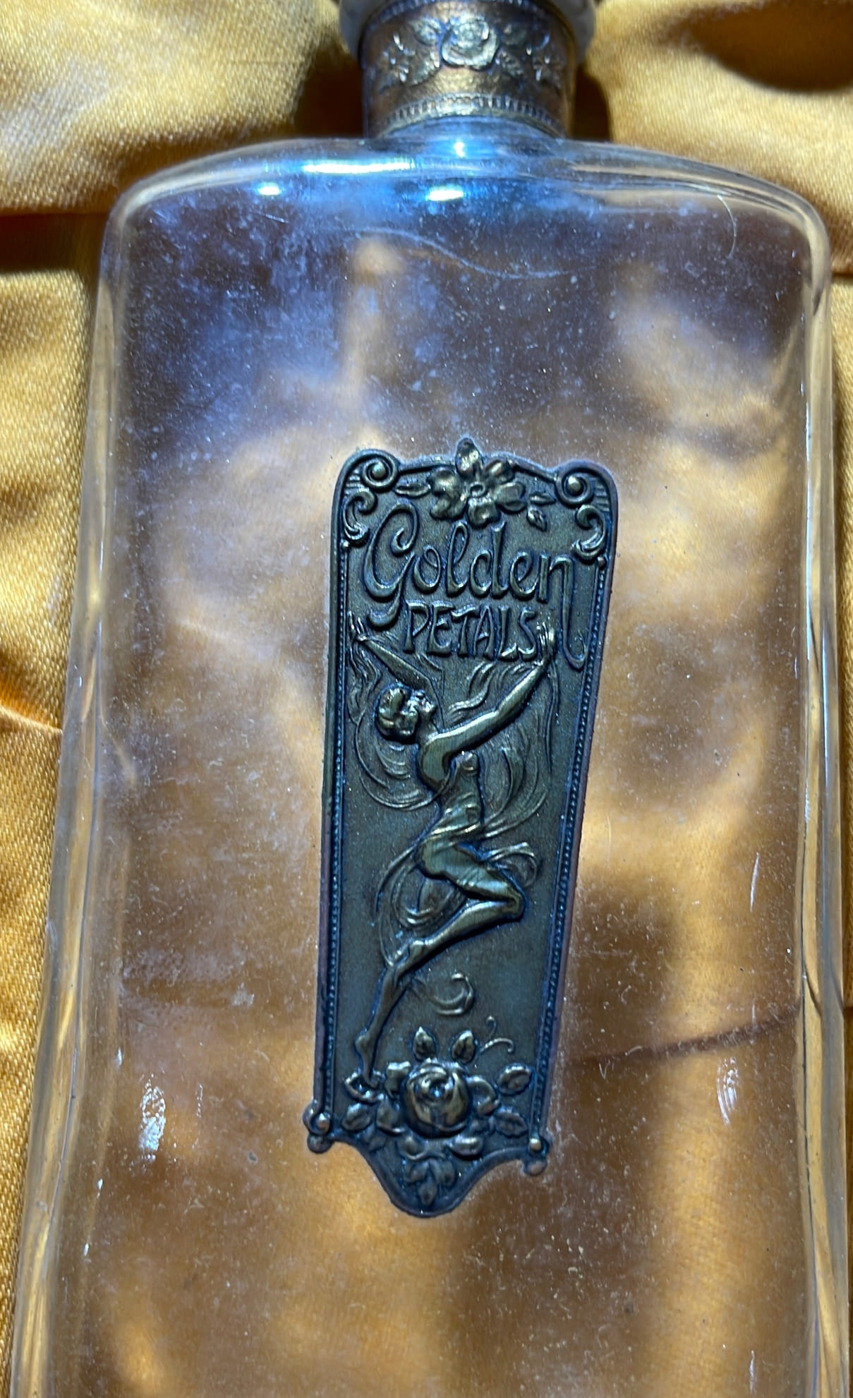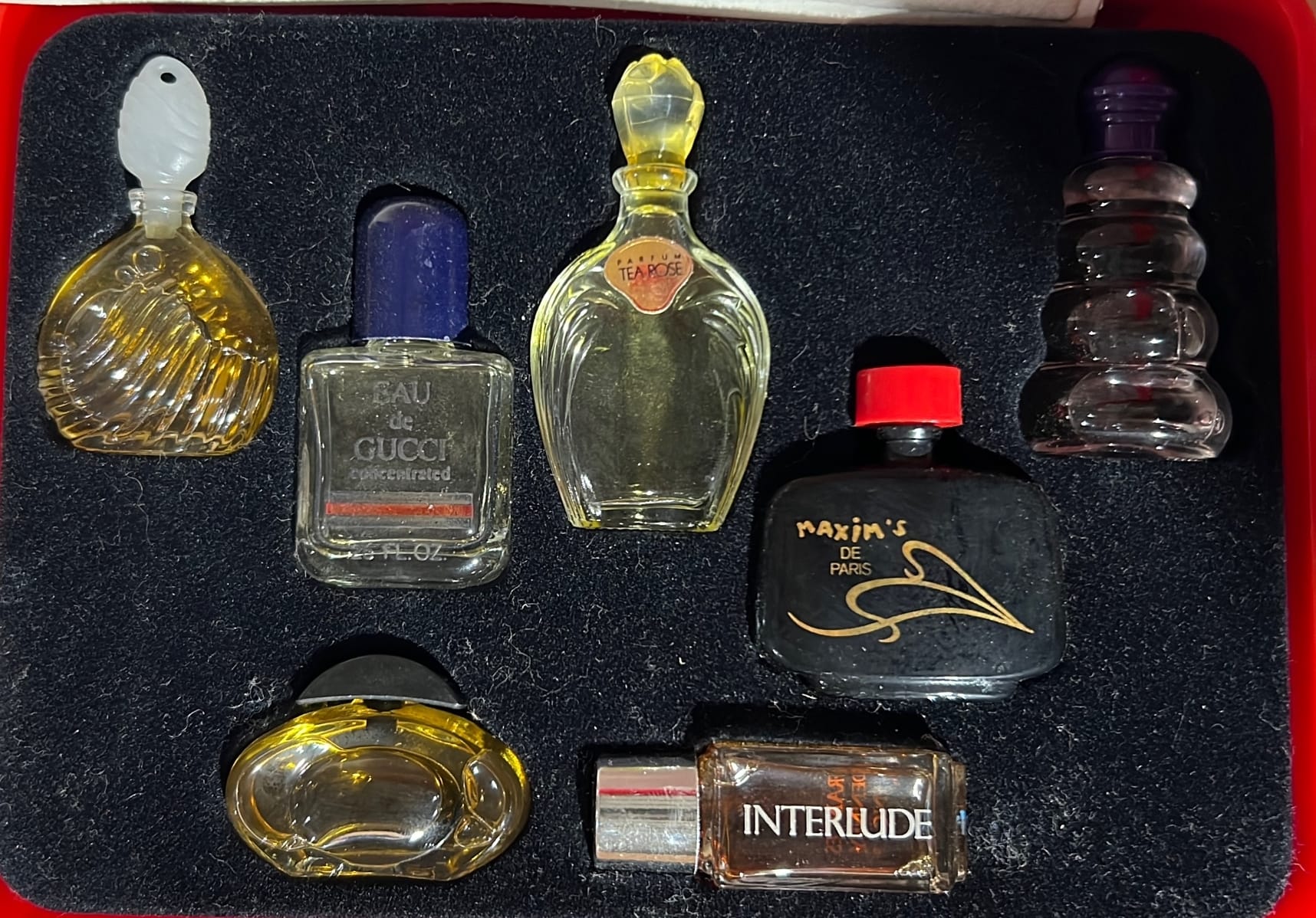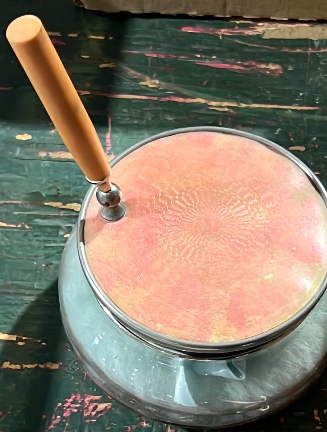 2010 Vintage metal music box ,5.5”, Avon porcelain covered music box , vintage powder jar , clear and ruby glass covered dish , frosted glass rabbit candle holder ,miscellaneous