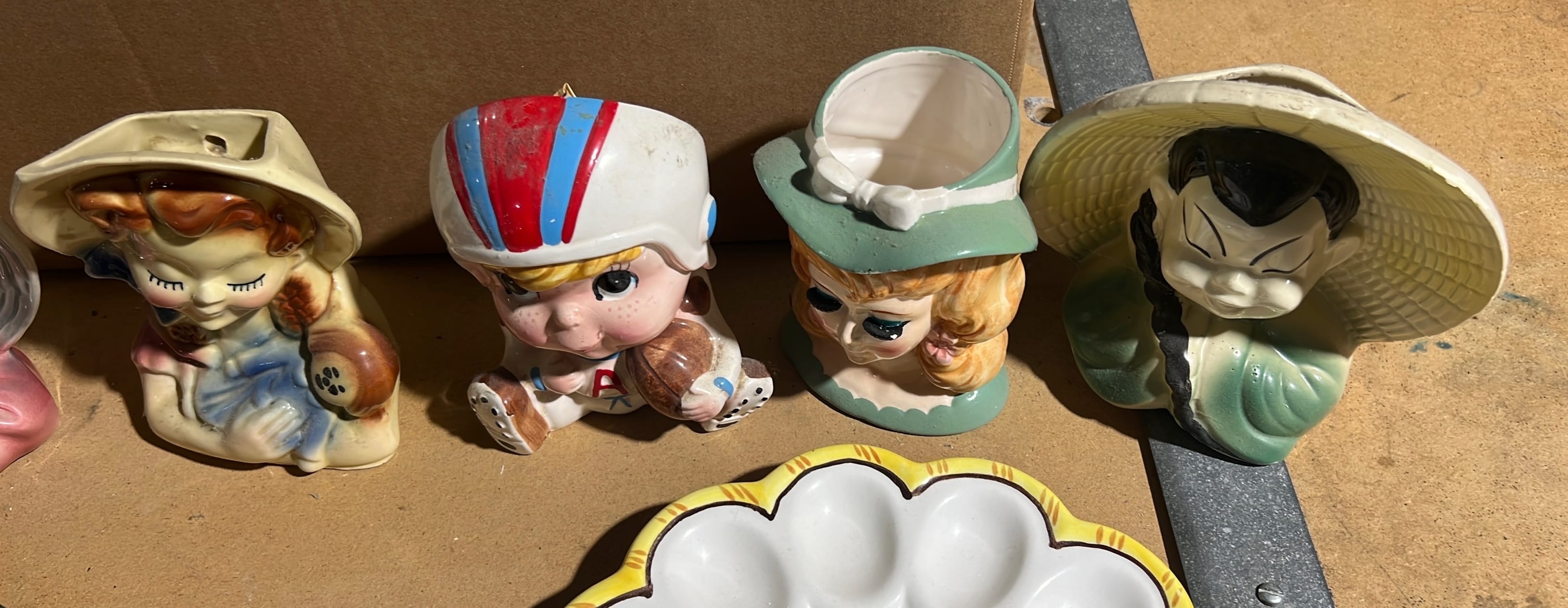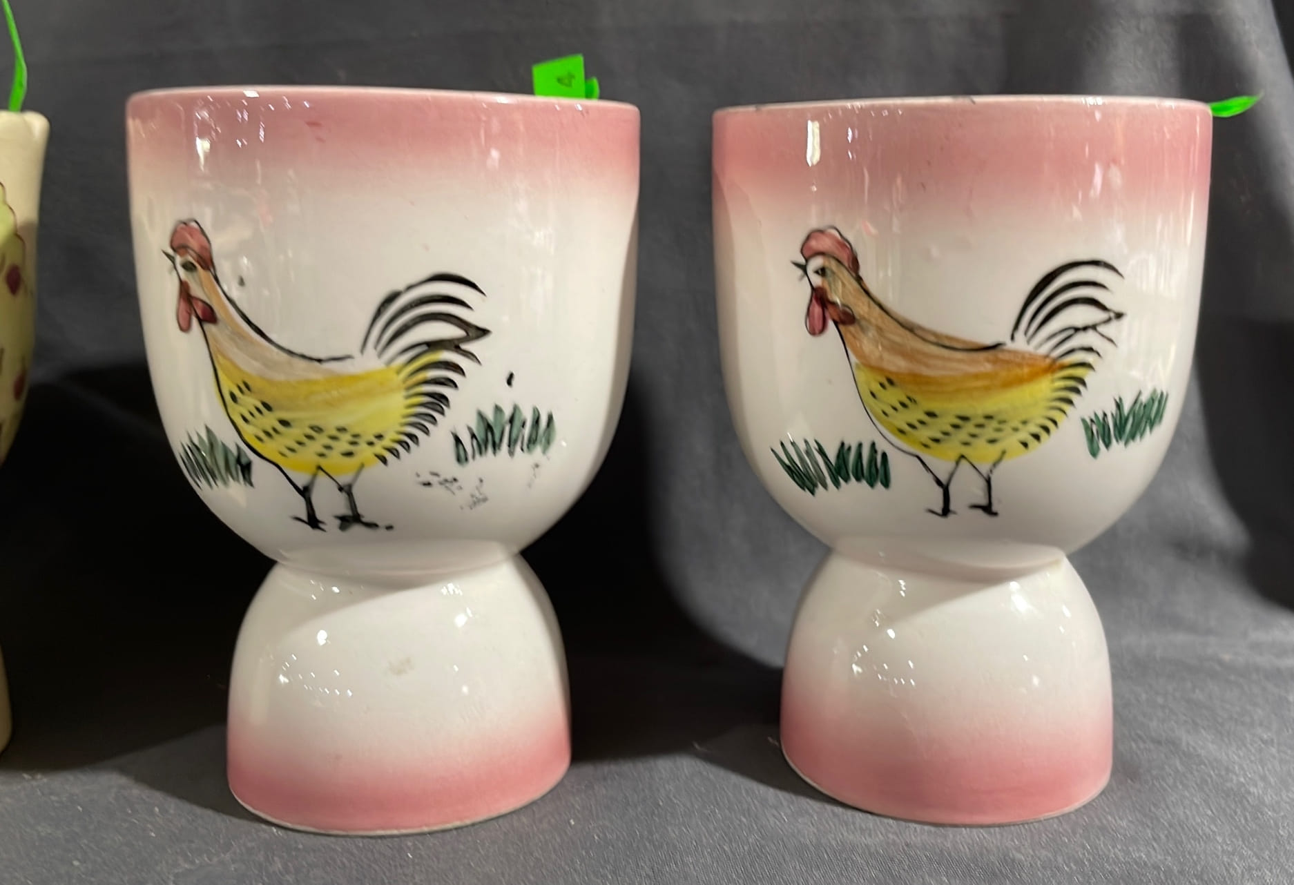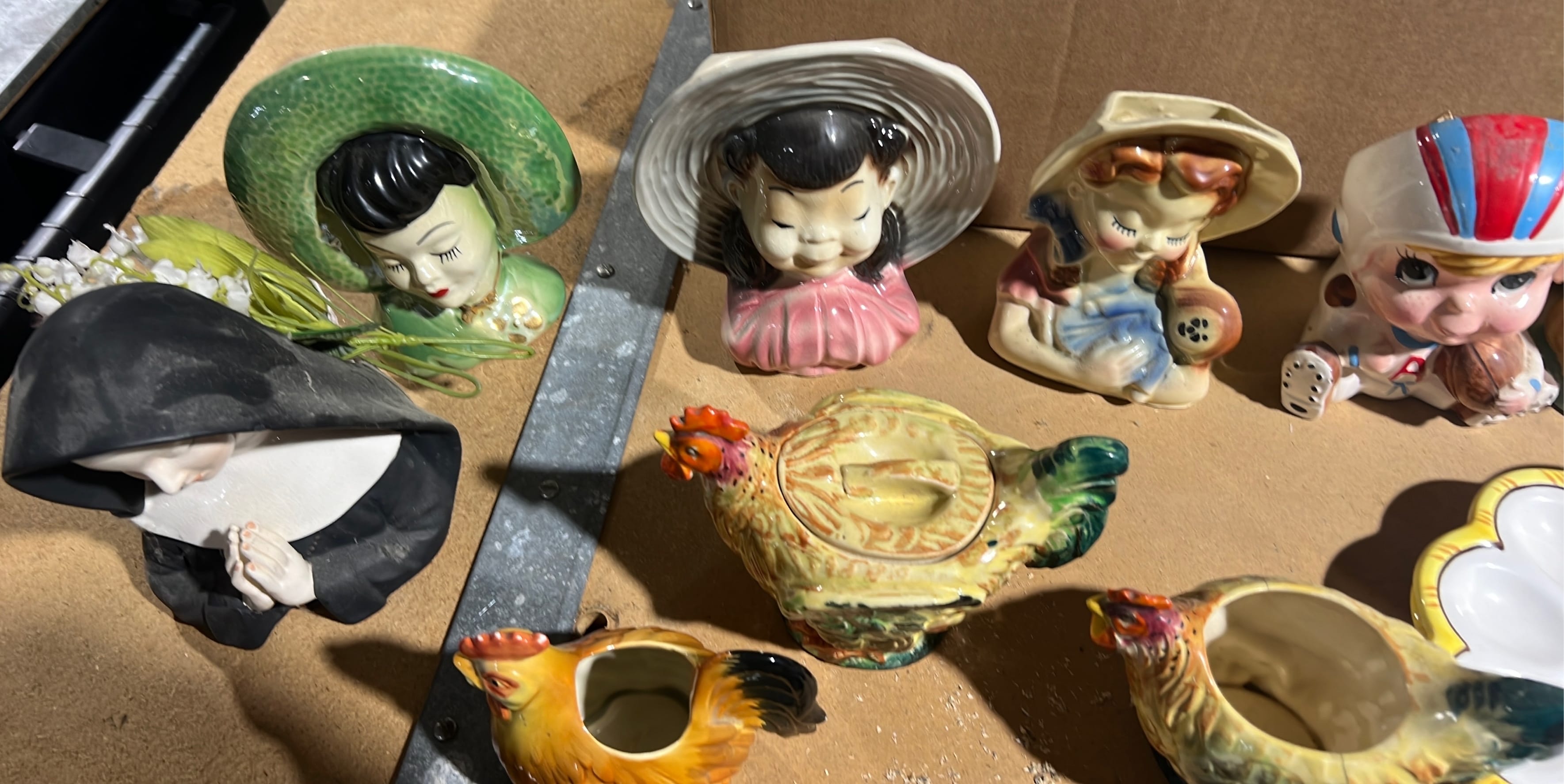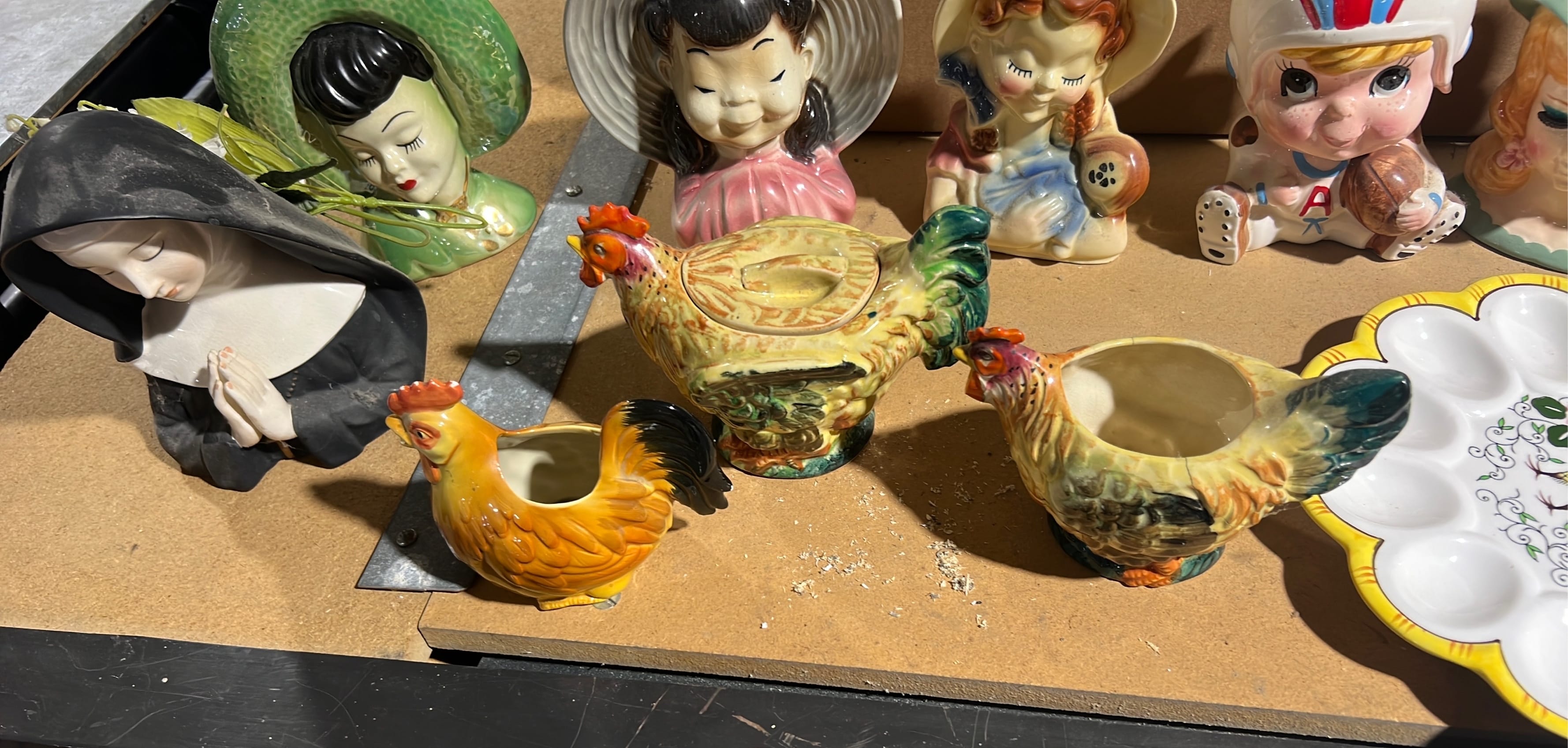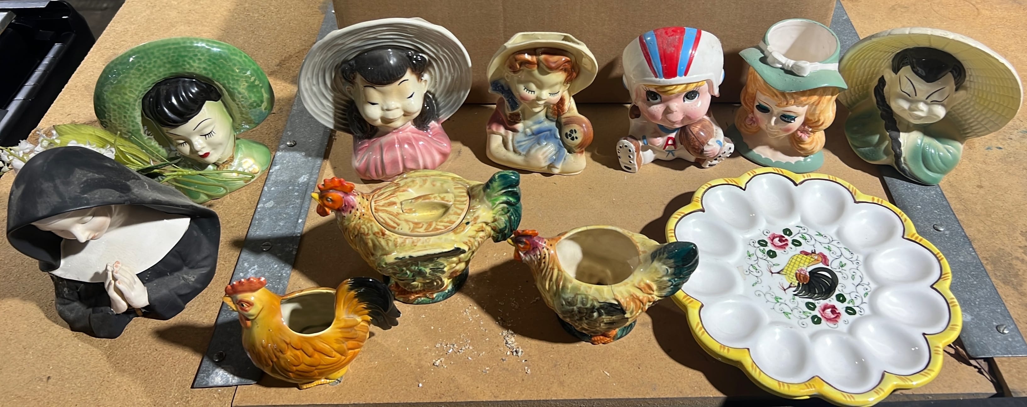 2020 Egg plates, porcelain head planter assortment, chicken cream and sugar