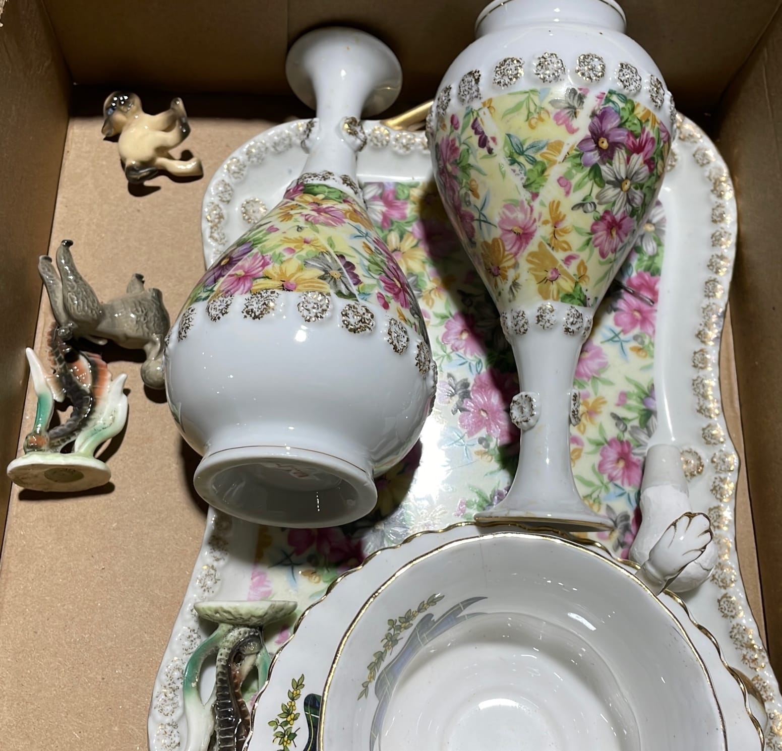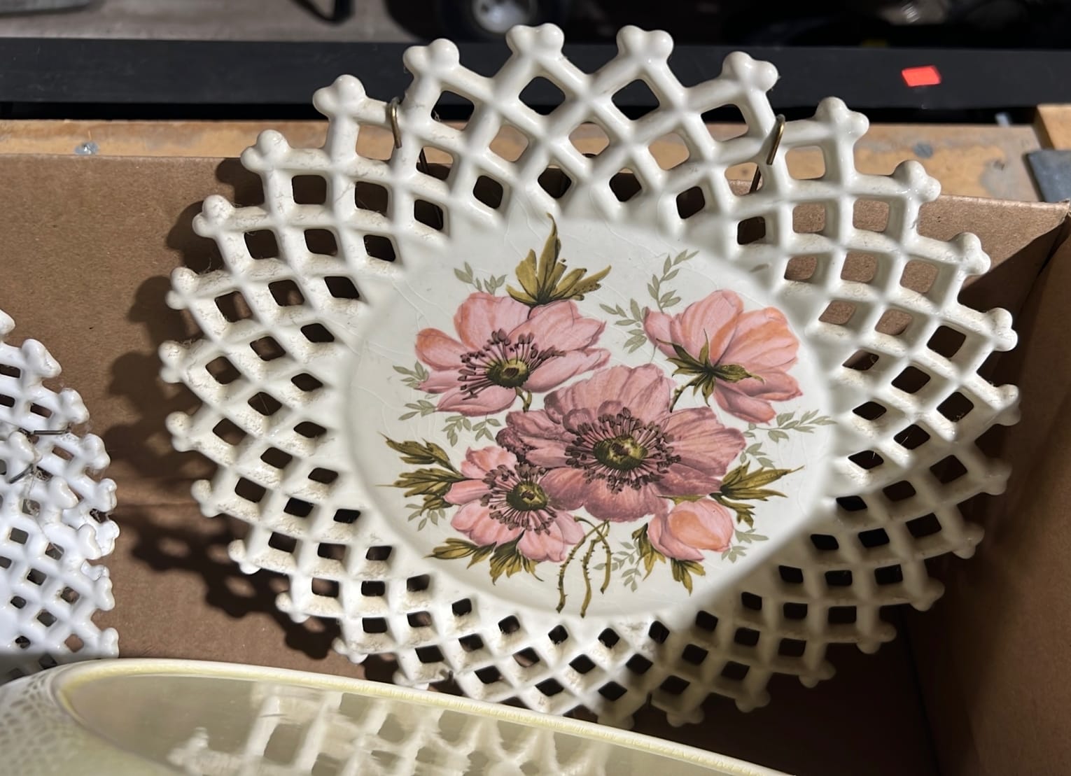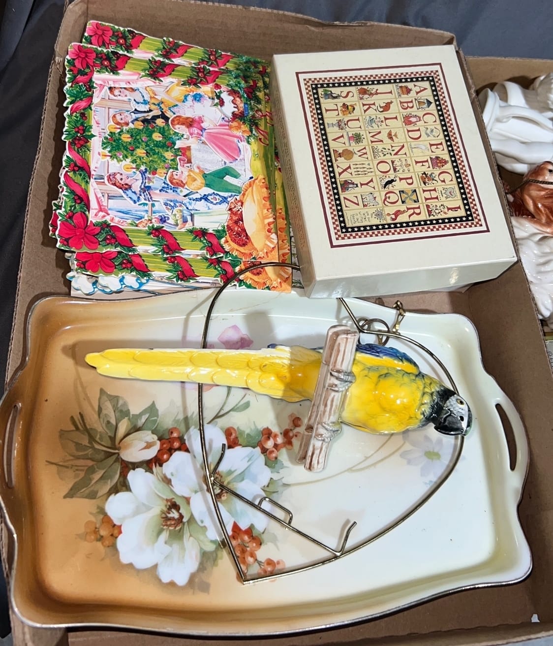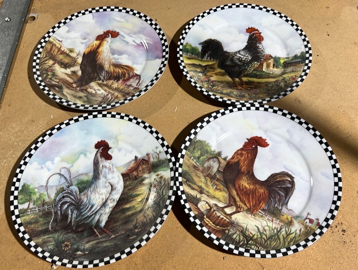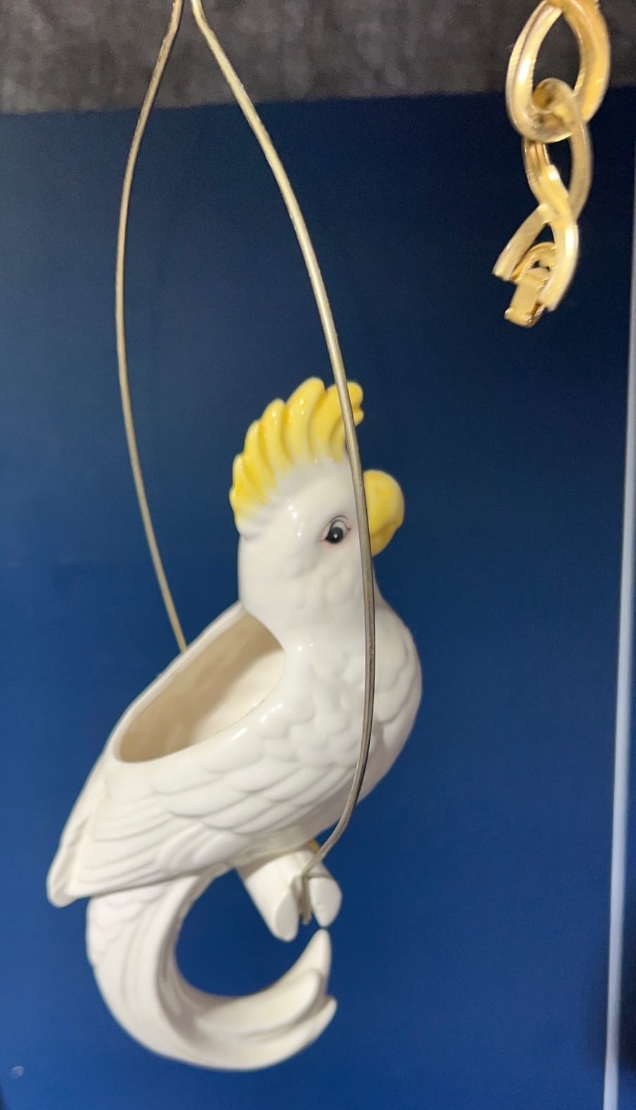 2013 Ornate Andrea vase , 8.5” , 4- chicken plates , 8”, porcelain cockatoo with perching rack, miscellaneous