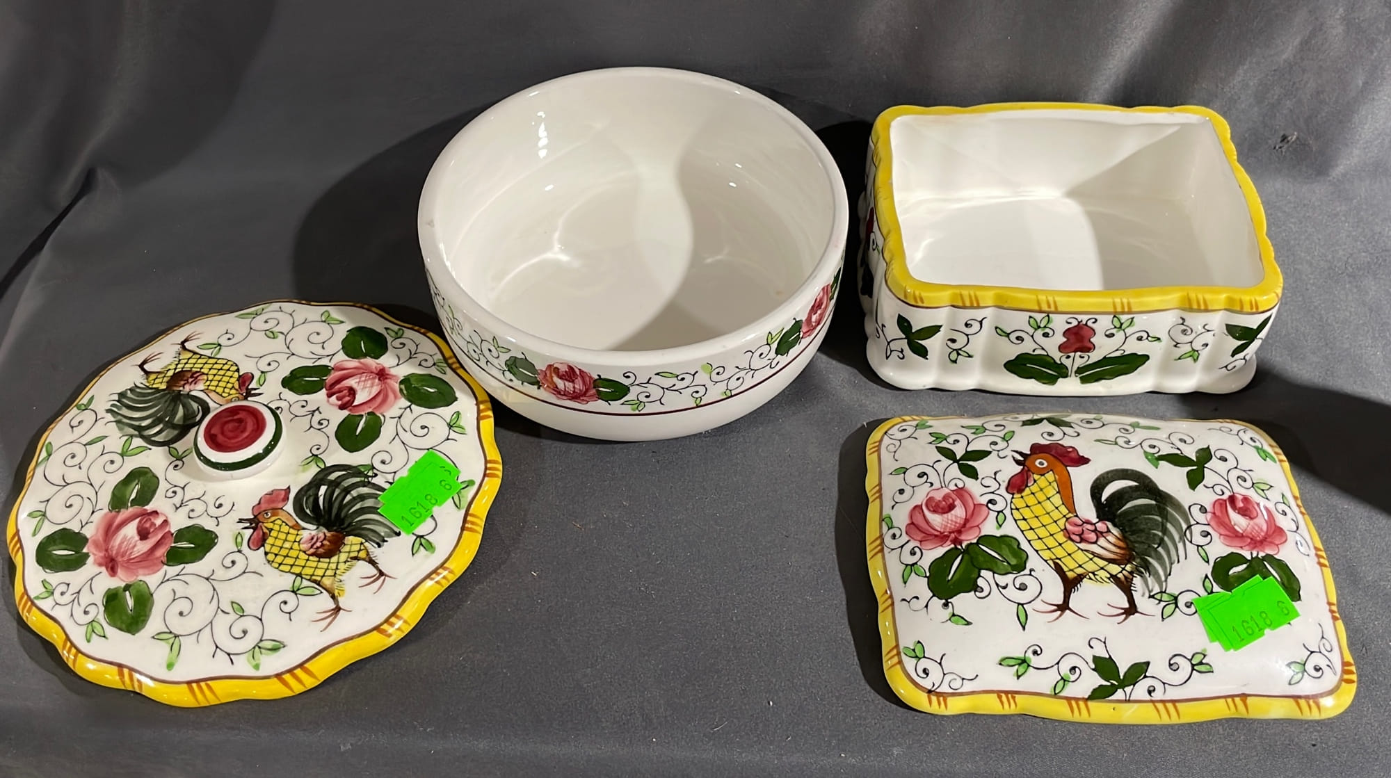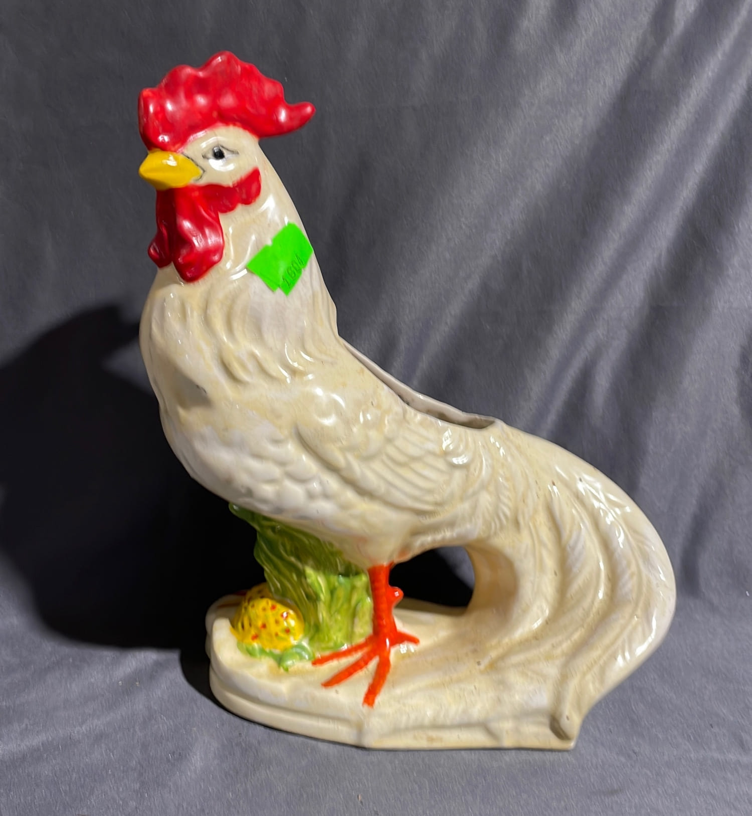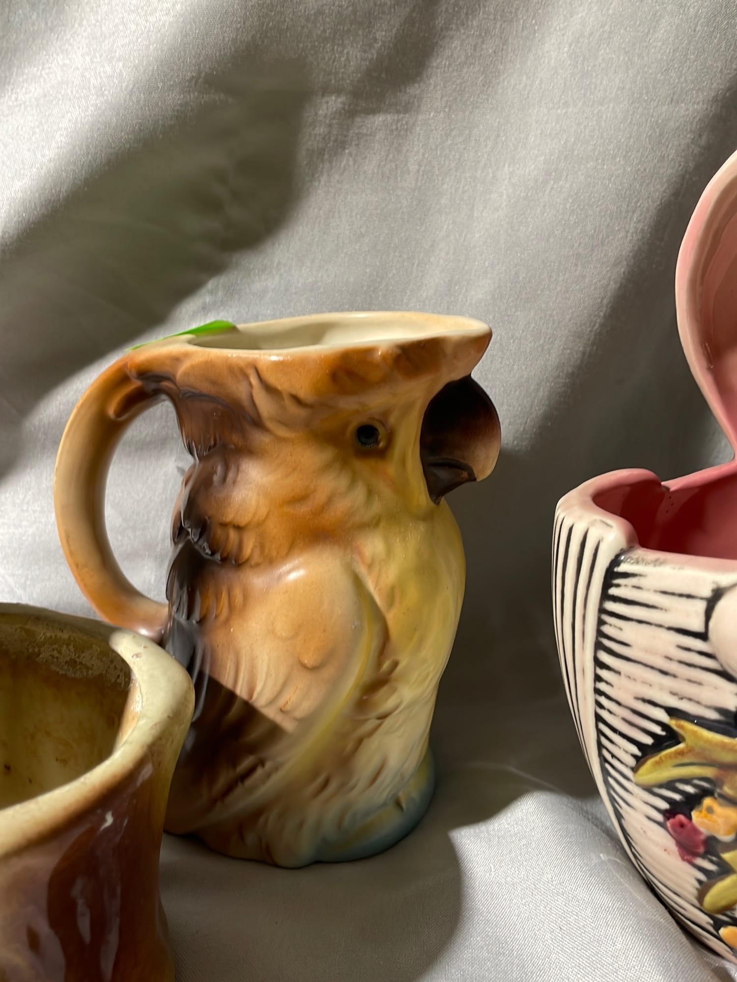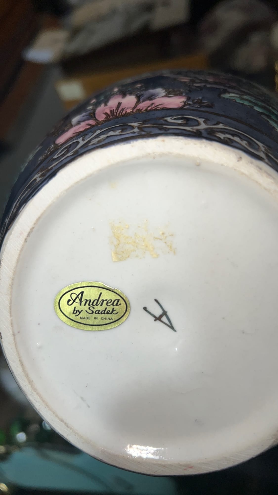 2013 Ornate Andrea vase , 8.5” , 4- chicken plates , 8”, porcelain cockatoo with perching rack, miscellaneous