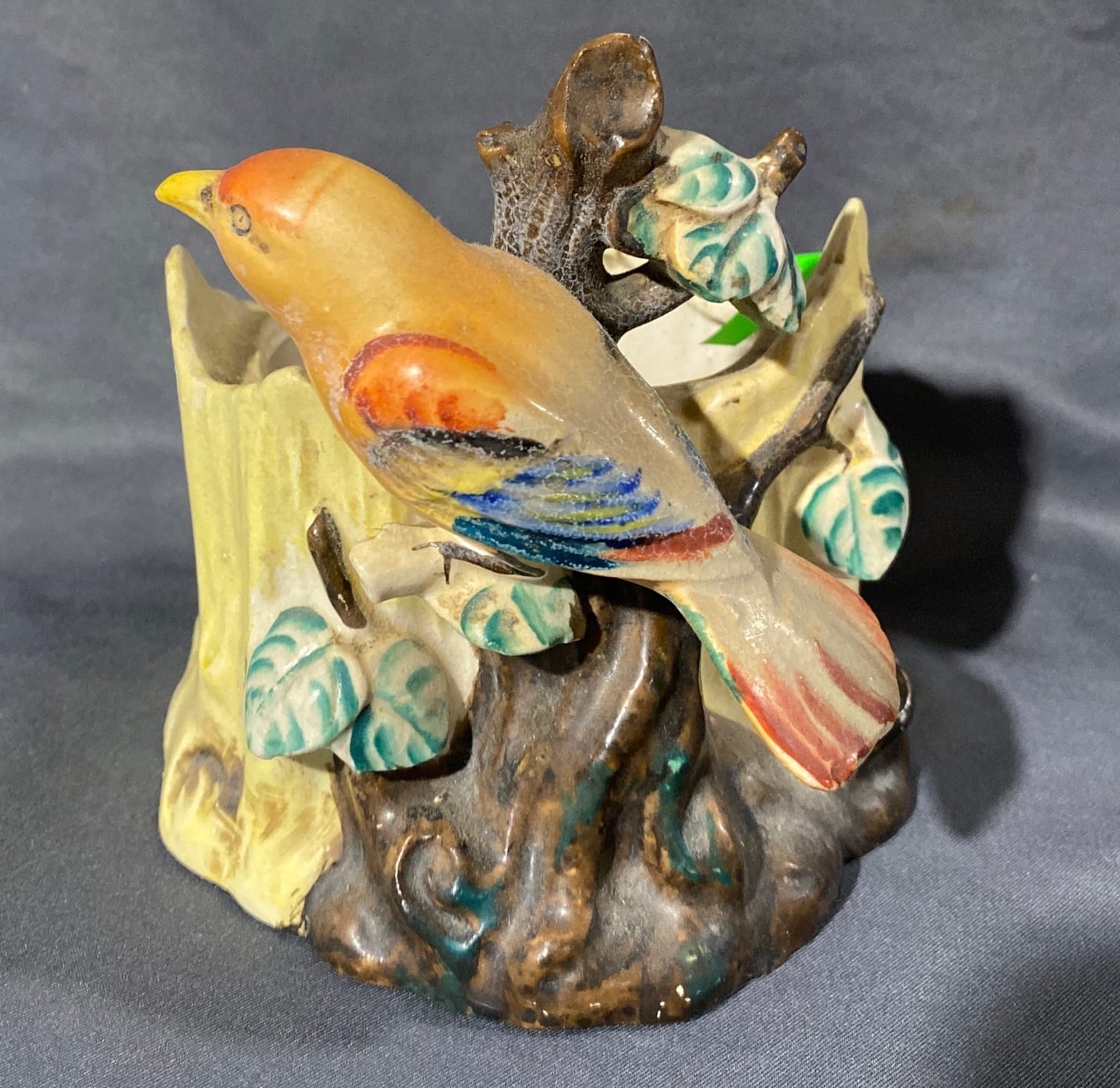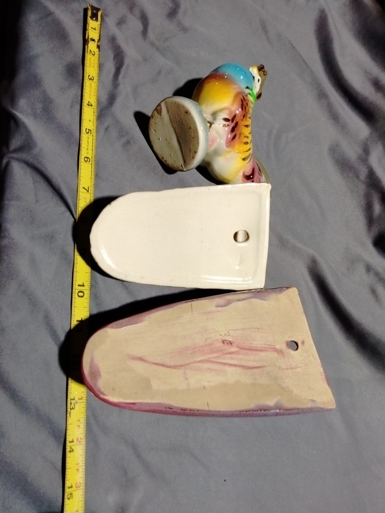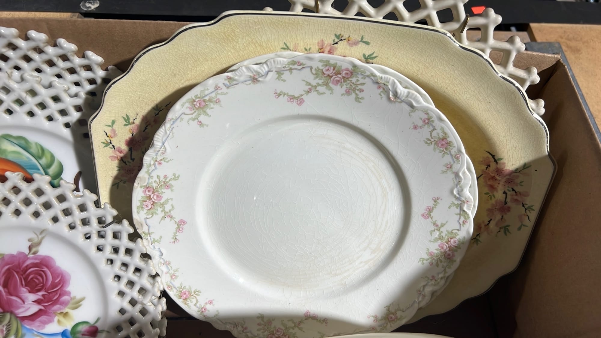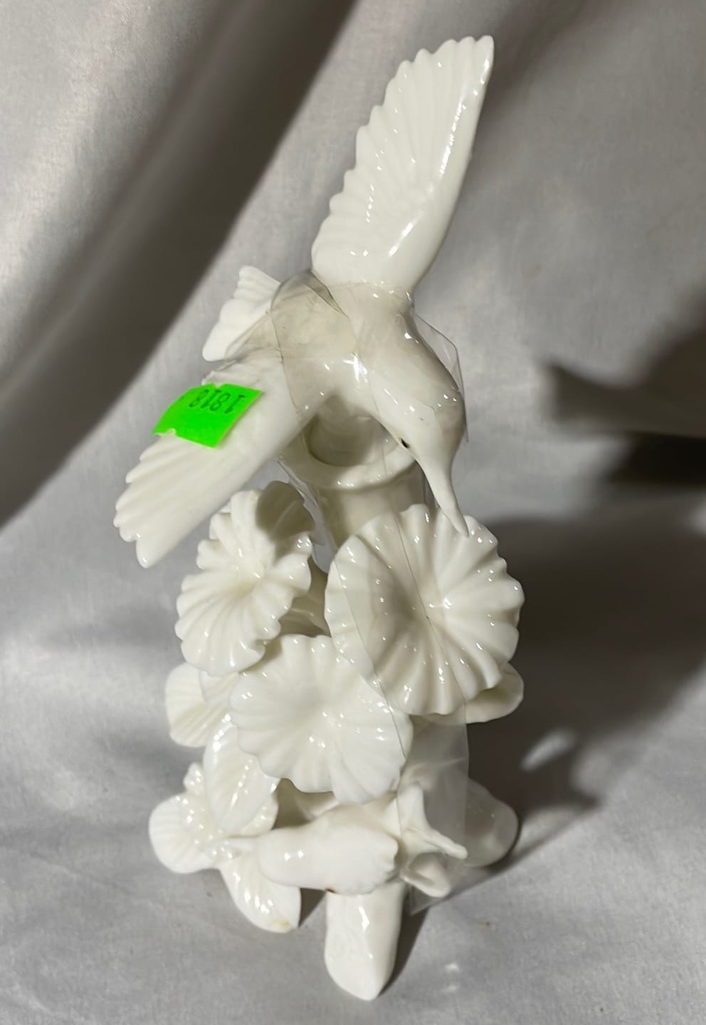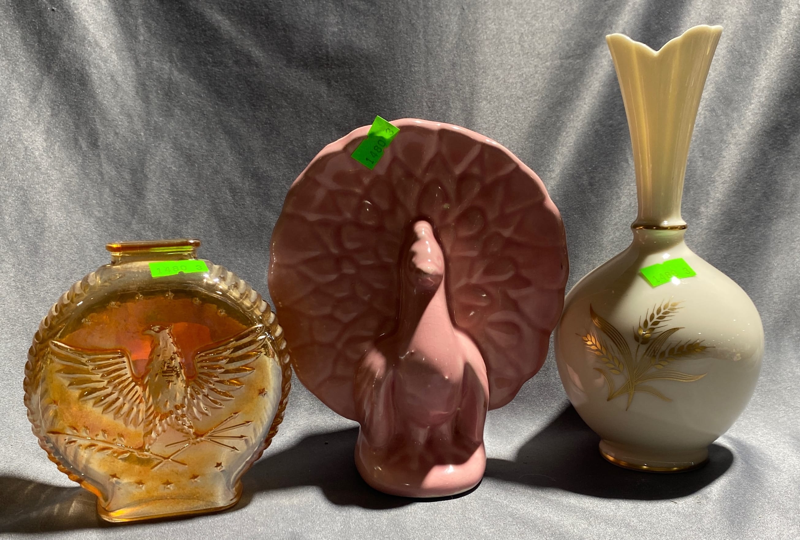 2013 Ornate Andrea vase , 8.5” , 4- chicken plates , 8”, porcelain cockatoo with perching rack, miscellaneous