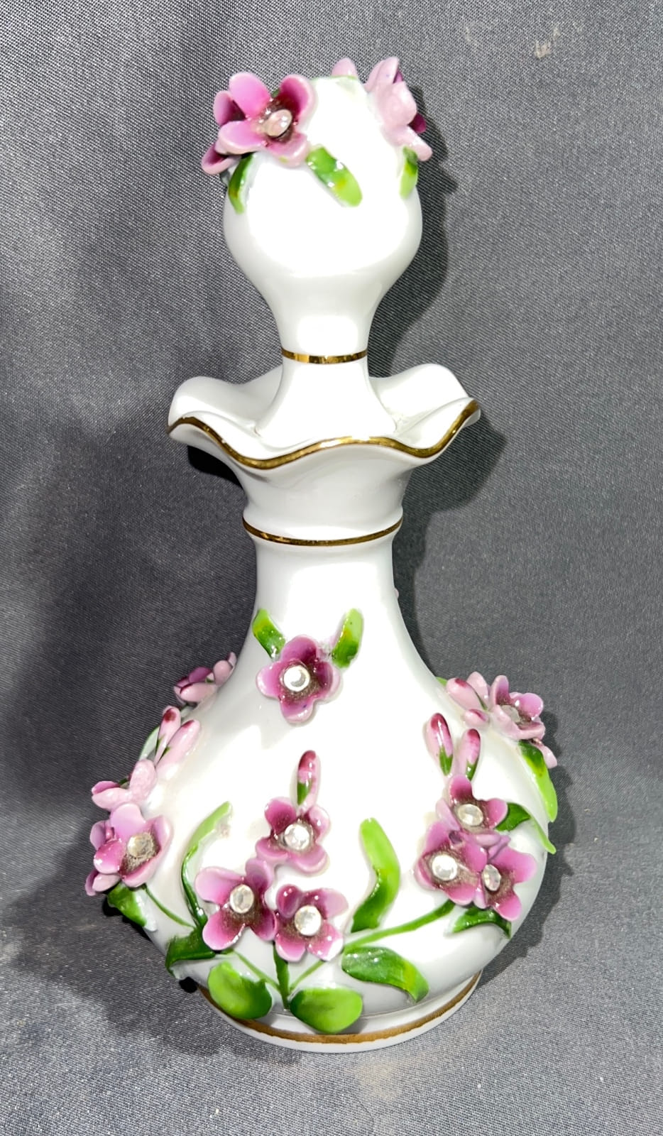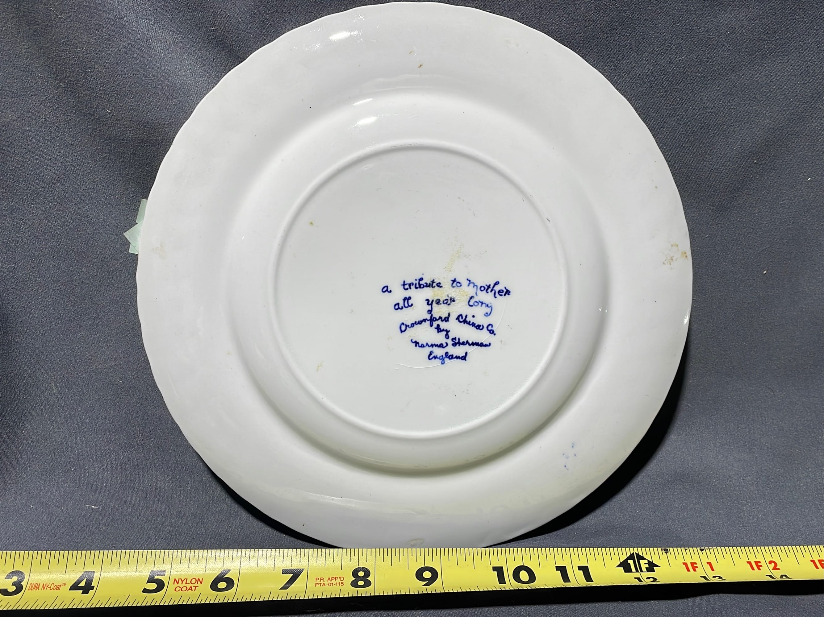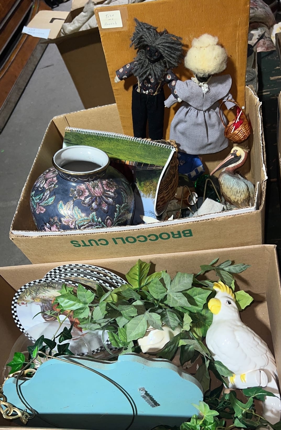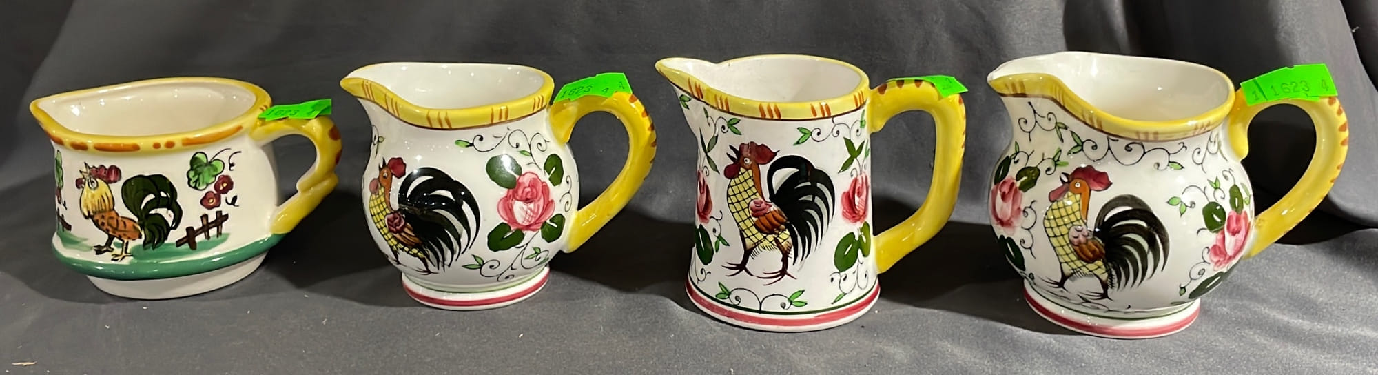 2013 Ornate Andrea vase , 8.5” , 4- chicken plates , 8”, porcelain cockatoo with perching rack, miscellaneous