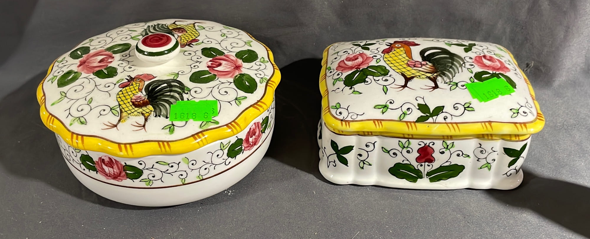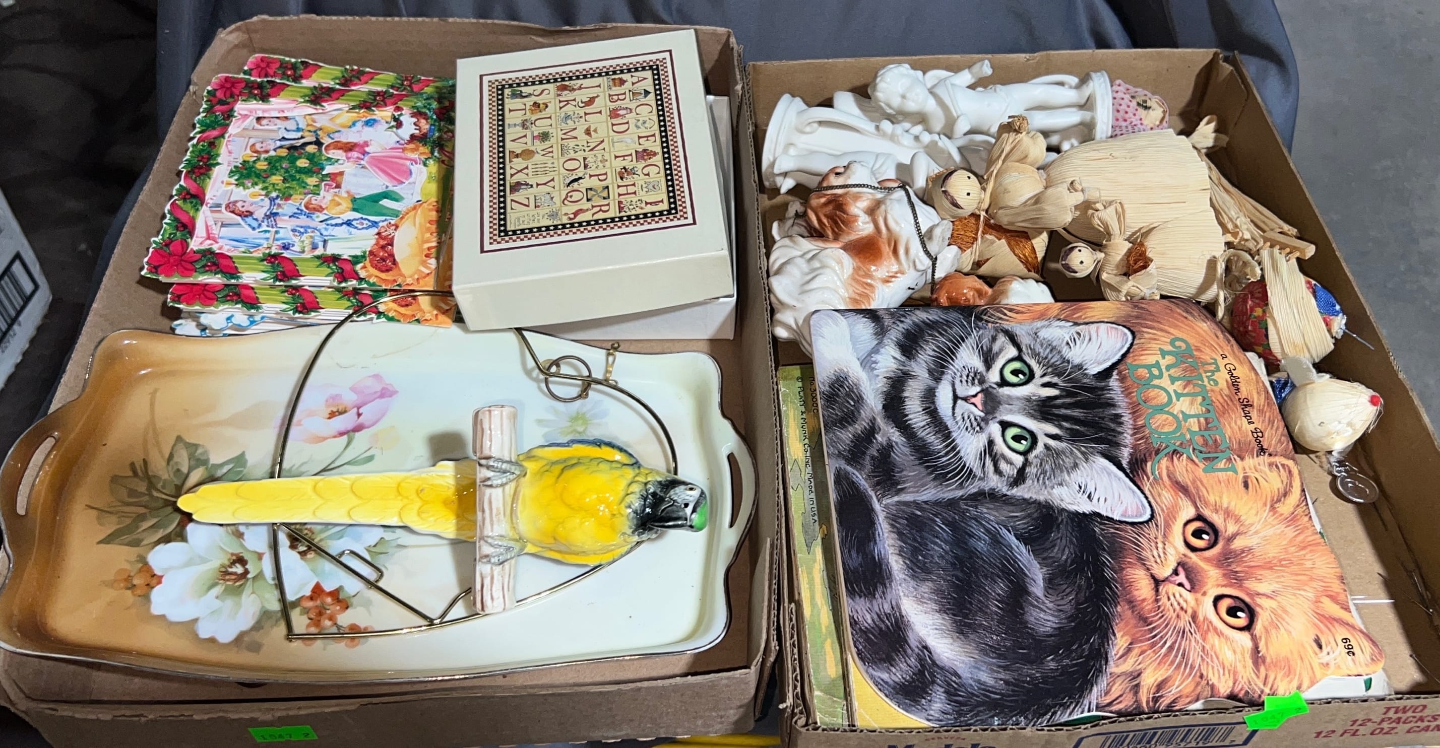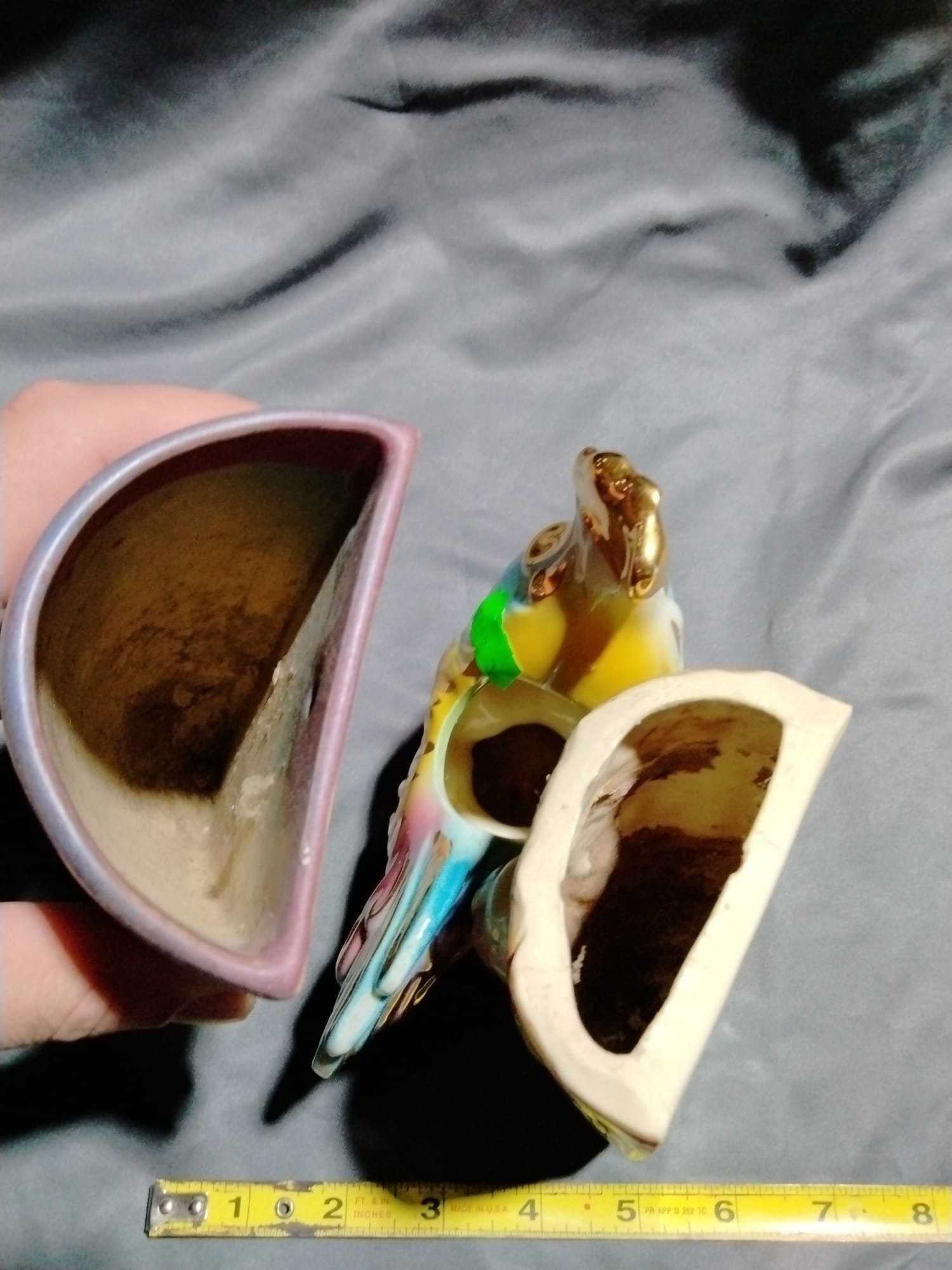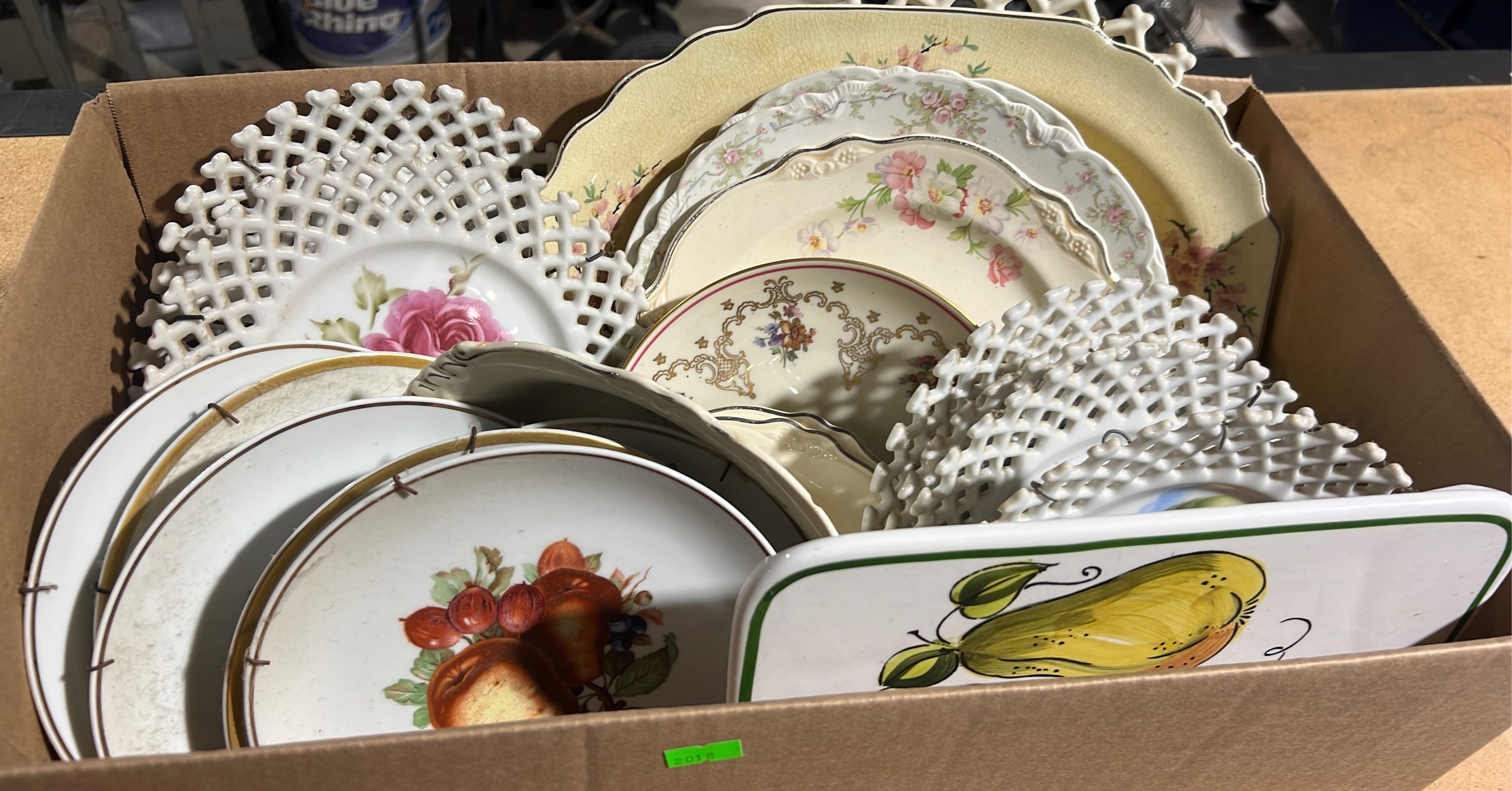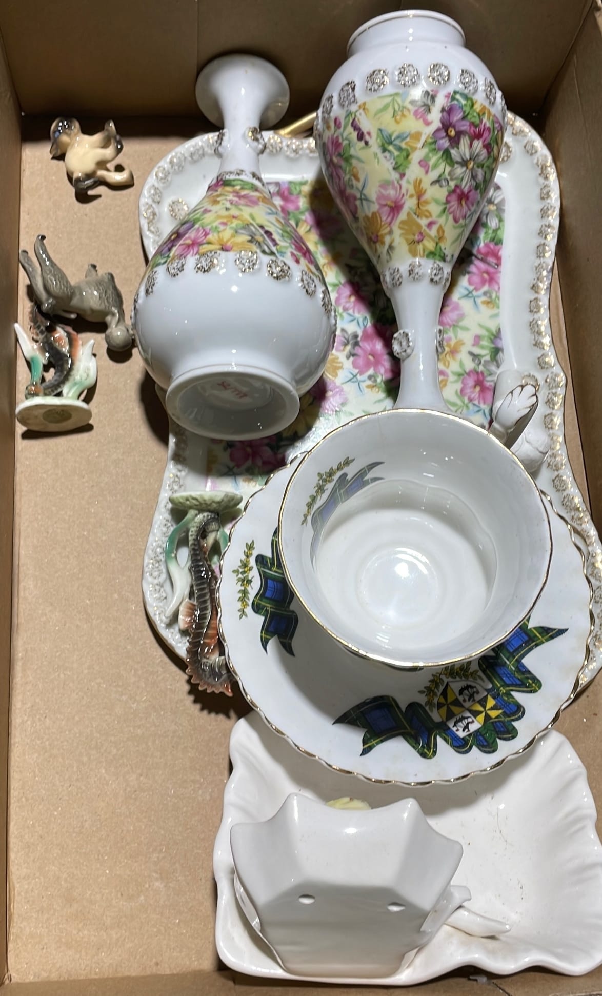 2013 Ornate Andrea vase , 8.5” , 4- chicken plates , 8”, porcelain cockatoo with perching rack, miscellaneous