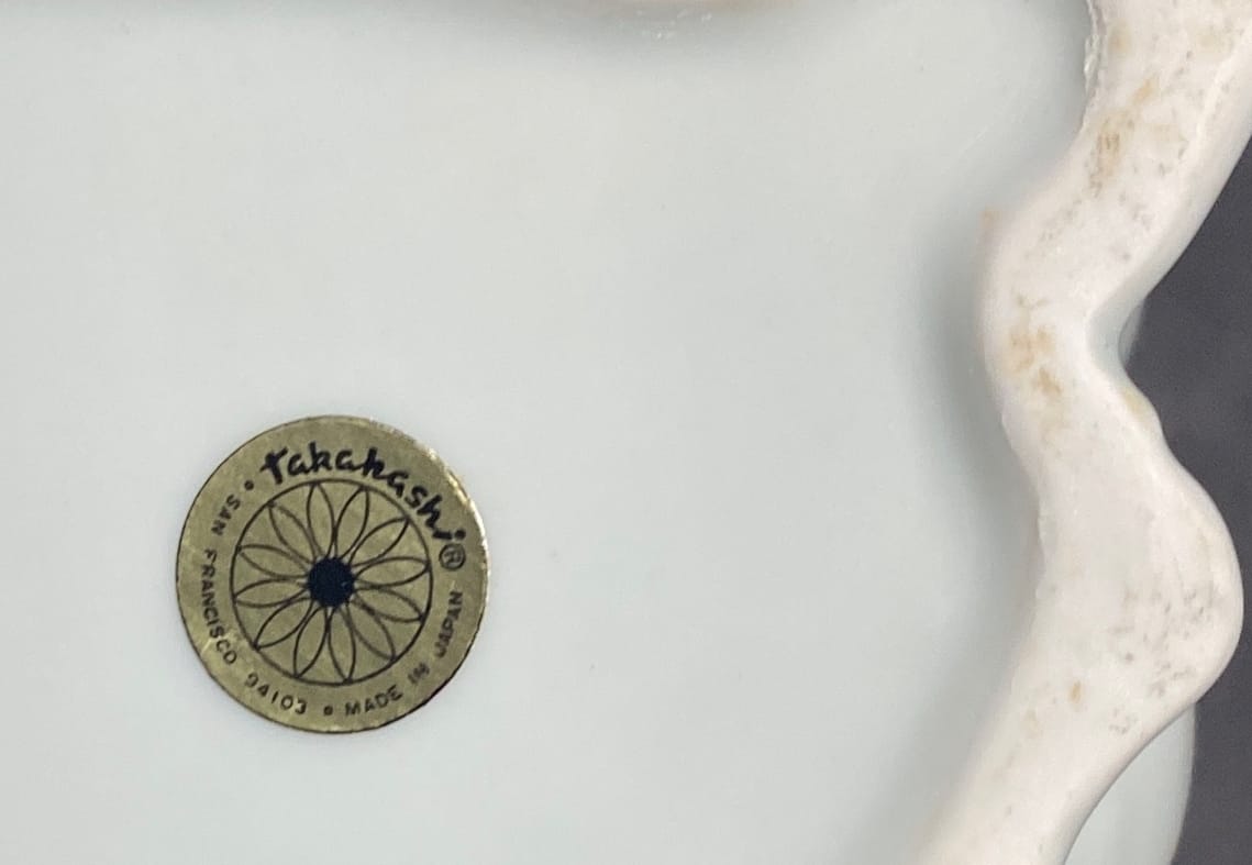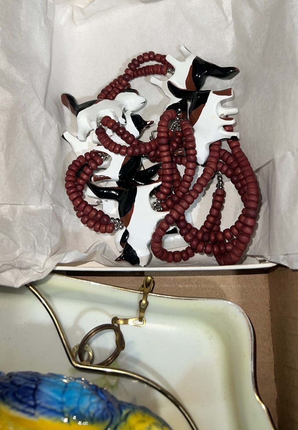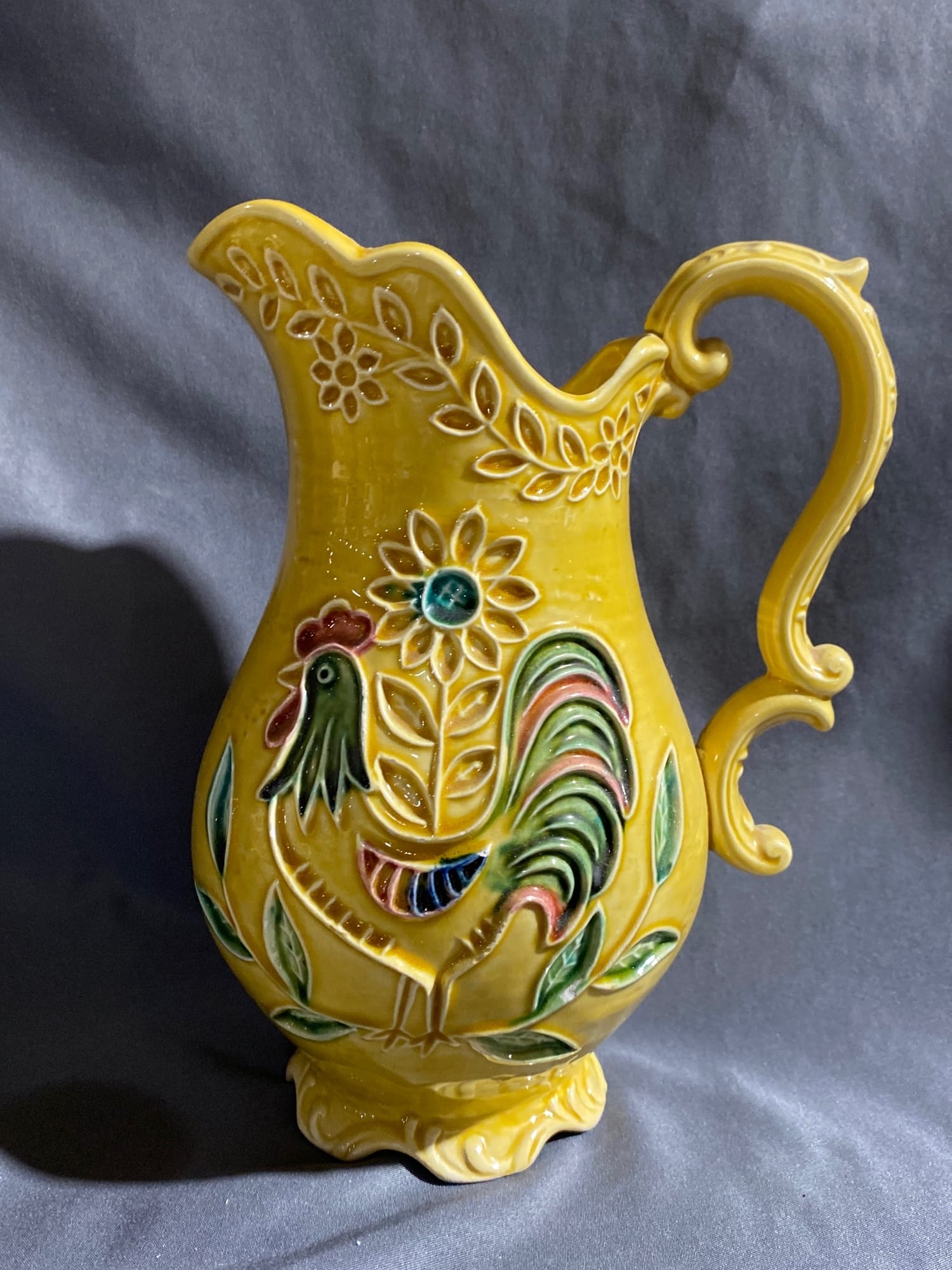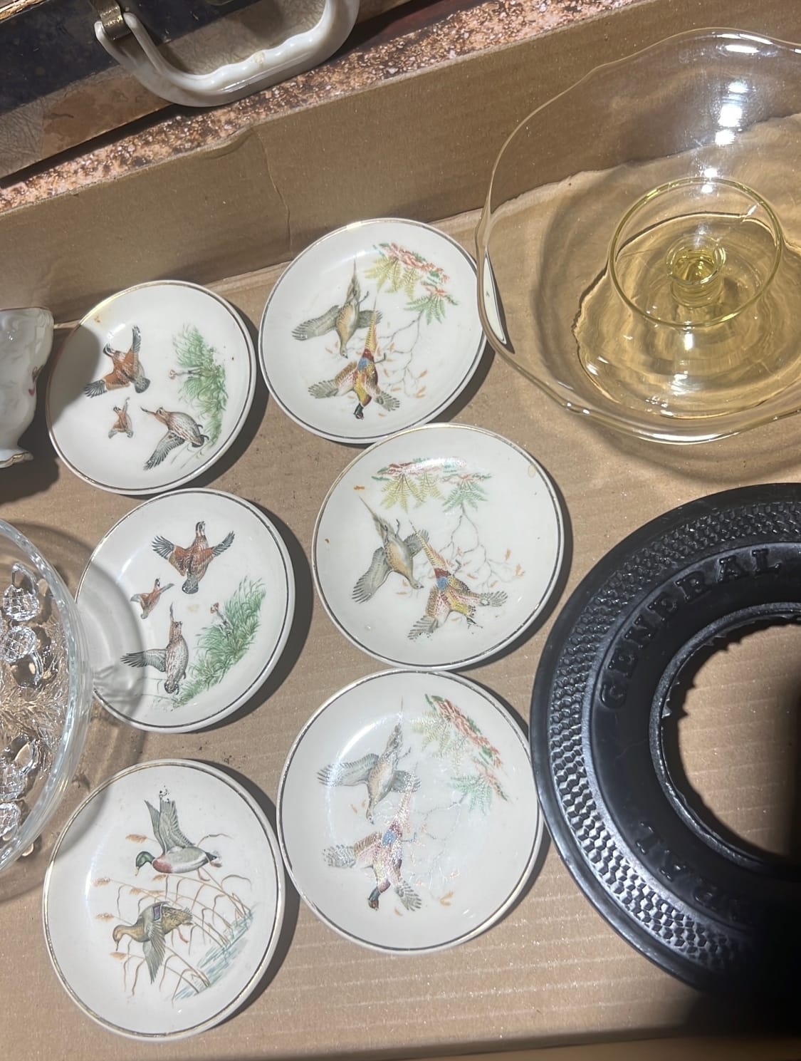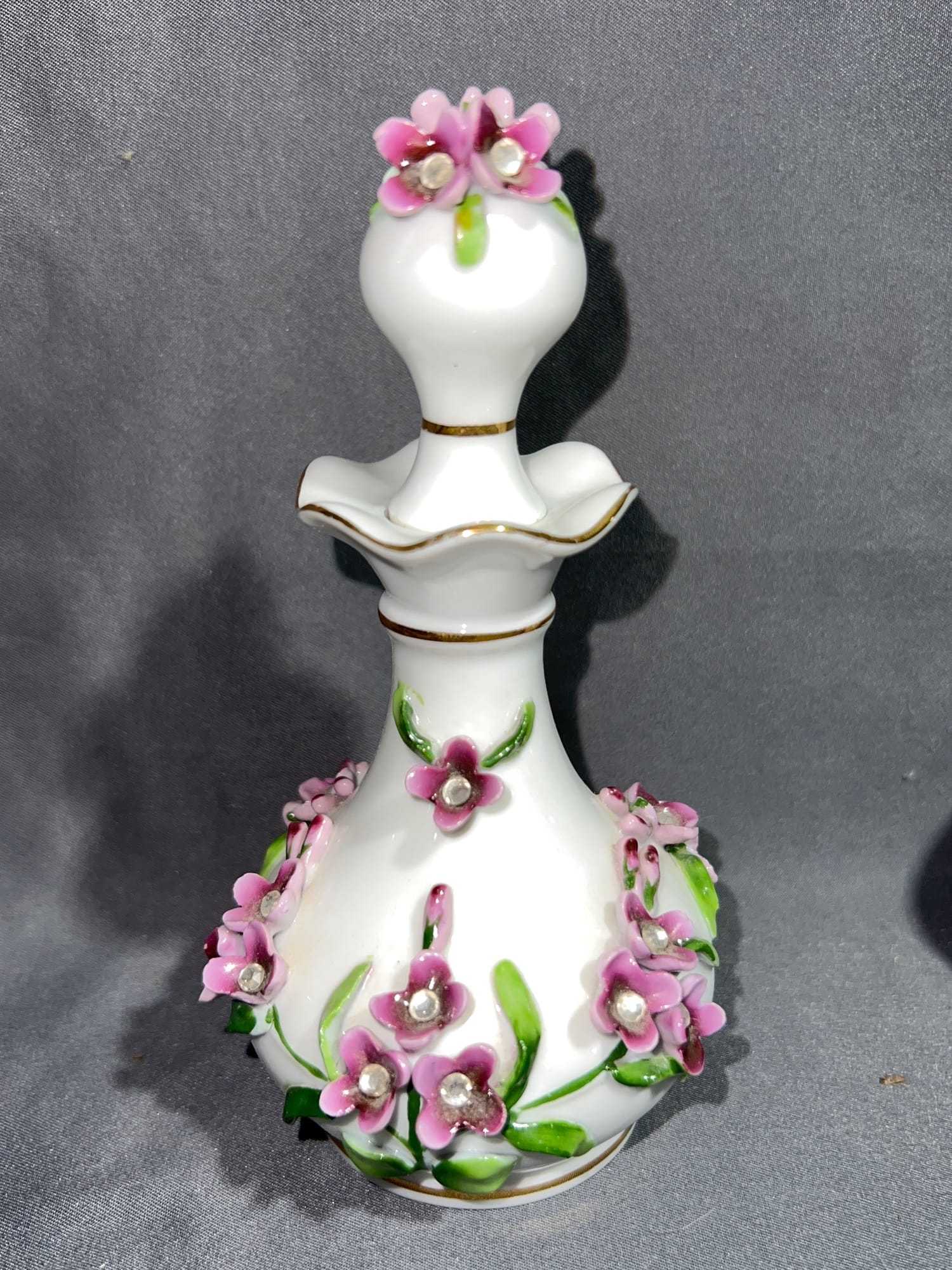 2013 Ornate Andrea vase , 8.5” , 4- chicken plates , 8”, porcelain cockatoo with perching rack, miscellaneous
