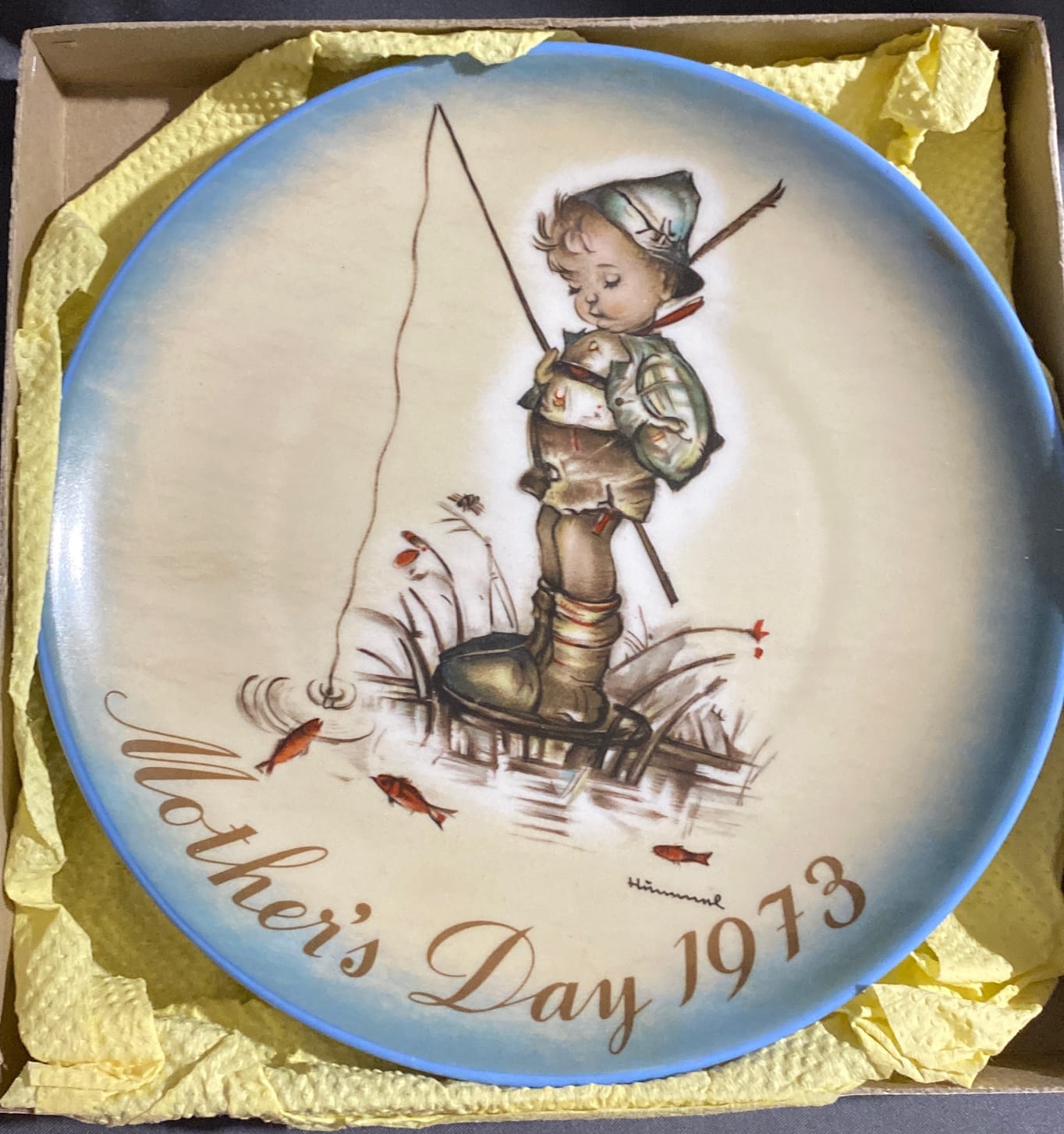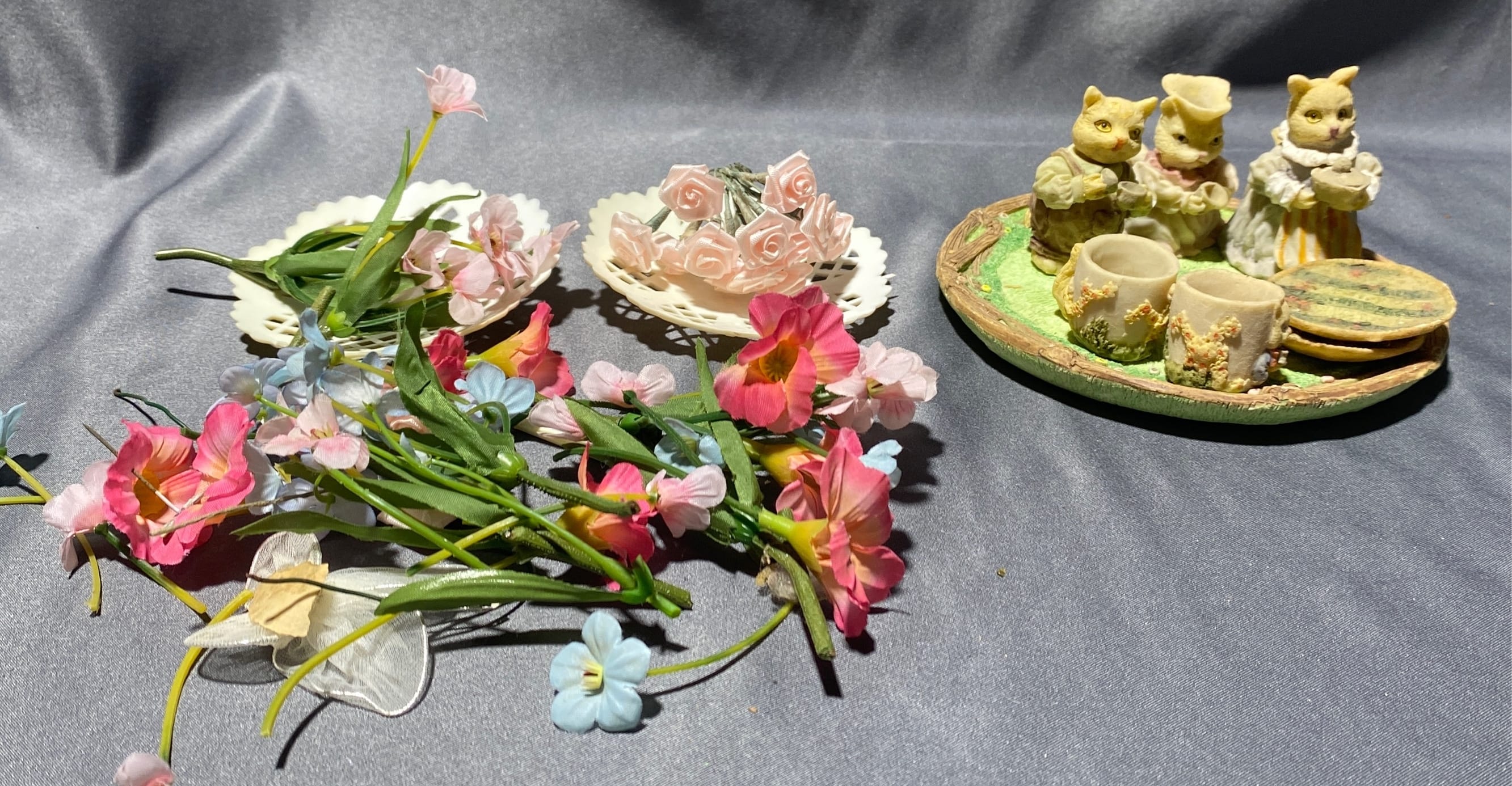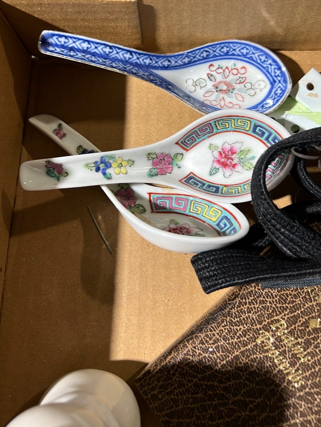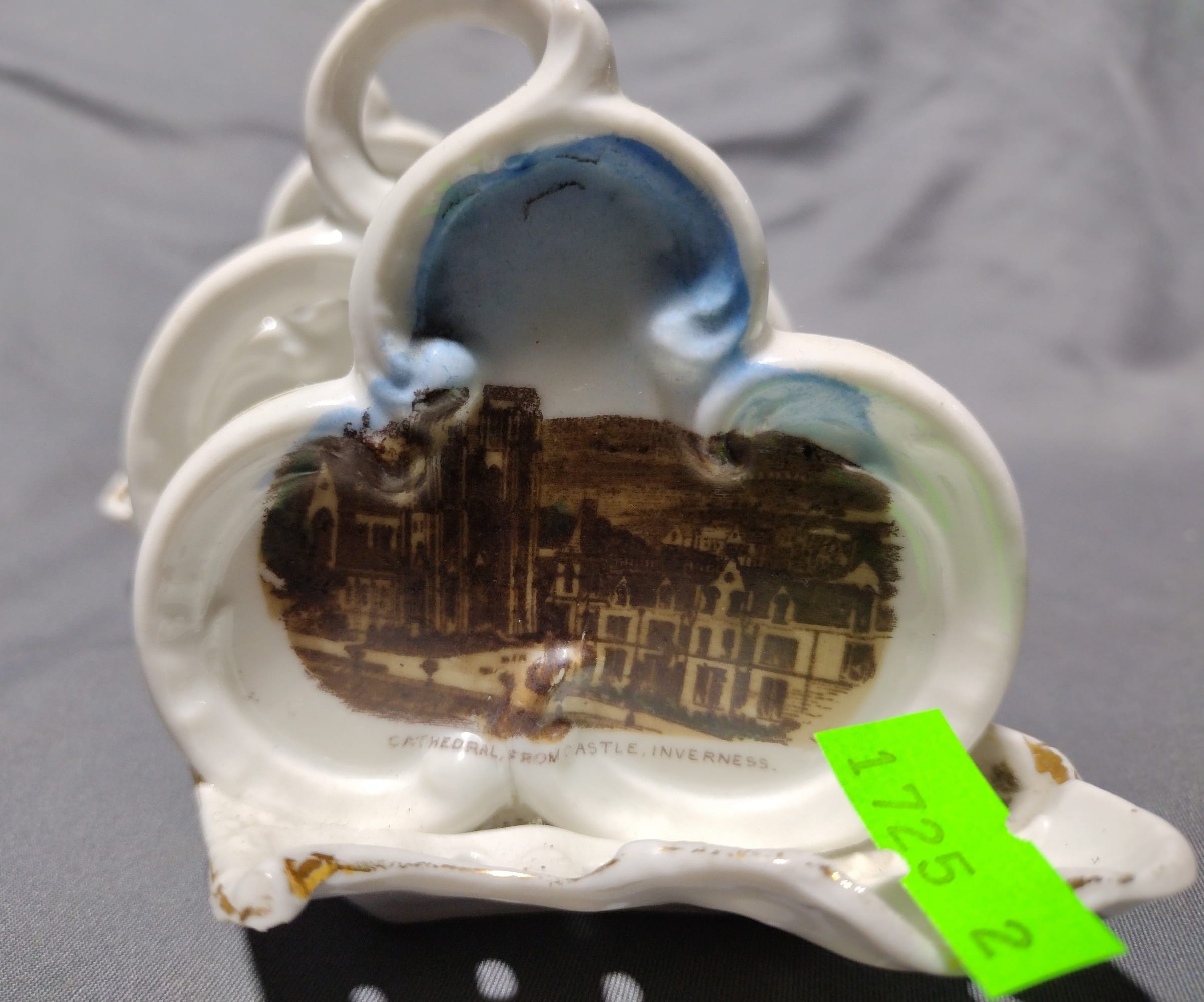 2013 Ornate Andrea vase , 8.5” , 4- chicken plates , 8”, porcelain cockatoo with perching rack, miscellaneous