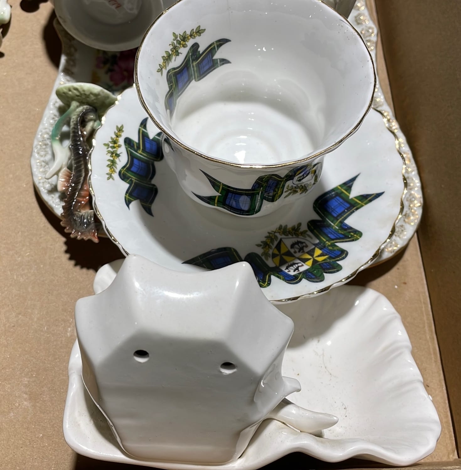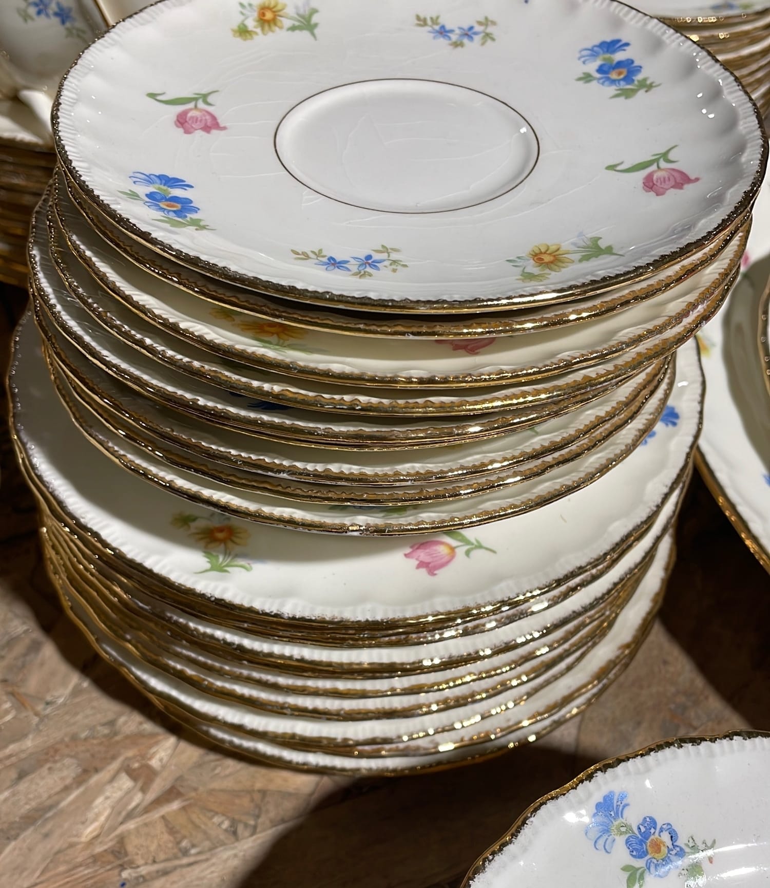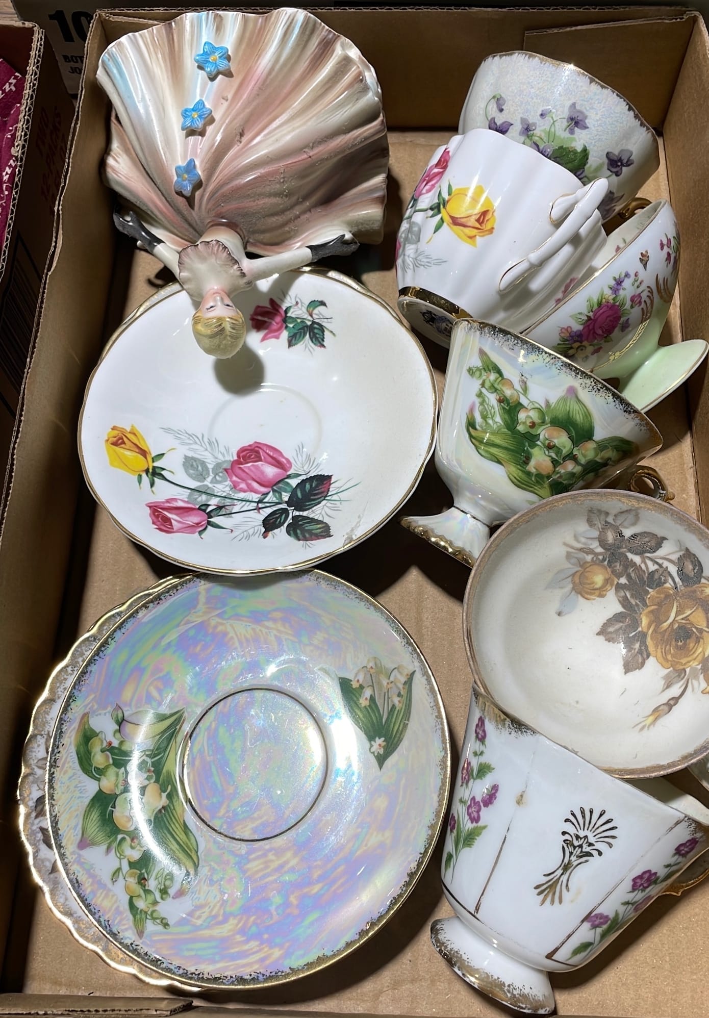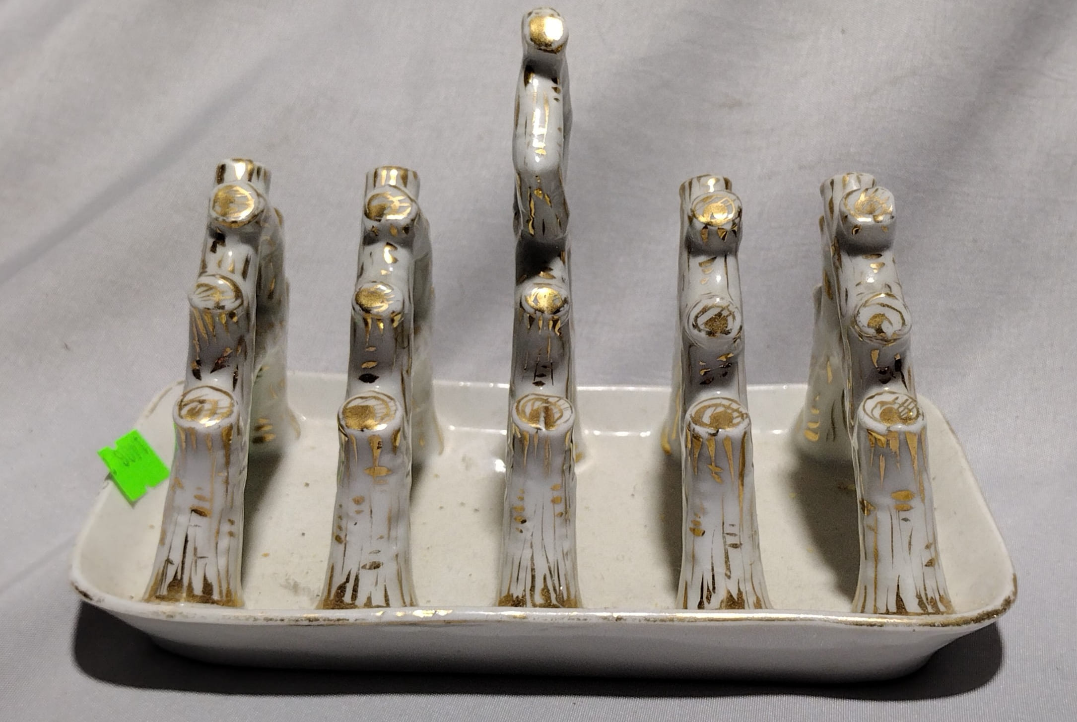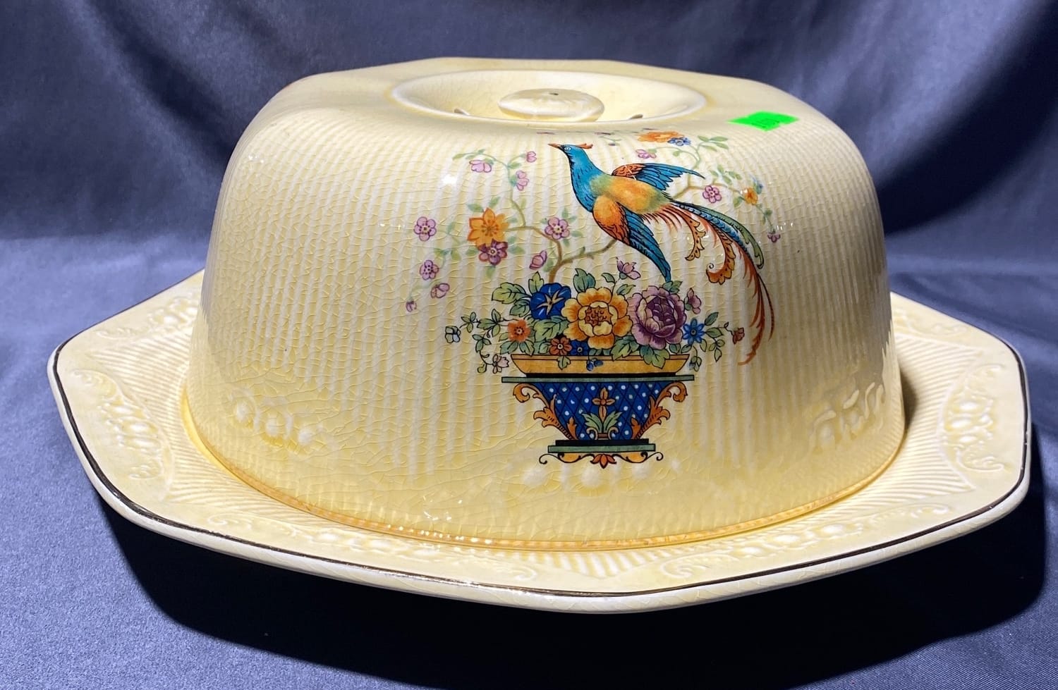 2013 Ornate Andrea vase , 8.5” , 4- chicken plates , 8”, porcelain cockatoo with perching rack, miscellaneous