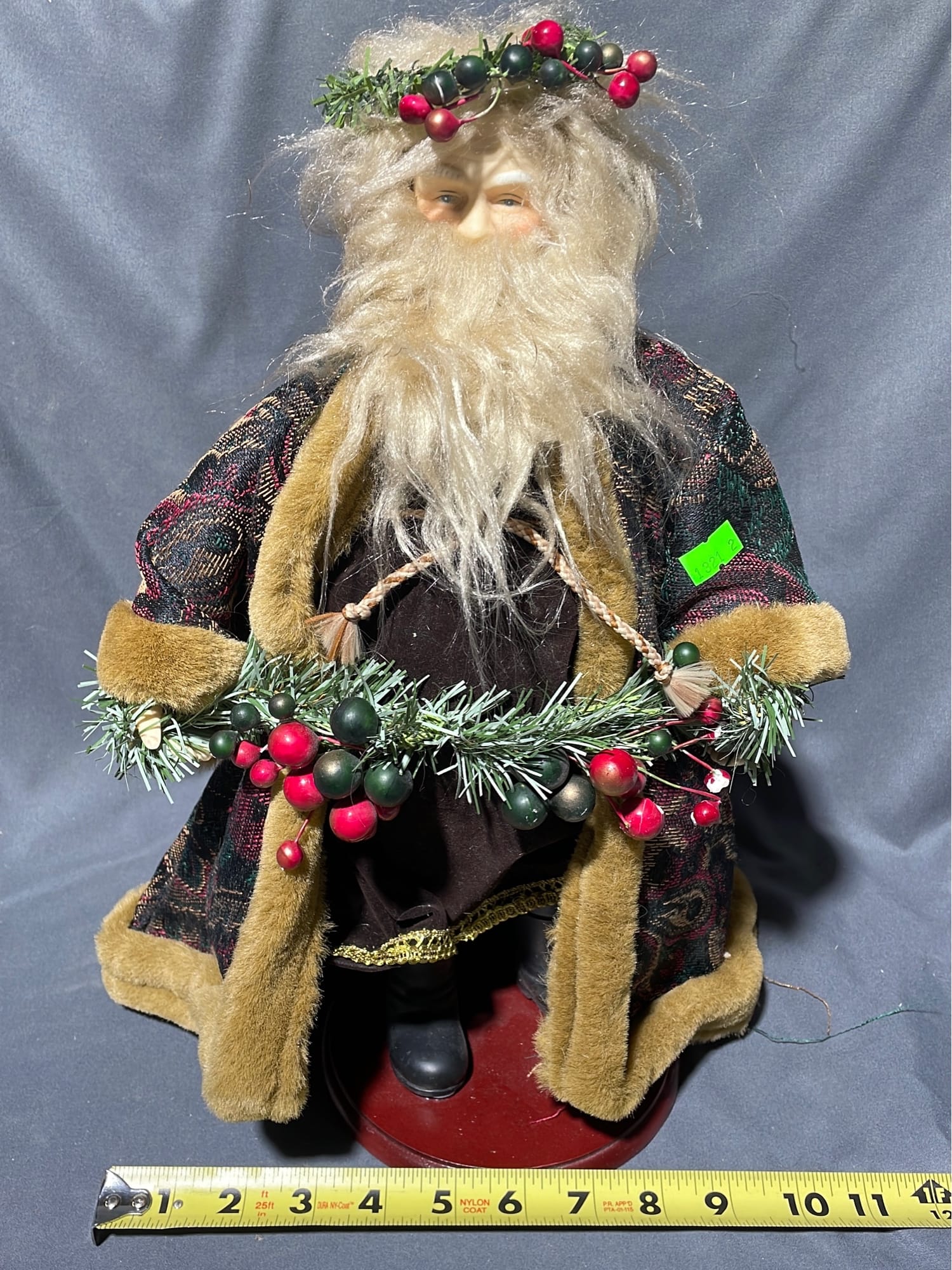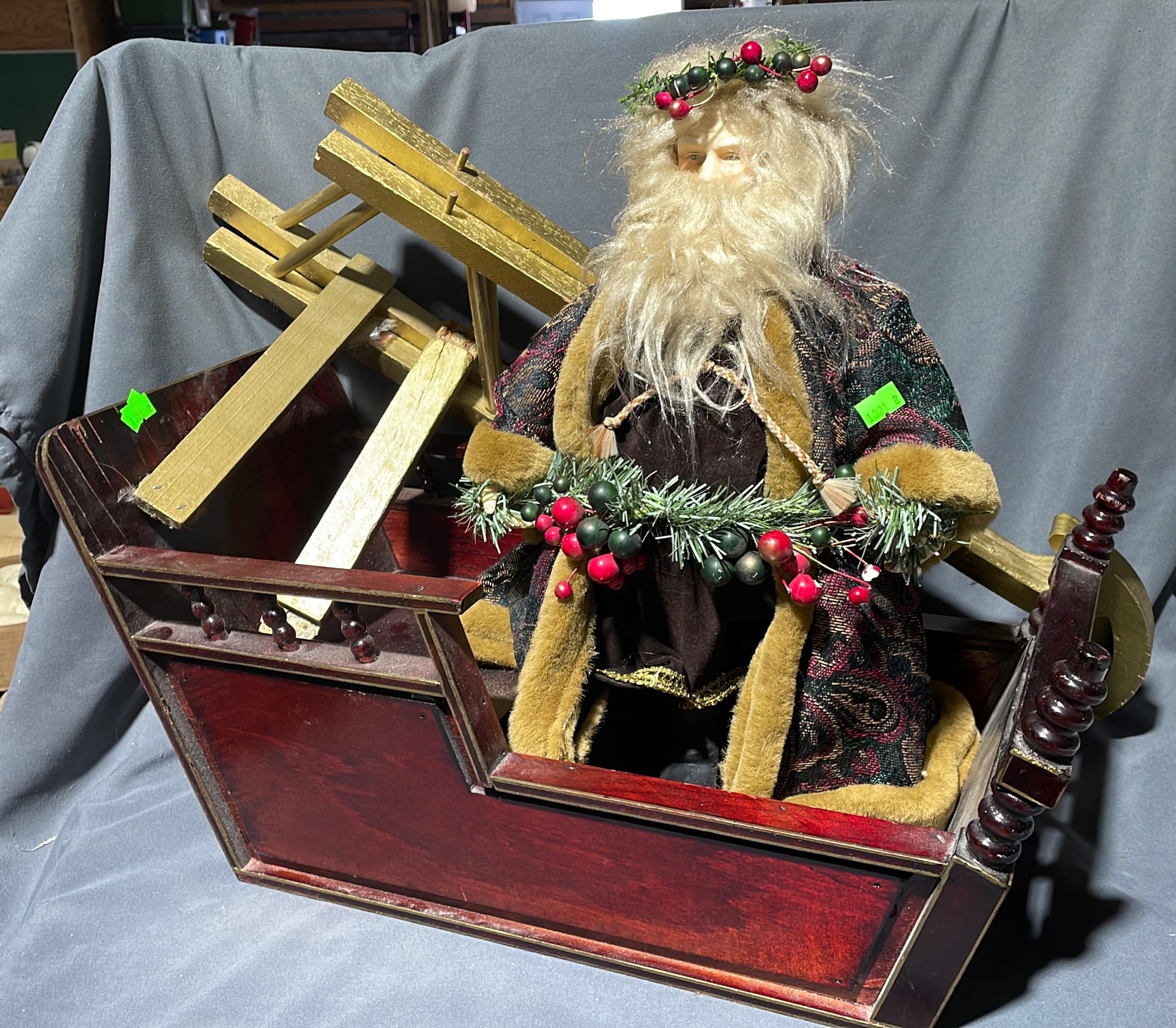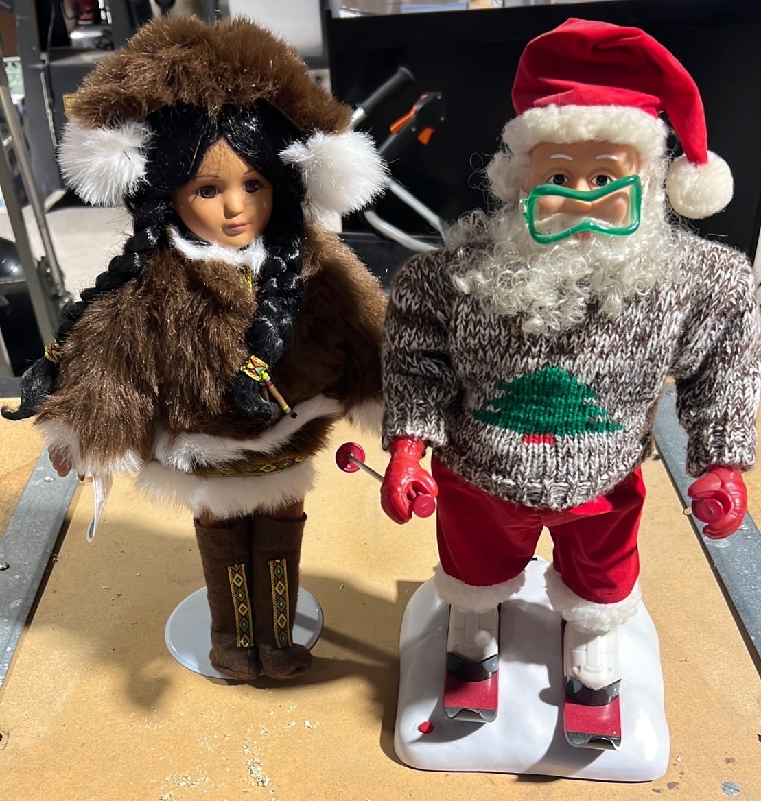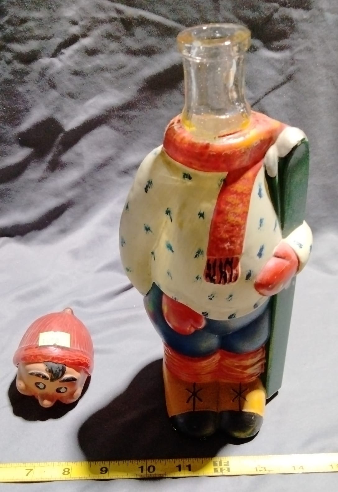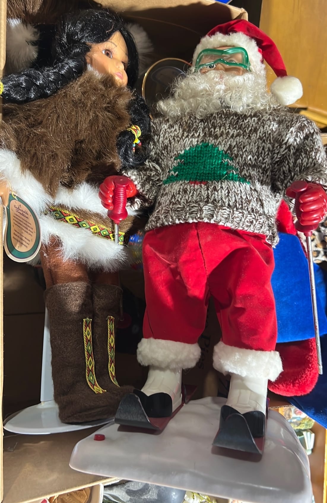 2019 Sking Santa, 17”, Indian doll on stand, 17”, bull decanter, novelty door
